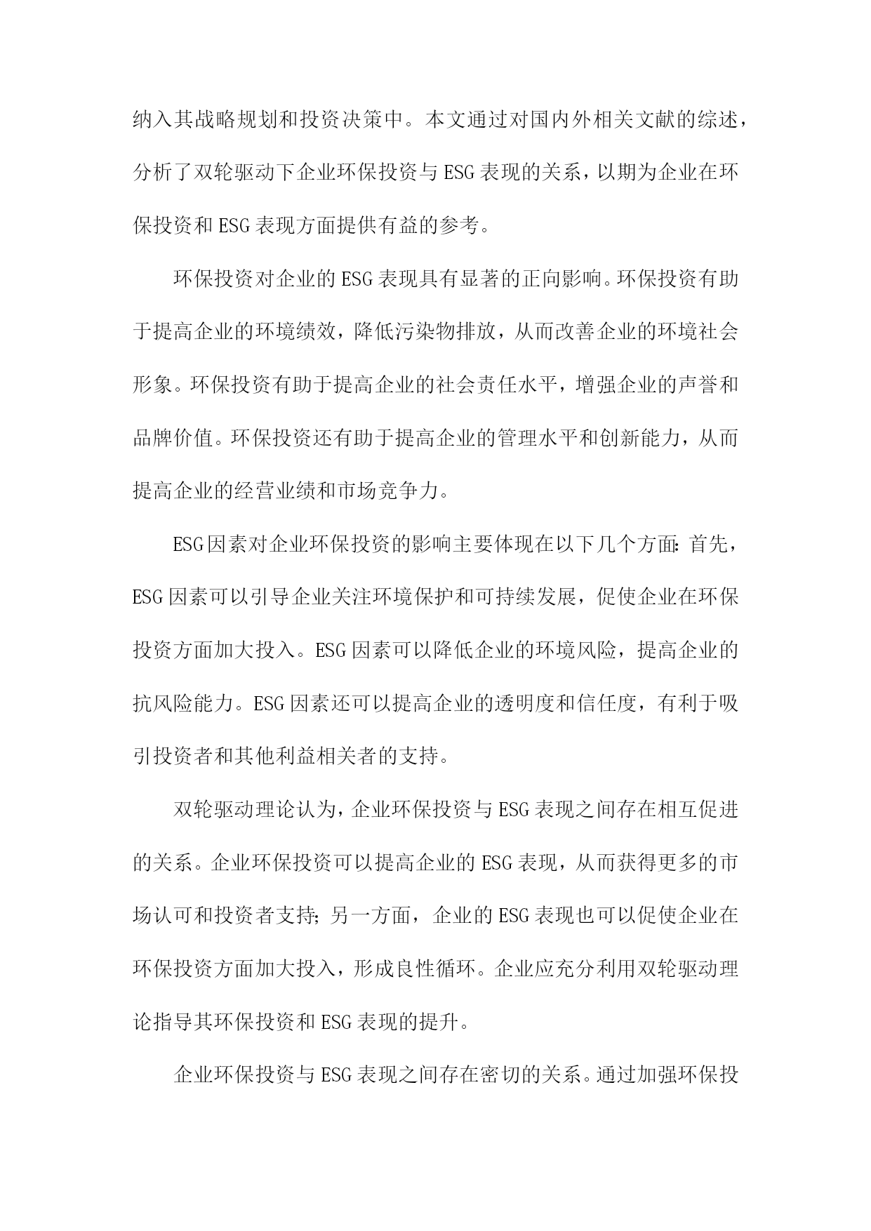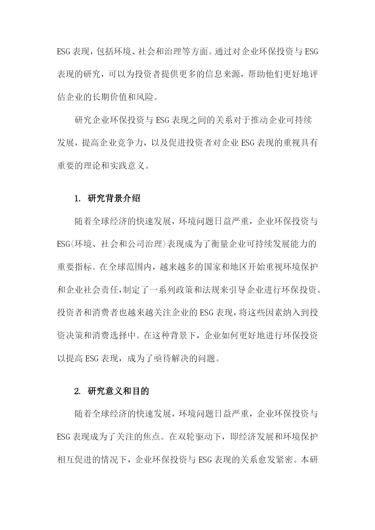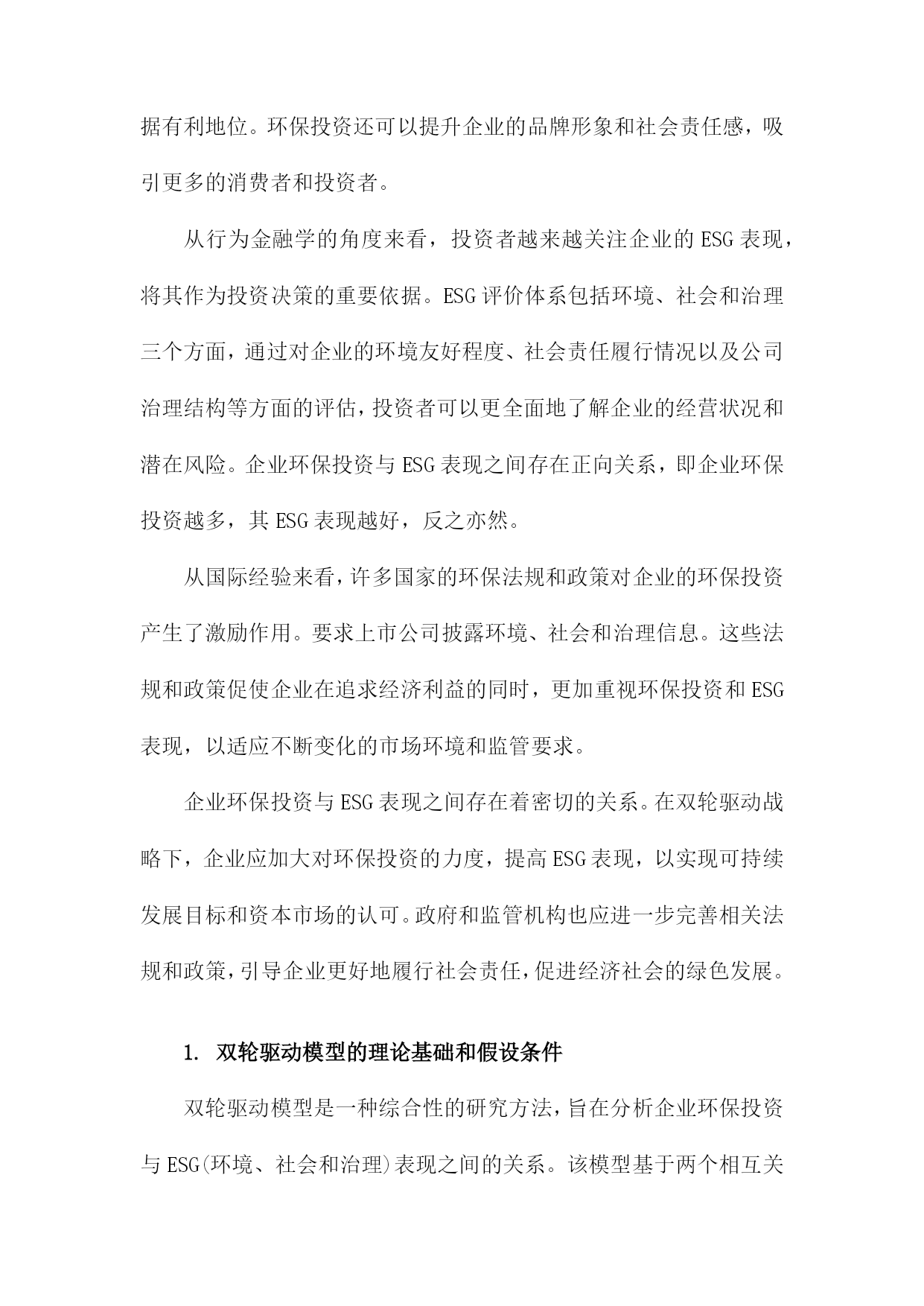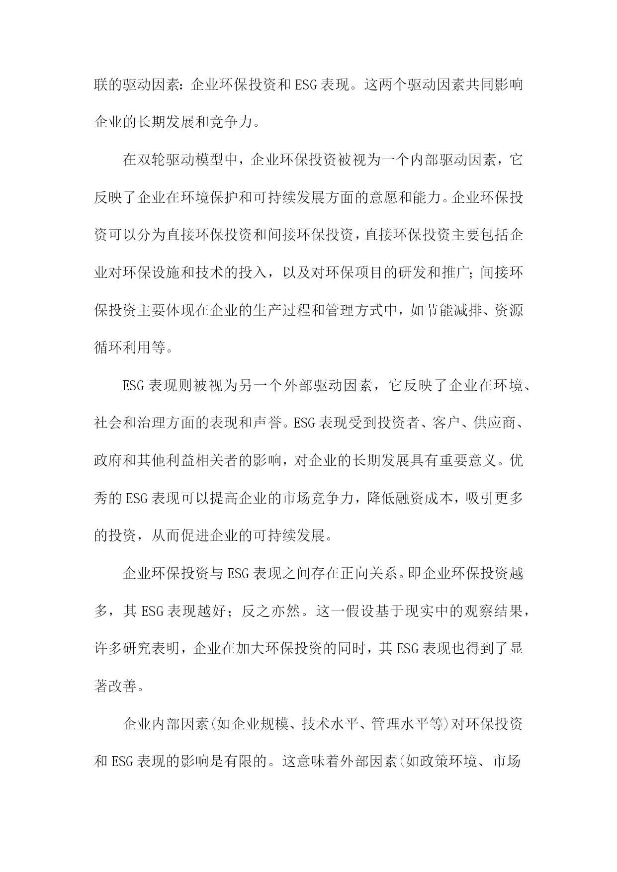 双轮驱动下企业环保投资与ESG表现一、研究背景和意义随着全球经济的快速发展和人类对资源的需求不断增加,环境问题日益严重,企业环保投资与ESG表现已经成为全球关注的焦点。在双轮驱动下,企业环保投资不仅有助于实现可持续发展目标,提高企业竞争力,还可以提升企业ESG表现,从而吸引更多投资者关注和支持。研究企业环保投资与ESG表现之间的关系具有重要的理论和实践意义。研究企业环保投资与ESG表现之间的关系有助于揭示企业在追求经济效益的同时,如何通过环保投资来实现可持续发展目标。这对于推动企业转型升级,提高资源利用效率,减少污染排放具有重要指导作用。研究企业环保投资与ESG表现之间的关系有助于为企业提供更有效的环保投资策略。通过对企业环保投资与ESG表现的相关性分析,可以为企业制定更加科学合理的环保投资决策提供依据,从而提高企业的环保投资效果。研究企业环保投资与ESG表现之间的关系有助于促进投资者对企业ESG表现的重视。投资者在进行投资决策时,往往会考虑企业的ESG表现,包括环境、社会和治理等方面。通过对企业环保投资与ESG表现的研究,可以为投资者提供更多的信息来源,帮助他们更好地评估企业的长期价值和风险。研究企业环保投资与ESG表现之间的关系对于推动企业可持续发展,提高企业竞争力,以及促进投资者对企业ESG表现的重视具有重要的理论和实践意义。1.研究背景介绍随着全球经济的快速发展,环境问题日益严重,企业环保投资与ESG(环境、社会和公司治理)表现成为了衡量企业可持续发展能力的重要指标。在全球范围内,越来越多的国家和地区开始重视环境保护和企业社会责任,制定了一系列政策和法规来引导企业进行环保投资。投资者和消费者也越来越关注企业的ESG表现,将这些因素纳入到投资决策和消费选择中。在这种背景下,企业如何更好地进行环保投资以提高ESG表现,成为了亟待解决的问题。2.研究意义和目的随着全球经济的快速发展,环境问题日益严重,企业环保投资与ESG表现成为了关注的焦点。在双轮驱动下,即经济发展和环境保护相互促进的情况下,企业环保投资与ESG表现的关系愈发紧密。本研究的意义在于通过对双轮驱动下企业环保投资与ESG表现的研究,揭示二者之间的关系,为企业在可持续发展道路上提供有益的参考。本研究旨在分析双轮驱动下企业环保投资与ESG表现之间的内在联系。通过对比分析不同行业、不同规模企业的环保投资与ESG表现情况,探讨二者之间的关联性,为企业制定更加合理的环保投资策略提供依据。本研究将关注企业在双轮驱动下如何提高环保投资与ESG表现。通过对企业环保投资项目的评估,分析企业在环保投资过程中可能遇到的问题及解决方案,从而提高企业在双轮驱动下的ESG表现。本研究将对双轮驱动下企业环保投资与ESG表现的影响因素进行深入探讨。通过分析影响企业环保投资与ESG表现的各种因素,如政策法规、市场竞争、企业文化等,为企业在实际操作中提供有效的指导。本研究旨在揭示双轮驱动下企业环保投资与ESG表现之间的关系,为企业在可持续发展道路上提供有益的参考。二、文献综述随着全球经济的快速发展和环境问题日益严重,企业环保投资与ESG表现已经成为投资者关注的焦点。ESG(环境、社会和公司治理)理念在全球范围内得到了广泛认可,越来越多的企业开始将ESG因素纳入其战略规划和投资决策中。本文通过对国内外相关文献的综述,分析了双轮驱动下企业环保投资与ESG表现的关系,以期为企业在环保投资和ESG表现方面提供有益的参考。环保投资对企业的ESG表现具有显著的正向影响。环保投资有助于提高企业的环境绩效,降低污染物排放,从而改善企业的环境社会形象。环保投资有助于提高企业的社会责任水平,增强企业的声誉和品牌价值。环保投资还有助于提高企业的管理水平和创新能力,从而提高企业的经营业绩和市场竞争力。ESG因素对企业环保投资的影响主要体现在以下几个方面:首先,ESG因素可以引导企业关注环境保护和可持续发展,促使企业在环保投资方面加大投入。ESG因素可以降低企业的环境风险,提高企业的抗风险能力。ESG因素还可以提高企业的透明度和信任度,有利于吸引投资者和其他利益相关者的支持。双轮驱动理论认为,企业环保投资与ESG表现之间存在相互促进的关系。企业环保投资可以提高企业的ESG表现,从而获得更多的市场认可和投资者支持;另一方面,企业的ESG表现也可以促使企业在环保投资方面加大投入,形成良性循环。企业应充分利用双轮驱动理论指导其环保投资和ESG表现的提升。企业环保投资与ESG表现之间存在密切的关系。通过加强环保投资和提高ESG表现,企业可以在市场竞争中脱颖而出,实现可持续发展。企业在实际操作过程中仍面临诸多挑战,如信息披露不充分、投资者行为偏差等。政府、企业和投资者应共同努力,推动企业环保投