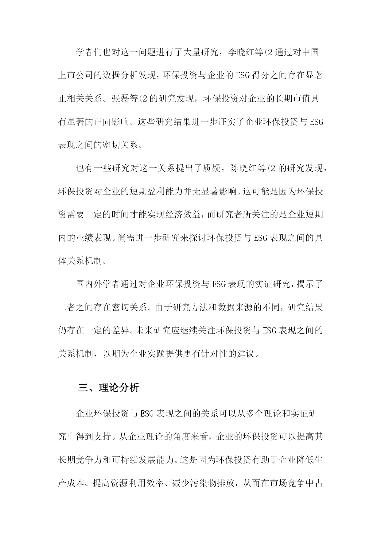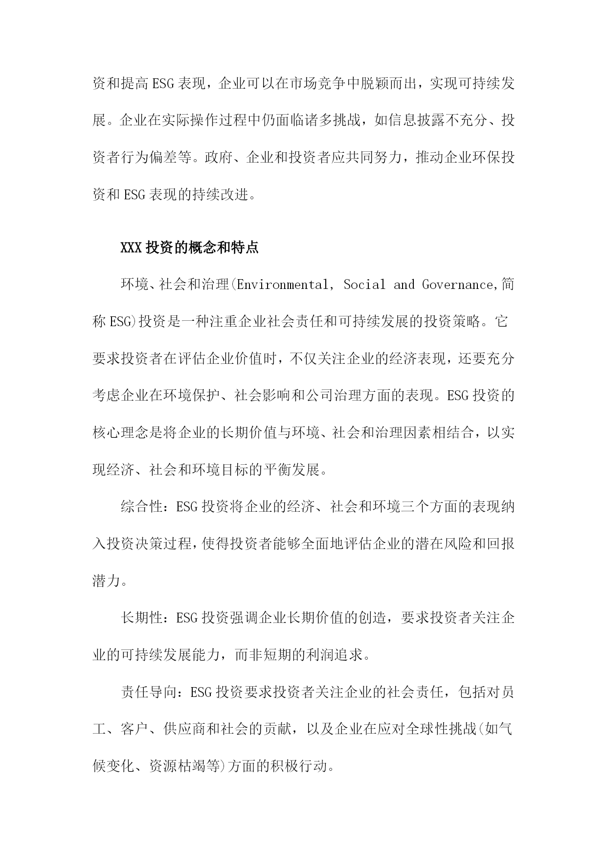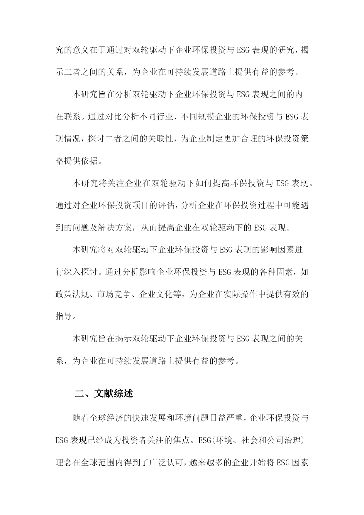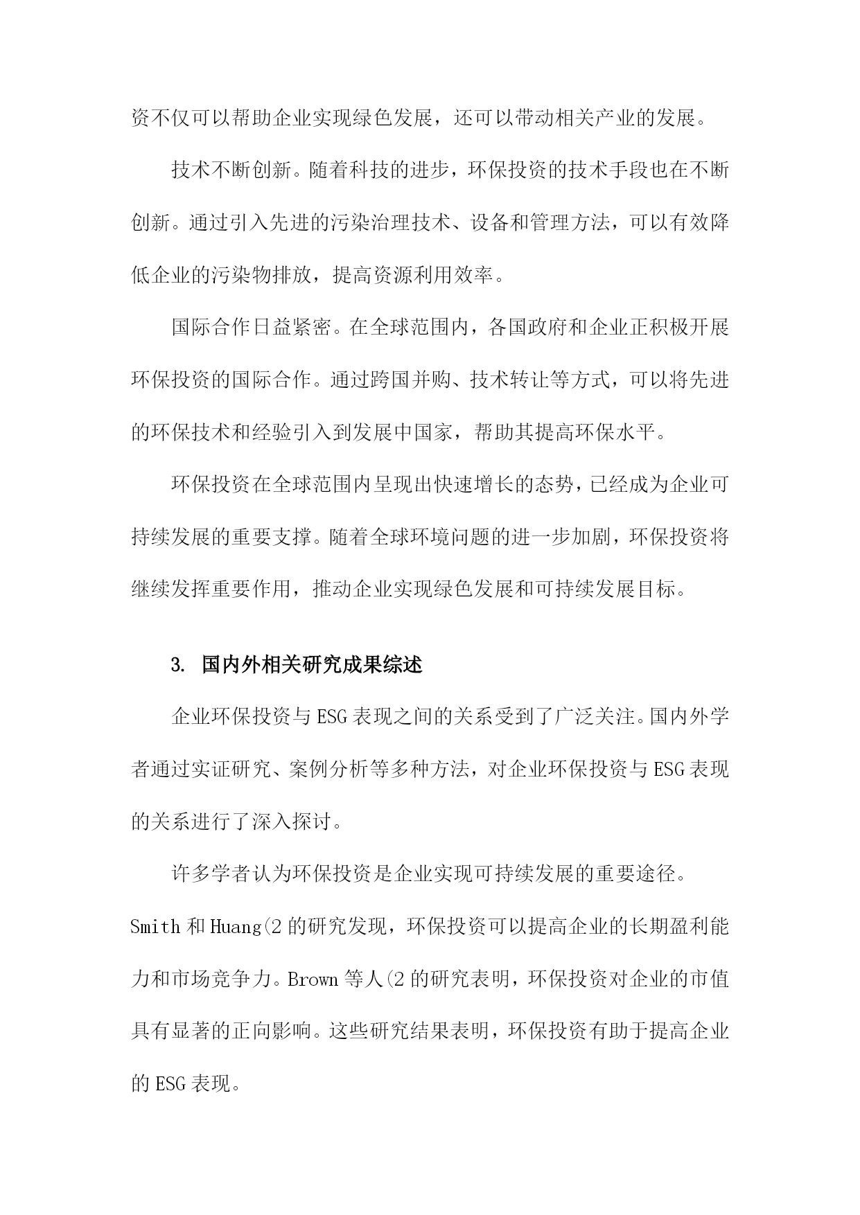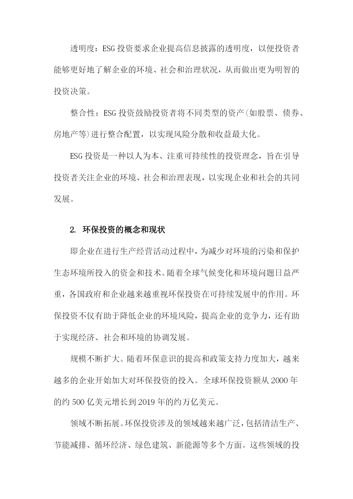 双轮驱动下企业环保投资与ESG表现一、研究背景和意义随着全球经济的快速发展和人类对资源的需求不断增加,环境问题日益严重,企业环保投资与ESG表现已经成为全球关注的焦点。在双轮驱动下,企业环保投资不仅有助于实现可持续发展目标,提高企业竞争力,还可以提升企业ESG表现,从而吸引更多投资者关注和支持。研究企业环保投资与ESG表现之间的关系具有重要的理论和实践意义。研究企业环保投资与ESG表现之间的关系有助于揭示企业在追求经济效益的同时,如何通过环保投资来实现可持续发展目标。这对于推动企业转型升级,提高资源利用效率,减少污染排放具有重要指导作用。研究企业环保投资与ESG表现之间的关系有助于为企业提供更有效的环保投资策略。通过对企业环保投资与ESG表现的相关性分析,可以为企业制定更加科学合理的环保投资决策提供依据,从而提高企业的环保投资效果。研究企业环保投资与ESG表现之间的关系有助于促进投资者对企业ESG表现的重视。投资者在进行投资决策时,往往会考虑企业的ESG表现,包括环境、社会和治理等方面。通过对企业环保投资与ESG表现的研究,可以为投资者提供更多的信息来源,帮助他们更好地评估企业的长期价值和风险。研究企业环保投资与ESG表现之间的关系对于推动企业可持续发展,提高企业竞争力,以及促进投资者对企业ESG表现的重视具有重要的理论和实践意义。1.研究背景介绍随着全球经济的快速发展,环境问题日益严重,企业环保投资与ESG(环境、社会和公司治理)表现成为了衡量企业可持续发展能力的重要指标。在全球范围内,越来越多的国家和地区开始重视环境保护和企业社会责任,制定了一系列政策和法规来引导企业进行环保投资。投资者和消费者也越来越关注企业的ESG表现,将这些因素纳入到投资决策和消费选择中。在这种背景下,企业如何更好地进行环保投资以提高ESG表现,成为了亟待解决的问题。2.研究意义和目的随着全球经济的快速发展,环境问题日益严重,企业环保投资与ESG表现成为了关注的焦点。在双轮驱动下,即经济发展和环境保护相互促进的情况下,企业环保投资与ESG表现的关系愈发紧密。本研究的意义在于通过对双轮驱动下企业环保投资与ESG表现的研究,揭示二者之间的关系,为企业在可持续发展道路上提供有益的参考。本研究旨在分析双轮驱动下企业环保投资与ESG表现之间的内在联系。通过对比分析不同行业、不同规模企业的环保投资与ESG表现情况,探讨二者之间的关联性,为企业制定更加合理的环保投资策略提供依据。本研究将关注企业在双轮驱动下如何提高环保投资与ESG表现。通过对企业环保投资项目的评估,分析企业在环保投资过程中可能遇到的问题及解决方案,从而提高企业在双轮驱动下的ESG表现。本研究将对双轮驱动下企业环保投资与ESG表现的影响因素进行深入探讨。通过分析影响企业环保投资与ESG表现的各种因素,如政策法规、市场竞争、企业文化等,为企业在实际操作中提供有效的指导。本研究旨在揭示双轮驱动下企业环保投资与ESG表现之间的关系,为企业在可持续发展道路上提供有益的参考。二、文献综述随着全球经济的快速发展和环境问题日益严重,企业环保投资与ESG表现已经成为投资者关注的焦点。ESG(环境、社会和公司治理)理念在全球范围内得到了广泛认可,越来越多的企业开始将ESG因素纳入其战略规划和投资决策中。本文通过对国内外相关文献的综述,分析了双轮驱动下企业环保投资与ESG表现的关系,以期为企业在环保投资和ESG表现方面提供有益的参考。环保投资对企业的ESG表现具有显著的正向影响。环保投资有助于提高企业的环境绩效,降低污染物排放,从而改善企业的环境社会形象。环保投资有助于提高企业的社会责任水平,增强企业的声誉和品牌价值。环保投资还有助于提高企业的管理水平和创新能力,从而提高企业的经营业绩和市场竞争力。ESG因素对企业环保投资的影响主要体现在以下几个方面:首先,ESG因素可以引导企业关注环境保护和可持续发展,促使企业在环保投资方面加大投入。ESG因素可以降低企业的环境风险,提高企业的抗风险能力。ESG因素还可以提高企业的透明度和信任度,有利于吸引投资者和其他利益相关者的支持。双轮驱动理论认为,企业环保投资与ESG表现之间存在相互促进的关系。企业环保投资可以提高企业的ESG表现,从而获得更多的市场认可和投资者支持;另一方面,企业的ESG表现也可以促使企业在环保投资方面加大投入,形成良性循环。企业应充分利用双轮驱动理论指导其环保投资和ESG表现的提升。企业环保投资与ESG表现之间存在密切的关系。通过加强环保投资和提高ESG表现,企业可以在市场竞争中脱颖而出,实现可持续发展。企业在实际操作过程中仍面临诸多挑战,如信息披露不充分、投资者行为偏差等。政府、企业和投资者应共同努力,推动企业环保投