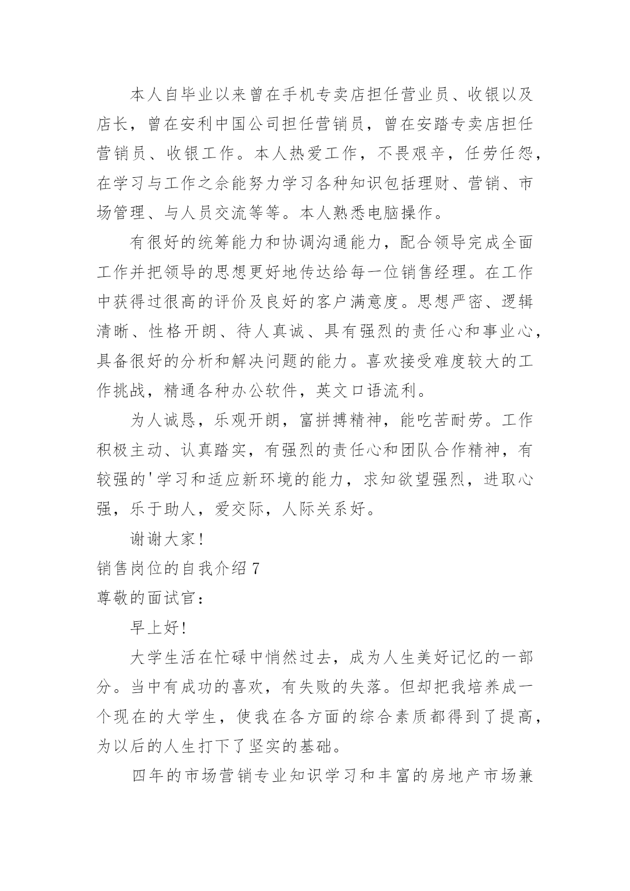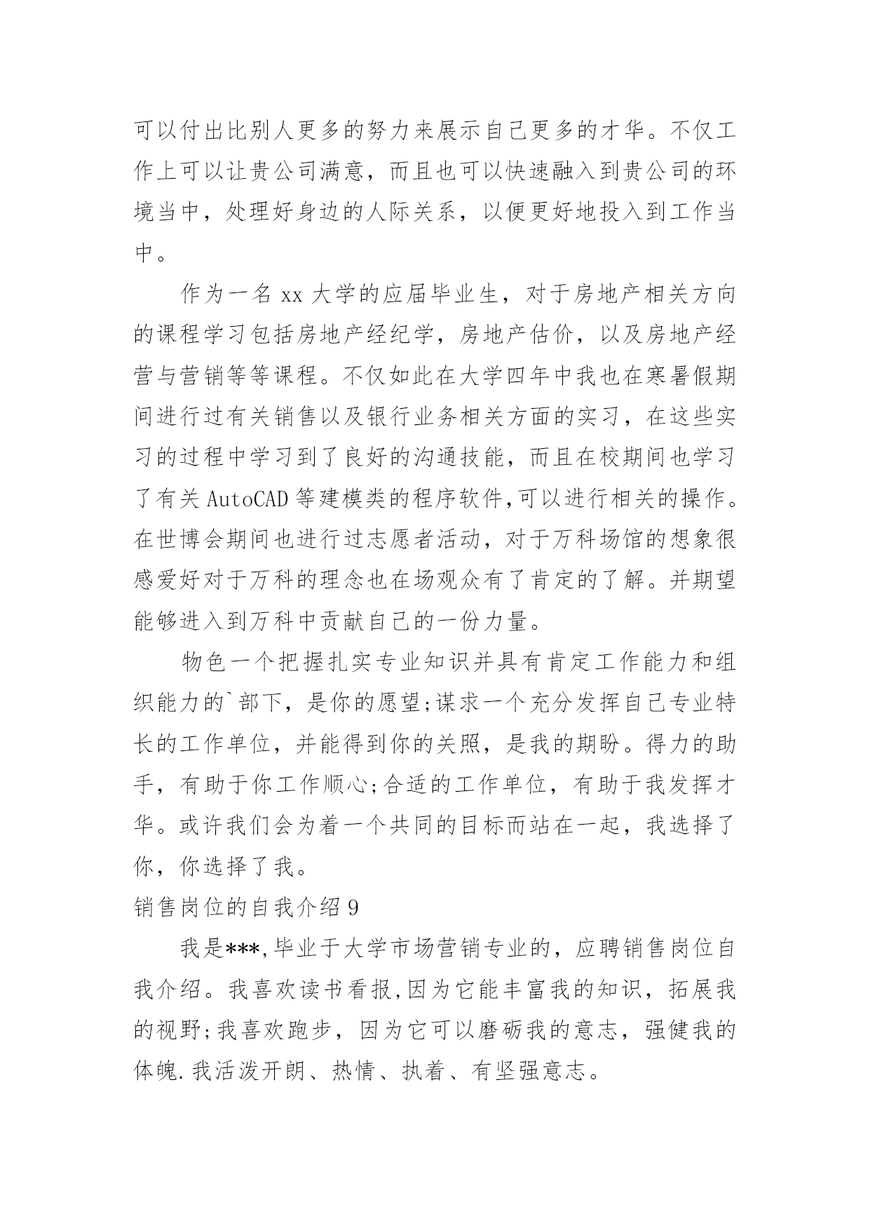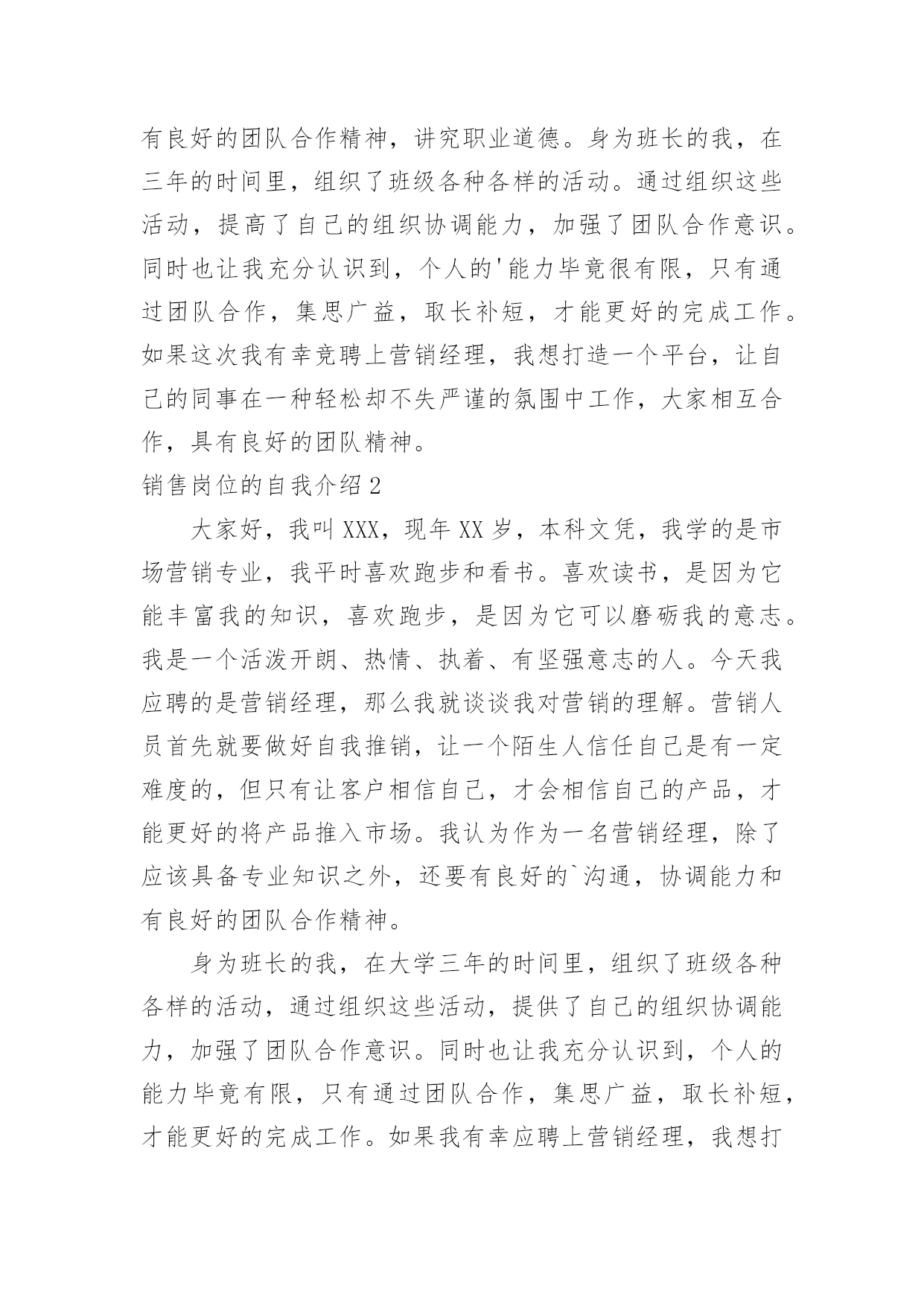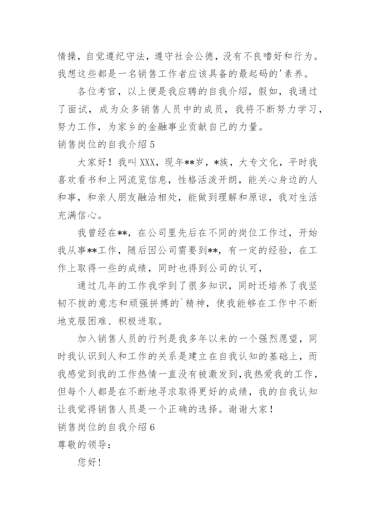 销售岗位的自我介绍销售岗位的自我介绍当去到一个新环境下,我们难以避免地要作出自我介绍,用自我介绍往往可以让他人有一定的了解。千万不能认为自我介绍随便应付就可以,下面是小编为大家收集的销售岗位的自我介绍,欢迎阅读与收藏。销售岗位的自我介绍1我是***,毕业于大学市场营销专业的。我喜欢读书看报,因为它能丰富我的知识,拓展我的视野;我喜欢跑步,因为它可以磨砺我的意志,强健我的体魄.我活泼开朗、热情、执着、有坚强意志。既然今天竞聘的是营销经理一职,我想谈谈自己对营销的理解。面对21世纪这个充满挑战、压力和机遇并存的世纪。正所谓“适者生存”,自中国加入世界贸易组织以来,市场变化日新月异。“营销”成就梦想,带给人财富越来越被人们所认识到。营销不等同于推销,但推销是营销的重要组成部分。要想做好营销工作,首先就要做好自我推销。让一个陌生人信任自己是有一定难度的,但只有客户相信可以,才会相信自己的产品,才能更好的将产品推入市场。我想“做人,做事,做生意”大概就是这个意思吧!我觉得作为一名销售总监,除了应该具备一定的营销知识外,还应具有良好的沟通、协调能力,能够吃苦耐劳,具有良好的团队合作精神,讲究职业道德。身为班长的我,在三年的时间里,组织了班级各种各样的活动。通过组织这些活动,提高了自己的组织协调能力,加强了团队合作意识。同时也让我充分认识到,个人的'能力毕竟很有限,只有通过团队合作,集思广益,取长补短,才能更好的完成工作。如果这次我有幸竞聘上营销经理,我想打造一个平台,让自己的同事在一种轻松却不失严谨的氛围中工作,大家相互合作,具有良好的团队精神。销售岗位的自我介绍2大家好,我叫XXX,现年XX岁,本科文凭,我学的是市场营销专业,我平时喜欢跑步和看书。喜欢读书,是因为它能丰富我的知识,喜欢跑步,是因为它可以磨砺我的意志。我是一个活泼开朗、热情、执着、有坚强意志的人。今天我应聘的是营销经理,那么我就谈谈我对营销的理解。营销人员首先就要做好自我推销,让一个陌生人信任自己是有一定难度的,但只有让客户相信自己,才会相信自己的产品,才能更好的将产品推入市场。我认为作为一名营销经理,除了应该具备专业知识之外,还要有良好的`沟通,协调能力和有良好的团队合作精神。身为班长的我,在大学三年的时间里,组织了班级各种各样的活动,通过组织这些活动,提供了自己的组织协调能力,加强了团队合作意识。同时也让我充分认识到,个人的能力毕竟有限,只有通过团队合作,集思广益,取长补短,才能更好的完成工作。如果我有幸应聘上营销经理,我想打造一个高效率的团队,什么事一个团队呢?团队就是不要让另外一个人失败,不要让团队任何一个人失败。同时我认为,营销也是一种服务,应该做到让客户满意,需要热情和专注。激情,工作中不可或缺的要素,是推动我们在工作中不断创新,全身心投入工作的动力。激情加上挑战自我的意识,我相信我能胜任这份工作。销售岗位的自我介绍3我是来自xx大学市场营销专业的xx。我喜欢读书看报,因为它能丰富我的知识;我喜欢跑步,因为它可以磨砺我的意志,我到底是个什么样的人呢?我是一个活泼开朗、热情、执着、有坚强意志的人。结合我的兴趣爱好及性格热定,我选择应聘销售经理一职位,我想先谈谈自己对销售的理解。销售是营销的重要组成部分。要想做好销售工作,首先就要做好自我推销。让一个陌生人信任自己是有一定难度的,但只有客户相信可以,才会相信自己的产品,才能更好的将产品推入市场。我想“做人,做事,做生意”大概就是这个意思吧!同时,我觉得作为一名销售经理,除了应该具备一定的销售知识外,还应具有良好的沟通、协调能力,能够吃苦耐劳,具有良好的团队合作精神,讲究职业道德。身为大学班长的我,在三年的.时间里,组织了班级各种各样的活动。通过组织这些活动,提高了自己的组织协调能力,加强了团队合作意识。同时也让我充分认识到,个人的能力毕竟很有限,只有通过团队合作,集思广益,取长补短,才能更好的完成工作。此外,在担任班团支书和辅导员助理期间积极,为同学服务,表现出色,贡献卓越荣,获校级优秀学生干部称号。俗话说:航船不能没有方向,所以人生不能没有理想。我希望通过我的自我介绍,能让各位考官深入了解我,因为我认为我能够很好地胜任这个工作。销售岗位的自我介绍4我叫xxx,今年xx岁,20xx年xx月我从xx学校市场营销专业毕业。我家共有三姊妹,两个姐姐在外打工,为了照顾已上了年纪的父母,我一直留在他们身边。我曾开过铺子,先是经营工艺品,后又经营服装。但不论生意做得如何得心应手,当一名销售人员始终是我心向往之并愿倾尽毕生心血去追求的事业。我曾多次参加招聘,但都由于各种原因而未能实现梦想,但我暗下决心,只要有机会,我就一直试下去,直到理想实现为止。如今的我,历经生活的考验,比起我的竞争对手在年龄上我已不再有优势,但是我比他们