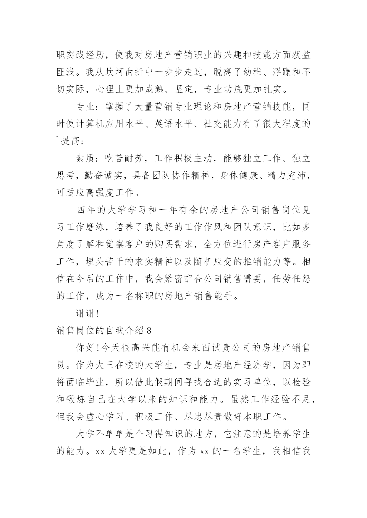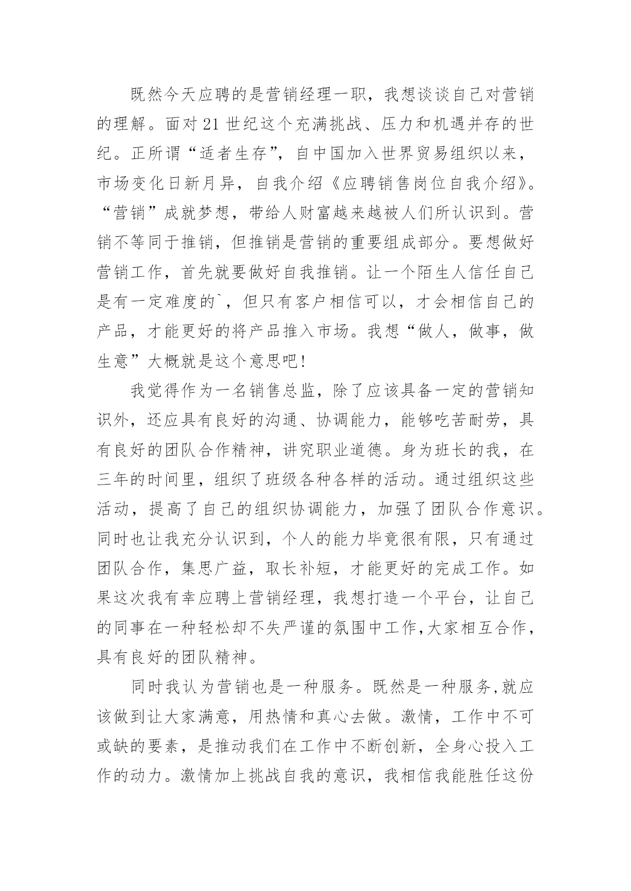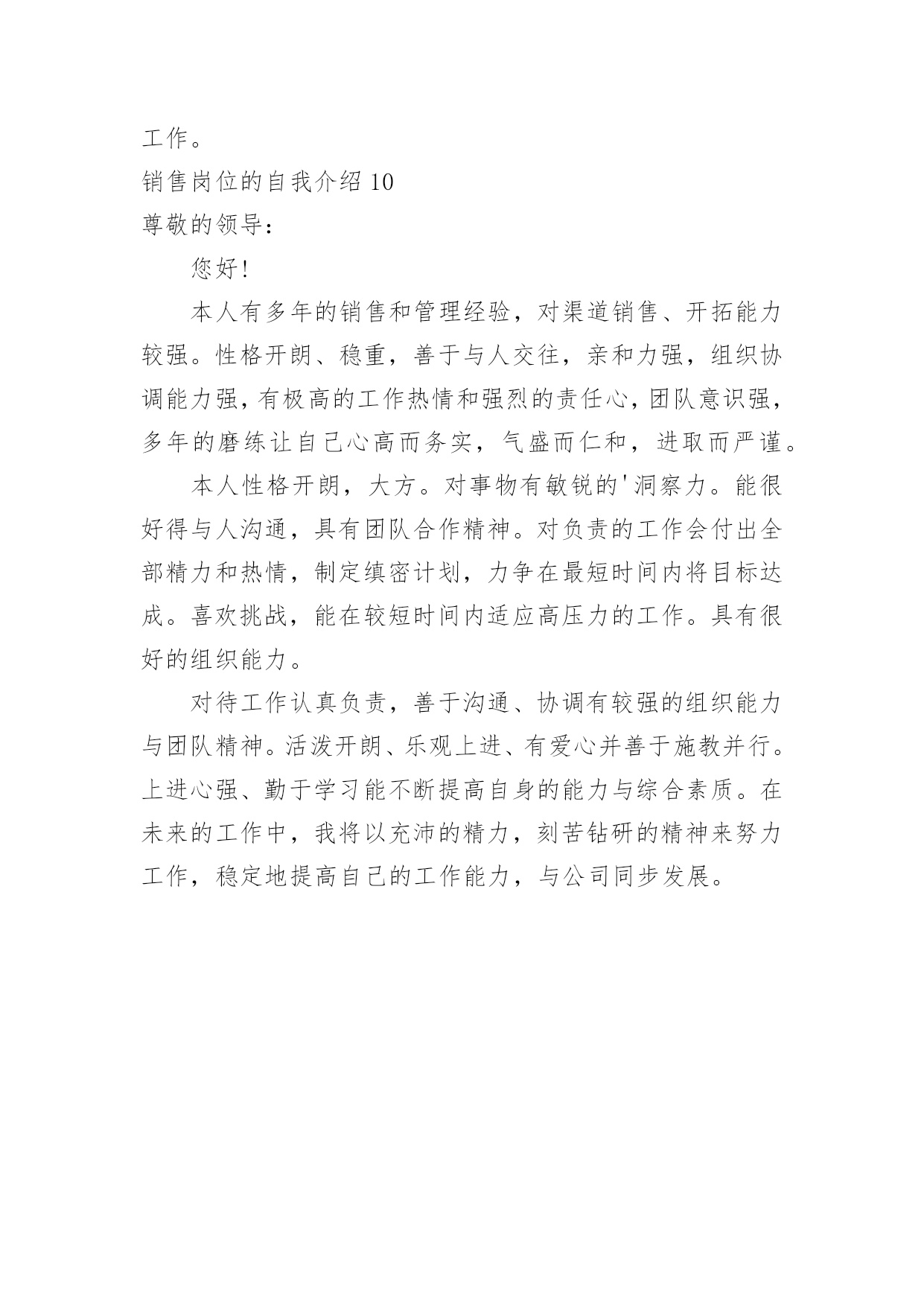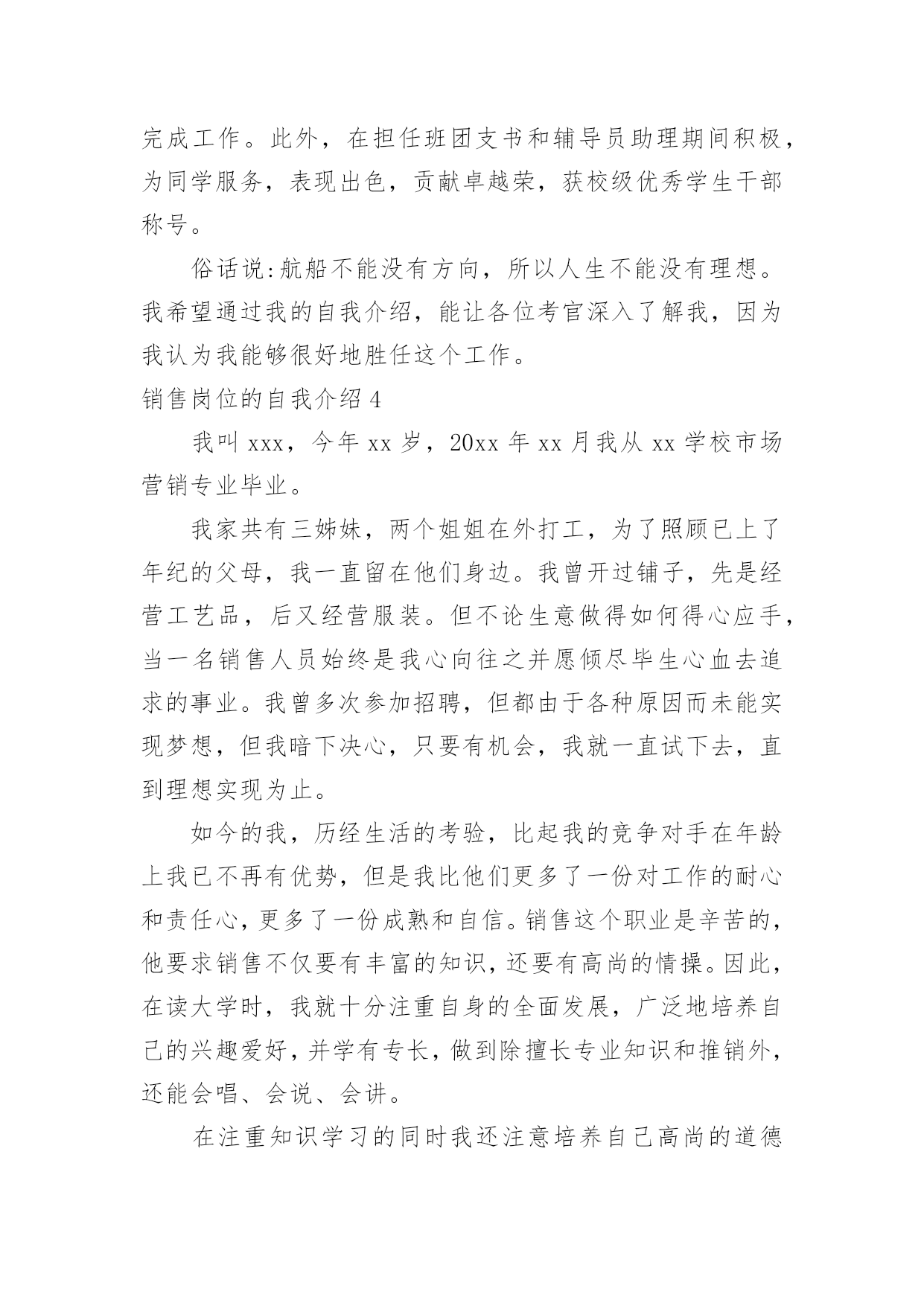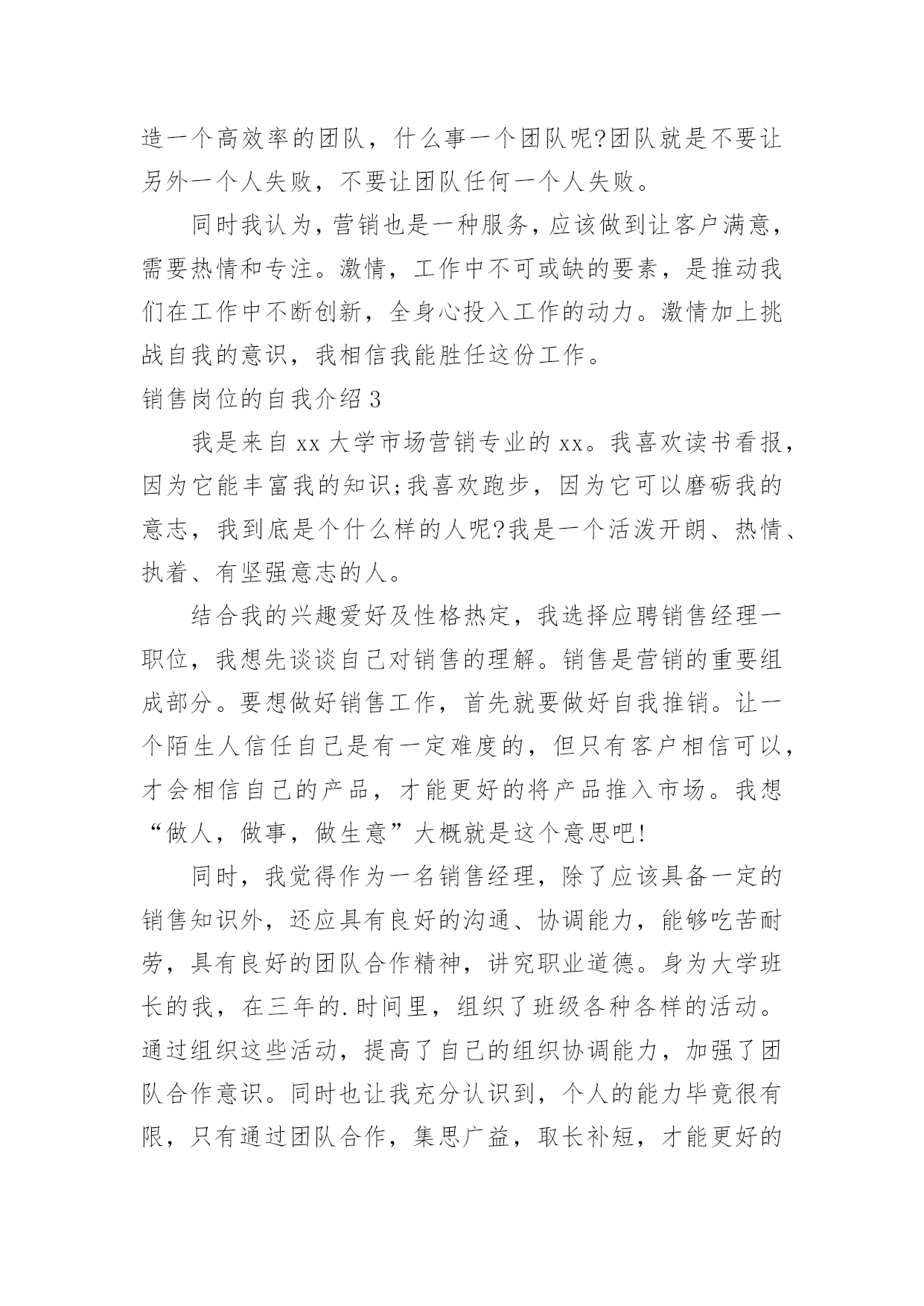 销售岗位的自我介绍销售岗位的自我介绍当去到一个新环境下,我们难以避免地要作出自我介绍,用自我介绍往往可以让他人有一定的了解。千万不能认为自我介绍随便应付就可以,下面是小编为大家收集的销售岗位的自我介绍,欢迎阅读与收藏。销售岗位的自我介绍1我是***,毕业于大学市场营销专业的。我喜欢读书看报,因为它能丰富我的知识,拓展我的视野;我喜欢跑步,因为它可以磨砺我的意志,强健我的体魄.我活泼开朗、热情、执着、有坚强意志。既然今天竞聘的是营销经理一职,我想谈谈自己对营销的理解。面对21世纪这个充满挑战、压力和机遇并存的世纪。正所谓“适者生存”,自中国加入世界贸易组织以来,市场变化日新月异。“营销”成就梦想,带给人财富越来越被人们所认识到。营销不等同于推销,但推销是营销的重要组成部分。要想做好营销工作,首先就要做好自我推销。让一个陌生人信任自己是有一定难度的,但只有客户相信可以,才会相信自己的产品,才能更好的将产品推入市场。我想“做人,做事,做生意”大概就是这个意思吧!我觉得作为一名销售总监,除了应该具备一定的营销知识外,还应具有良好的沟通、协调能力,能够吃苦耐劳,具有良好的团队合作精神,讲究职业道德。身为班长的我,在三年的时间里,组织了班级各种各样的活动。通过组织这些活动,提高了自己的组织协调能力,加强了团队合作意识。同时也让我充分认识到,个人的'能力毕竟很有限,只有通过团队合作,集思广益,取长补短,才能更好的完成工作。如果这次我有幸竞聘上营销经理,我想打造一个平台,让自己的同事在一种轻松却不失严谨的氛围中工作,大家相互合作,具有良好的团队精神。销售岗位的自我介绍2大家好,我叫XXX,现年XX岁,本科文凭,我学的是市场营销专业,我平时喜欢跑步和看书。喜欢读书,是因为它能丰富我的知识,喜欢跑步,是因为它可以磨砺我的意志。我是一个活泼开朗、热情、执着、有坚强意志的人。今天我应聘的是营销经理,那么我就谈谈我对营销的理解。营销人员首先就要做好自我推销,让一个陌生人信任自己是有一定难度的,但只有让客户相信自己,才会相信自己的产品,才能更好的将产品推入市场。我认为作为一名营销经理,除了应该具备专业知识之外,还要有良好的`沟通,协调能力和有良好的团队合作精神。身为班长的我,在大学三年的时间里,组织了班级各种各样的活动,通过组织这些活动,提供了自己的组织协调能力,加强了团队合作意识。同时也让我充分认识到,个人的能力毕竟有限,只有通过团队合作,集思广益,取长补短,才能更好的完成工作。如果我有幸应聘上营销经理,我想打造一个高效率的团队,什么事一个团队呢?团队就是不要让另外一个人失败,不要让团队任何一个人失败。同时我认为,营销也是一种服务,应该做到让客户满意,需要热情和专注。激情,工作中不可或缺的要素,是推动我们在工作中不断创新,全身心投入工作的动力。激情加上挑战自我的意识,我相信我能胜任这份工作。销售岗位的自我介绍3我是来自xx大学市场营销专业的xx。我喜欢读书看报,因为它能丰富我的知识;我喜欢跑步,因为它可以磨砺我的意志,我到底是个什么样的人呢?我是一个活泼开朗、热情、执着、有坚强意志的人。结合我的兴趣爱好及性格热定,我选择应聘销售经理一职位,我想先谈谈自己对销售的理解。销售是营销的重要组成部分。要想做好销售工作,首先就要做好自我推销。让一个陌生人信任自己是有一定难度的,但只有客户相信可以,才会相信自己的产品,才能更好的将产品推入市场。我想“做人,做事,做生意”大概就是这个意思吧!同时,我觉得作为一名销售经理,除了应该具备一定的销售知识外,还应具有良好的沟通、协调能力,能够吃苦耐劳,具有良好的团队合作精神,讲究职业道德。身为大学班长的我,在三年的.时间里,组织了班级各种各样的活动。通过组织这些活动,提高了自己的组织协调能力,加强了团队合作意识。同时也让我充分认识到,个人的能力毕竟很有限,只有通过团队合作,集思广益,取长补短,才能更好的完成工作。此外,在担任班团支书和辅导员助理期间积极,为同学服务,表现出色,贡献卓越荣,获校级优秀学生干部称号。俗话说:航船不能没有方向,所以人生不能没有理想。我希望通过我的自我介绍,能让各位考官深入了解我,因为我认为我能够很好地胜任这个工作。销售岗位的自我介绍4我叫xxx,今年xx岁,20xx年xx月我从xx学校市场营销专业毕业。我家共有三姊妹,两个姐姐在外打工,为了照顾已上了年纪的父母,我一直留在他们身边。我曾开过铺子,先是经营工艺品,后又经营服装。但不论生意做得如何得心应手,当一名销售人员始终是我心向往之并愿倾尽毕生心血去追求的事业。我曾多次参加招聘,但都由于各种原因而未能实现梦想,但我暗下决心,只要有机会,我就一直试下去,直到理想实现为止。如今的我,历经生活的考验,比起我的竞争对手在年龄上我已不再有优势,但是我比他们