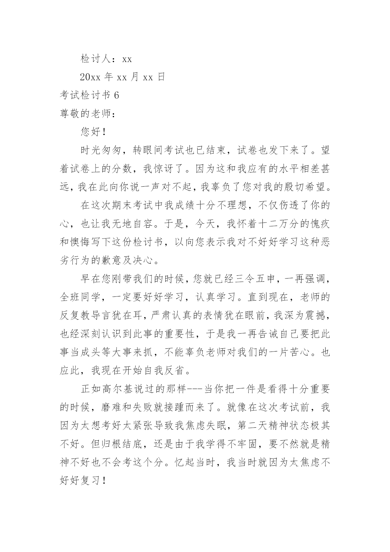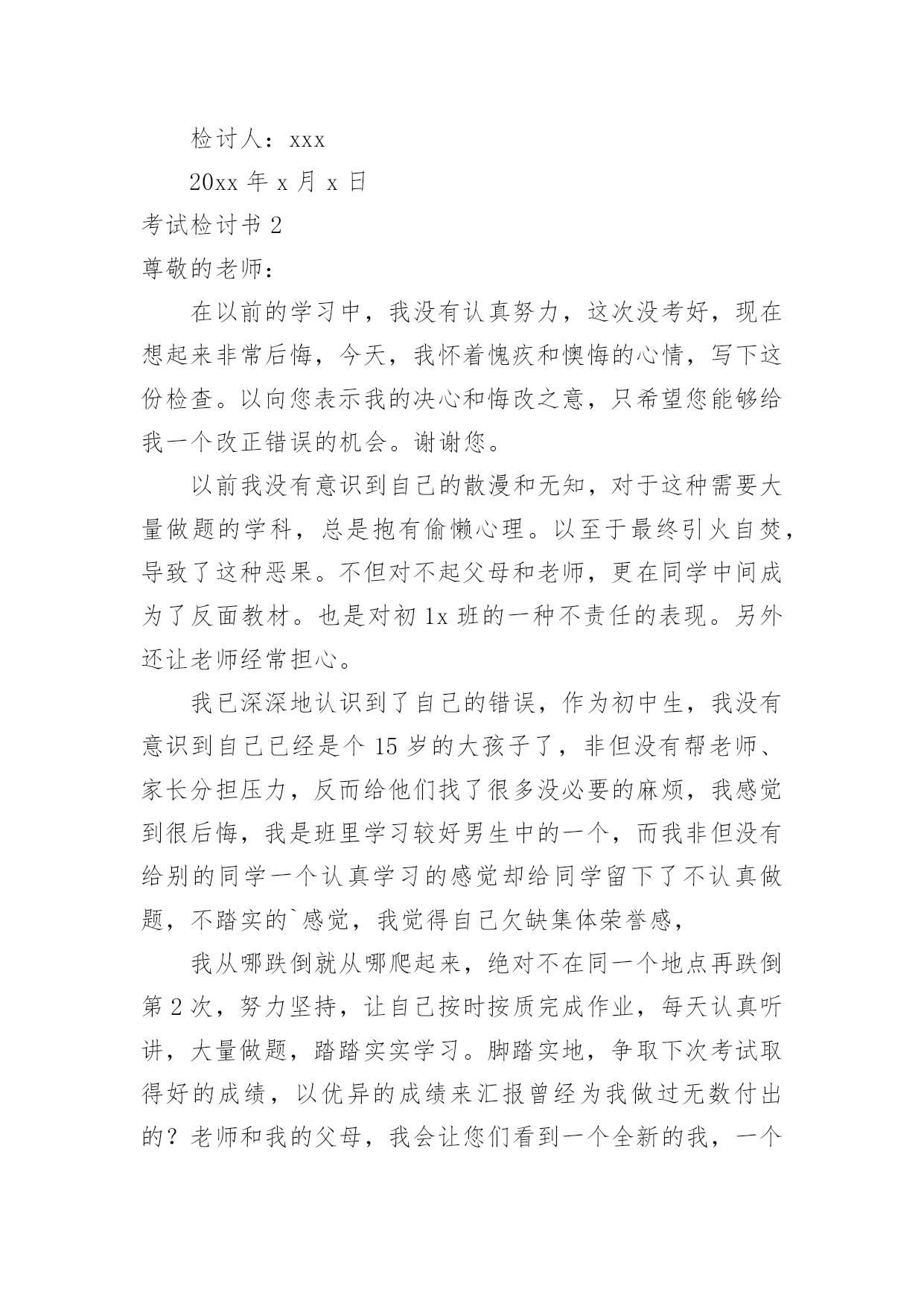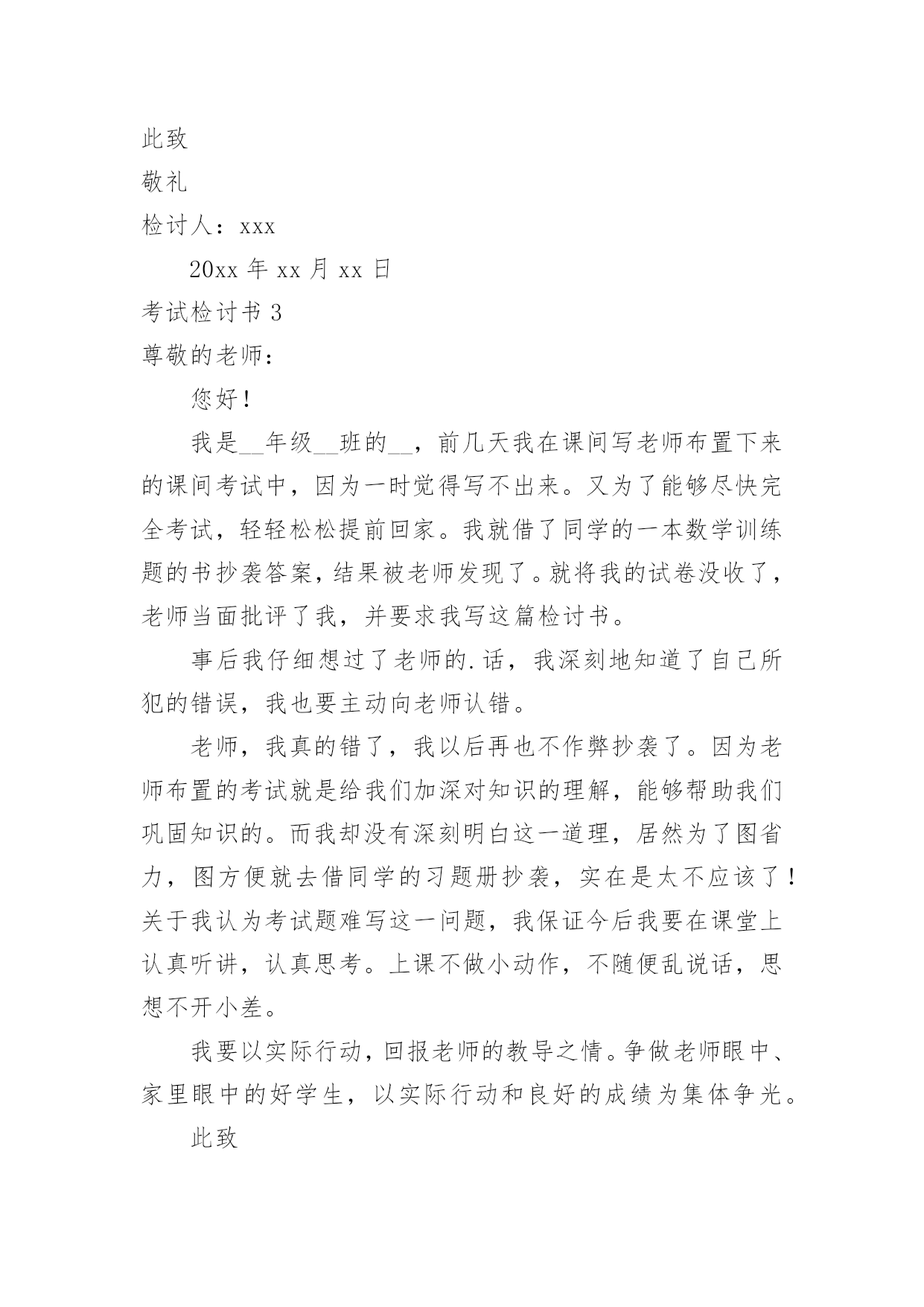 考试检讨书考试检讨书精选15篇在某件事出现失误后,为了避免再次出现相同情况,往往被要求写检讨书来自我悔过,在写检讨书的时候要注意态度要诚恳、端正。其实很多朋友都不知道怎么写检讨书吧!下面是小编为大家收集的考试检讨书,希望能够帮助到大家。考试检讨书1尊敬的老师:您好!这次考试,我没有遵守考场中的规定,而是作弊了,偷偷的把纸条带到考场上来,这样的行为也是让老师很是生气,我们班,就我一个这样的情况,而且这次考试,老师也是说了很多,成绩不好没关系,认清自己,然后以后努力就好,不要作弊,但是我却没有听,反而担心自己成绩糟糕太没有面子,来作弊了,被抓了,我也是更加的没有面子,而且对于自己也是没有任何的好处,这样作弊,我也是对于这次考试里的作弊行为要好好的去反省,认真对待,也在这里检讨。其实我也是知道,作弊不对,但总想着不会被老师抓到,之前其实也是没有做过弊,这次考前没有准备好,自己比较的担心成绩糟糕,拿着纸条进考场,其实也是在纠结到时候要不要拿出来用,结果真的考试之中,自己很多的题目的确是有些不知道怎么做,又不想选错了,导致没有分数,于是也偷偷的拿出纸条来看,结果我的行为也是被老师发现了,老师也是对于我这样做有些懊恼,同样的也是我也是清楚,在考场上作弊很不对,只是当时真的没想过被抓的后果,只想着有一个好的分数,完全没考虑作弊的后果是怎么样,成绩是虚假的,对于自己根本没有任何的好处,而且也是意识不到自己的.问题,其实会更加的糟糕,只有知道自己哪些方面是学好了,哪些又是没学好的,这样才能真的以后更有针对性去学习的,考试是检测我们学习的成果,而不能只是在乎这分数的。况且作弊的行为如果变成了习惯,以后都是会这样,平常也是不会再认真学习,觉得只要作弊就够了,那样自己的学习也是会变得更加的糟糕,一直欺骗自己,最后未来也是会后悔的,而今我也是要升入高三的阶段了,其实更应该静下心来学习,不要去想这些没有的方式,并不能真的提高成绩,成绩的获取只能靠自己平时的努力,认真的把知识学好才行的,老师,错误我也是意识到了,以后不会再这样,而且这次作弊也是让我更加的清醒认识到我平时的学习有多么的松懈,以后也是不能再这样懒惰下去。只有平时搞好了学习,上课认真了,课后的作业也是认真完成,不懂的地方多去问老师,和同学探讨,学好了,自然考试也是会更有信心,会进步的,作弊,不可取,以后我也是不会再干了。此致敬礼!检讨人:xxx20xx年x月x日考试检讨书2尊敬的老师:在以前的学习中,我没有认真努力,这次没考好,现在想起来非常后悔,今天,我怀着愧疚和懊悔的心情,写下这份检查。以向您表示我的决心和悔改之意,只希望您能够给我一个改正错误的机会。谢谢您。以前我没有意识到自己的散漫和无知,对于这种需要大量做题的学科,总是抱有偷懒心理。以至于最终引火自焚,导致了这种恶果。不但对不起父母和老师,更在同学中间成为了反面教材。也是对初1x班的一种不责任的表现。另外还让老师经常担心。我已深深地认识到了自己的错误,作为初中生,我没有意识到自己已经是个15岁的大孩子了,非但没有帮老师、家长分担压力,反而给他们找了很多没必要的麻烦,我感觉到很后悔,我是班里学习较好男生中的一个,而我非但没有给别的同学一个认真学习的感觉却给同学留下了不认真做题,不踏实的`感觉,我觉得自己欠缺集体荣誉感,我从哪跌倒就从哪爬起来,绝对不在同一个地点再跌倒第2次,努力坚持,让自己按时按质完成作业,每天认真听讲,大量做题,踏踏实实学习。脚踏实地,争取下次考试取得好的成绩,以优异的成绩来汇报曾经为我做过无数付出的?老师和我的父母,我会让您们看到一个全新的我,一个遵规守纪,尊重师长,按时完成作业,认真听讲,大量做题,踏踏实实学习。脚踏实地的初中生,一切跟着大家走,坚决不做个别生。所以我不可以再犯懒惰的错误了,我要积极地看待我所生活,学习过的每一天,给我自己留下一个美好的回忆,给同学和老师留下好的印象,让我在这3年的时间创造出一个另人折服的奇迹。这次,老师跟我谈了许多问题,给我敲响了警钟,使我幡然悔悟,理解到了“播种一个行为,收获一个习惯,播种一个习惯,收获一个性格,播种一个性格,收获一个命运”的道理。受到老师的批评和建议,我十分重视,并从内心上谴责自己,反省自己。要从观念上彻底转变,从自己身上找错误,查不足,深刻的反醒。我知道,错了并不重要,重要的是在自己做错事的时候,能够正确的认识到自己的错误,并且知道如何改过自身,所以我在以后的日子里,会格外的严格要求自己,不会让自己再重蹈覆辙了。在此,希望您能够再给我一次机会,我一定会好好努力,不再让老师及家长失望。您每天那么忙碌次为同学奔波,还要为我而操心,我已经深深地了解到了您对我们的爱,我不可以在这份真挚的爱上再次践踏了。因为在这份爱上不仅仅是老师对我的关心,还有希望,我下一次一定会用
