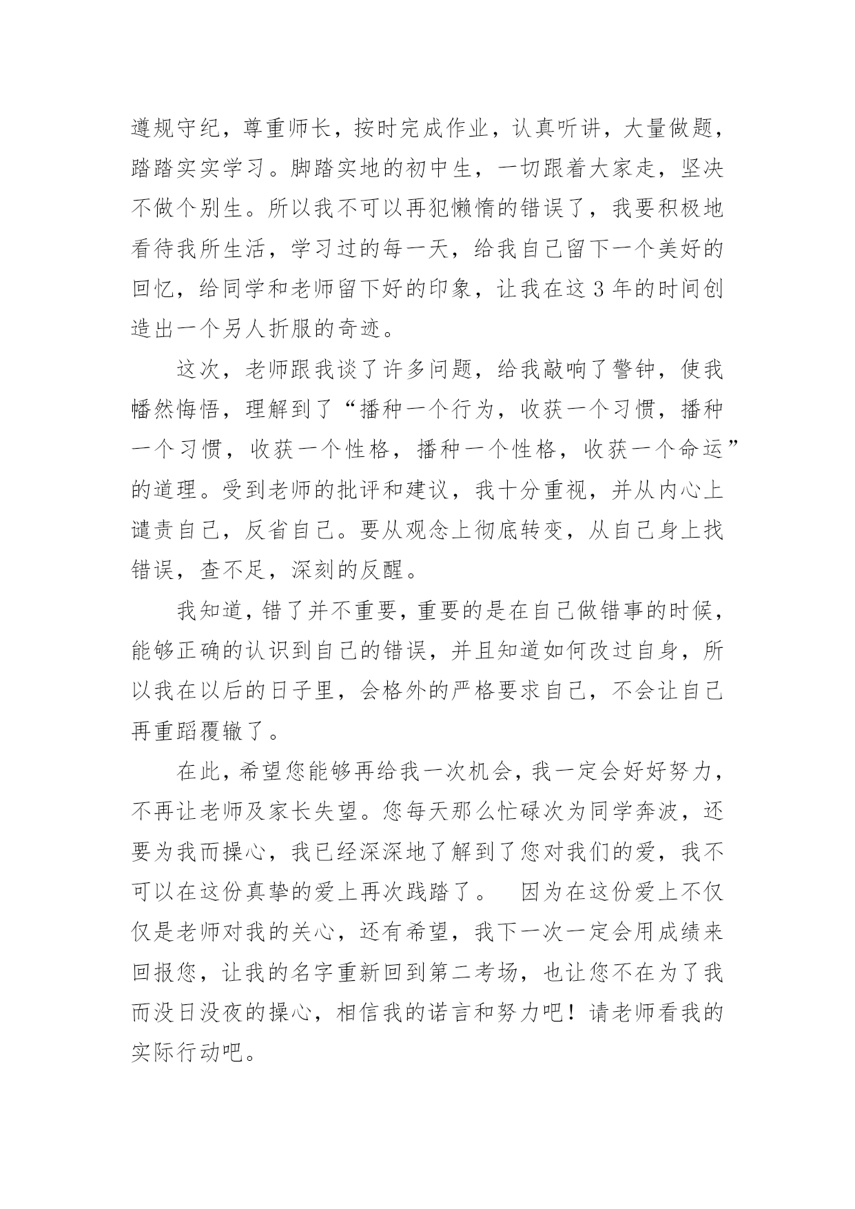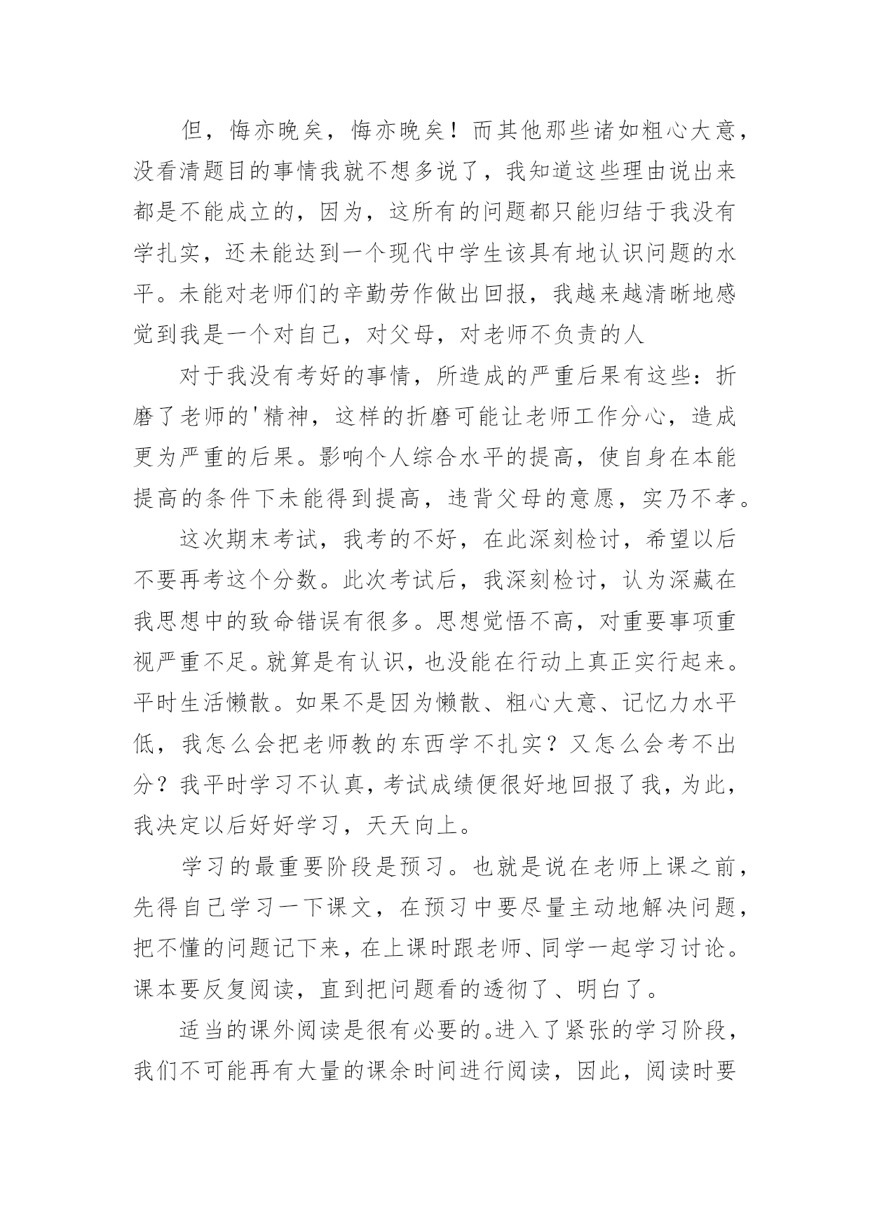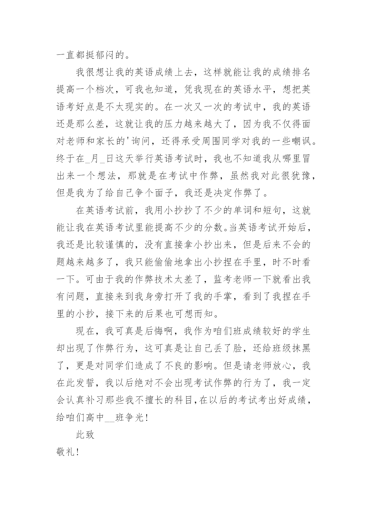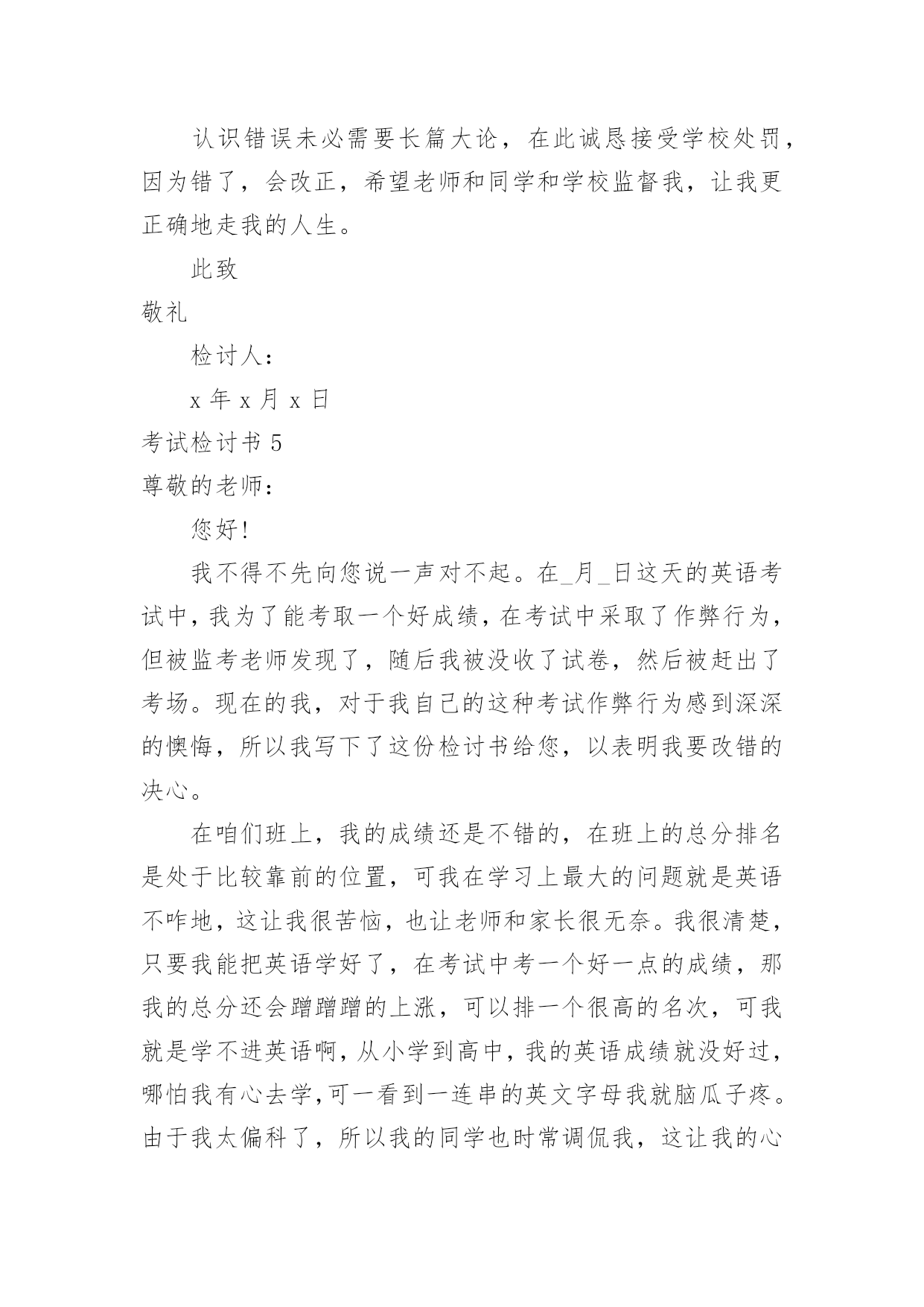 考试检讨书考试检讨书精选15篇在某件事出现失误后,为了避免再次出现相同情况,往往被要求写检讨书来自我悔过,在写检讨书的时候要注意态度要诚恳、端正。其实很多朋友都不知道怎么写检讨书吧!下面是小编为大家收集的考试检讨书,希望能够帮助到大家。考试检讨书1尊敬的老师:您好!这次考试,我没有遵守考场中的规定,而是作弊了,偷偷的把纸条带到考场上来,这样的行为也是让老师很是生气,我们班,就我一个这样的情况,而且这次考试,老师也是说了很多,成绩不好没关系,认清自己,然后以后努力就好,不要作弊,但是我却没有听,反而担心自己成绩糟糕太没有面子,来作弊了,被抓了,我也是更加的没有面子,而且对于自己也是没有任何的好处,这样作弊,我也是对于这次考试里的作弊行为要好好的去反省,认真对待,也在这里检讨。其实我也是知道,作弊不对,但总想着不会被老师抓到,之前其实也是没有做过弊,这次考前没有准备好,自己比较的担心成绩糟糕,拿着纸条进考场,其实也是在纠结到时候要不要拿出来用,结果真的考试之中,自己很多的题目的确是有些不知道怎么做,又不想选错了,导致没有分数,于是也偷偷的拿出纸条来看,结果我的行为也是被老师发现了,老师也是对于我这样做有些懊恼,同样的也是我也是清楚,在考场上作弊很不对,只是当时真的没想过被抓的后果,只想着有一个好的分数,完全没考虑作弊的后果是怎么样,成绩是虚假的,对于自己根本没有任何的好处,而且也是意识不到自己的.问题,其实会更加的糟糕,只有知道自己哪些方面是学好了,哪些又是没学好的,这样才能真的以后更有针对性去学习的,考试是检测我们学习的成果,而不能只是在乎这分数的。况且作弊的行为如果变成了习惯,以后都是会这样,平常也是不会再认真学习,觉得只要作弊就够了,那样自己的学习也是会变得更加的糟糕,一直欺骗自己,最后未来也是会后悔的,而今我也是要升入高三的阶段了,其实更应该静下心来学习,不要去想这些没有的方式,并不能真的提高成绩,成绩的获取只能靠自己平时的努力,认真的把知识学好才行的,老师,错误我也是意识到了,以后不会再这样,而且这次作弊也是让我更加的清醒认识到我平时的学习有多么的松懈,以后也是不能再这样懒惰下去。只有平时搞好了学习,上课认真了,课后的作业也是认真完成,不懂的地方多去问老师,和同学探讨,学好了,自然考试也是会更有信心,会进步的,作弊,不可取,以后我也是不会再干了。此致敬礼!检讨人:xxx20xx年x月x日考试检讨书2尊敬的老师:在以前的学习中,我没有认真努力,这次没考好,现在想起来非常后悔,今天,我怀着愧疚和懊悔的心情,写下这份检查。以向您表示我的决心和悔改之意,只希望您能够给我一个改正错误的机会。谢谢您。以前我没有意识到自己的散漫和无知,对于这种需要大量做题的学科,总是抱有偷懒心理。以至于最终引火自焚,导致了这种恶果。不但对不起父母和老师,更在同学中间成为了反面教材。也是对初1x班的一种不责任的表现。另外还让老师经常担心。我已深深地认识到了自己的错误,作为初中生,我没有意识到自己已经是个15岁的大孩子了,非但没有帮老师、家长分担压力,反而给他们找了很多没必要的麻烦,我感觉到很后悔,我是班里学习较好男生中的一个,而我非但没有给别的同学一个认真学习的感觉却给同学留下了不认真做题,不踏实的`感觉,我觉得自己欠缺集体荣誉感,我从哪跌倒就从哪爬起来,绝对不在同一个地点再跌倒第2次,努力坚持,让自己按时按质完成作业,每天认真听讲,大量做题,踏踏实实学习。脚踏实地,争取下次考试取得好的成绩,以优异的成绩来汇报曾经为我做过无数付出的?老师和我的父母,我会让您们看到一个全新的我,一个遵规守纪,尊重师长,按时完成作业,认真听讲,大量做题,踏踏实实学习。脚踏实地的初中生,一切跟着大家走,坚决不做个别生。所以我不可以再犯懒惰的错误了,我要积极地看待我所生活,学习过的每一天,给我自己留下一个美好的回忆,给同学和老师留下好的印象,让我在这3年的时间创造出一个另人折服的奇迹。这次,老师跟我谈了许多问题,给我敲响了警钟,使我幡然悔悟,理解到了“播种一个行为,收获一个习惯,播种一个习惯,收获一个性格,播种一个性格,收获一个命运”的道理。受到老师的批评和建议,我十分重视,并从内心上谴责自己,反省自己。要从观念上彻底转变,从自己身上找错误,查不足,深刻的反醒。我知道,错了并不重要,重要的是在自己做错事的时候,能够正确的认识到自己的错误,并且知道如何改过自身,所以我在以后的日子里,会格外的严格要求自己,不会让自己再重蹈覆辙了。在此,希望您能够再给我一次机会,我一定会好好努力,不再让老师及家长失望。您每天那么忙碌次为同学奔波,还要为我而操心,我已经深深地了解到了您对我们的爱,我不可以在这份真挚的爱上再次践踏了。因为在这份爱上不仅仅是老师对我的关心,还有希望,我下一次一定会用
