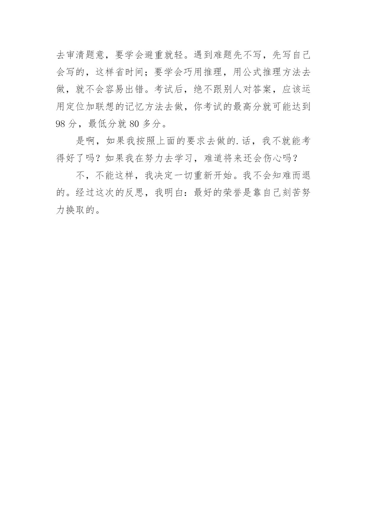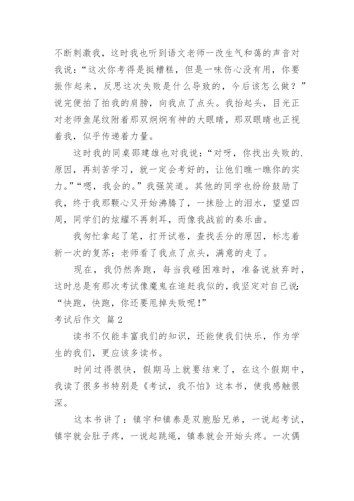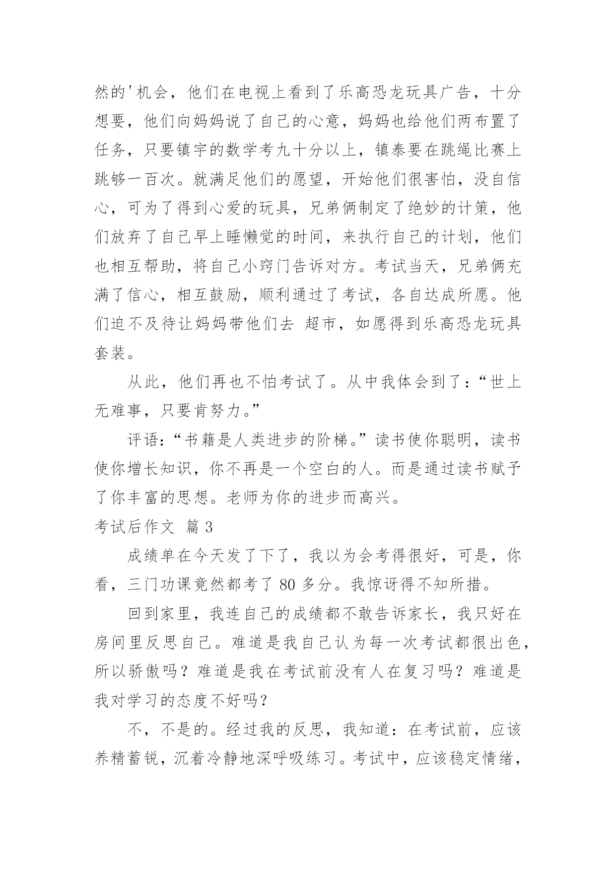 考试后作文考试后作文范例3篇在日常学习、工作和生活中,大家或多或少都会接触过作文吧,作文要求篇章结构完整,一定要避免无结尾作文的出现。你所见过的作文是什么样的呢?以下是小编精心整理的考试后作文3篇,仅供参考,欢迎大家阅读。考试后作文篇1期中考试过后,各科成绩陆续出来了,前七门都考得不尽人意,但道听途说我的语文成绩是92分。我不由自主得意了起来。到了第二天,语文老师公布了成绩,看着周围只打了八十几分的同学中我的心几乎提到了嗓子眼,最后终于点到了我的名字,“范凯”语文老师却没有想象中的笑容,却只是紧皱双眉的严厉神情,我一惊,我居然只考了72分,还没等我反应过来,却又是一声怒斥:“这次怎么搞的,考了这么点分!”我的眼圈顿时红了起来,心像无数把针刺穿了似的,回到了座位上,作为上等生的尊严已被伤害,泪水便像决堤的河水似的,豆大的泪水不停地滚出来。正当我痛哭时,我想起了考前我趾高气扬的样子,在写完之后不检查的样子,又想起了我在拼命玩乐时别人在努力镜头,而我笑他们的样子,最后还想起了我在呼呼大睡时,别人拼命复习时的样子,一切的一切都要归咎于我。下课了。我仍在痛哭,而周围正在炫耀的人,却又是在不断刺激我,这时我也听到语文老师一改生气和蔼的声音对我说:“这次你考得是挺糟糕,但是一味伤心没有用,你要振作起来,反思这次失败是什么导致的,今后该怎么做?”说完便拍了拍我的肩膀,向我点了点头。我抬起头,目光正对老师鱼尾纹附着那双炯炯有神的大眼睛,那双眼睛也正视着我,似乎传递着力量。这时我的同桌邵建雄也对我说:“对呀,你找出失败的.原因,再刻苦学习,就一定会考好的,让他们瞧一瞧你的实力。”“嗯,我会的。”我强笑道。其他的同学也纷纷鼓励了我,终于我那颗心又开始沸腾了,一抹脸上的泪水,望望四周,同学们的炫耀不再刺耳,而像我战前的奏乐曲。我匆忙拿起了笔,打开试卷,查找丢分的原因,标志着新一次的复苏;老师看了我点了点头,满意的走了。现在,我仍然奔跑,每当我碰困难时,准备说放弃时,这时总是有那次考试像魔鬼在追赶我似的,我坚定对自己说:“快跑,快跑,你还要甩掉失败呢!”考试后作文篇2读书不仅能丰富我们的知识,还能使我们快乐,作为学生的我们,更应该多读书。时间过得很快,假期马上就要结束了,在这个假期中,我读了很多书特别是《考试,我不怕》这本书,使我感触很深。这本书讲了:镇宇和镇泰是双胞胎兄弟,一说起考试,镇宇就会肚子疼,一说起跳绳,镇泰就会开始头疼。一次偶然的'机会,他们在电视上看到了乐高恐龙玩具广告,十分想要,他们向妈妈说了自己的心意,妈妈也给他们两布置了任务,只要镇宇的数学考九十分以上,镇泰要在跳绳比赛上跳够一百次。就满足他们的愿望,开始他们很害怕,没自信心,可为了得到心爱的玩具,兄弟俩制定了绝妙的计策,他们放弃了自己早上睡懒觉的时间,来执行自己的计划,他们也相互帮助,将自己小窍门告诉对方。考试当天,兄弟俩充满了信心,相互鼓励,顺利通过了考试,各自达成所愿。他们迫不及待让妈妈带他们去超市,如愿得到乐高恐龙玩具套装。从此,他们再也不怕考试了。从中我体会到了:“世上无难事,只要肯努力。”评语:“书籍是人类进步的阶梯。”读书使你聪明,读书使你增长知识,你不再是一个空白的人。而是通过读书赋予了你丰富的思想。老师为你的进步而高兴。考试后作文篇3成绩单在今天发了下了,我以为会考得很好,可是,你看,三门功课竟然都考了80多分。我惊讶得不知所措。回到家里,我连自己的成绩都不敢告诉家长,我只好在房间里反思自己。难道是我自己认为每一次考试都很出色,所以骄傲吗?难道是我在考试前没有人在复习吗?难道是我对学习的态度不好吗?不,不是的。经过我的反思,我知道:在考试前,应该养精蓄锐,沉着冷静地深呼吸练习。考试中,应该稳定情绪,去审清题意,要学会避重就轻。遇到难题先不写,先写自己会写的,这样省时间;要学会巧用推理,用公式推理方法去做,就不会容易出错。考试后,绝不跟别人对答案,应该运用定位加联想的记忆方法去做,你考试的最高分就可能达到98分,最低分就80多分。是啊,如果我按照上面的要求去做的.话,我不就能考得好了吗?如果我在努力去学习,难道将来还会伤心吗?不,不能这样,我决定一切重新开始。我不会知难而退的。经过这次的反思,我明白:最好的荣誉是靠自己刻苦努力换取的。
