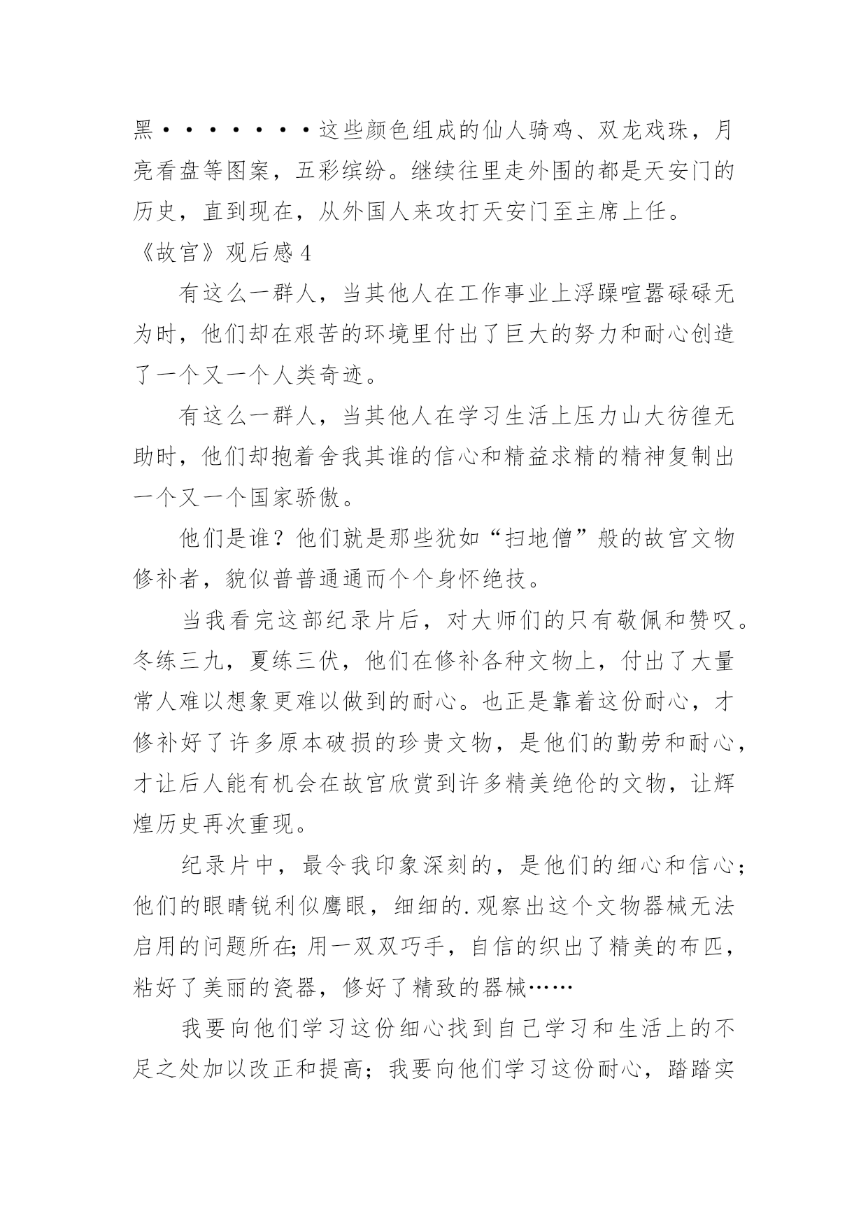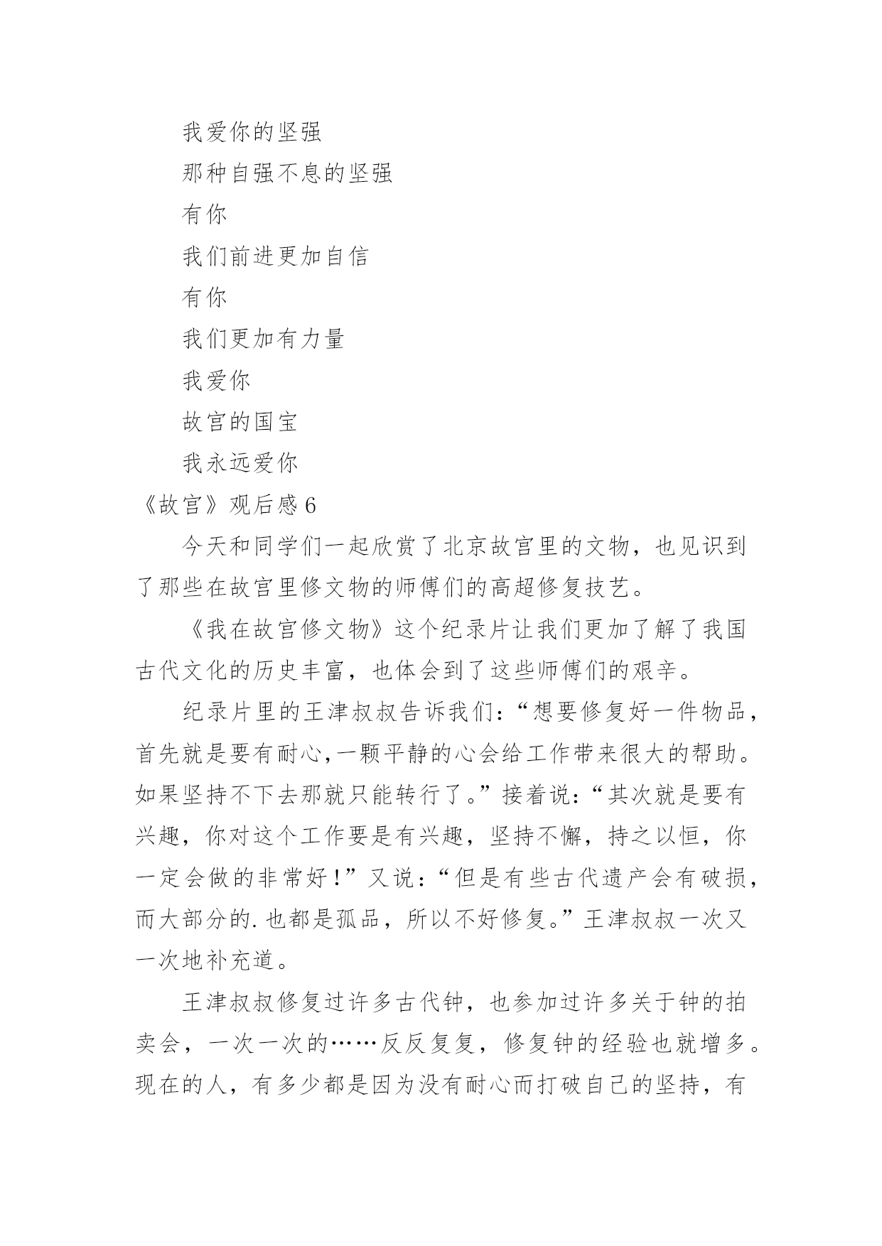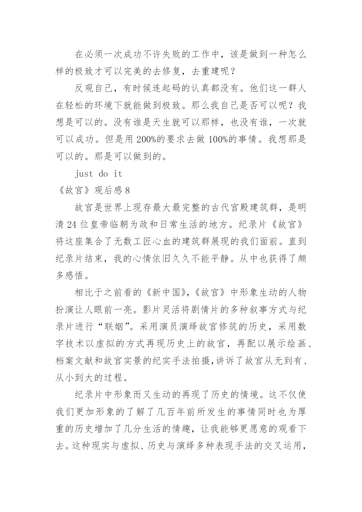 《故宫》观后感《故宫》观后感当观看完一部作品后,这次观看让你有什么领悟呢?此时需要认真地做好记录,写写观后感了。为了让您不再为写观后感头疼,下面是小编整理的《故宫》观后感,仅供参考,欢迎大家阅读。《故宫》观后感1记得四五年前我独自去北京办签证。等待递材料的日子又长又无聊,我几乎把能叫得上名字的地方都去了一遍,最后再没地方可以逛,就去了故宫。不为什么,只是觉得那是个氛围挺沉重的地方,不适合我当时焦灼的情绪。春末的北京阳光那么好,因为并不是节假日,故宫里并没有太多的人。我一个一个进去那些光线幽暗的展厅,玻璃展柜上粘满了无数游客留下的手印子和脸油印子。那些展品发着暗暗的雅雅的光泽,我很缓慢的一件一件看,很精美,想着它们被保存下来所经历的那些岁月或是战火,不由得肃然起敬。后来我不止一次逛过卢浮宫,庞大的馆厅和拥挤的人群,注定我只能走马观花的略一遍那些举世闻名的画作和雕塑,使劲举着手机拍一些满是后脑勺的照片发发朋友圈。巴黎那么热闹的`地方,总有更带劲的去处,博物馆只是浮躁的匆匆一瞥,我是最典型的卢浮宫游客之一。这记录片一下子把我拉回到四五年前的那段时光里。我一个人背着小包,里面装着711买的海苔包饭矿泉水跟一点零食,在故宫里晃悠一直到广播说关门,随时走累了就坐下晒晒太阳,春风和煦的吹拂着我的脸和手臂,心里对未来期待又惴惴不安。即使我现在回想起这一切来,也觉得微微的震荡,曾经向往的远方终于在脚下。《故宫》观后感2到达北京的第二天,我们去了北京最具有历史意义的两个建筑物——天安门和故宫。我们先来到天安门,天安门位于北京市中心,面临长安街。1949年10月1日,开国大典在在天安门举行。接着,我们走过汉白玉的金水桥,来到了故宫。看过太多的明清古诗,我就好像进入了梦境。这就是世界上最大的'皇宫——紫禁城。故宫太雄伟、壮观了,虽然它经历六百年的岁月,依然给人一种逼人的皇家威严。我们通过瑞门、午门后,又走过内金水桥,眼前的大殿就是太和门,过了太和门,眼前是一个偌大的广场,端坐着巍峨沉雄的太和殿——金銮殿,它是明清两朝皇帝行使权力、举行盛典的地方。皇帝的龙椅高高地摆放在中间最高点,周围宽敞的大厅就是古代群臣跪拜的地方。我想几百年前,这里是何等的威风,没想到几百年后我们普通老百姓都可以在这里游览。接着,我们又来到故宫文物藏馆——珍宝馆和钟表馆,看着这些价值连城的奇珍异宝,我感到晚清政府特别是慈禧太后的生活太奢侈了,怪不得会被八国联军入侵。不忘国耻。作为小学生的我们,应该努力学习,加强锻炼,为祖国的明天时刻做好准备。《故宫》观后感3今天是来北京的最后一天了,今晚我们就要回家,所以我们今天的任务很艰巨。早晨洗漱完毕后吃完早饭后,我们便往天安门赶。大约过了三个小时才到了,妈妈把菊花放在桌子上,我们就向第二个大厅走去,第二个大厅上面的门上写着特殊环境禁止拍照,我们走进去里面原来是在水晶棺材里面的毛爷爷,因为外面围着玻璃,所以不能近距离观赏。我们顺着后门走了出去。这时候已经上午,我们来到天安门广场,远远地就能够望见天安门,当年毛爷爷就是在这宣布了中国的成立。天安门有好几个门,走中间的那个门的上边,有毛爷爷的相片,左边上红色的板子上写着中华人民共和国万岁,右边的板子上写着世界人民大团结万岁。这时候,已经上午了我们到天安门里面的.新天苑吃了午饭,爸爸从售票处买回来了参过天安门二楼的票,我们拿着票来到了二楼,刚进门直冲我们的是一副画,画得栩栩如生。画上画的是一只在开屏的孔雀,好像欢迎人们的到来。他的四面八方全是画,我就不一一细说了。右侧是一个大国徽,直径差不多一米,非常大。抬头一看,天花板的颜色非常多,金黄、深蓝、翠绿、钛白、亮黑·······这些颜色组成的仙人骑鸡、双龙戏珠,月亮看盘等图案,五彩缤纷。继续往里走外围的都是天安门的历史,直到现在,从外国人来攻打天安门至主席上任。《故宫》观后感4有这么一群人,当其他人在工作事业上浮躁喧嚣碌碌无为时,他们却在艰苦的环境里付出了巨大的努力和耐心创造了一个又一个人类奇迹。有这么一群人,当其他人在学习生活上压力山大彷徨无助时,他们却抱着舍我其谁的信心和精益求精的精神复制出一个又一个国家骄傲。他们是谁?他们就是那些犹如“扫地僧”般的故宫文物修补者,貌似普普通通而个个身怀绝技。当我看完这部纪录片后,对大师们的只有敬佩和赞叹。冬练三九,夏练三伏,他们在修补各种文物上,付出了大量常人难以想象更难以做到的耐心。也正是靠着这份耐心,才修补好了许多原本破损的珍贵文物,是他们的勤劳和耐心,才让后人能有机会在故宫欣赏到许多精美绝伦的文物,让辉煌历史再次重现。纪录片中,最令我印象深刻的,是他们的细心和信心;他们的眼睛锐利似鹰眼,细细的.观察出这个文物器械无法启用的问题所在;用一双双巧手,自信的织出了精美的布匹,粘好了美丽的瓷器,修好了精致的器械…
