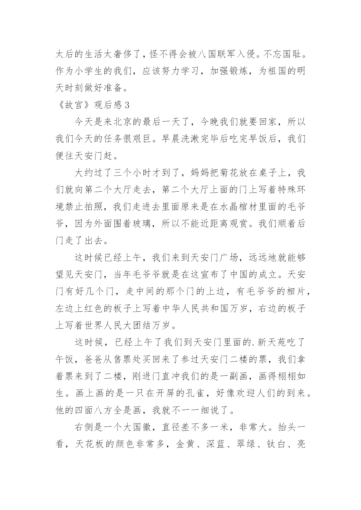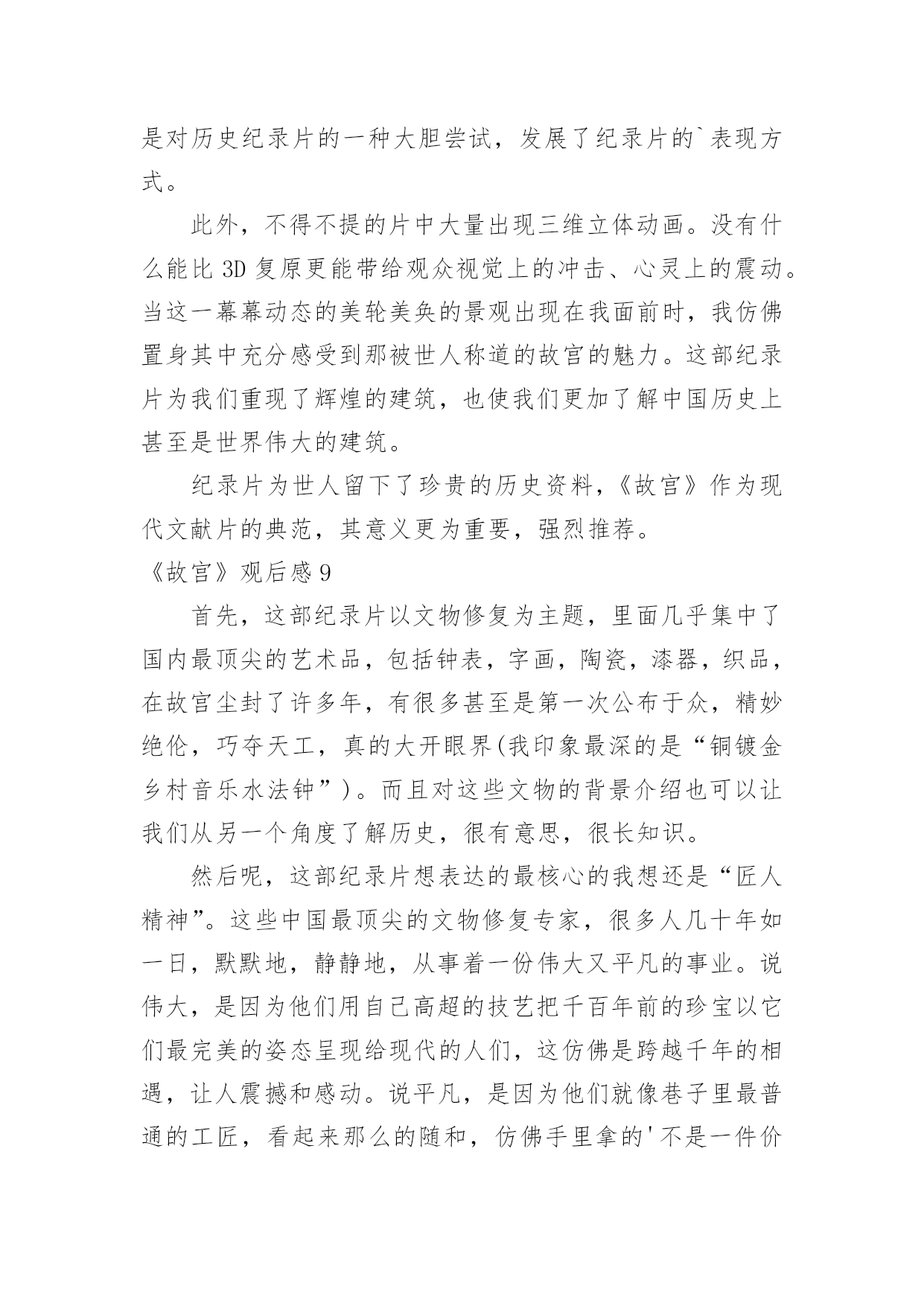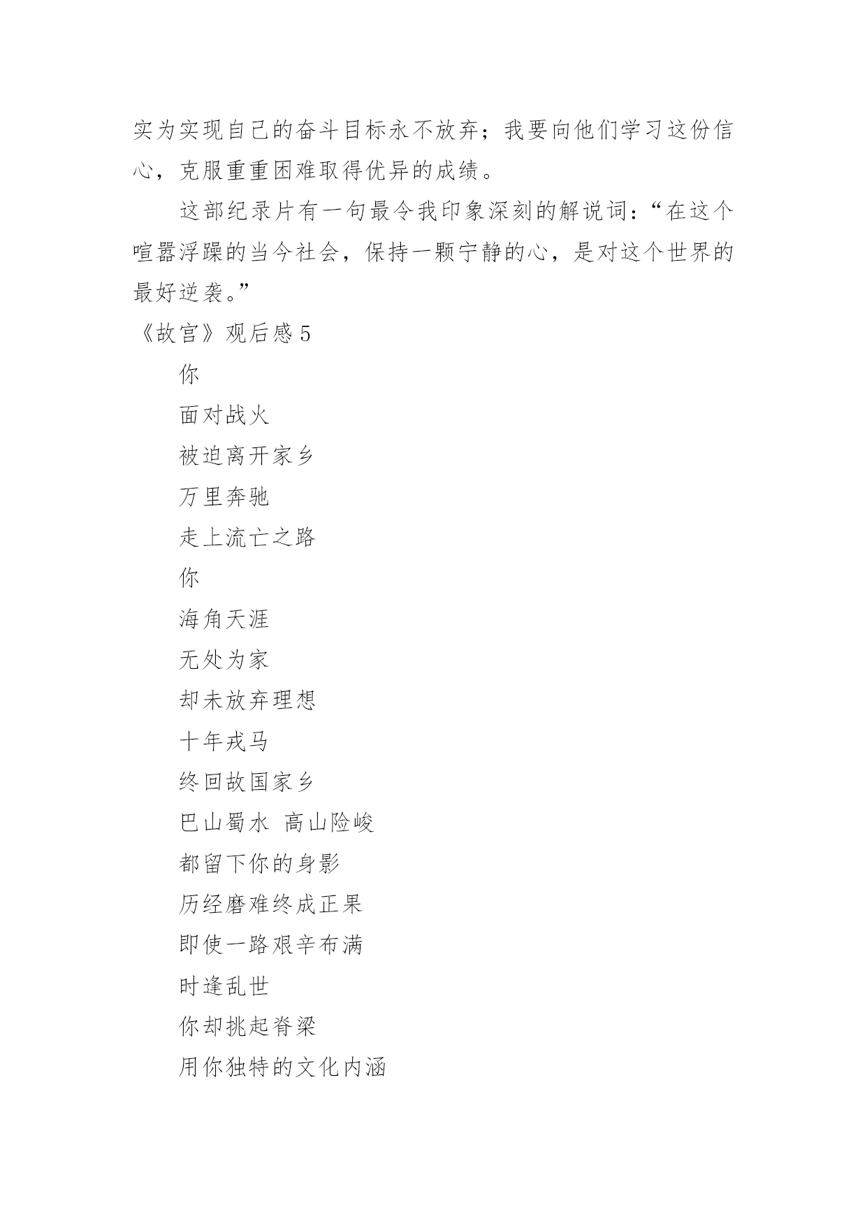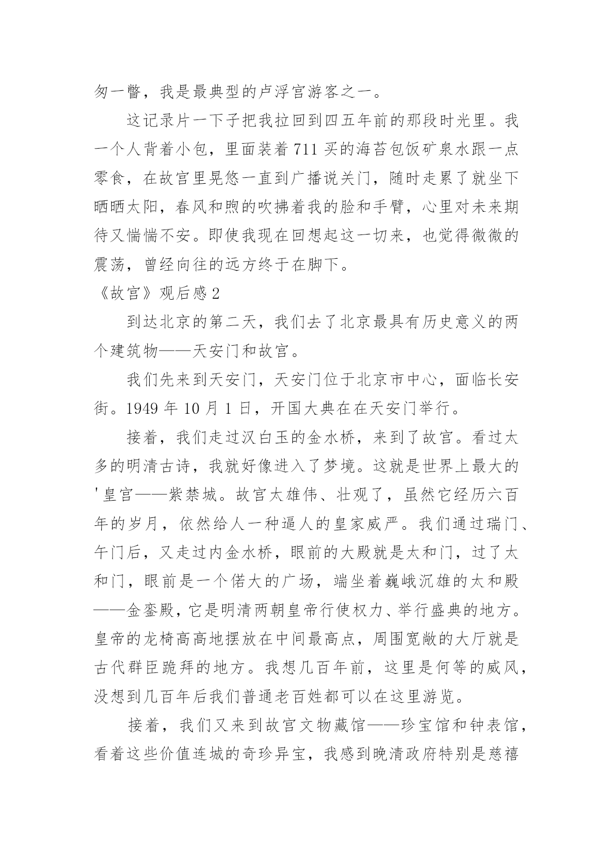 《故宫》观后感《故宫》观后感当观看完一部作品后,这次观看让你有什么领悟呢?此时需要认真地做好记录,写写观后感了。为了让您不再为写观后感头疼,下面是小编整理的《故宫》观后感,仅供参考,欢迎大家阅读。《故宫》观后感1记得四五年前我独自去北京办签证。等待递材料的日子又长又无聊,我几乎把能叫得上名字的地方都去了一遍,最后再没地方可以逛,就去了故宫。不为什么,只是觉得那是个氛围挺沉重的地方,不适合我当时焦灼的情绪。春末的北京阳光那么好,因为并不是节假日,故宫里并没有太多的人。我一个一个进去那些光线幽暗的展厅,玻璃展柜上粘满了无数游客留下的手印子和脸油印子。那些展品发着暗暗的雅雅的光泽,我很缓慢的一件一件看,很精美,想着它们被保存下来所经历的那些岁月或是战火,不由得肃然起敬。后来我不止一次逛过卢浮宫,庞大的馆厅和拥挤的人群,注定我只能走马观花的略一遍那些举世闻名的画作和雕塑,使劲举着手机拍一些满是后脑勺的照片发发朋友圈。巴黎那么热闹的`地方,总有更带劲的去处,博物馆只是浮躁的匆匆一瞥,我是最典型的卢浮宫游客之一。这记录片一下子把我拉回到四五年前的那段时光里。我一个人背着小包,里面装着711买的海苔包饭矿泉水跟一点零食,在故宫里晃悠一直到广播说关门,随时走累了就坐下晒晒太阳,春风和煦的吹拂着我的脸和手臂,心里对未来期待又惴惴不安。即使我现在回想起这一切来,也觉得微微的震荡,曾经向往的远方终于在脚下。《故宫》观后感2到达北京的第二天,我们去了北京最具有历史意义的两个建筑物——天安门和故宫。我们先来到天安门,天安门位于北京市中心,面临长安街。1949年10月1日,开国大典在在天安门举行。接着,我们走过汉白玉的金水桥,来到了故宫。看过太多的明清古诗,我就好像进入了梦境。这就是世界上最大的'皇宫——紫禁城。故宫太雄伟、壮观了,虽然它经历六百年的岁月,依然给人一种逼人的皇家威严。我们通过瑞门、午门后,又走过内金水桥,眼前的大殿就是太和门,过了太和门,眼前是一个偌大的广场,端坐着巍峨沉雄的太和殿——金銮殿,它是明清两朝皇帝行使权力、举行盛典的地方。皇帝的龙椅高高地摆放在中间最高点,周围宽敞的大厅就是古代群臣跪拜的地方。我想几百年前,这里是何等的威风,没想到几百年后我们普通老百姓都可以在这里游览。接着,我们又来到故宫文物藏馆——珍宝馆和钟表馆,看着这些价值连城的奇珍异宝,我感到晚清政府特别是慈禧太后的生活太奢侈了,怪不得会被八国联军入侵。不忘国耻。作为小学生的我们,应该努力学习,加强锻炼,为祖国的明天时刻做好准备。《故宫》观后感3今天是来北京的最后一天了,今晚我们就要回家,所以我们今天的任务很艰巨。早晨洗漱完毕后吃完早饭后,我们便往天安门赶。大约过了三个小时才到了,妈妈把菊花放在桌子上,我们就向第二个大厅走去,第二个大厅上面的门上写着特殊环境禁止拍照,我们走进去里面原来是在水晶棺材里面的毛爷爷,因为外面围着玻璃,所以不能近距离观赏。我们顺着后门走了出去。这时候已经上午,我们来到天安门广场,远远地就能够望见天安门,当年毛爷爷就是在这宣布了中国的成立。天安门有好几个门,走中间的那个门的上边,有毛爷爷的相片,左边上红色的板子上写着中华人民共和国万岁,右边的板子上写着世界人民大团结万岁。这时候,已经上午了我们到天安门里面的.新天苑吃了午饭,爸爸从售票处买回来了参过天安门二楼的票,我们拿着票来到了二楼,刚进门直冲我们的是一副画,画得栩栩如生。画上画的是一只在开屏的孔雀,好像欢迎人们的到来。他的四面八方全是画,我就不一一细说了。右侧是一个大国徽,直径差不多一米,非常大。抬头一看,天花板的颜色非常多,金黄、深蓝、翠绿、钛白、亮黑·······这些颜色组成的仙人骑鸡、双龙戏珠,月亮看盘等图案,五彩缤纷。继续往里走外围的都是天安门的历史,直到现在,从外国人来攻打天安门至主席上任。《故宫》观后感4有这么一群人,当其他人在工作事业上浮躁喧嚣碌碌无为时,他们却在艰苦的环境里付出了巨大的努力和耐心创造了一个又一个人类奇迹。有这么一群人,当其他人在学习生活上压力山大彷徨无助时,他们却抱着舍我其谁的信心和精益求精的精神复制出一个又一个国家骄傲。他们是谁?他们就是那些犹如“扫地僧”般的故宫文物修补者,貌似普普通通而个个身怀绝技。当我看完这部纪录片后,对大师们的只有敬佩和赞叹。冬练三九,夏练三伏,他们在修补各种文物上,付出了大量常人难以想象更难以做到的耐心。也正是靠着这份耐心,才修补好了许多原本破损的珍贵文物,是他们的勤劳和耐心,才让后人能有机会在故宫欣赏到许多精美绝伦的文物,让辉煌历史再次重现。纪录片中,最令我印象深刻的,是他们的细心和信心;他们的眼睛锐利似鹰眼,细细的.观察出这个文物器械无法启用的问题所在;用一双双巧手,自信的织出了精美的布匹,粘好了美丽的瓷器,修好了精致的器械…