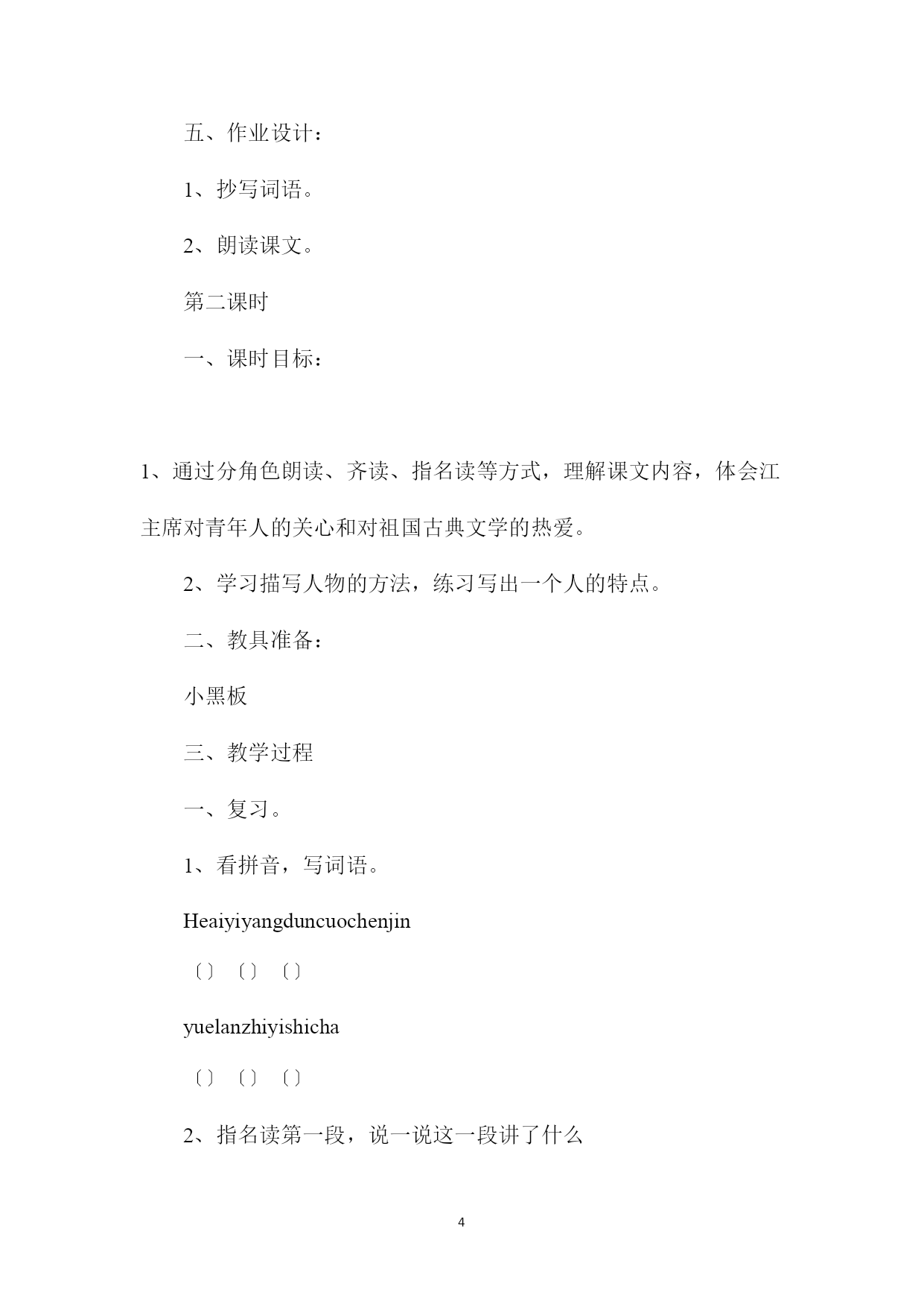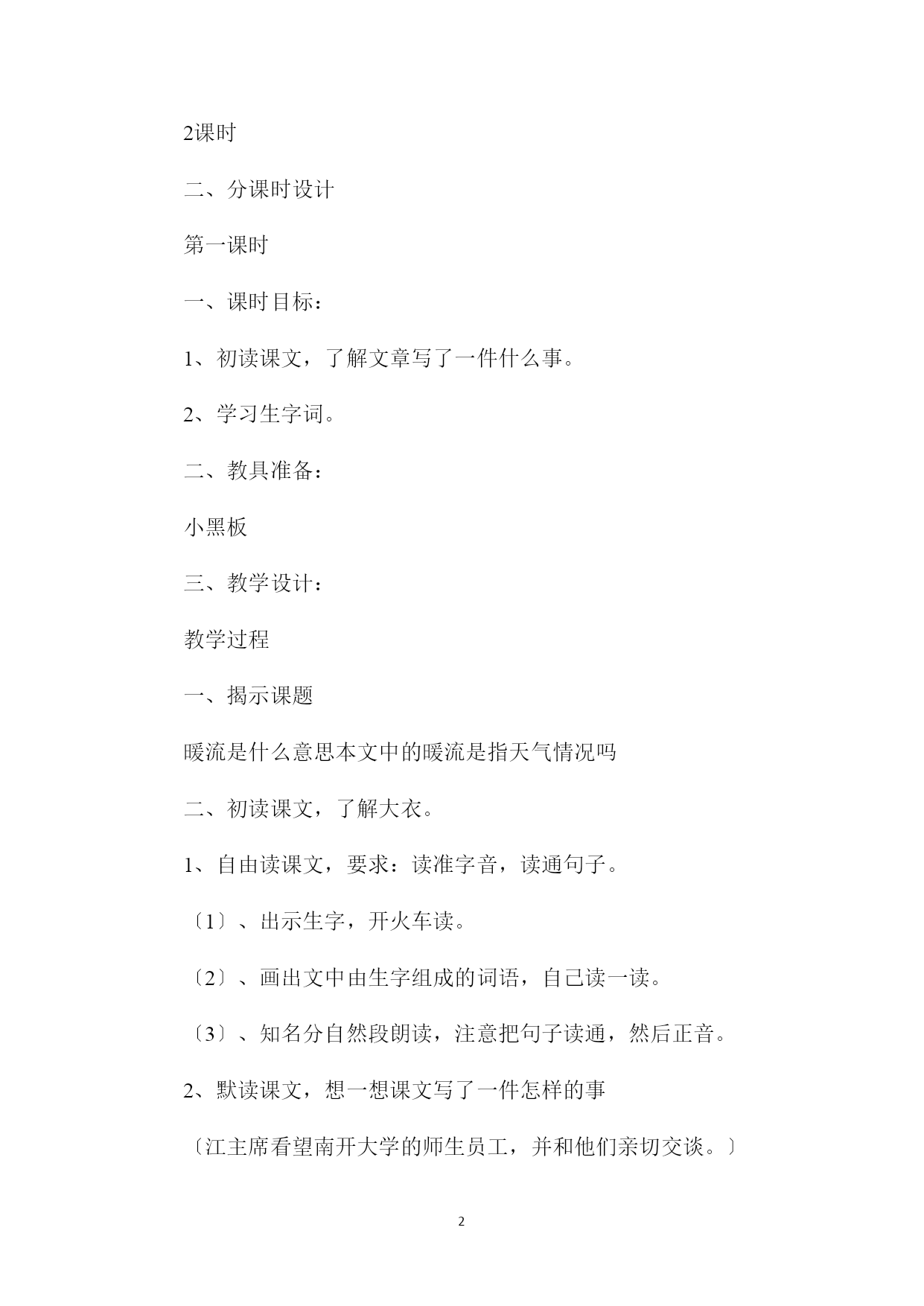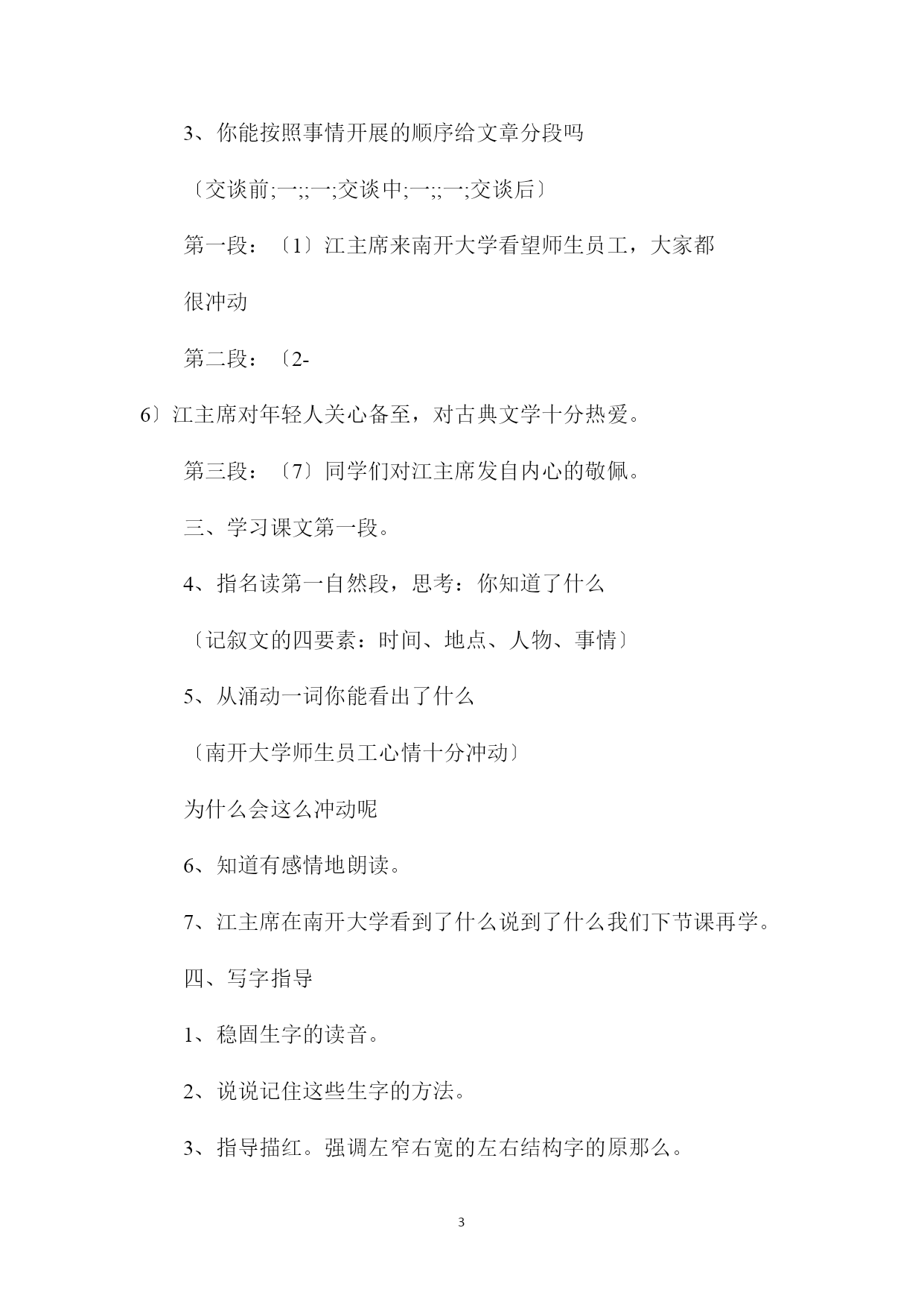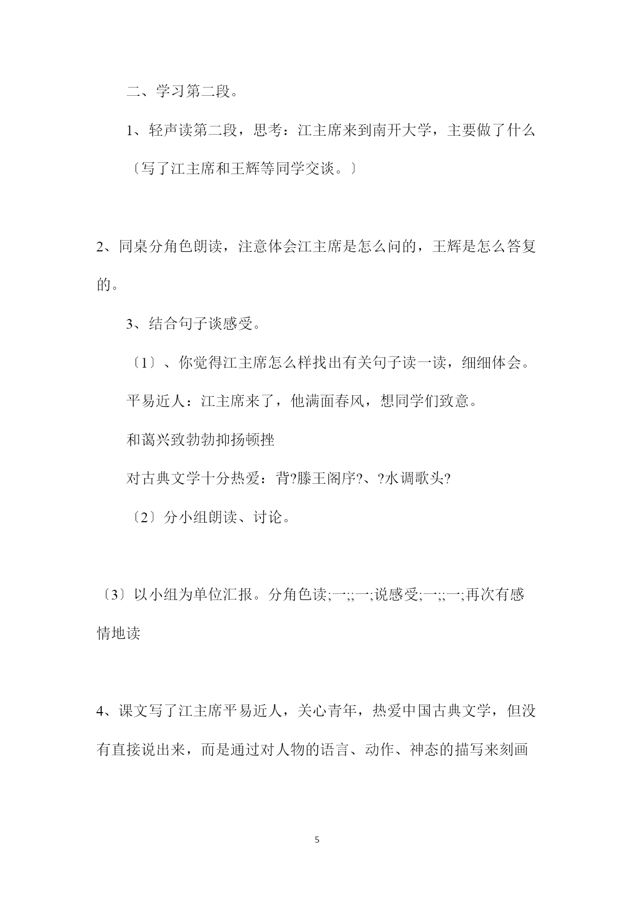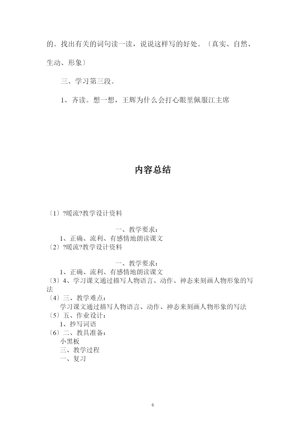 PAGEPAGE6?暖流?教学设计资料一、教学要求:1、正确、流利、有感情地朗读课文。2、学会本课的生字,理解由生字组成的词语。3、联系课文内容,理解暖流的含义,从具体的语言材料中体会江主席对青年人的关心和对祖国古典文学的热爱。4、学习课文通过描写人物语言、动作、神态来刻画人物形象的写法。二、教学重点:联系课文内容,理解暖流的含义,从具体的语言材料中体会江主席对青年人的关心和对祖国古典文学的热爱。三、教学难点:学习课文通过描写人物语言、动作、神态来刻画人物形象的写法。一、教学时间:2课时二、分课时设计第一课时一、课时目标:1、初读课文,了解文章写了一件什么事。2、学习生字词。二、教具准备:小黑板三、教学设计:教学过程一、揭示课题暖流是什么意思本文中的暖流是指天气情况吗二、初读课文,了解大衣。1、自由读课文,要求:读准字音,读通句子。〔1〕、出示生字,开火车读。〔2〕、画出文中由生字组成的词语,自己读一读。〔3〕、知名分自然段朗读,注意把句子读通,然后正音。2、默读课文,想一想课文写了一件怎样的事〔江主席看望南开大学的师生员工,并和他们亲切交谈。〕3、你能按照事情开展的顺序给文章分段吗〔交谈前;一;;一;交谈中;一;;一;交谈后〕第一段:〔1〕江主席来南开大学看望师生员工,大家都很冲动第二段:〔2-6〕江主席对年轻人关心备至,对古典文学十分热爱。第三段:〔7〕同学们对江主席发自内心的敬佩。三、学习课文第一段。4、指名读第一自然段,思考:你知道了什么〔记叙文的四要素:时间、地点、人物、事情〕5、从涌动一词你能看出了什么〔南开大学师生员工心情十分冲动〕为什么会这么冲动呢6、知道有感情地朗读。7、江主席在南开大学看到了什么说到了什么我们下节课再学。四、写字指导1、稳固生字的读音。2、说说记住这些生字的方法。3、指导描红。强调左窄右宽的左右结构字的原那么。五、作业设计:1、抄写词语。2、朗读课文。第二课时一、课时目标:1、通过分角色朗读、齐读、指名读等方式,理解课文内容,体会江主席对青年人的关心和对祖国古典文学的热爱。2、学习描写人物的方法,练习写出一个人的特点。二、教具准备:小黑板三、教学过程一、复习。1、看拼音,写词语。Heaiyiyangduncuochenjin〔〕〔〕〔〕yuelanzhiyishicha〔〕〔〕〔〕2、指名读第一段,说一说这一段讲了什么二、学习第二段。1、轻声读第二段,思考:江主席来到南开大学,主要做了什么〔写了江主席和王辉等同学交谈。〕2、同桌分角色朗读,注意体会江主席是怎么问的,王辉是怎么答复的。3、结合句子谈感受。〔1〕、你觉得江主席怎么样找出有关句子读一读,细细体会。平易近人:江主席来了,他满面春风,想同学们致意。和蔼兴致勃勃抑扬顿挫对古典文学十分热爱:背?滕王阁序?、?水调歌头?〔2〕分小组朗读、讨论。〔3〕以小组为单位汇报。分角色读;一;;一;说感受;一;;一;再次有感情地读4、课文写了江主席平易近人,关心青年,热爱中国古典文学,但没有直接说出来,而是通过对人物的语言、动作、神态的描写来刻画的。找出有关的词句读一读,说说这样写的好处。〔真实、自然、生动、形象〕三、学习第三段。1、齐读。想一想,王辉为什么会打心眼里佩服江主席内容总结〔1〕?暖流?教学设计资料一、教学要求:1、正确、流利、有感情地朗读课文〔2〕?暖流?教学设计资料一、教学要求:1、正确、流利、有感情地朗读课文〔3〕4、学习课文通过描写人物语言、动作、神态来刻画人物形象的写法〔4〕三、教学难点:学习课文通过描写人物语言、动作、神态来刻画人物形象的写法〔5〕五、作业设计:1、抄写词语〔6〕二、教具准备:小黑板三、教学过程一、复习