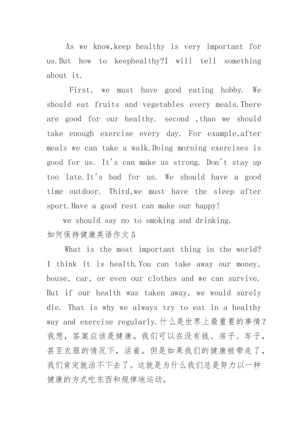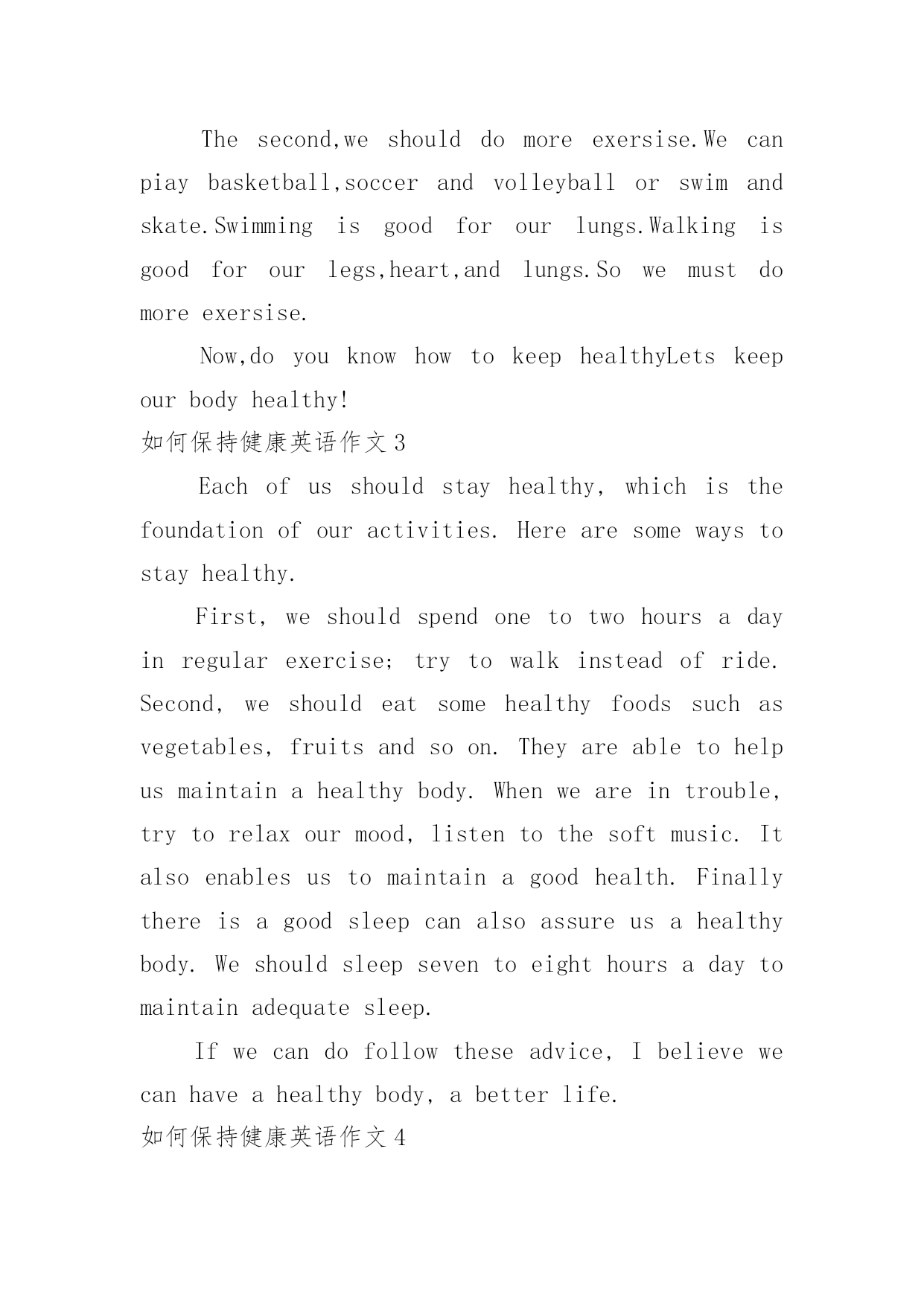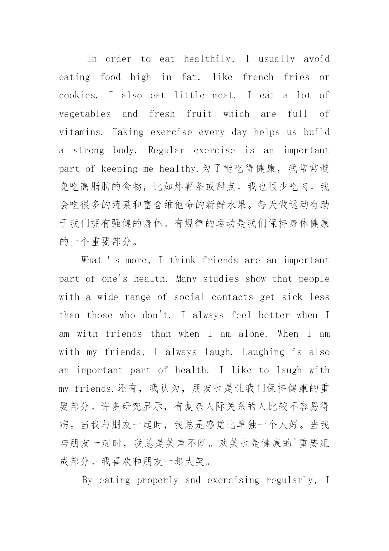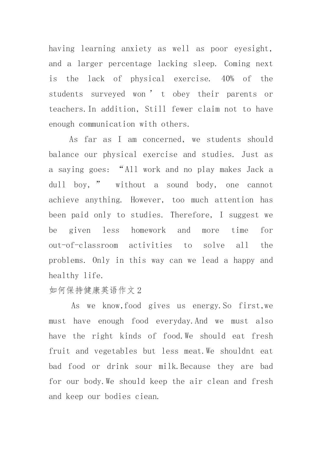 如何保持健康英语作文如何保持健康英语作文[精选]在现实生活或工作学习中,大家总少不了接触作文吧,作文是由文字组成,经过人的思想考虑,通过语言组织来表达一个主题意义的文体。为了让您在写作文时更加简单方便,下面是小编为大家整理的如何保持健康英语作文,欢迎阅读与收藏。如何保持健康英语作文1下表是对某中学高三(1)班50个学生健康问题的调查表。请根据表格内容,综述学生当前存在的健康问题,并就中学生如何保持身心健康提出自己的`建议。问题类型学习焦虑逆反心理缺乏交往睡眠不足缺乏锻炼视力不佳人数352015402535比例70%40%30%80%50%70%要求:词数150左右,2.可根据内容要点适当增加细节,使行文连贯Onepossibleversion:Asisapparentlyshowninthechartabove,manymiddleschoolstudentshaveproblemsbothphysicallyandmentally,with70%ofthestudentshavinglearninganxietyaswellaspooreyesight,andalargerpercentagelackingsleep.Comingnextisthelackofphysicalexercise.40%ofthestudentssurveyedwon’tobeytheirparentsorteachers.Inaddition,Stillfewerclaimnottohaveenoughcommunicationwithothers.AsfarasIamconcerned,westudentsshouldbalanceourphysicalexerciseandstudies.Justasasayinggoes:“AllworkandnoplaymakesJackadullboy,”withoutasoundbody,onecannotachieveanything.However,toomuchattentionhasbeenpaidonlytostudies.Therefore,Isuggestwebegivenlesshomeworkandmoretimeforout-of-classroomactivitiestosolvealltheproblems.Onlyinthiswaycanweleadahappyandhealthylife.如何保持健康英语作文2Asweknow,foodgivesusenergy.Sofirst,wemusthaveenoughfoodeveryday.Andwemustalsohavetherightkindsoffood.Weshouldeatfreshfruitandvegetablesbutlessmeat.Weshouldnteatbadfoodordrinksourmilk.Becausetheyarebadforourbody.Weshouldkeeptheaircleanandfreshandkeepourbodiesciean.Thesecond,weshoulddomoreexersise.Wecanpiaybasketball,soccerandvolleyballorswimandskate.Swimmingisgoodforourlungs.Walkingisgoodforourlegs,heart,andlungs.Sowemustdomoreexersise.Now,doyouknowhowtokeephealthyLetskeepourbodyhealthy!如何保持健康英语作文3Eachofusshouldstayhealthy,whichisthefoundationofouractivities.Herearesomewaystostayhealthy.First,weshouldspendonetotwohoursadayinregularexercise;trytowalkinsteadofride.Second,weshouldeatsomehealthyfoodssuchasvegetables,fruitsandsoon.Theyareabletohelpusmaintainahealthybody.Whenweareintrouble,trytorelaxourmood,listentothesoftmusic.Italsoenablesustomaintainagoodhealth.Finallythereisagoodsleepcanalsoassureusahealthybody.Weshouldsleepseventoeight