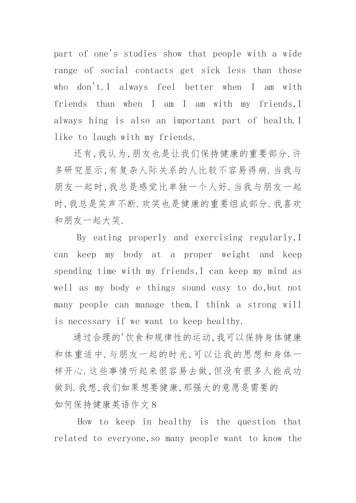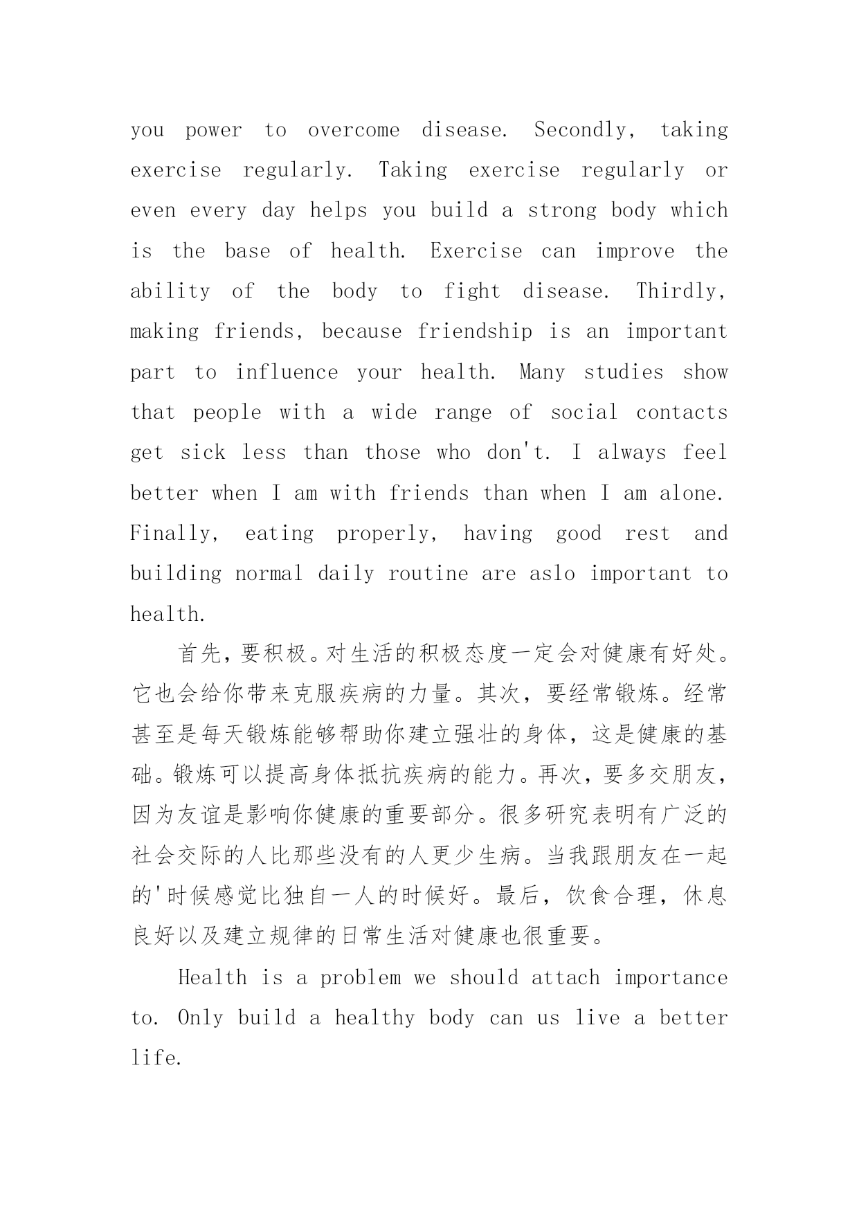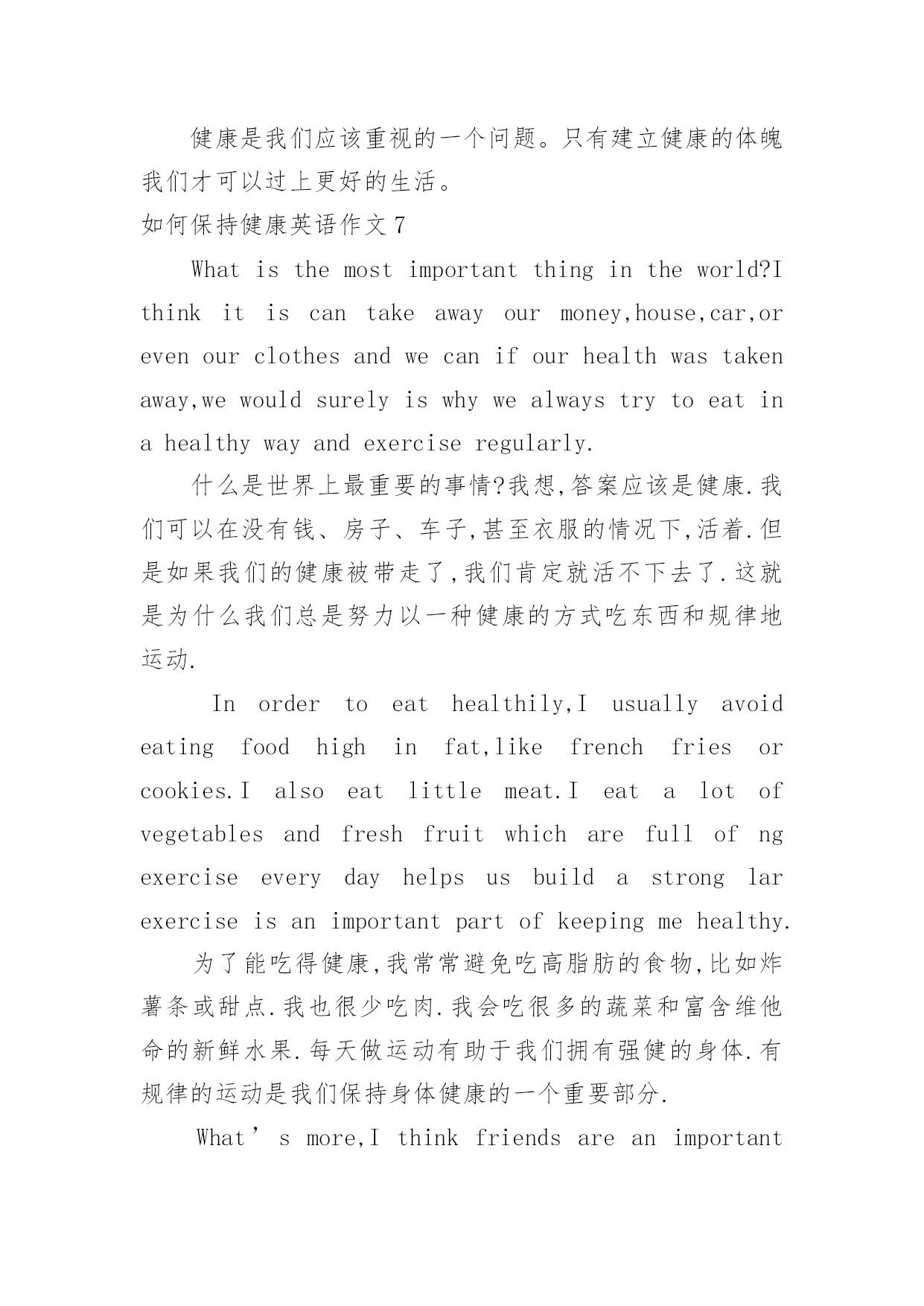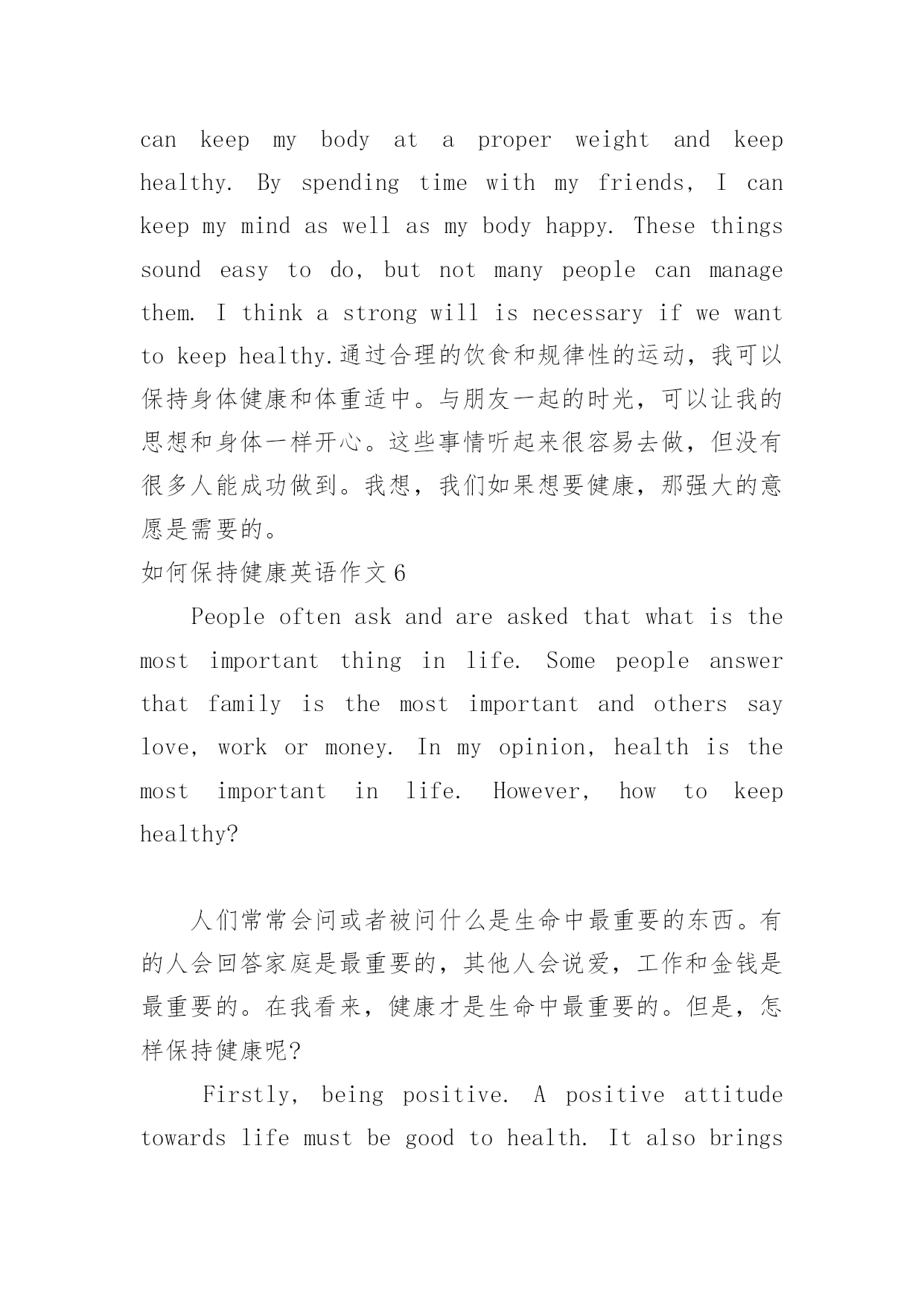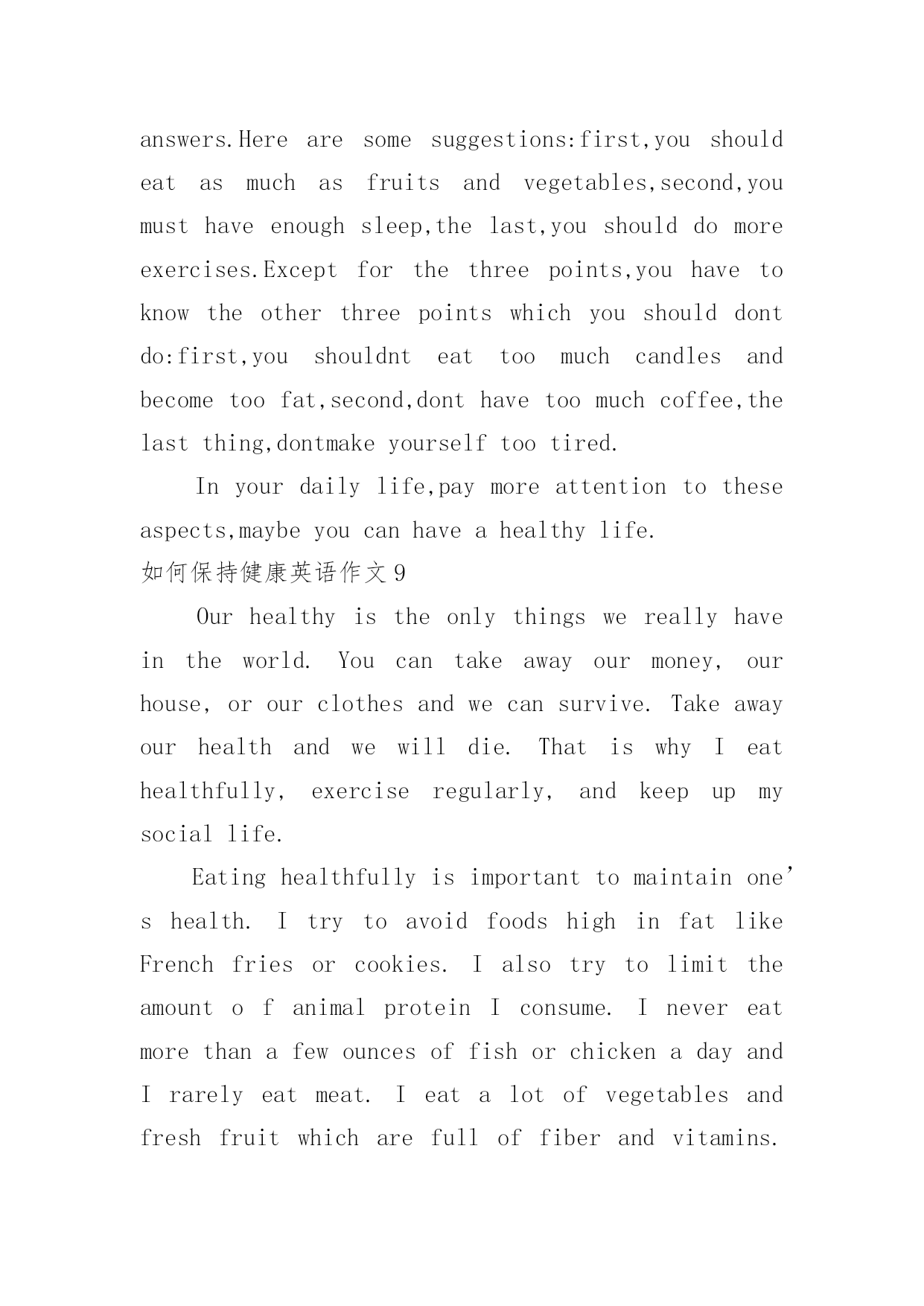 如何保持健康英语作文如何保持健康英语作文[精选]在现实生活或工作学习中,大家总少不了接触作文吧,作文是由文字组成,经过人的思想考虑,通过语言组织来表达一个主题意义的文体。为了让您在写作文时更加简单方便,下面是小编为大家整理的如何保持健康英语作文,欢迎阅读与收藏。如何保持健康英语作文1下表是对某中学高三(1)班50个学生健康问题的调查表。请根据表格内容,综述学生当前存在的健康问题,并就中学生如何保持身心健康提出自己的`建议。问题类型学习焦虑逆反心理缺乏交往睡眠不足缺乏锻炼视力不佳人数352015402535比例70%40%30%80%50%70%要求:词数150左右,2.可根据内容要点适当增加细节,使行文连贯Onepossibleversion:Asisapparentlyshowninthechartabove,manymiddleschoolstudentshaveproblemsbothphysicallyandmentally,with70%ofthestudentshavinglearninganxietyaswellaspooreyesight,andalargerpercentagelackingsleep.Comingnextisthelackofphysicalexercise.40%ofthestudentssurveyedwon’tobeytheirparentsorteachers.Inaddition,Stillfewerclaimnottohaveenoughcommunicationwithothers.AsfarasIamconcerned,westudentsshouldbalanceourphysicalexerciseandstudies.Justasasayinggoes:“AllworkandnoplaymakesJackadullboy,”withoutasoundbody,onecannotachieveanything.However,toomuchattentionhasbeenpaidonlytostudies.Therefore,Isuggestwebegivenlesshomeworkandmoretimeforout-of-classroomactivitiestosolvealltheproblems.Onlyinthiswaycanweleadahappyandhealthylife.如何保持健康英语作文2Asweknow,foodgivesusenergy.Sofirst,wemusthaveenoughfoodeveryday.Andwemustalsohavetherightkindsoffood.Weshouldeatfreshfruitandvegetablesbutlessmeat.Weshouldnteatbadfoodordrinksourmilk.Becausetheyarebadforourbody.Weshouldkeeptheaircleanandfreshandkeepourbodiesciean.Thesecond,weshoulddomoreexersise.Wecanpiaybasketball,soccerandvolleyballorswimandskate.Swimmingisgoodforourlungs.Walkingisgoodforourlegs,heart,andlungs.Sowemustdomoreexersise.Now,doyouknowhowtokeephealthyLetskeepourbodyhealthy!如何保持健康英语作文3Eachofusshouldstayhealthy,whichisthefoundationofouractivities.Herearesomewaystostayhealthy.First,weshouldspendonetotwohoursadayinregularexercise;trytowalkinsteadofride.Second,weshouldeatsomehealthyfoodssuchasvegetables,fruitsandsoon.Theyareabletohelpusmaintainahealthybody.Whenweareintrouble,trytorelaxourmood,listentothesoftmusic.Italsoenablesustomaintainagoodhealth.Finallythereisagoodsleepcanalsoassureusahealthybody.Weshouldsleepseventoeight