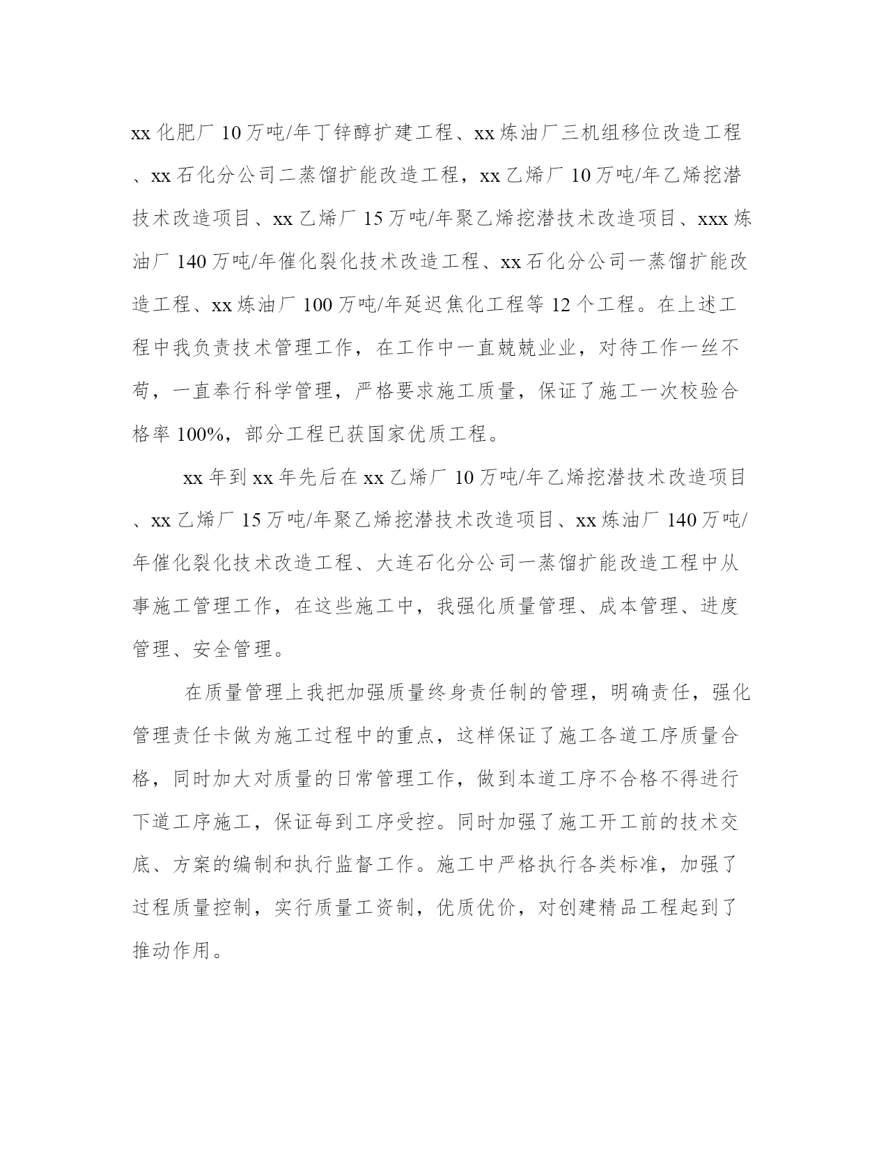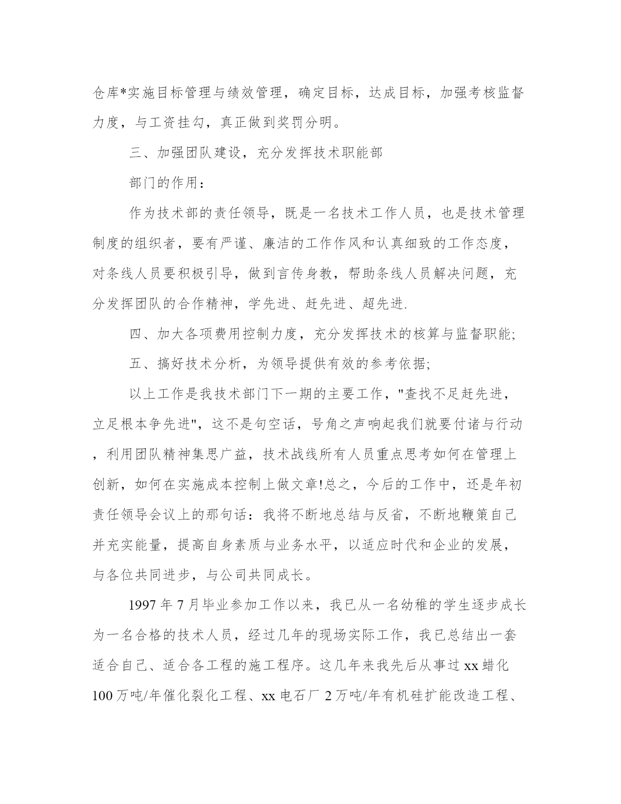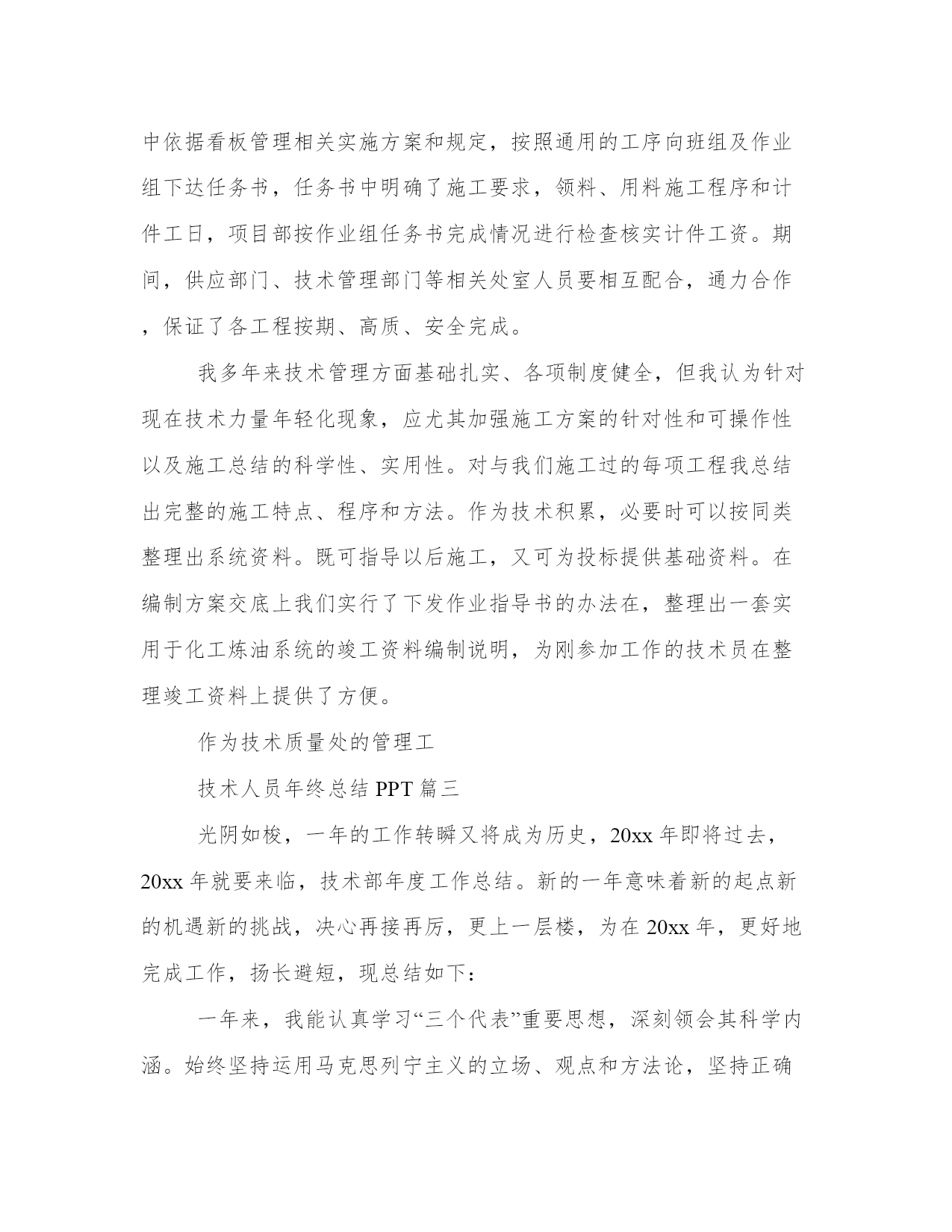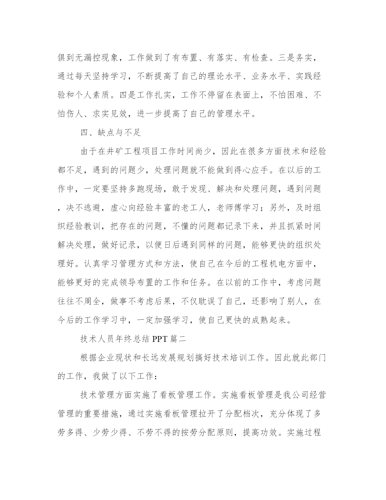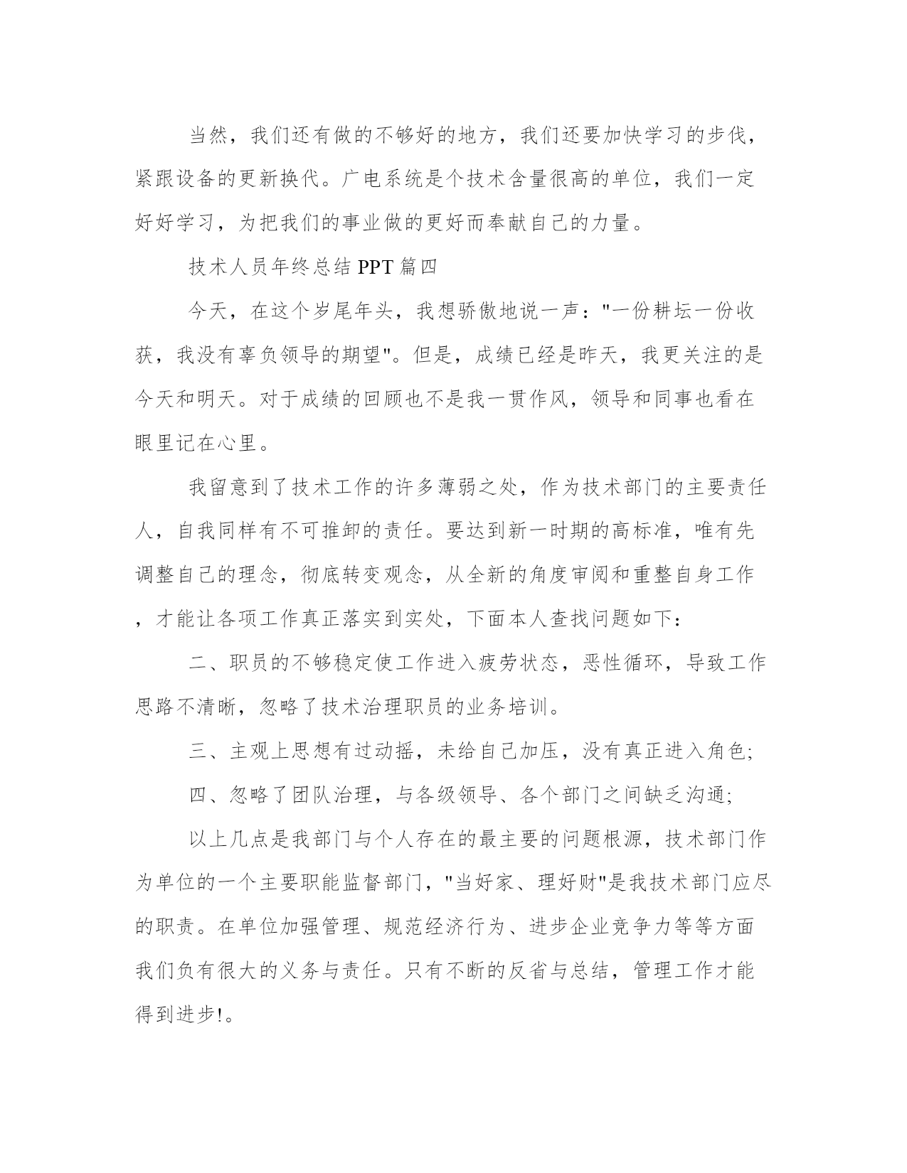 最新技术人员年终总结PPT(模板15篇)对某一单位、某一部门工作进行全面性总结,既反映工作的概况,取得的成绩,存在的问题、缺点,也要写经验教训和今后如何改进的意见等。总结怎么写才能发挥它最大的作用呢?那么下面我就给大家讲一讲总结怎么写才比较好,我们一起来看一看吧。技术人员年终总结PPT篇一作为工程机电安装与维护专业技术员,我的主要职责是负责工程项目机电技术管理工作,制定机电设备的检修安排工作和相应的管理规程、技术操作措施,并且经常深入现场,不断推广新工艺和新技术。一、在实践项目工程中我努力工作,认真履行职责,从技术和管理水平上不断提高自己,在各个方面都取得了较大成绩。在井矿工程项目中我与工人师傅们同上同下,遇到设备出现问题积极到现场处理故障、排除隐患。每天坚持到现场查验设备运转情况,高、低压设备的供配电情况;掌握井矿工程机电工艺流程,学习集中控制原理;了解控制信号的走线布置情况、信息传输方式。现在很多方面都取得了较大的进步,例如:对密控系统、浓缩机自动控制系统、过滤机闭环控制系统、组态王系统、加压过滤机系统、主厂房以及新厂房洗煤系统等,由浅入深的掌握了系统基本控制结构和原理。使我对矿井工程的机电过程有了很透彻的了解,并且有把以前学到的知识与实际生产有效的结合,为以后能够更好的理论联系实际,更好的促进生产、更好的减少工人师傅们的劳动强度、更有效的提高劳动生产效率、为企业和社会创造更多的效益打下了坚实的基础。二、其他方面一丝不苟的完善和完成电气安全规程措施,并且认真监督实施,在孔庄煤矿混合立井井筒工程中,通过对新设备的安装调试,更是学到了很多平时看不到的东西,使我对井矿的电气设备有了更深层次的理解。新厂房低压配电室各电气元器件均采用国内生产,交流接触器使用经常出现材料老化、辅助出头接触不良、信号不正常等现象,经过分析决定使用西门子进口接触器对其进行改造,到现在为止,基本上解决了因接触器问题造成的事故出现,减少了事故率,大幅度的提高了开车率,保证了正常煤矿生产。三、在工作中首先是对自己要求严,不允许职工办的事,自己坚决不干,为现场职工做好表率。在执行贯彻规程措施上,严格现场对号,措施不对号的工作一项不干。对现场施工人员的违章行为和不规范行为坚决制止。在项目工程施工中遇到的安全事故和影响生产的事故认真组织分析,不走过场,责任追究不走形式,做到了落实责任,教育、警醒大家的目的。其次是考虑工作细,做到了统筹兼顾,即有安全教育方面又有具体地工作布置,既考虑到了生产又考虑到了机电,做到了面面俱到无漏控现象,工作做到了有布置、有落实、有检查。三是务实,通过每天坚持学习,不断提高了自己的理论水平、业务水平、实践经验和个人素质。四是工作扎实,工作不停留在表面上,不怕困难、不怕伤人、求实见效,进一步提高了自己的管理水平。四、缺点与不足由于在井矿工程项目工作时间尚少,因此在很多方面技术和经验都不足,遇到的问题少,处理问题就不能做到得心应手。在以后的工作中,一定要坚持多跑现场,敢于发现、解决和处理问题,遇到问题,决不逃避,虚心向经验丰富的老工人,老师傅学习;另外,及时组织经验教训,把存在的问题,不懂的问题都记录下来,并且抓紧时间解决处理,做好记录,以便日后遇到同样的问题,能够更快的组织处理好。认真学习管理方式和方法,使自己在今后的工程机电方面中,能够更好的完成领导布置的工作和任务。在以前的工作中,考虑问题往往不周全,做事不考虑后果,不仅耽误了自己,还影响了别人,在今后的工作学习中,一定加强学习,使自己更快的成熟起来。技术人员年终总结PPT篇二根据企业现状和长远发展规划搞好技术培训工作。因此就此部门的工作,我做了以下工作:技术管理方面实施了看板管理工作。实施看板管理是我公司经营管理的重要措施,通过实施看板管理拉开了分配档次,充分体现了多劳多得、少劳少得、不劳不得的按劳分配原则,提高功效。实施过程中依据看板管理相关实施方案和规定,按照通用的工序向班组及作业组下达任务书,任务书中明确了施工要求,领料、用料施工程序和计件工日,项目部按作业组任务书完成情况进行检查核实计件工资。期间,供应部门、技术管理部门等相关处室人员要相互配合,通力合作,保证了各工程按期、高质、安全完成。我多年来技术管理方面基础扎实、各项制度健全,但我认为针对现在技术力量年轻化现象,应尤其加强施工方案的针对性和可操作性以及施工总结的科学性、实用性。对与我们施工过的每项工程我总结出完整的施工特点、程序和方法。作为技术积累,必要时可以按同类整理出系统资料。既可指导以后施工,又可为投标提供基础资料。在编制方案交底上我们实行了下发作业指导书的办法在,整理出一套实用于化工炼油系统的竣工资料编制说明,为刚参加工作的技术员在整理竣工资料上提供了方便。作为技术质量处的管理工技
