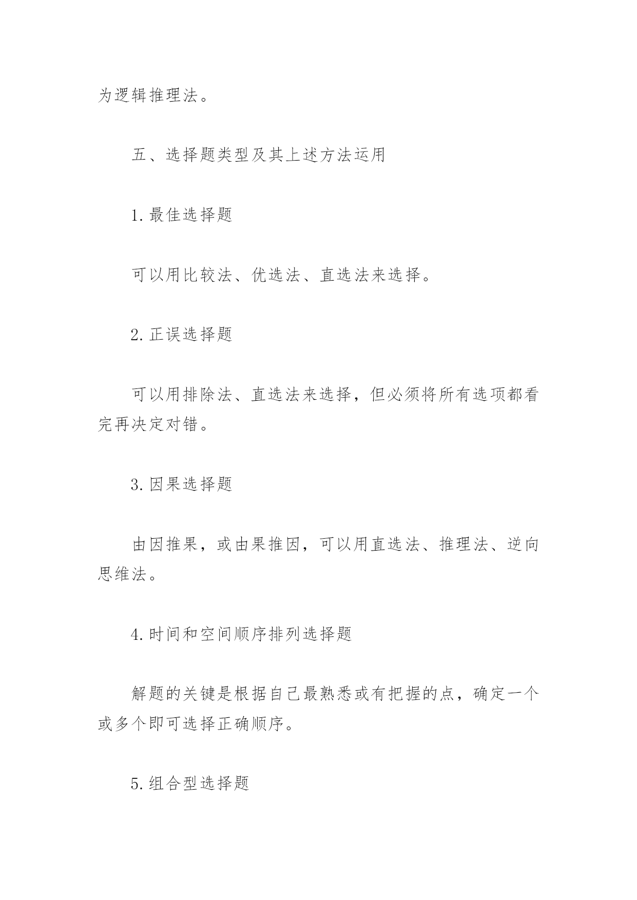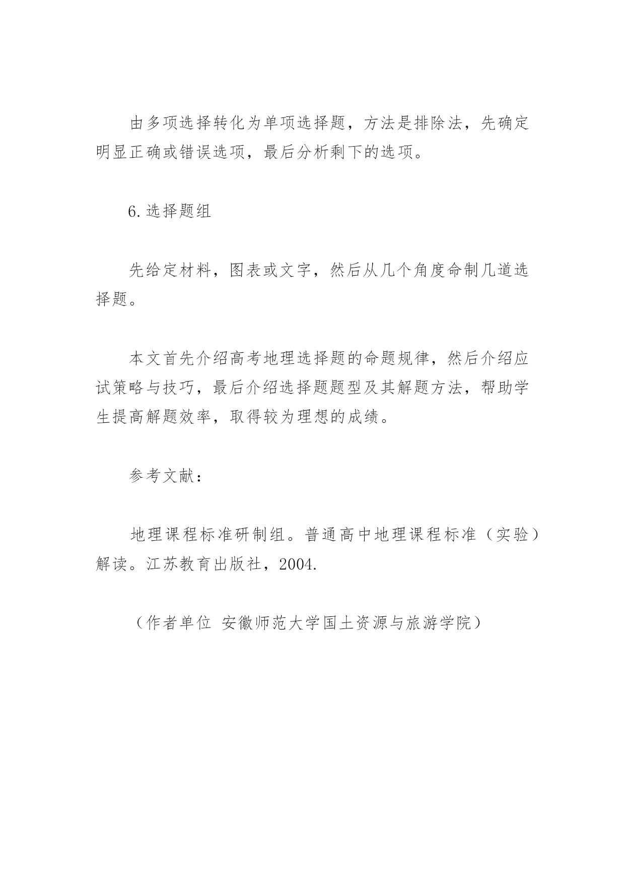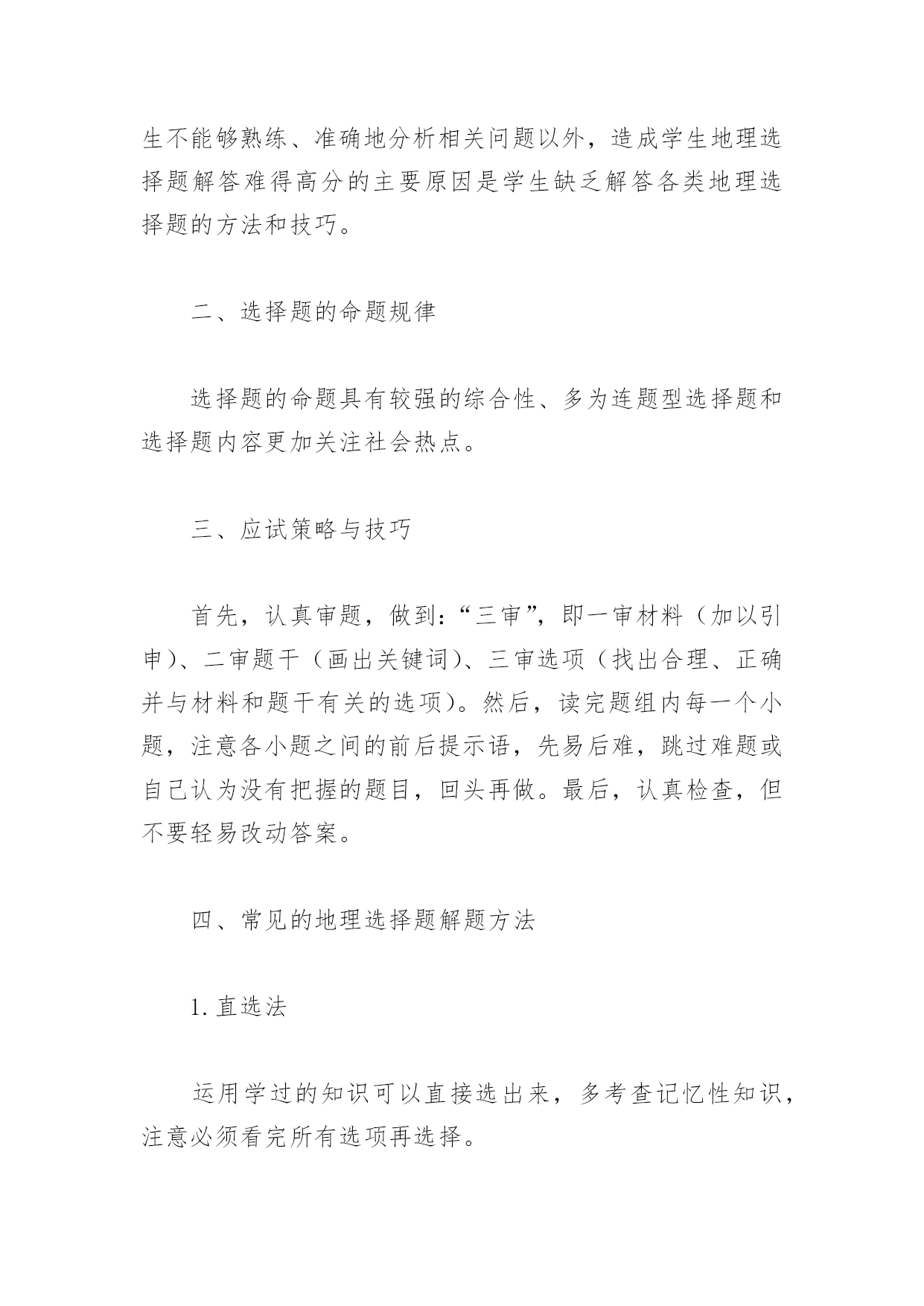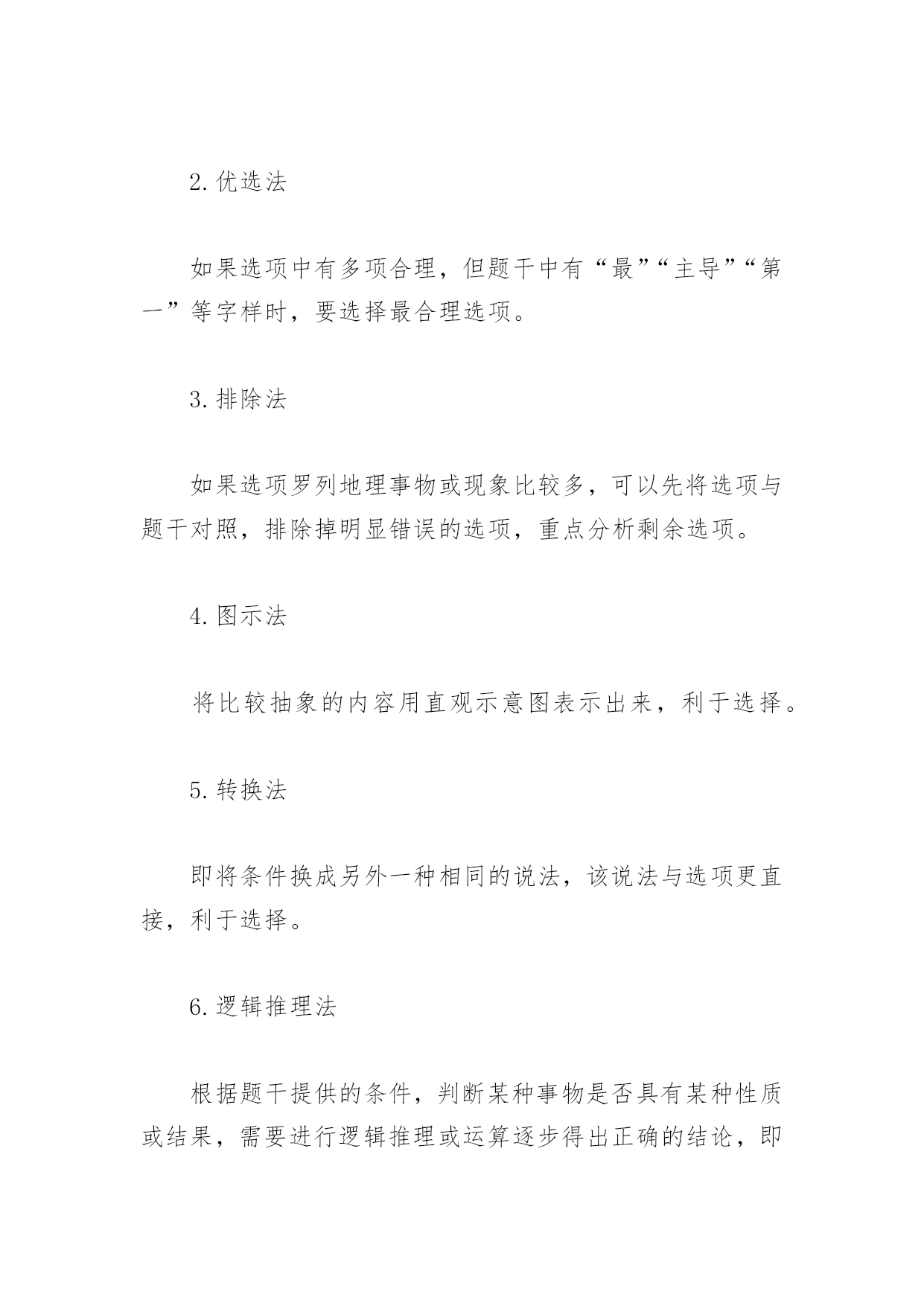 高考地理选择题答题技巧高考地理选择题答题技巧高考地理选择题答题技巧文/刘尚延摘要:根据首先高考地理对选择题的命题规律,然后分析总结近年来安徽高考地理选择题的题型,给出相应的应试策略与应试技巧,最后介绍了几种常见的解题方法,帮助学生提高解题效率,取得较为理想的成绩。关键词:高考地理;选择题;解题技巧一、问题提出高考试卷中的地理选择题是考查学生地理基础知识掌握情况,考查学生“获取和解读地理信息”以及“调动和运用地理知识”能力的一种形式。在安徽文综试卷中,地理选择题在地理试卷中占有不小的比例,分值几乎占据总分的40%以上,可见很好地完成地理选择题在地理高考中至关重要,那么如何提高地理选择题的答题成绩呢?通过对历次高考地理考试中学生所做选择题答案的研究,笔者发现,除了学生不能够熟练、准确地分析相关问题以外,造成学生地理选择题解答难得高分的主要原因是学生缺乏解答各类地理选择题的方法和技巧。二、选择题的命题规律选择题的命题具有较强的综合性、多为连题型选择题和选择题内容更加关注社会热点。三、应试策略与技巧首先,认真审题,做到:“三审”,即一审材料(加以引申)、二审题干(画出关键词)、三审选项(找出合理、正确并与材料和题干有关的选项)。然后,读完题组内每一个小题,注意各小题之间的前后提示语,先易后难,跳过难题或自己认为没有把握的题目,回头再做。最后,认真检查,但不要轻易改动答案。四、常见的地理选择题解题方法1.直选法运用学过的知识可以直接选出来,多考查记忆性知识,注意必须看完所有选项再选择。2.优选法如果选项中有多项合理,但题干中有“最”“主导”“第一”等字样时,要选择最合理选项。3.排除法如果选项罗列地理事物或现象比较多,可以先将选项与题干对照,排除掉明显错误的选项,重点分析剩余选项。4.图示法将比较抽象的内容用直观示意图表示出来,利于选择。5.转换法即将条件换成另外一种相同的说法,该说法与选项更直接,利于选择。6.逻辑推理法根据题干提供的条件,判断某种事物是否具有某种性质或结果,需要进行逻辑推理或运算逐步得出正确的结论,即为逻辑推理法。五、选择题类型及其上述方法运用1.最佳选择题可以用比较法、优选法、直选法来选择。2.正误选择题可以用排除法、直选法来选择,但必须将所有选项都看完再决定对错。3.因果选择题由因推果,或由果推因,可以用直选法、推理法、逆向思维法。4.时间和空间顺序排列选择题解题的关键是根据自己最熟悉或有把握的点,确定一个或多个即可选择正确顺序。5.组合型选择题由多项选择转化为单项选择题,方法是排除法,先确定明显正确或错误选项,最后分析剩下的选项。6.选择题组先给定材料,图表或文字,然后从几个角度命制几道选择题。本文首先介绍高考地理选择题的命题规律,然后介绍应试策略与技巧,最后介绍选择题题型及其解题方法,帮助学生提高解题效率,取得较为理想的成绩。参考文献:地理课程标准研制组。普通高中地理课程标准(实验)解读。江苏教育出版社,2004.(作者单位安徽师范大学国土资源与旅游学院)