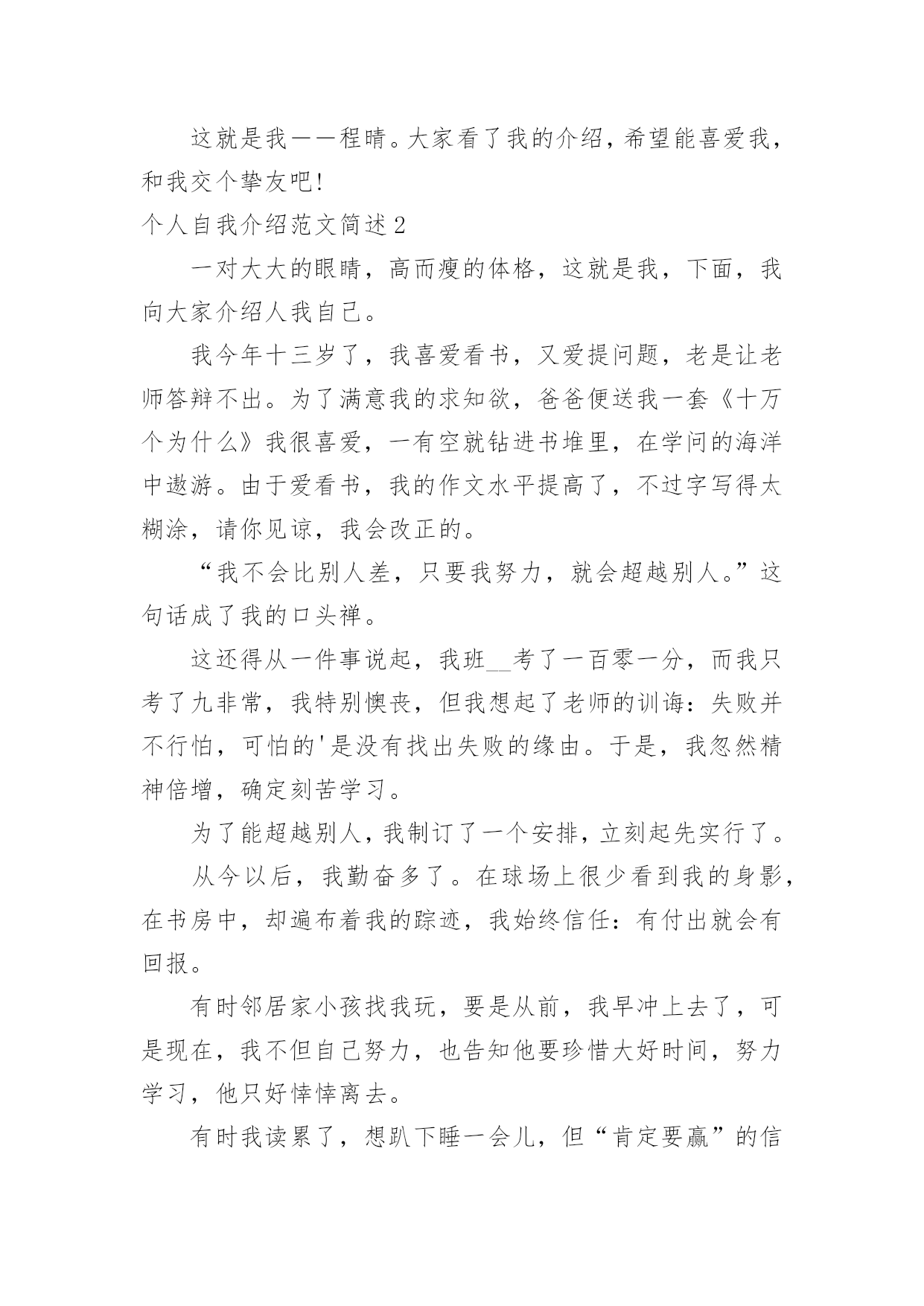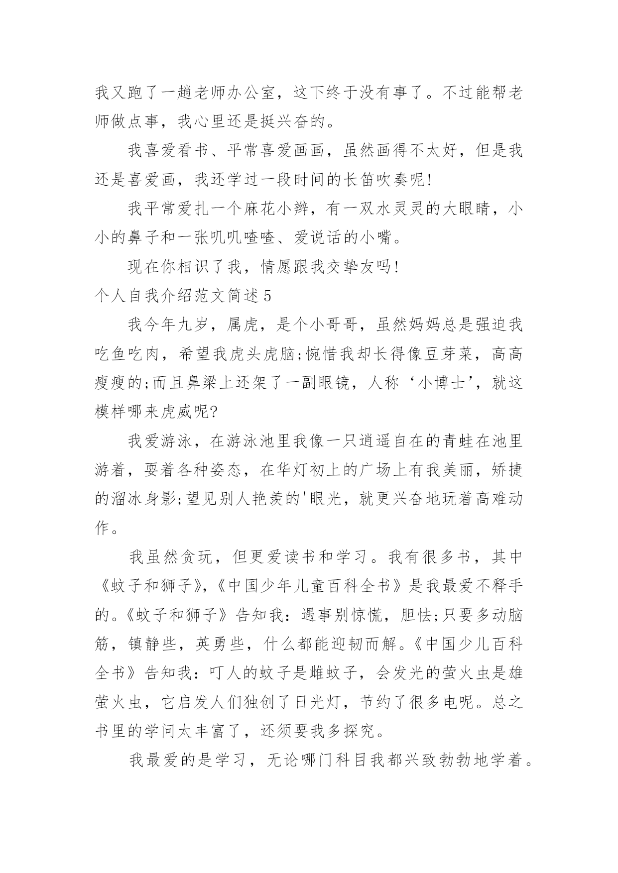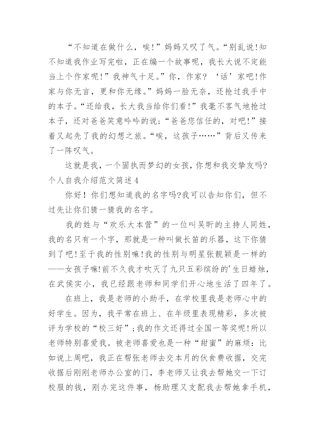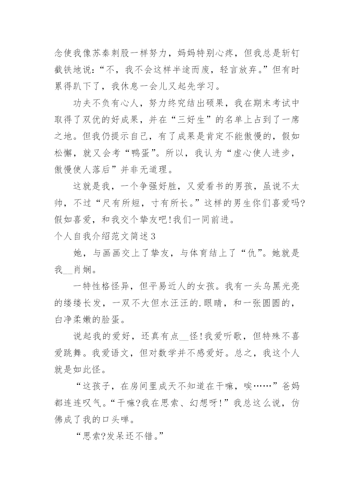 个人自我介绍简述个人自我介绍范文简述当来到一个陌生的地方时,通常需要我们进行自我介绍,通过自我介绍可以得到他人的欣赏。那么自我介绍有什么格式呢?下面是小编收集整理的个人自我介绍范文简述,希望对大家有所帮助。个人自我介绍范文简述1我,一个平平经常的我,今年九岁半,在肇庆市第十五小学三(4)班上学。我的样貌既没有嫦娥那样的风采,也没有西施那样的婀娜。小小的眼睛,小小的鼻子,小小的嘴巴,外表总给人一种小巧玲珑的感觉。我的性格开朗,成天叽哩呱啦,像是有说不完的话。我的爱好广泛,包括书法、音乐、体育、看书等。当经过辛勤的努力,取得了进步时,那种内心的`喜悦是无法形容的。我最喜爱的是音乐,特殊是弹电子琴,所以我每天都坚持练习,希望参与大型的电子琴竞赛,获得好名次。我也有不少的缺点,比如马虎大意,这顶“帽子”经常让我吃苦头。有一次数学测验,我只得了如94分,那是因为我做应用题时马虎大意,把题的意思给弄错了,被扣了6分,要是我细心点,就不会这样了。像这样的事例还有许多,我老是想摘掉这顶“帽子”,但是不知怎么的,这顶“帽子”总是很难摘下来,希望有一天这顶“帽子”能够摘去。这就是我――程晴。大家看了我的介绍,希望能喜爱我,和我交个挚友吧!个人自我介绍范文简述2一对大大的眼睛,高而瘦的体格,这就是我,下面,我向大家介绍人我自己。我今年十三岁了,我喜爱看书,又爱提问题,老是让老师答辩不出。为了满意我的求知欲,爸爸便送我一套《十万个为什么》我很喜爱,一有空就钻进书堆里,在学问的海洋中遨游。由于爱看书,我的作文水平提高了,不过字写得太糊涂,请你见谅,我会改正的。“我不会比别人差,只要我努力,就会超越别人。”这句话成了我的口头禅。这还得从一件事说起,我班__考了一百零一分,而我只考了九非常,我特别懊丧,但我想起了老师的训诲:失败并不行怕,可怕的'是没有找出失败的缘由。于是,我忽然精神倍增,确定刻苦学习。为了能超越别人,我制订了一个安排,立刻起先实行了。从今以后,我勤奋多了。在球场上很少看到我的身影,在书房中,却遍布着我的踪迹,我始终信任:有付出就会有回报。有时邻居家小孩找我玩,要是从前,我早冲上去了,可是现在,我不但自己努力,也告知他要珍惜大好时间,努力学习,他只好悻悻离去。有时我读累了,想趴下睡一会儿,但“肯定要赢”的信念使我像苏秦刺股一样努力,妈妈特别心疼,但我总是斩钉截铁地说:“不,我不会这样半途而废,轻言放弃。”但有时累得趴下了,我休息一会儿又起先学习。功夫不负有心人,努力终究结出硕果,我在期末考试中取得了双优的好成果,并在“三好生”的名单上占到了一席之地。但我仍提示自己,有了成果是肯定不能傲慢的,假如松懈,就又会考“鸭蛋”。所以,我认为“虚心使人进步,傲慢使人落后”并非无道理。这就是我,一个争强好胜,又爱看书的男孩,虽说不太帅,不过“尺有所短,寸有所长。”这样的男生你们喜爱吗?假如喜爱,和我交个挚友吧!我们一同前进。个人自我介绍范文简述3她,与画画交上了挚友,与体育结上了“仇”。她就是我__肖娴。一特性格怪异,但平易近人的女孩。我有一头乌黑光亮的缕缕长发,一双不大但水汪汪的.眼睛,和一张圆圆的,白净柔嫩的脸蛋。说起我的爱好,还真有点__怪!我爱听歌,但特殊不喜爱跳舞。我爱语文,但对数学并不感爱好。总之,我这个人就是如此怪。“这孩子,在房间里成天不知道在干嘛,唉……”爸妈都连连叹气。“干嘛?我在思索、幻想呀!”我总这么说,仿佛成了我的口头啴。“思索?发呆还不错。”“不知道在做什么,唉!”妈妈又叹了气。“别乱说!知不知道我作业写完啦,正在编一个故事呢,我长大说不定能当上个作家呢!”我神气十足。”你,作家?‘话’家吧!作家与你无言,更和你无缘。”妈妈一脸无奈,还抢过我手中的本子。“还给我,长大我当给你们看!”我毫不客气地抢过本子,还对爸爸笑意吟吟的说;“爸爸您信任的,对吧!”接着又起先了我的幻想之旅。“唉,这孩子……”背后又传来了一阵叹气。这就是我,一个固执而梦幻的女孩,你想和我交挚友吗?个人自我介绍范文简述4你好!你们想知道我的名字吗?我可以告知你们,但不过先让你们猜一猜我的名字。我的姓与“欢乐大本营”的一位叫吴昕的主持人同姓,我的名只有一个字,那就是一种叫做长笛的乐器,这下你猜到了吧!至于我的性别嘛!我的性别与明星张靓颖是一样的——女孩子嘛!前不久我才吹灭了九只五彩缤纷的'生日蜡烛,在武侯实小,我已经跟老师和同学们开心地生活了四年了。在班上,我是老师的小助手,在学校里我是老师心中的好学生。因为,我平常在班上、在年级里表现精彩,多次被评为学校的“校三好”;我的作文还得过全国一等奖呢!所以老师特别喜爱我。被老师喜爱也是一种“甜蜜”的麻烦:比如说上周吧,我正在帮张老师去交本月的伙食费收据,交完收据后刚刚老师办公室的门,李老师又让我去帮她交一下订校服的