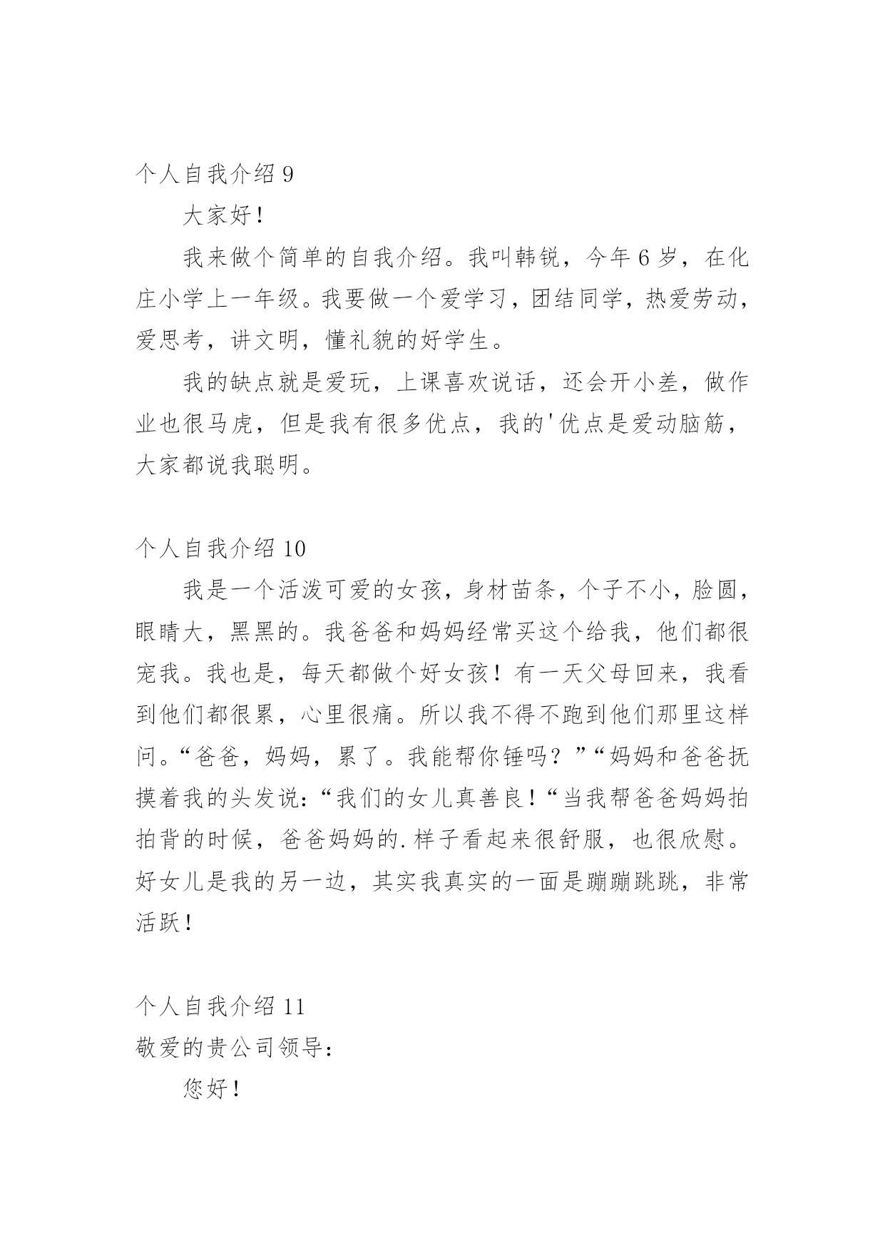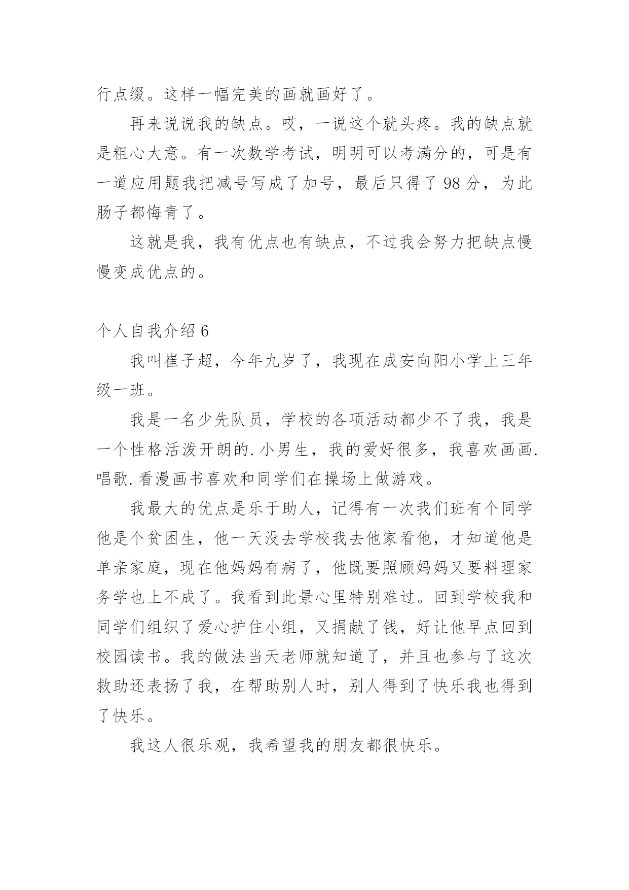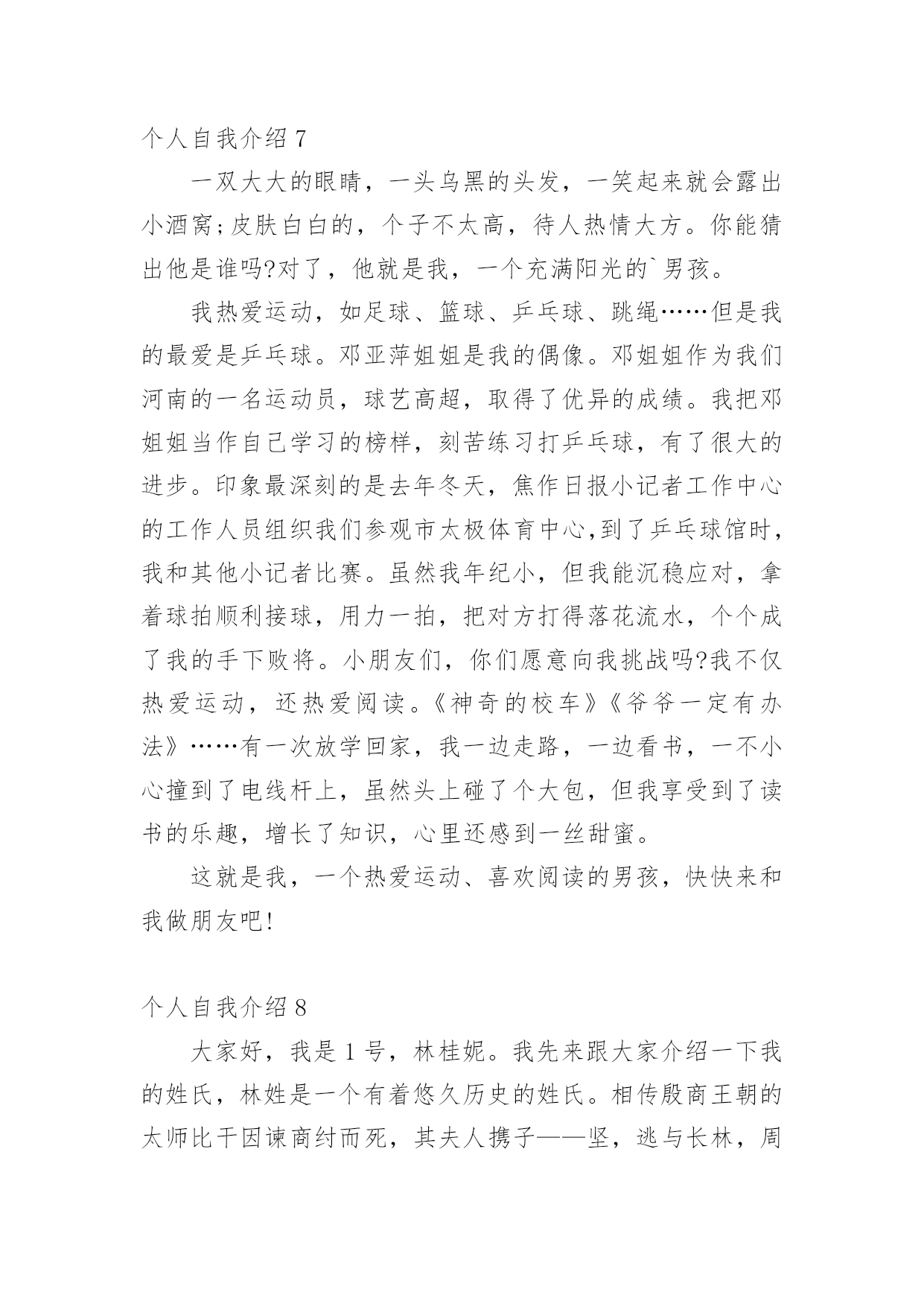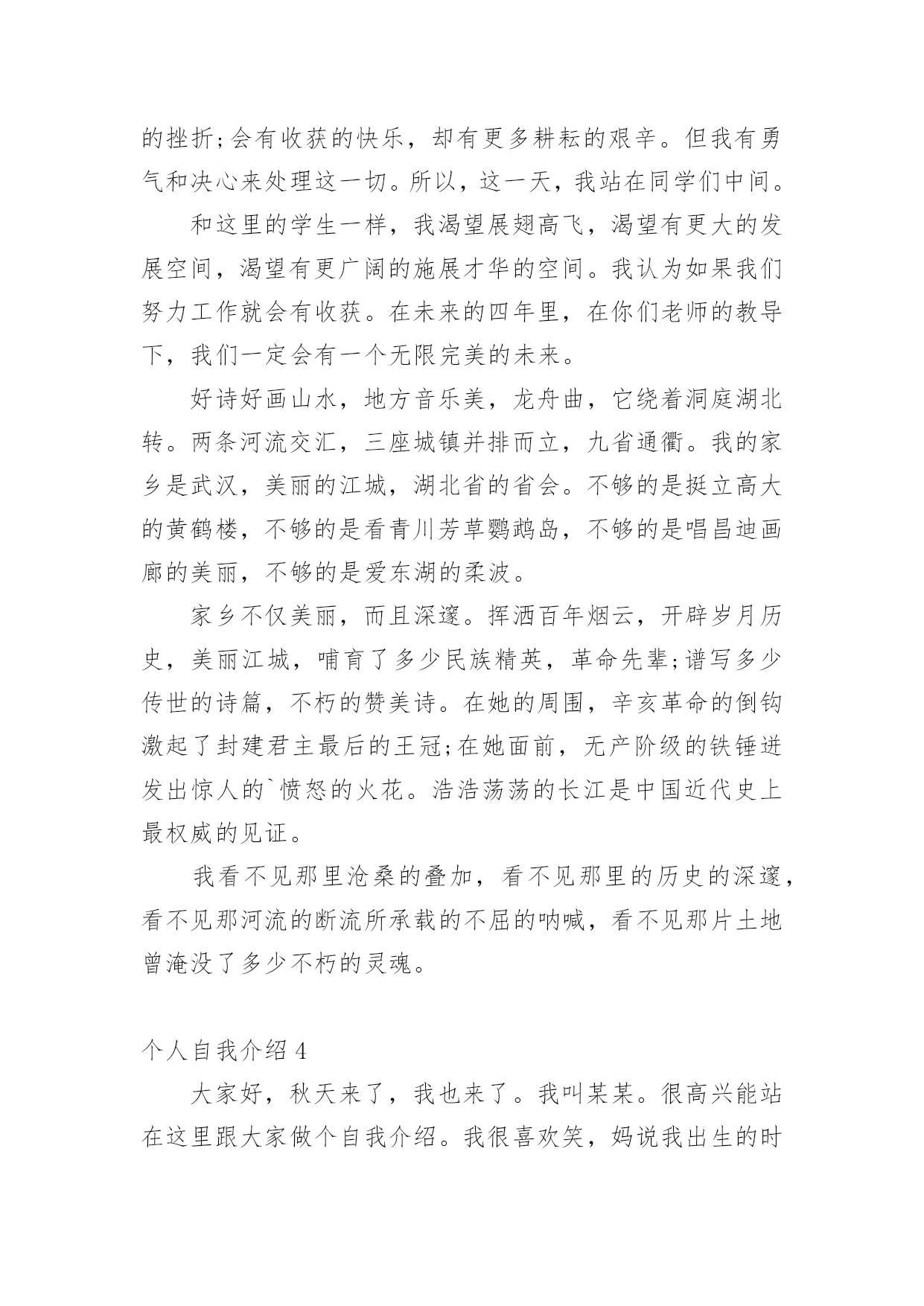 个人自我介绍初到一个新的环境,通常需要我们进行自我介绍,通过自我介绍可以让别人认识自己。相信许多人会觉得自我介绍很难写吧,以下是小编为大家整理的个人自我介绍,希望对大家有所帮助。个人自我介绍1我是男孩xx,今年x岁。我出生在美国,三岁回到中国生活学习,现在在x实验学校x班读书。我长的瘦高个,在我们班上,我算是长的比较高的`,我很活泼,一般晚上都很难入睡呢,因为每天实在太开心了。我最喜欢的运动是跆拳道,每周的兴趣活动课我都去练习,我的级别已经黄带了。周末我还喜欢玩电脑游戏,一般都是玩格斗游戏,最喜欢的格斗游戏是xx。下午下课后,我的运动一般只是跑跑步,或者踢踢足球。希望大家和我做朋友,我会同你们一起分享快乐的。这就是上三年级的我,天天快乐的小男孩——xx。个人自我介绍2尊敬的各位评委老师、各位同学:大家上午好!我叫xx,来x学院x级x班,和前面的xxx同学一样,我也是来竞选的,我竞选的职务是秘书长。我是一个充满梦想的女孩,但愿在这青春之歌高亢之际,用我的真心和热血在奉献的过程中实现一点点价值。今天,我再一次站在讲台上,想抓助这个机会留在社团管理中心。在社团工作已经快两年了,从最初的懵懂、无知、不适应,到而今的熟悉、热爱和理解。我在社长和各位师兄师姐的带领下,逐渐成长为一名合格的社团工作者。两年的工作,使我明白,社团管理中心是一个团结奋进的集体,是架起老师和同学、学校团委和各社团之间的友谊桥梁,经过社团联同学的'努力,成功在各个社团间建立起信誉,为我校社团文化的发展做出了不朽的贡献。之所以竞选社团联合会的秘书长,是基于以下三点原因:第一,实干的作风,好学的心态督促我来竞选!两年前,我是抱着学习的态度进xxx学社的,两年后,我仍然抱着学习的态度来进社团联合会,虽然我不懂的东西还很多,未知的困难不可预测,不过好学的我,希望这个重要工作能在我踏实、诚恳、谦虚、负责的带领下,促进社团联和会协调、和谐、快速的发展;第二、我想在实践中成长自己。作为一名当代大学生,只是学好书本知识是远远不够的,还需要在实践中来成长自己,以达到校训“xxxxxxxxxxx”的办学目标,成长为一名合格的xx大学生;第三,良好的工作经验和深厚的社团感情促使我来竞选。我在xxx学社,主要是在秘书处工作,并担任秘书长一职,和社团的朋友结下了深厚的感情。虽然社团工作有不少经验,却(但是)也有不少教训,不过我相信我可以很娴熟的接手秘书处的工作。因为我坚信,付出和收获是成正比的,这也是我在知行学社的最大收获。如果我竞选成功,我将在以下三点开展工作,第一,总结上任的工作经验和教训,结合现在社团联的具体情况,为新工作的开展寻找一个合适的方向和目标;第二,秘书处的工作量大,事多。我将以身作则,为各部树立榜样,勇于承担责任,悟尽所能帮助大家共同进步。还要充分发挥各位同学的主观能动性,做一名称职、优秀的领导;第三,协助主席团和各部工作的顺利开展,加强社团联和各社团的联系,为xxxx社团文化的繁荣和发展做出自己应有的贡献。因此,我想在社团联发展和完善自己。以上就是我这次竞选的演说,希望各位评委和同学给自己提出意见,我将虚心接受大家的批评。最后,我想给各位竞选的同学说,不管结果怎样,你们永远是我的好朋友,谢谢!个人自我介绍3我的名字叫刘畅,刘畅的刘畅,刘畅的刘畅。当我年轻的时候,我有很多丰富多彩的梦想。成为一名播音员或电视主持人是我最大的梦想。所以,我抓住每一个机会学习广播,练习说话,说相声,演奏快板,表演舞蹈,主持节目。我参加了父亲部队的春节文艺晚会,我快速写的绕口令受到了战士们的热烈欢迎。我深知要成为一名合格的播音员或电视主持人是非常困难的。在成长的路上,会有成功的喜悦,但更多的是失败的挫折;会有收获的快乐,却有更多耕耘的艰辛。但我有勇气和决心来处理这一切。所以,这一天,我站在同学们中间。和这里的学生一样,我渴望展翅高飞,渴望有更大的发展空间,渴望有更广阔的施展才华的空间。我认为如果我们努力工作就会有收获。在未来的四年里,在你们老师的教导下,我们一定会有一个无限完美的未来。好诗好画山水,地方音乐美,龙舟曲,它绕着洞庭湖北转。两条河流交汇,三座城镇并排而立,九省通衢。我的家乡是武汉,美丽的江城,湖北省的省会。不够的是挺立高大的黄鹤楼,不够的是看青川芳草鹦鹉岛,不够的是唱昌迪画廊的美丽,不够的是爱东湖的柔波。家乡不仅美丽,而且深邃。挥洒百年烟云,开辟岁月历史,美丽江城,哺育了多少民族精英,革命先辈;谱写多少传世的诗篇,不朽的赞美诗。在她的周围,辛亥革命的倒钩激起了封建君主最后的王冠;在她面前,无产阶级的铁锤迸发出惊人的`愤怒的火花。浩浩荡荡的长江是中国近代史上最权威的见证。我看不见那里沧桑的叠加,看不见那里的历史的深邃,看不见那河流的断流所承载的不屈的呐喊,看不见那片土地曾淹没了多少不