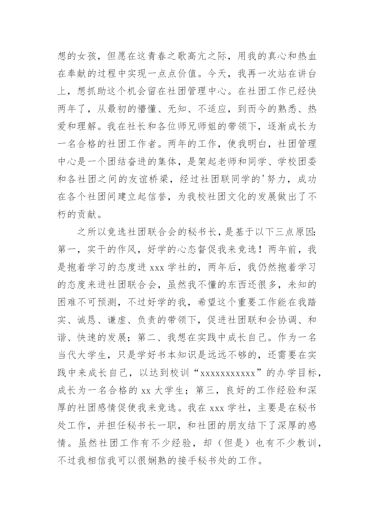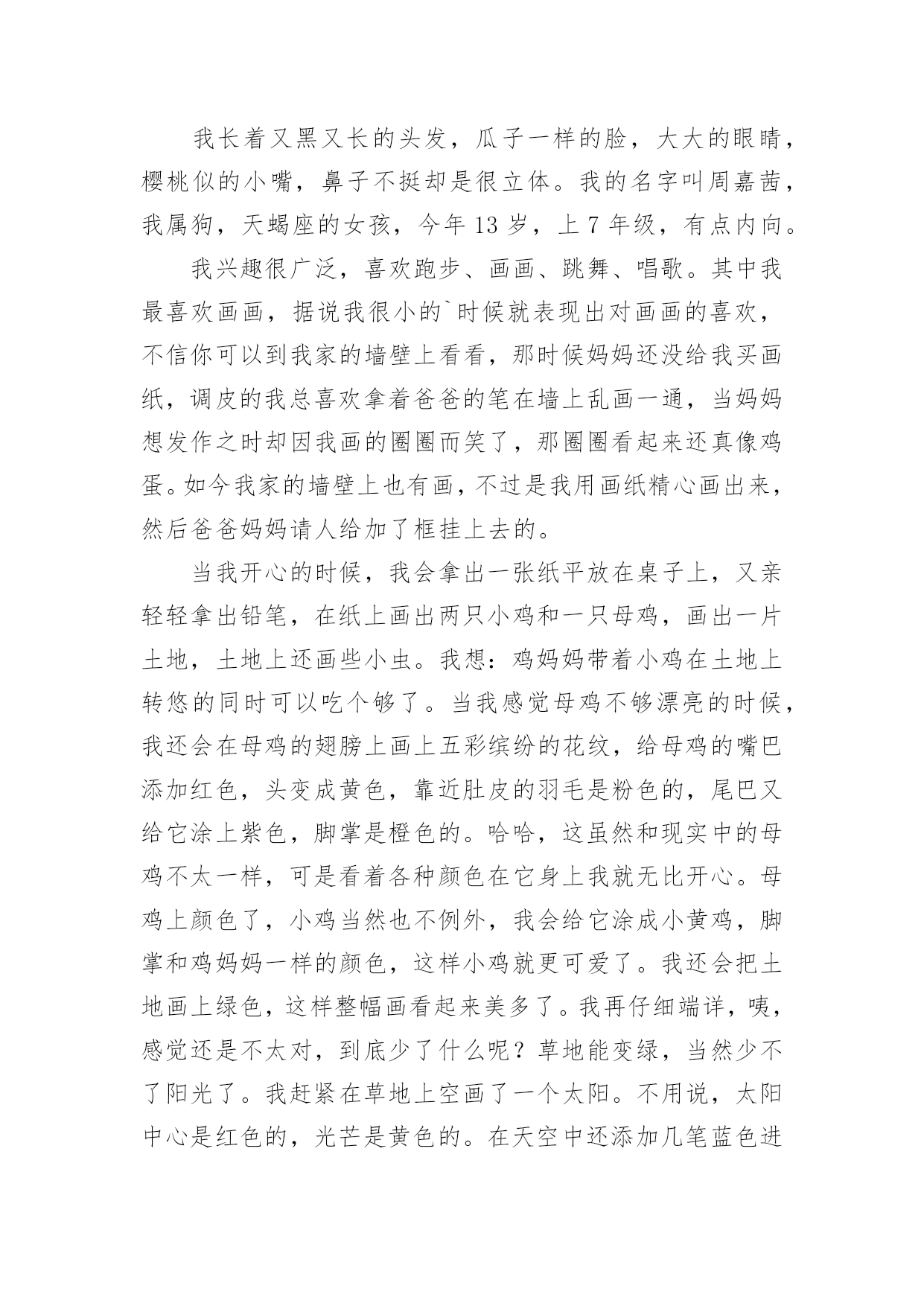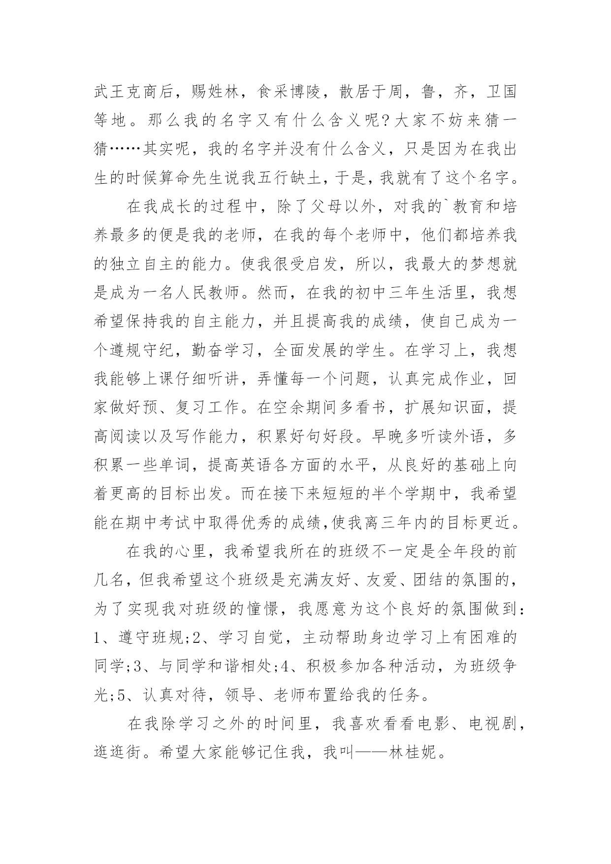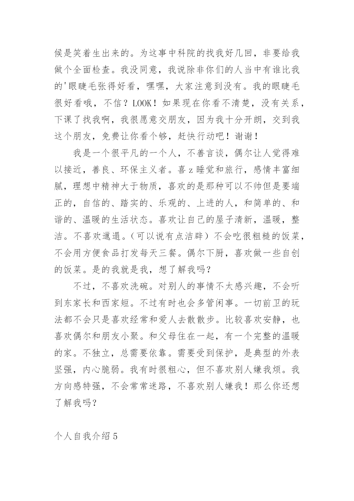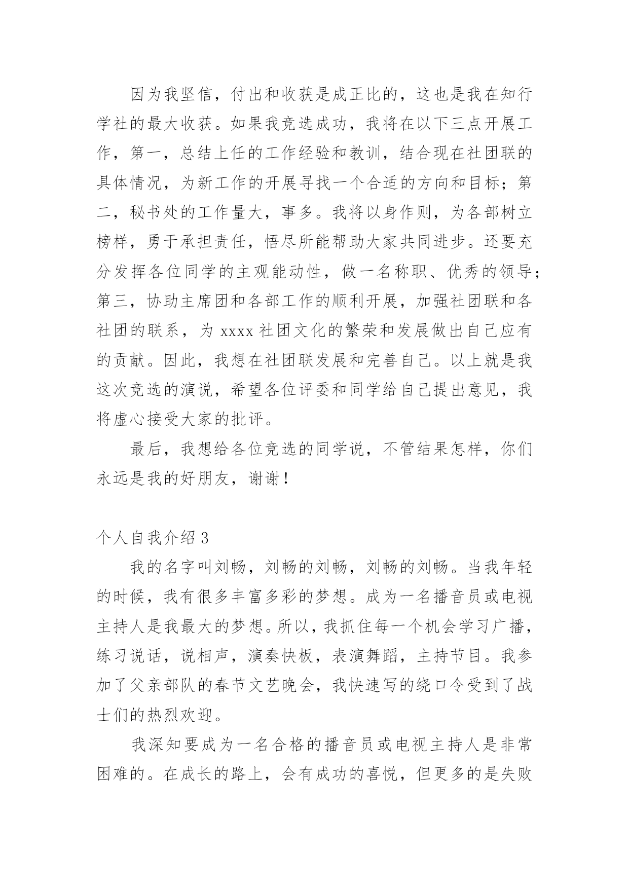 个人自我介绍初到一个新的环境,通常需要我们进行自我介绍,通过自我介绍可以让别人认识自己。相信许多人会觉得自我介绍很难写吧,以下是小编为大家整理的个人自我介绍,希望对大家有所帮助。个人自我介绍1我是男孩xx,今年x岁。我出生在美国,三岁回到中国生活学习,现在在x实验学校x班读书。我长的瘦高个,在我们班上,我算是长的比较高的`,我很活泼,一般晚上都很难入睡呢,因为每天实在太开心了。我最喜欢的运动是跆拳道,每周的兴趣活动课我都去练习,我的级别已经黄带了。周末我还喜欢玩电脑游戏,一般都是玩格斗游戏,最喜欢的格斗游戏是xx。下午下课后,我的运动一般只是跑跑步,或者踢踢足球。希望大家和我做朋友,我会同你们一起分享快乐的。这就是上三年级的我,天天快乐的小男孩——xx。个人自我介绍2尊敬的各位评委老师、各位同学:大家上午好!我叫xx,来x学院x级x班,和前面的xxx同学一样,我也是来竞选的,我竞选的职务是秘书长。我是一个充满梦想的女孩,但愿在这青春之歌高亢之际,用我的真心和热血在奉献的过程中实现一点点价值。今天,我再一次站在讲台上,想抓助这个机会留在社团管理中心。在社团工作已经快两年了,从最初的懵懂、无知、不适应,到而今的熟悉、热爱和理解。我在社长和各位师兄师姐的带领下,逐渐成长为一名合格的社团工作者。两年的工作,使我明白,社团管理中心是一个团结奋进的集体,是架起老师和同学、学校团委和各社团之间的友谊桥梁,经过社团联同学的'努力,成功在各个社团间建立起信誉,为我校社团文化的发展做出了不朽的贡献。之所以竞选社团联合会的秘书长,是基于以下三点原因:第一,实干的作风,好学的心态督促我来竞选!两年前,我是抱着学习的态度进xxx学社的,两年后,我仍然抱着学习的态度来进社团联合会,虽然我不懂的东西还很多,未知的困难不可预测,不过好学的我,希望这个重要工作能在我踏实、诚恳、谦虚、负责的带领下,促进社团联和会协调、和谐、快速的发展;第二、我想在实践中成长自己。作为一名当代大学生,只是学好书本知识是远远不够的,还需要在实践中来成长自己,以达到校训“xxxxxxxxxxx”的办学目标,成长为一名合格的xx大学生;第三,良好的工作经验和深厚的社团感情促使我来竞选。我在xxx学社,主要是在秘书处工作,并担任秘书长一职,和社团的朋友结下了深厚的感情。虽然社团工作有不少经验,却(但是)也有不少教训,不过我相信我可以很娴熟的接手秘书处的工作。因为我坚信,付出和收获是成正比的,这也是我在知行学社的最大收获。如果我竞选成功,我将在以下三点开展工作,第一,总结上任的工作经验和教训,结合现在社团联的具体情况,为新工作的开展寻找一个合适的方向和目标;第二,秘书处的工作量大,事多。我将以身作则,为各部树立榜样,勇于承担责任,悟尽所能帮助大家共同进步。还要充分发挥各位同学的主观能动性,做一名称职、优秀的领导;第三,协助主席团和各部工作的顺利开展,加强社团联和各社团的联系,为xxxx社团文化的繁荣和发展做出自己应有的贡献。因此,我想在社团联发展和完善自己。以上就是我这次竞选的演说,希望各位评委和同学给自己提出意见,我将虚心接受大家的批评。最后,我想给各位竞选的同学说,不管结果怎样,你们永远是我的好朋友,谢谢!个人自我介绍3我的名字叫刘畅,刘畅的刘畅,刘畅的刘畅。当我年轻的时候,我有很多丰富多彩的梦想。成为一名播音员或电视主持人是我最大的梦想。所以,我抓住每一个机会学习广播,练习说话,说相声,演奏快板,表演舞蹈,主持节目。我参加了父亲部队的春节文艺晚会,我快速写的绕口令受到了战士们的热烈欢迎。我深知要成为一名合格的播音员或电视主持人是非常困难的。在成长的路上,会有成功的喜悦,但更多的是失败的挫折;会有收获的快乐,却有更多耕耘的艰辛。但我有勇气和决心来处理这一切。所以,这一天,我站在同学们中间。和这里的学生一样,我渴望展翅高飞,渴望有更大的发展空间,渴望有更广阔的施展才华的空间。我认为如果我们努力工作就会有收获。在未来的四年里,在你们老师的教导下,我们一定会有一个无限完美的未来。好诗好画山水,地方音乐美,龙舟曲,它绕着洞庭湖北转。两条河流交汇,三座城镇并排而立,九省通衢。我的家乡是武汉,美丽的江城,湖北省的省会。不够的是挺立高大的黄鹤楼,不够的是看青川芳草鹦鹉岛,不够的是唱昌迪画廊的美丽,不够的是爱东湖的柔波。家乡不仅美丽,而且深邃。挥洒百年烟云,开辟岁月历史,美丽江城,哺育了多少民族精英,革命先辈;谱写多少传世的诗篇,不朽的赞美诗。在她的周围,辛亥革命的倒钩激起了封建君主最后的王冠;在她面前,无产阶级的铁锤迸发出惊人的`愤怒的火花。浩浩荡荡的长江是中国近代史上最权威的见证。我看不见那里沧桑的叠加,看不见那里的历史的深邃,看不见那河流的断流所承载的不屈的呐喊,看不见那片土地曾淹没了多少不