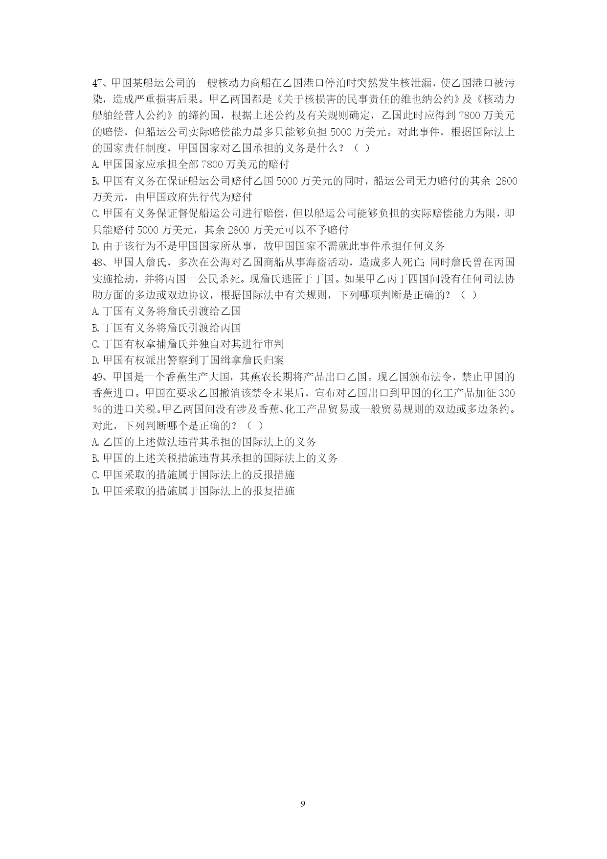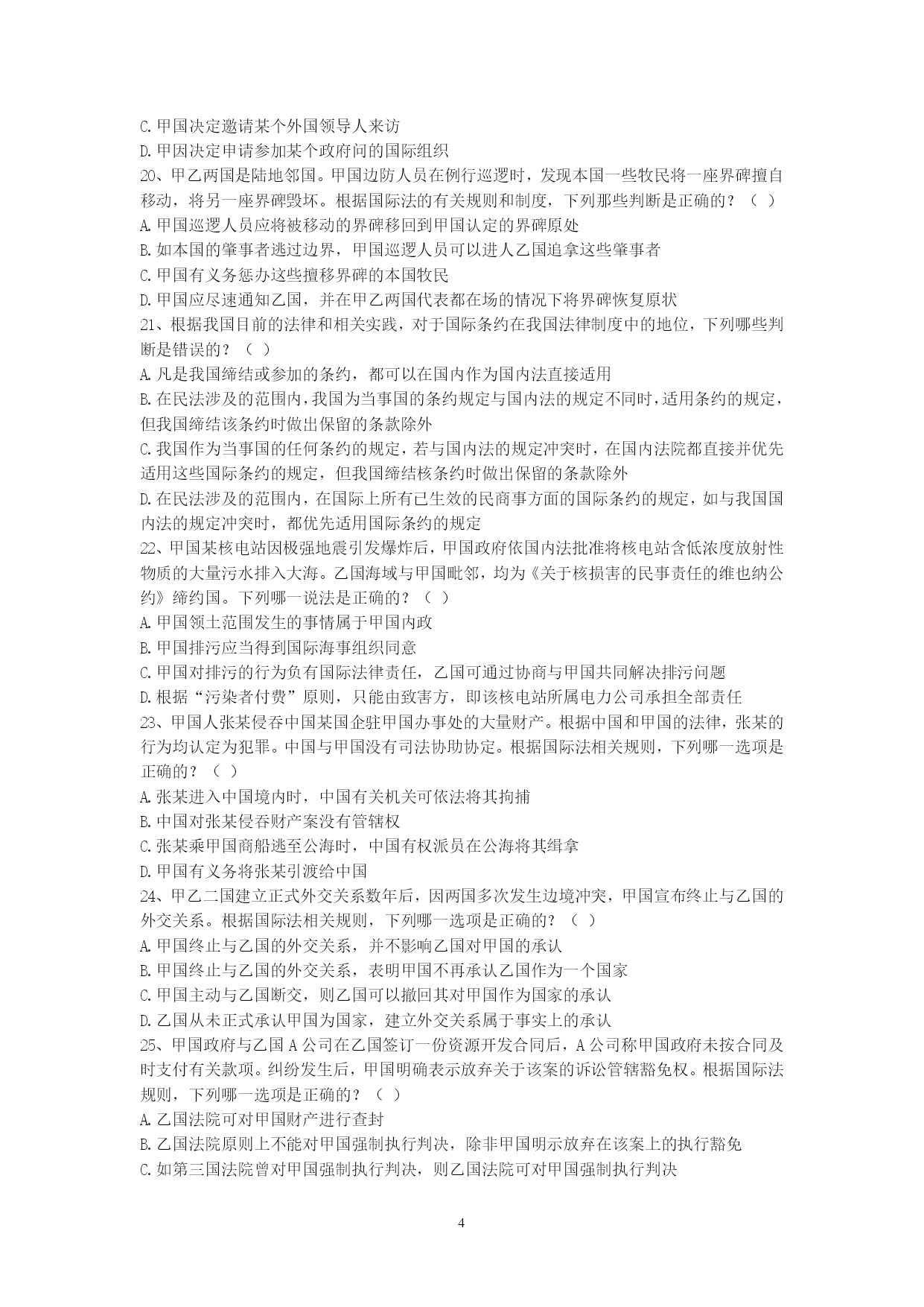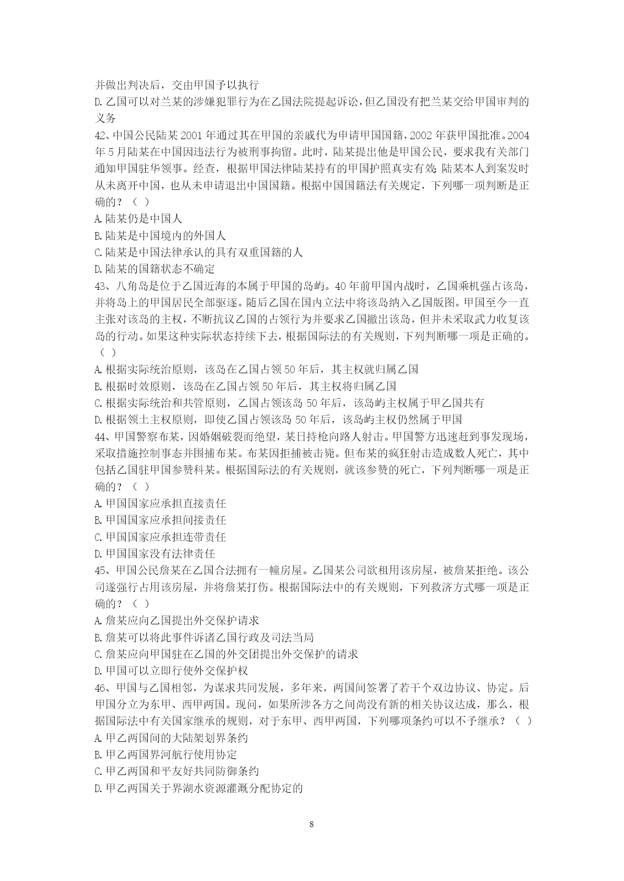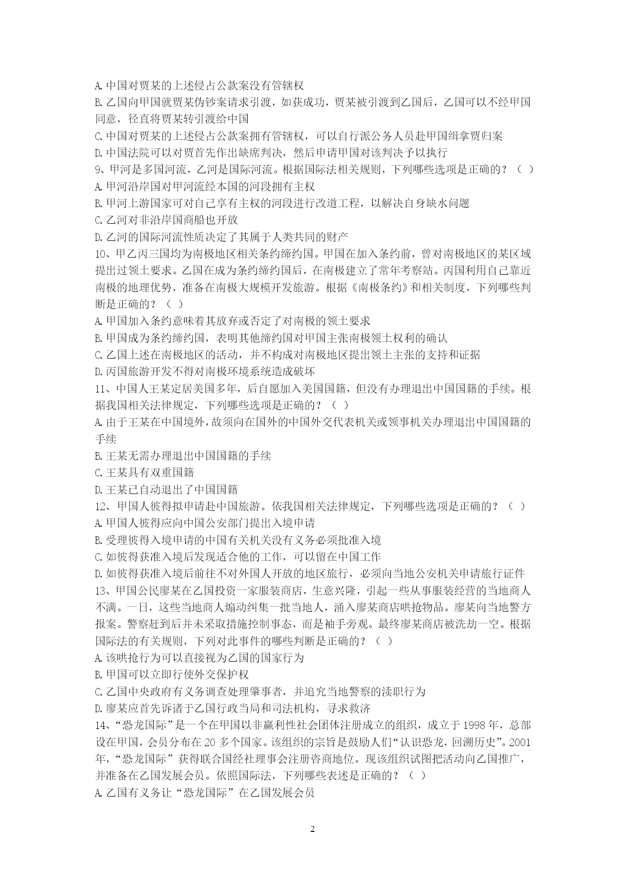 PAGEPAGE91、甲国发生的判乱运动已被甲国政府和国际社会承认为判乱团体。该判乱在其控制的一些地区,强行掠夺或占用外国侨民和外国国家的财产。根据国际法,下列关于甲国政府是否承担责任的说法是哪个是正确的?()A、承担直接责任B、承担间接责任C、甲国政府和判运动共同承担直接责任D、不承担责任2、下列有关国际法与国内法的表述哪些是错误的?()A、国际法就是指国际条约B、国内法是由国家立法机关制定的、在领陆范围内适用的法律C、国内法的一切规范性文件均在全国范围内适用D、国际法是国内法的渊源3、甲国和乙国合并成立丙国,下列选项中哪些属于丙国政府应该继承的债务?()A、甲国政府向丁国政府所贷款项B、甲国政府关于甲国南方省水利项目向丁国政府所贷款项C、乙国北方省政府向丁国政府所贷款项D、乙国东方公司向丁国政府所贷款项4、某国是实行三权分立制度的国家。根据国际法,下列该国哪些部门作出的行为被认为是国家行为?()A、立法机关B、行政机关C、司法机关D、军队5、甲国公民大卫到乙国办理商务,购买了联程客票搭乘甲国的国际航班,经北京首都国际机场转机到乙国。甲国与我国没有专门协定。根据我国有关出入境法律,下列判断正确的是()。A.大卫必须提前办理中国过境签证B.如大卫在北京机场的停留时间不超过24小时且不出机场,可免办中国入境签证C.如大卫不出北京机场,无论其停留时间长短都可免办中国入境签证D.如大卫在北京转机临时离开机场,需经边防检查机关批准6、甲国人艾某在甲国打工时因不满雇主詹某,炸毁了詹某的厂房和住所,逃至乙国。艾某的行为根据甲国刑法,有可能被判处死刑。甲乙两国之间没有任何涉及刑事司法协助方面的双边或多边条约。基于以上情况,根据国际法,下列判断何者为正确?()A.如甲国向乙国提出引渡请求,则乙国有义务将艾某引渡给甲国B.如艾某向乙国提出庇护请求,则乙国有义务对艾某进行庇护C.乙国可以既不对艾某进行庇护,也不将其引渡给甲国D.甲国可以在乙国法院对艾某提起刑事诉讼7、高某出生在甲国,其父亲是乙国人,母亲是丙、丁双重国籍人,假设对原始国籍的获得,甲丙两国采取纯粹的出生地主义,乙丁两国都采取纯粹的双系血统主义。此时,根据有关国际法规则和国际实践,对于高某此时国籍状况,下列何种表述是正确的?()A.高某可能拥有甲乙丙丁四国的国籍B.高某仅可能拥有甲乙丙三国的国籍C.高某仅可能拥有甲乙丁三国的国籍D.高某仅可能拥有甲乙两国的国籍8、中国某国有企业在甲国设有办事处,甲国人员某为该办事处雇员。贾某利用职务之便,将办事处公款1000万美元窃为己有进行挥霍。此间,贾某在乙国又参与了一起伪钞案。贾某从未到过中国,目前其在甲国。中国与甲国之间没有任何司法协助方面的协定,但中国与乙国间有引渡协定。根据国际法及中国的有关法律。下列哪些判断是错误的?()A.中国对贾某的上述侵占公款案没有管辖权B.乙国向甲国就贾某伪钞案请求引渡,如获成功,贾某被引渡到乙国后,乙国可以不经甲国同意,径直将贾某转引渡给中国C.中国对贾某的上述侵占公款案拥有管辖权,可以自行派公务人员赴甲国缉拿贾归案D.中国法院可以对贾首先作出缺席判决,然后申请甲国对该判决予以执行9、甲河是多国河流,乙河是国际河流。根据国际法相关规则,下列哪些选项是正确的?()A.甲河沿岸国对甲河流经本国的河段拥有主权B.甲河上游国家可对自己享有主权的河段进行改道工程,以解决自身缺水问题C.乙河对非沿岸国商船也开放D.乙河的国际河流性质决定了其属于人类共同的财产10、甲乙丙三国均为南极地区相关条约缔约国。甲国在加入条约前,曾对南极地区的某区域提出过领土要求。乙国在成为条约缔约国后,在南极建立了常年考察站。丙国利用自己靠近南极的地理优势,准备在南极大规模开发旅游。根据《南极条约》和相关制度,下列哪些判断是正确的?()A.甲国加入条约意味着其放弃或否定了对南极的领土要求B.甲国成为条约缔约国,表明其他缔约国对甲国主张南极领土权利的确认C.乙国上述在南极地区的活动,并不构成对南极地区提出领土主张的支持和证据D.丙国旅游开发不得对南极环境系统造成破坏11、中国人王某定居美国多年,后自愿加入美国国籍,但没有办理退出中国国籍的手续。根据我国相关法律规定,下列哪些选项是正确的?()A.由于王某在中国境外,故须向在国外的中国外交代表机关或领事机关办理退出中国国籍的手续B.王某无需办理退出中国国籍的手续C.王某具有双重国籍D.王某已自动退出了中国国籍12、甲国人彼得拟申请赴中国旅游。依我国相关法律规定,下列哪些选项是正确的?()A.甲国人彼得应向中国公安部门提出入境申请B.受理彼得入境申请的中国有关机关没有义务必须批准入境C.如彼得获准入境