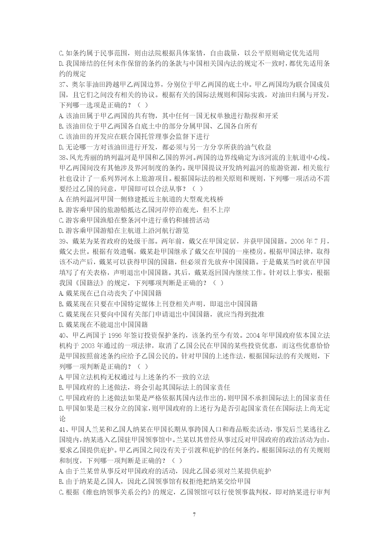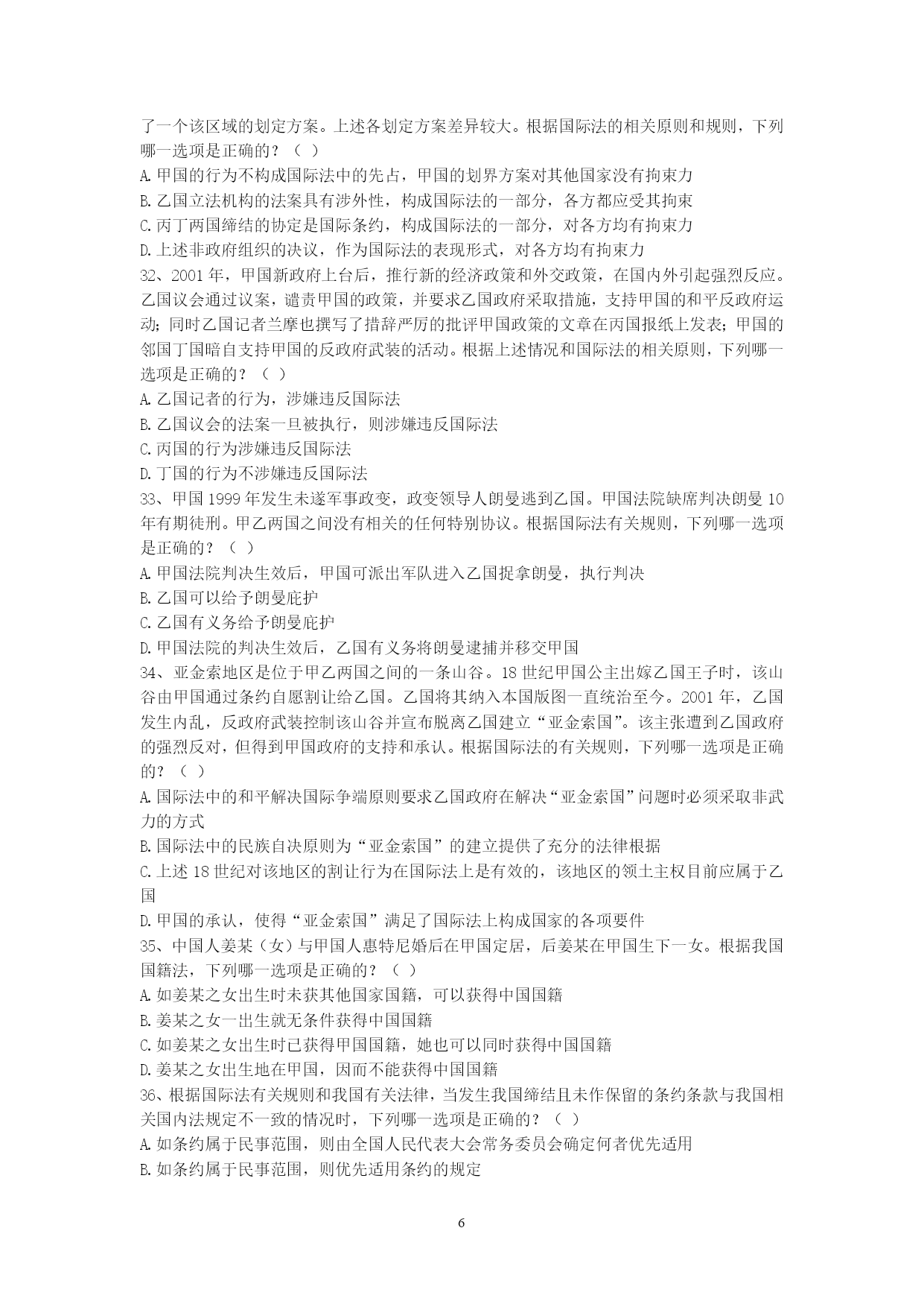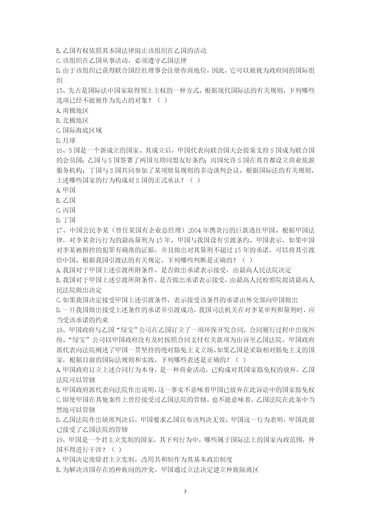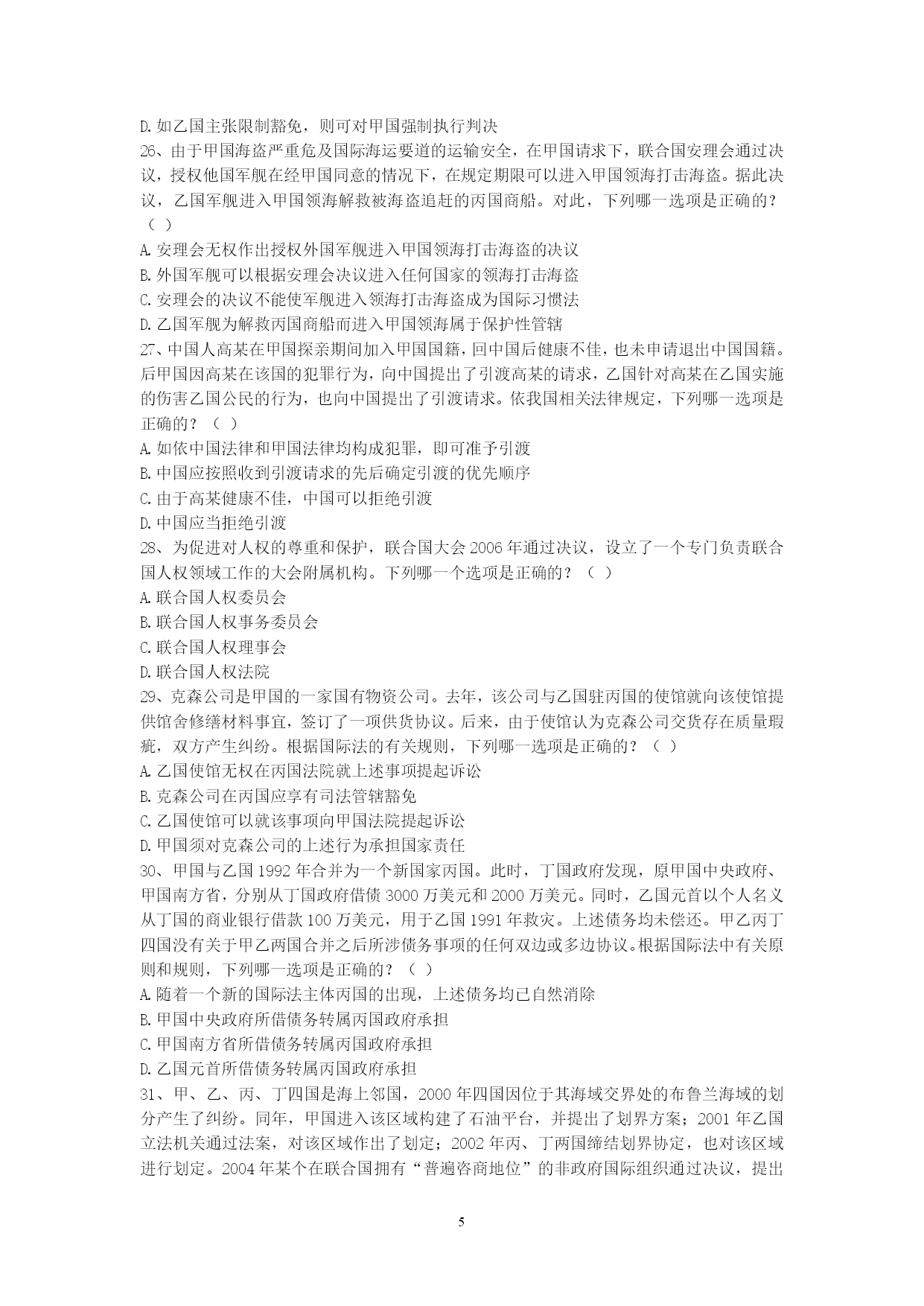 PAGEPAGE91、甲国发生的判乱运动已被甲国政府和国际社会承认为判乱团体。该判乱在其控制的一些地区,强行掠夺或占用外国侨民和外国国家的财产。根据国际法,下列关于甲国政府是否承担责任的说法是哪个是正确的?()A、承担直接责任B、承担间接责任C、甲国政府和判运动共同承担直接责任D、不承担责任2、下列有关国际法与国内法的表述哪些是错误的?()A、国际法就是指国际条约B、国内法是由国家立法机关制定的、在领陆范围内适用的法律C、国内法的一切规范性文件均在全国范围内适用D、国际法是国内法的渊源3、甲国和乙国合并成立丙国,下列选项中哪些属于丙国政府应该继承的债务?()A、甲国政府向丁国政府所贷款项B、甲国政府关于甲国南方省水利项目向丁国政府所贷款项C、乙国北方省政府向丁国政府所贷款项D、乙国东方公司向丁国政府所贷款项4、某国是实行三权分立制度的国家。根据国际法,下列该国哪些部门作出的行为被认为是国家行为?()A、立法机关B、行政机关C、司法机关D、军队5、甲国公民大卫到乙国办理商务,购买了联程客票搭乘甲国的国际航班,经北京首都国际机场转机到乙国。甲国与我国没有专门协定。根据我国有关出入境法律,下列判断正确的是()。A.大卫必须提前办理中国过境签证B.如大卫在北京机场的停留时间不超过24小时且不出机场,可免办中国入境签证C.如大卫不出北京机场,无论其停留时间长短都可免办中国入境签证D.如大卫在北京转机临时离开机场,需经边防检查机关批准6、甲国人艾某在甲国打工时因不满雇主詹某,炸毁了詹某的厂房和住所,逃至乙国。艾某的行为根据甲国刑法,有可能被判处死刑。甲乙两国之间没有任何涉及刑事司法协助方面的双边或多边条约。基于以上情况,根据国际法,下列判断何者为正确?()A.如甲国向乙国提出引渡请求,则乙国有义务将艾某引渡给甲国B.如艾某向乙国提出庇护请求,则乙国有义务对艾某进行庇护C.乙国可以既不对艾某进行庇护,也不将其引渡给甲国D.甲国可以在乙国法院对艾某提起刑事诉讼7、高某出生在甲国,其父亲是乙国人,母亲是丙、丁双重国籍人,假设对原始国籍的获得,甲丙两国采取纯粹的出生地主义,乙丁两国都采取纯粹的双系血统主义。此时,根据有关国际法规则和国际实践,对于高某此时国籍状况,下列何种表述是正确的?()A.高某可能拥有甲乙丙丁四国的国籍B.高某仅可能拥有甲乙丙三国的国籍C.高某仅可能拥有甲乙丁三国的国籍D.高某仅可能拥有甲乙两国的国籍8、中国某国有企业在甲国设有办事处,甲国人员某为该办事处雇员。贾某利用职务之便,将办事处公款1000万美元窃为己有进行挥霍。此间,贾某在乙国又参与了一起伪钞案。贾某从未到过中国,目前其在甲国。中国与甲国之间没有任何司法协助方面的协定,但中国与乙国间有引渡协定。根据国际法及中国的有关法律。下列哪些判断是错误的?()A.中国对贾某的上述侵占公款案没有管辖权B.乙国向甲国就贾某伪钞案请求引渡,如获成功,贾某被引渡到乙国后,乙国可以不经甲国同意,径直将贾某转引渡给中国C.中国对贾某的上述侵占公款案拥有管辖权,可以自行派公务人员赴甲国缉拿贾归案D.中国法院可以对贾首先作出缺席判决,然后申请甲国对该判决予以执行9、甲河是多国河流,乙河是国际河流。根据国际法相关规则,下列哪些选项是正确的?()A.甲河沿岸国对甲河流经本国的河段拥有主权B.甲河上游国家可对自己享有主权的河段进行改道工程,以解决自身缺水问题C.乙河对非沿岸国商船也开放D.乙河的国际河流性质决定了其属于人类共同的财产10、甲乙丙三国均为南极地区相关条约缔约国。甲国在加入条约前,曾对南极地区的某区域提出过领土要求。乙国在成为条约缔约国后,在南极建立了常年考察站。丙国利用自己靠近南极的地理优势,准备在南极大规模开发旅游。根据《南极条约》和相关制度,下列哪些判断是正确的?()A.甲国加入条约意味着其放弃或否定了对南极的领土要求B.甲国成为条约缔约国,表明其他缔约国对甲国主张南极领土权利的确认C.乙国上述在南极地区的活动,并不构成对南极地区提出领土主张的支持和证据D.丙国旅游开发不得对南极环境系统造成破坏11、中国人王某定居美国多年,后自愿加入美国国籍,但没有办理退出中国国籍的手续。根据我国相关法律规定,下列哪些选项是正确的?()A.由于王某在中国境外,故须向在国外的中国外交代表机关或领事机关办理退出中国国籍的手续B.王某无需办理退出中国国籍的手续C.王某具有双重国籍D.王某已自动退出了中国国籍12、甲国人彼得拟申请赴中国旅游。依我国相关法律规定,下列哪些选项是正确的?()A.甲国人彼得应向中国公安部门提出入境申请B.受理彼得入境申请的中国有关机关没有义务必须批准入境C.如彼得获准入境