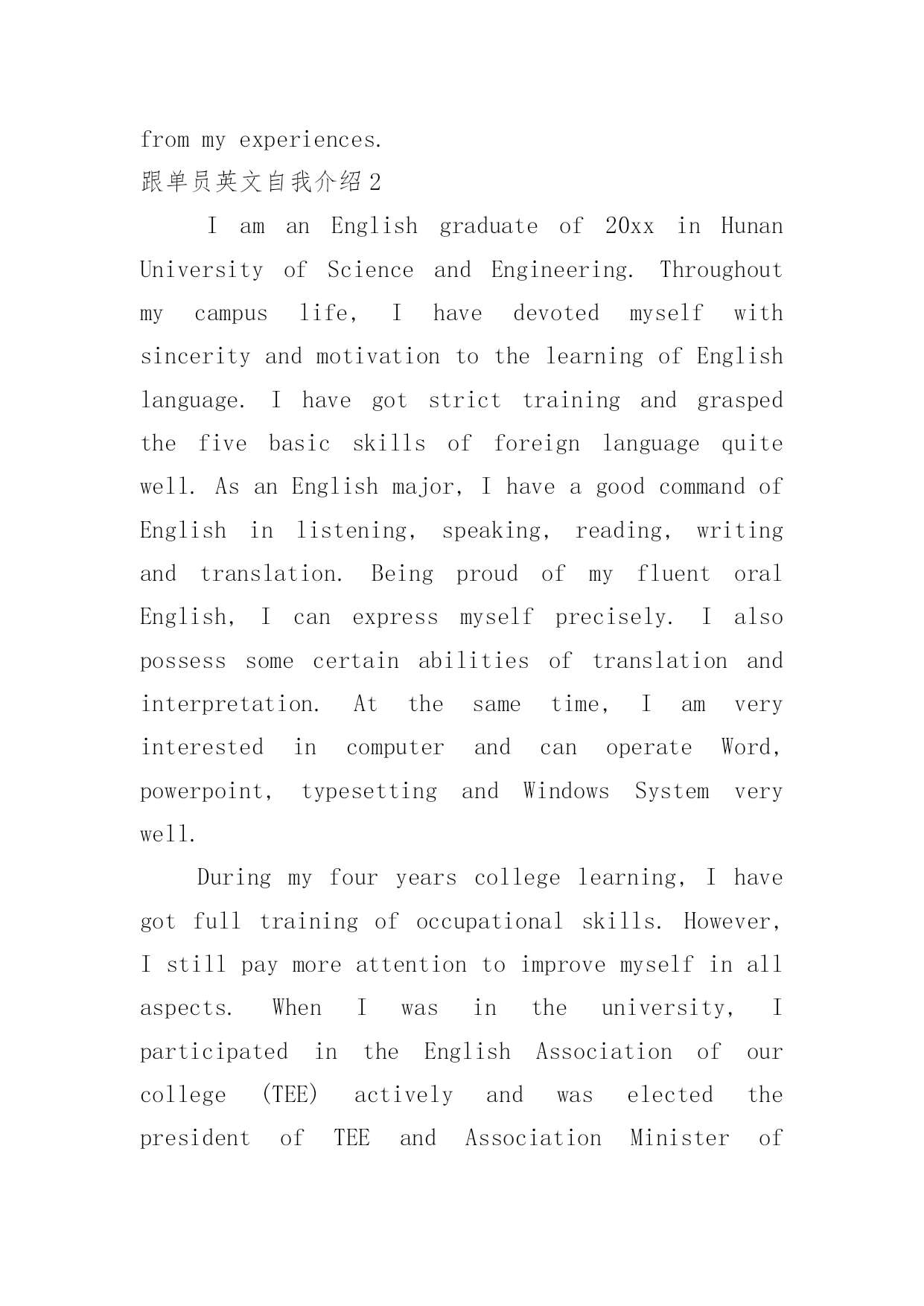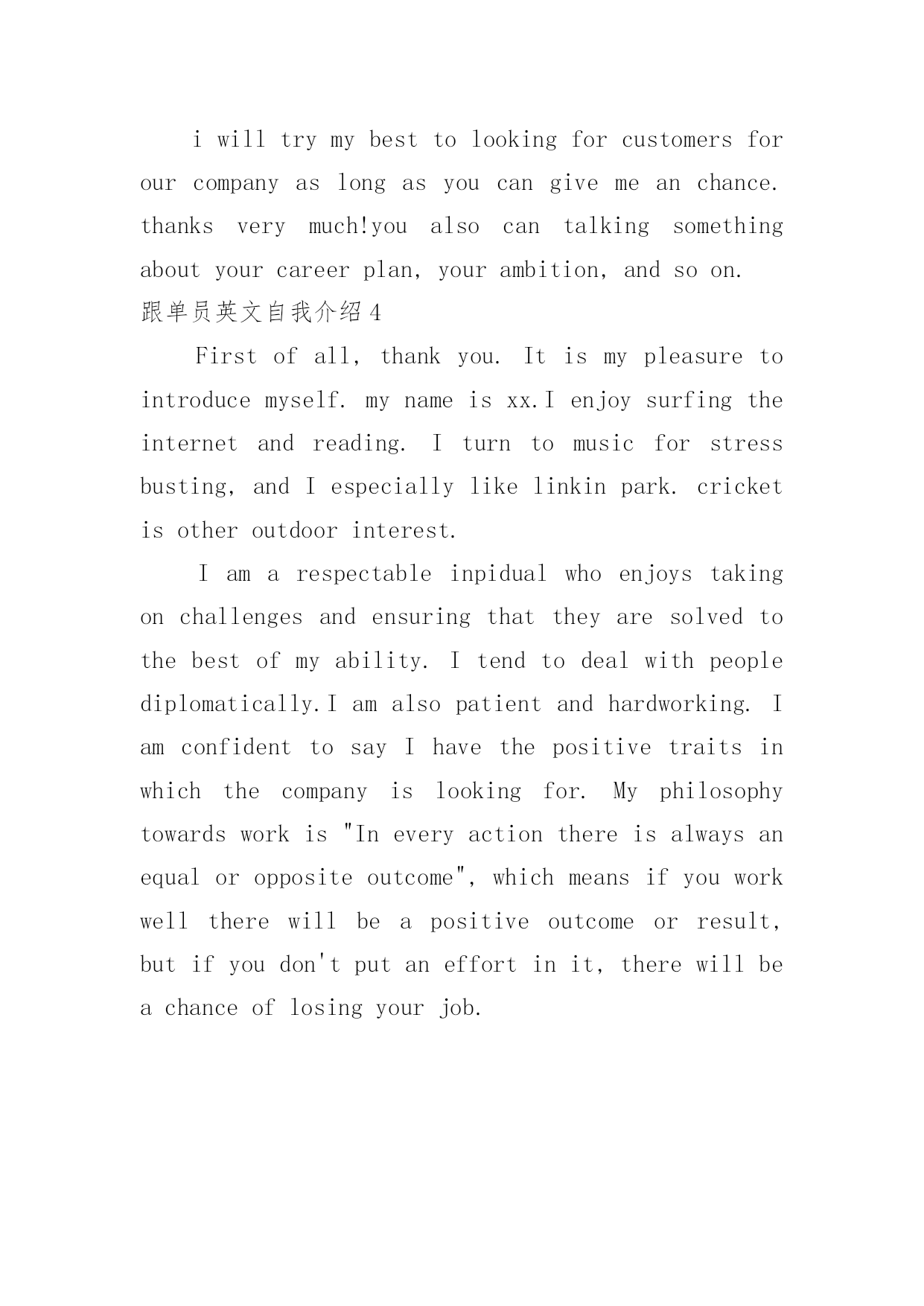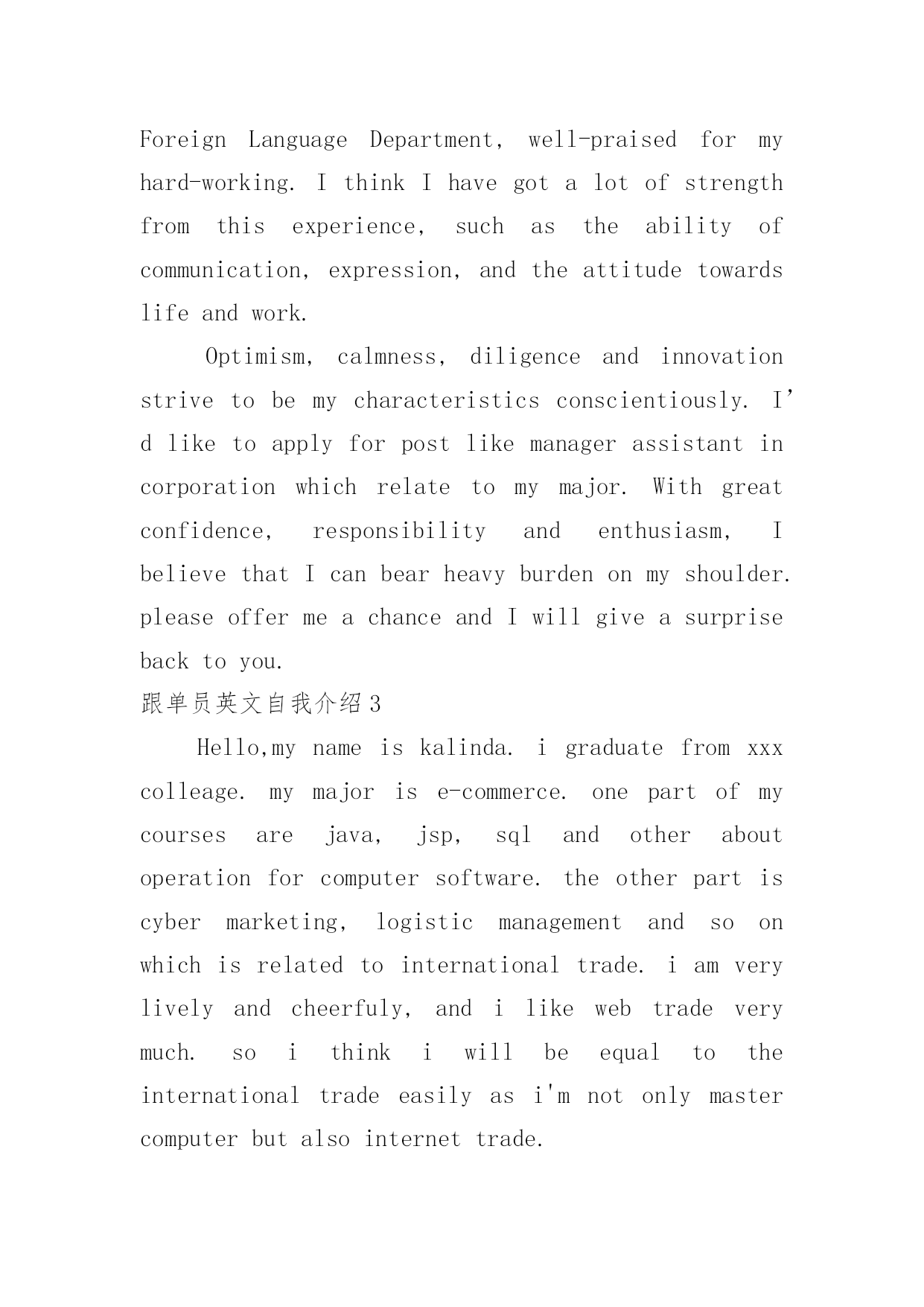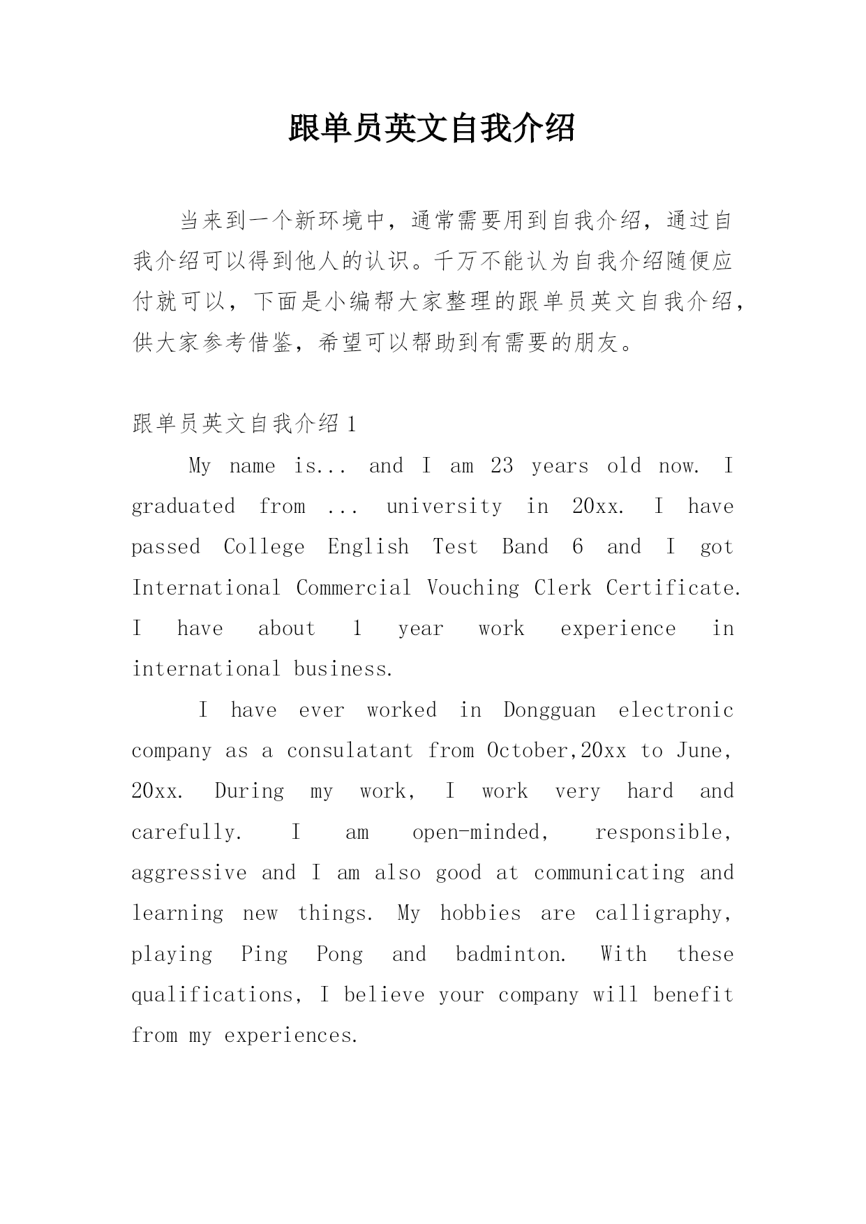 跟单员英文自我介绍跟单员英文自我介绍当来到一个新环境中,通常需要用到自我介绍,通过自我介绍可以得到他人的认识。千万不能认为自我介绍随便应付就可以,下面是小编帮大家整理的跟单员英文自我介绍,供大家参考借鉴,希望可以帮助到有需要的朋友。跟单员英文自我介绍1Mynameis...andIam23yearsoldnow.Igraduatedfrom...universityin20xx.IhavepassedCollegeEnglishTestBand6andIgotInternationalCommercialVouchingClerkCertificate.Ihaveabout1yearworkexperienceininternationalbusiness.IhaveeverworkedinDongguanelectroniccompanyasaconsulatantfromOctober,20xxtoJune,20xx.Duringmywork,Iworkveryhardandcarefully.Iamopen-minded,responsible,aggressiveandIamalsogoodatcommunicatingandlearningnewthings.Myhobbiesarecalligraphy,playingPingPongandbadminton.Withthesequalifications,Ibelieveyourcompanywillbenefitfrommyexperiences.跟单员英文自我介绍2IamanEnglishgraduateof20xxinHunanUniversityofScienceandEngineering.Throughoutmycampuslife,IhavedevotedmyselfwithsincerityandmotivationtothelearningofEnglishlanguage.Ihavegotstricttrainingandgraspedthefivebasicskillsofforeignlanguagequitewell.AsanEnglishmajor,IhaveagoodcommandofEnglishinlistening,speaking,reading,writingandtranslation.BeingproudofmyfluentoralEnglish,Icanexpressmyselfprecisely.Ialsopossesssomecertainabilitiesoftranslationandinterpretation.Atthesametime,IamveryinterestedincomputerandcanoperateWord,powerpoint,typesettingandWindowsSystemverywell.Duringmyfouryearscollegelearning,Ihavegotfulltrainingofoccupationalskills.However,Istillpaymoreattentiontoimprovemyselfinallaspects.WhenIwasintheuniversity,IparticipatedintheEnglishAssociationofourcollege(TEE)activelyandwaselectedthepresidentofTEEandAssociationMinisterofForeignLanguageDepartment,well-praisedformyhard-working.IthinkIhavegotalotofstrengthfromthisexperience,suchastheabilityofcommunication,expression,andtheattitudetowardslifeandwork.Optimism,calmness,diligenceandinnovationstrivetobemycharacteristicsconscientiously.I’dliketoapplyforpostlikemanagerassistantincorporationwhichrelatetomymajor.Withgreatconfidence,responsibilityandenthusiasm,IbelievethatIcanbearheavyburdenonmyshoulder.pleaseoffermeachanceandIwillgiveasurprisebacktoyou.跟单员英文自