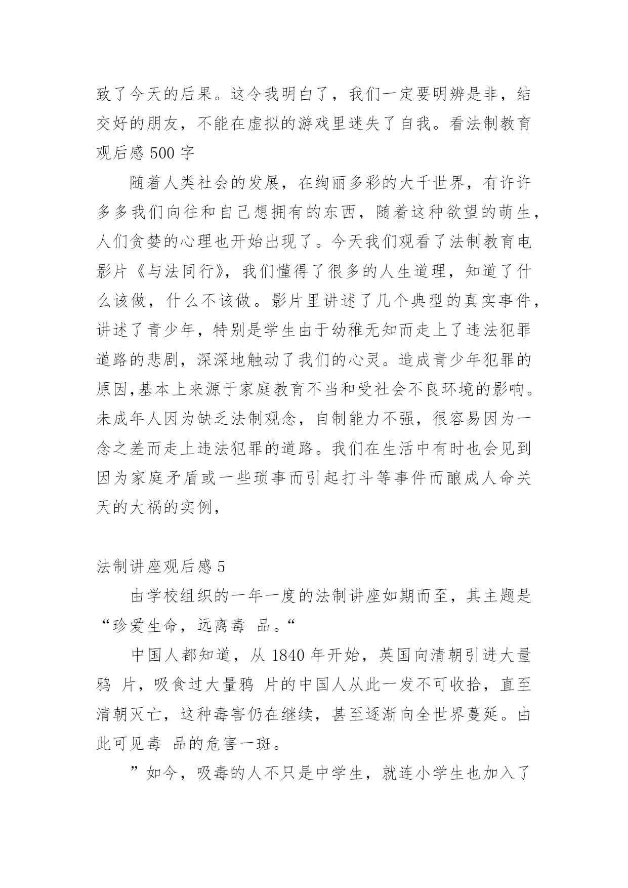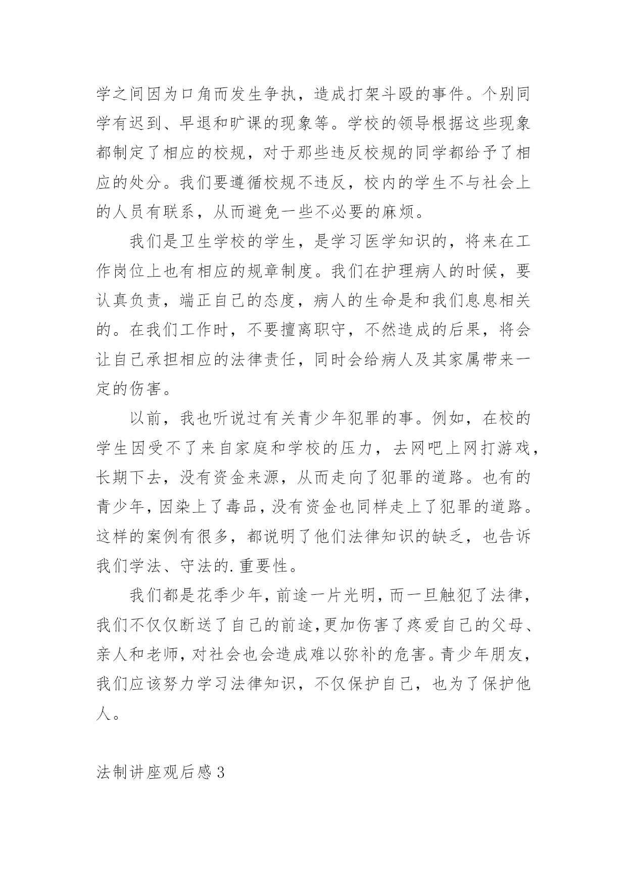 法制讲座观后感看完一部影视作品以后,对人生或者事物一定产生了许多感想吧,是时候静下心来好好写写观后感了。是不是无从下笔、没有头绪?下面是小编为大家收集的法制讲座观后感,欢迎阅读与收藏。法制讲座观后感1星期五,是法制宣传日。所以,学校就请来了法制警官,给我们上了一堂让我深有体会的法制课。听了一节生动的法制教育课,我可是受益匪浅。一个个青年犯案的例子,让我们了解到那些与我们年龄相仿的青少年是怎样走上犯罪道路的。我想,造成他们现在的样子,基本的原因是在于他们对法律的了解不多,总认为这样做没关系,到最后才反应过来。在这些例子中,有很多人只是一时冲动,为了解气,才范下了一发不可收拾的罪行,当初如果平下心来仔细想想,自己该不该做这些事,也就不会像现在这样。犯了罪,一关就是十几年,甚至是把一生都毁了。人最宝贵的是生命,每个人只有一次。而在人生中,青春是最为宝贵的,如果把这最美好的时间浪费在那黑暗的且失去自由的屋子里,那会在今后的人生中留下一道阴影,无法复原,还会因为对社会的恐惧而想要逃避。青少年犯罪,不仅虚度了自己的青春年华,还会连累到自己的所有家人,因为他们把一切都交给了我们,就算是为了他们,我们也不能做出这种伤害他们的事。所以,我们要预防犯罪。首先要有法律意识,增强法制观念,做事要沉着冷静,要分清自己该做的事和不该做的事,做一个合法的好公民。平时要从自我做起,从小事做起,要”勿以善小而不为,勿以恶小而为之”。在交友方面还要增强判断力,判断出该交的朋友和不该交的朋友,让我们生活得更安分。不过我想,那些青少年罪犯或许是一时疏忽而误入歧途,走上犯罪道路,如果身旁有这样的人,我们也要尽可能的帮助他们,让他们感受我们对他的关心和爱护,从而给他找回自信。听完这次讲座,让我的感触很多:我们从小就应该做个清白的人,老师对我们的教导。我们不能忘记他们的养育之恩,就去犯法,不仅对自己有害,对别人也有害。法制讲座观后感2下午,在学校图书馆前我们学校党办室、团委、保卫科共同组织了一年一度的法制教育报告会,听过法官的报告和校长的谆谆教诲,我学到了很多法律知识。作为21世纪的青少年,我们应该做到学法、懂法、守法。不去触犯法律,必须做到有法必依,严格遵守法律法规,在社会生活各个领域中,国家都制定了不同的法律制度,我们都要严格遵守。在我们学校内也有许多违反校规校纪的现象。例如,同学之间因为口角而发生争执,造成打架斗殴的事件。个别同学有迟到、早退和旷课的现象等。学校的领导根据这些现象都制定了相应的校规,对于那些违反校规的同学都给予了相应的处分。我们要遵循校规不违反,校内的学生不与社会上的人员有联系,从而避免一些不必要的麻烦。我们是卫生学校的学生,是学习医学知识的,将来在工作岗位上也有相应的规章制度。我们在护理病人的时候,要认真负责,端正自己的态度,病人的生命是和我们息息相关的。在我们工作时,不要擅离职守,不然造成的后果,将会让自己承担相应的法律责任,同时会给病人及其家属带来一定的伤害。以前,我也听说过有关青少年犯罪的事。例如,在校的学生因受不了来自家庭和学校的压力,去网吧上网打游戏,长期下去,没有资金来源,从而走向了犯罪的道路。也有的青少年,因染上了毒品,没有资金也同样走上了犯罪的道路。这样的案例有很多,都说明了他们法律知识的缺乏,也告诉我们学法、守法的.重要性。我们都是花季少年,前途一片光明,而一旦触犯了法律,我们不仅仅断送了自己的前途,更加伤害了疼爱自己的父母、亲人和老师,对社会也会造成难以弥补的危害。青少年朋友,我们应该努力学习法律知识,不仅保护自己,也为了保护他人。法制讲座观后感3涛涛历史长河中,法律,是其中不可或缺的重要组成部分。从獬豸断案到商鞅变法,再到今天的依法治国,人们也越来越重视法律遵守法律。青少年,作为组国的花朵,更应该知法、学法、懂法、守法。了解它的性质,作用,并学会运用它来保护自己的人身、财产,生命安全。聊城市人民检察院王钦杰检察长指出“青少年学习法制知识,从各个方面看都是必要的。”是的,我们身处法治社会无时无刻都受法律的监管与保护,正如王钦杰检察长所说“法律无处不在”。我们做为新时代的主人,作为将来实现“两个百年”目标的重要力量,新近法律是我们成长路上的必然要求,那么,我们怎样才算在现阶段作到“亲近”法律了呢?第一,便是要做到遵守法律,当在青春,我们正处在价值观塑型的重要时期,如何树立正确的价值观,什么才是正确的价值观?法律便给了我们一定的依据,它所表达出的,无不关乎人类在社会上行为的底线,只有以此约束自己的行为,才能更好地立足。第二,就要学会运用法律,维护自身的合法权益。无论是我们的受教育权,生命财产安全权,亦或是隐私权等权利受到危胁,法律都是我们保护自已的有为武器。另外,懂得主动积极的宣传法治知识,也是“亲近”法律的重要方法,理想的效果