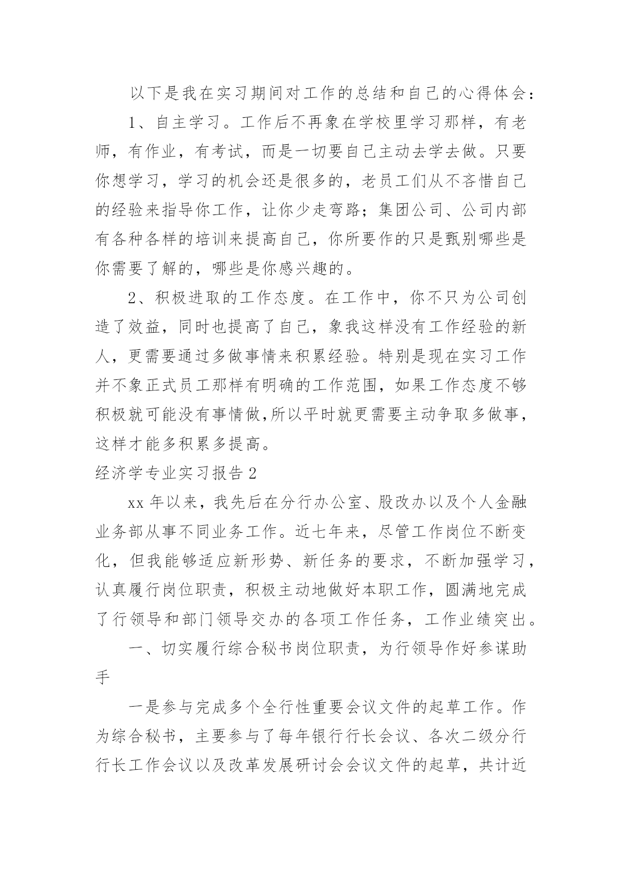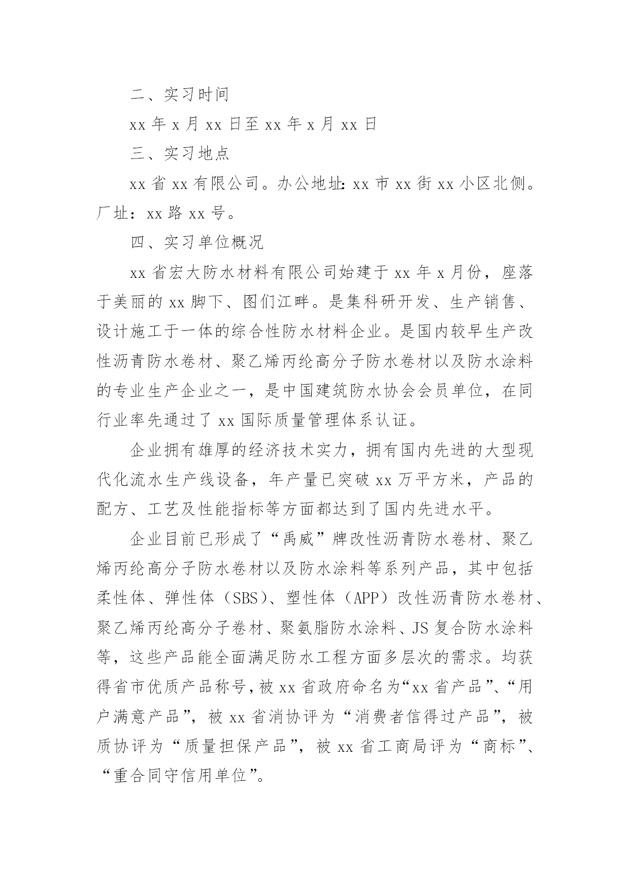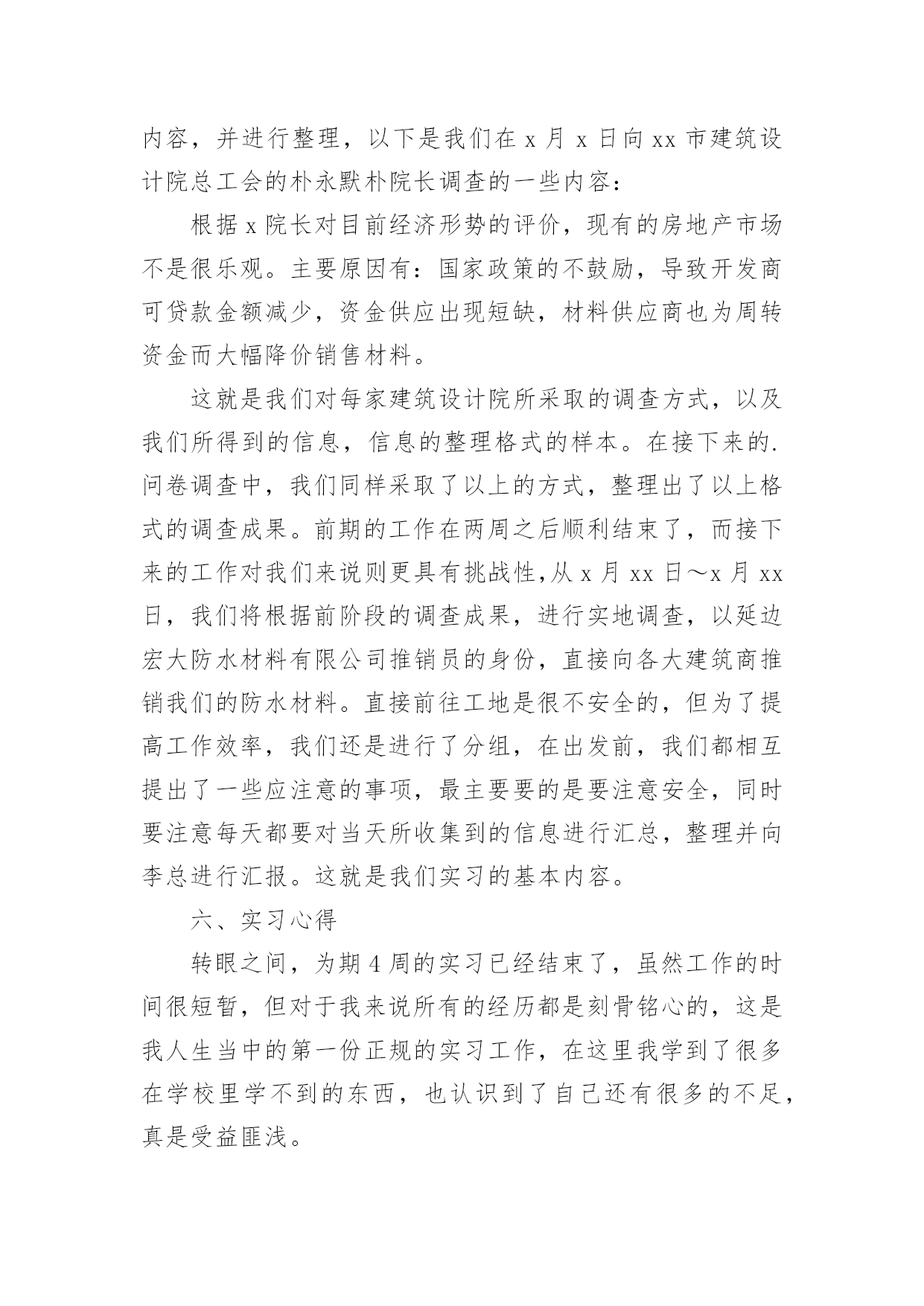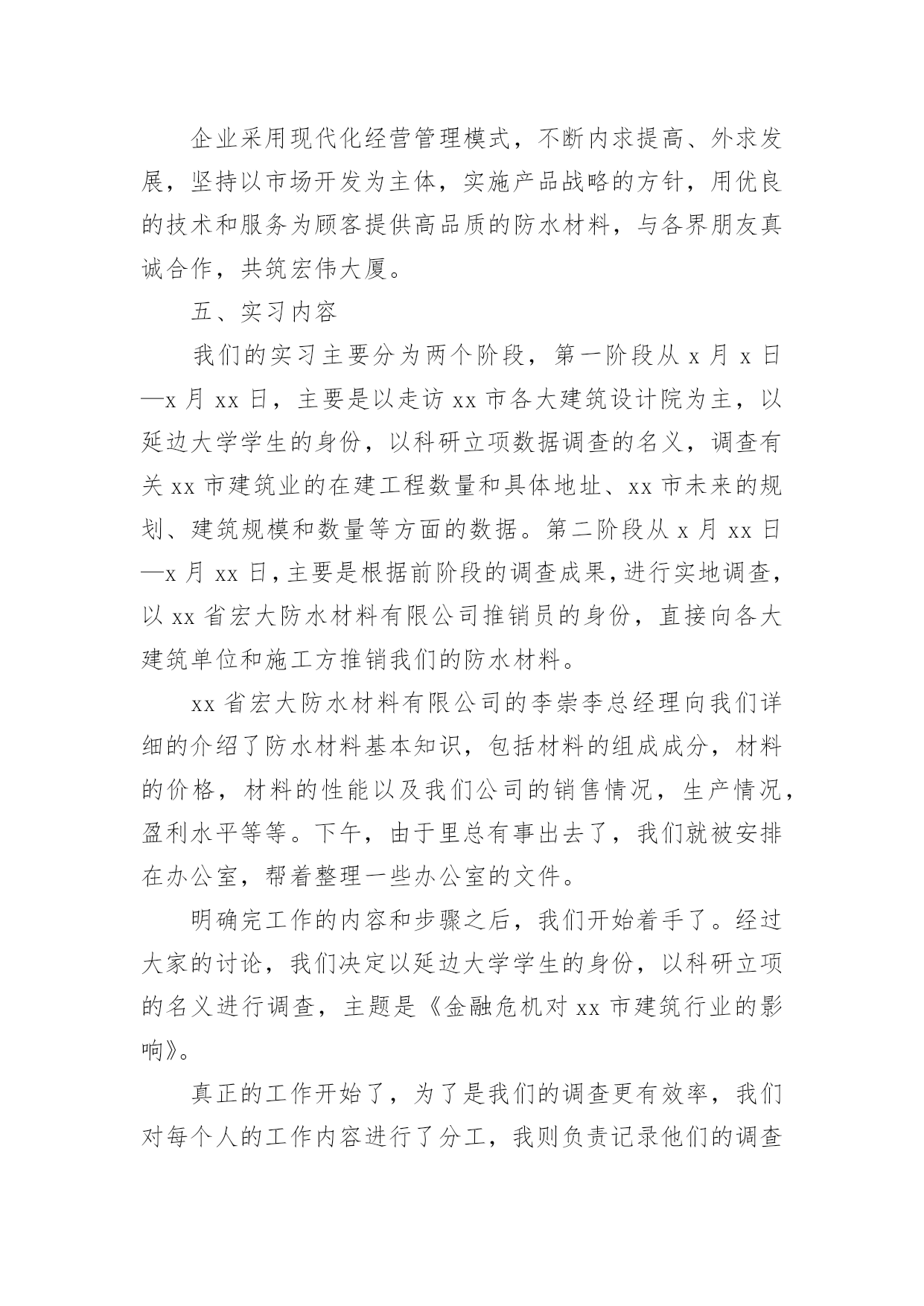 经济学专业实习报告经济学专业实习报告14篇在日常生活和工作中,报告对我们来说并不陌生,报告中涉及到专业性术语要解释清楚。我们应当如何写报告呢?以下是小编整理的经济学专业实习报告,欢迎阅读与收藏。经济学专业实习报告1一、实习目的为了加强对营销管理知识的理解,完善自己的知识理论体系。参观、学习企业的生产、销售流程和理解企业文化精髓,有利于加深对现代企业营销管理现状的了解,加深对企业管理活动的感性和理性认识,并通过实习调研活动,锻炼分析实际问题的能力,培养认真、严谨的工作作风,为就业和将来的工作提供一些宝贵的实践经验。针对于此,我在进行了三年专业课学习之后,通过对《管理学原理》、《西方经济学》、《人力资源管理》、《创业管理》和《管理思想史》等专业课的学习,可以说对有关管理学的专业基础知识、基本理论、基本方法和结构体系已经基本掌握了,但这无非只是纸上谈兵,倘若能将这些理论性的知识和实际工作相结合,那必定会事半功倍,达到我的学习初衷。“实践是检验真理的标准”,只有把从书本上学到的理论知识应用于实际的企业管理操作中去,才能真正掌握这门知识。二、实习时间xx年x月xx日至xx年x月xx日三、实习地点xx省xx有限公司。办公地址:xx市xx街xx小区北侧。厂址:xx路xx号。四、实习单位概况xx省宏大防水材料有限公司始建于xx年x月份,座落于美丽的xx脚下、图们江畔。是集科研开发、生产销售、设计施工于一体的综合性防水材料企业。是国内较早生产改性沥青防水卷材、聚乙烯丙纶高分子防水卷材以及防水涂料的专业生产企业之一,是中国建筑防水协会会员单位,在同行业率先通过了xx国际质量管理体系认证。企业拥有雄厚的经济技术实力,拥有国内先进的大型现代化流水生产线设备,年产量已突破xx万平方米,产品的配方、工艺及性能指标等方面都达到了国内先进水平。企业目前已形成了“禹威”牌改性沥青防水卷材、聚乙烯丙纶高分子防水卷材以及防水涂料等系列产品,其中包括柔性体、弹性体(SBS)、塑性体(APP)改性沥青防水卷材、聚乙烯丙纶高分子卷材、聚氨脂防水涂料、JS复合防水涂料等,这些产品能全面满足防水工程方面多层次的需求。均获得省市优质产品称号,被xx省政府命名为“xx省产品”、“用户满意产品”,被xx省消协评为“消费者信得过产品”,被质协评为“质量担保产品”,被xx省工商局评为“商标”、“重合同守信用单位”。企业采用现代化经营管理模式,不断内求提高、外求发展,坚持以市场开发为主体,实施产品战略的方针,用优良的技术和服务为顾客提供高品质的防水材料,与各界朋友真诚合作,共筑宏伟大厦。五、实习内容我们的实习主要分为两个阶段,第一阶段从x月x日—x月xx日,主要是以走访xx市各大建筑设计院为主,以延边大学学生的身份,以科研立项数据调查的名义,调查有关xx市建筑业的在建工程数量和具体地址、xx市未来的规划、建筑规模和数量等方面的数据。第二阶段从x月xx日—x月xx日,主要是根据前阶段的调查成果,进行实地调查,以xx省宏大防水材料有限公司推销员的身份,直接向各大建筑单位和施工方推销我们的防水材料。xx省宏大防水材料有限公司的李崇李总经理向我们详细的介绍了防水材料基本知识,包括材料的组成成分,材料的价格,材料的性能以及我们公司的销售情况,生产情况,盈利水平等等。下午,由于里总有事出去了,我们就被安排在办公室,帮着整理一些办公室的文件。明确完工作的内容和步骤之后,我们开始着手了。经过大家的讨论,我们决定以延边大学学生的身份,以科研立项的名义进行调查,主题是《金融危机对xx市建筑行业的影响》。真正的工作开始了,为了是我们的调查更有效率,我们对每个人的工作内容进行了分工,我则负责记录他们的调查内容,并进行整理,以下是我们在x月x日向xx市建筑设计院总工会的朴永默朴院长调查的一些内容:根据x院长对目前经济形势的评价,现有的房地产市场不是很乐观。主要原因有:国家政策的不鼓励,导致开发商可贷款金额减少,资金供应出现短缺,材料供应商也为周转资金而大幅降价销售材料。这就是我们对每家建筑设计院所采取的调查方式,以及我们所得到的信息,信息的整理格式的样本。在接下来的.问卷调查中,我们同样采取了以上的方式,整理出了以上格式的调查成果。前期的工作在两周之后顺利结束了,而接下来的工作对我们来说则更具有挑战性,从x月xx日~x月xx日,我们将根据前阶段的调查成果,进行实地调查,以延边宏大防水材料有限公司推销员的身份,直接向各大建筑商推销我们的防水材料。直接前往工地是很不安全的,但为了提高工作效率,我们还是进行了分组,在出发前,我们都相互提出了一些应注意的事项,最主要要的是要注意安全,同时要注意每天都要对当天所收集到的信息进行汇总,整理并向李总进行汇报。这就是我们实习的基本内容。六、实习心得转眼之间,为期4周的实习已