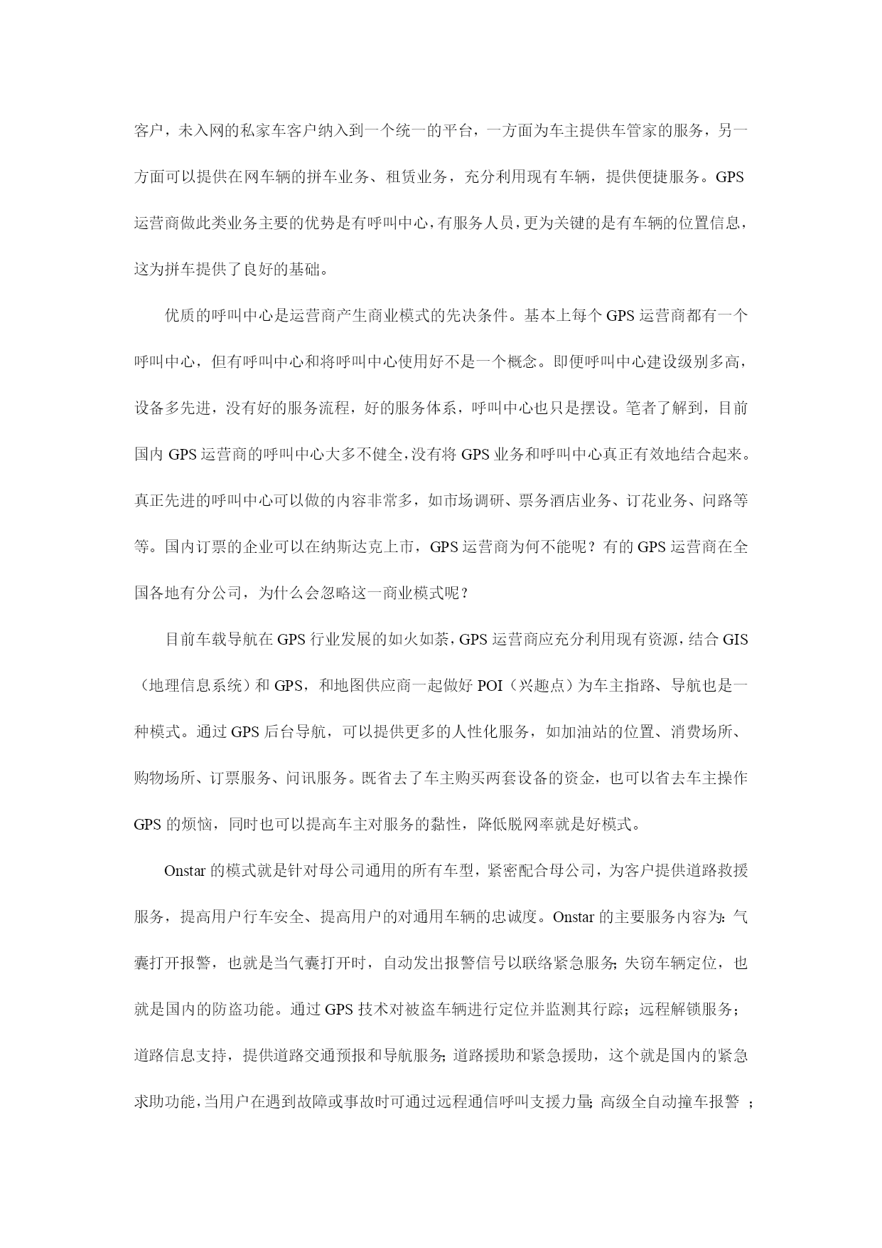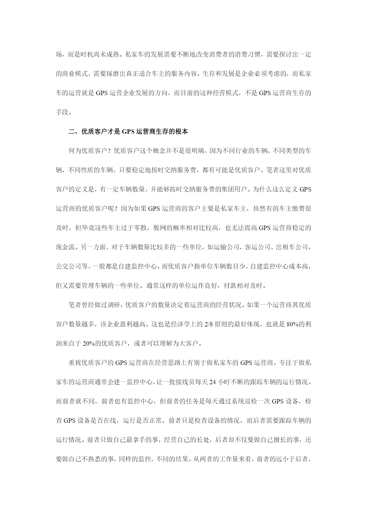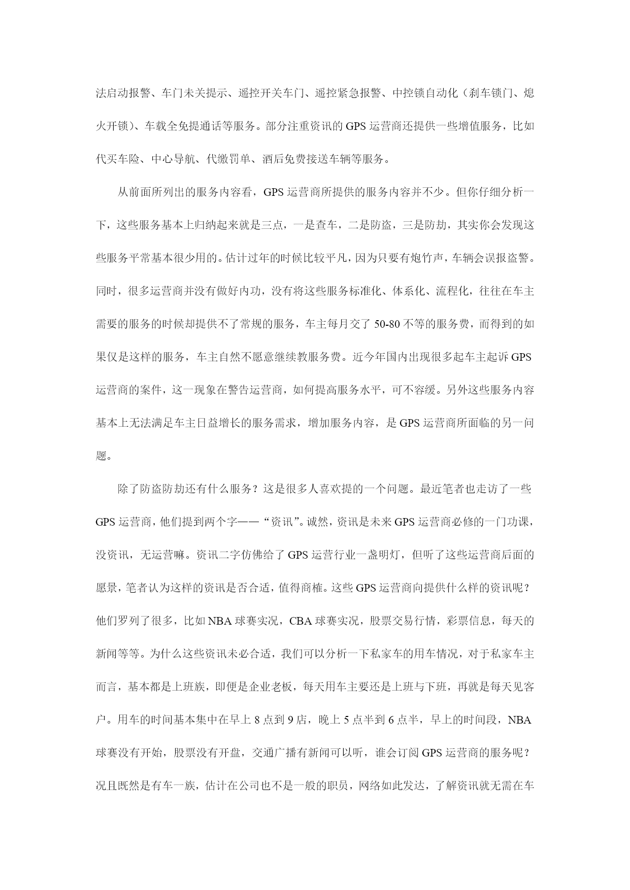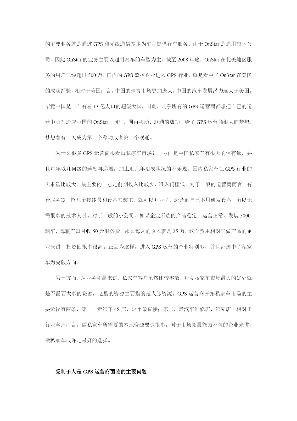 探讨国内GPS运营情况及发展对策文/李兆荣摘要:本文从不同角度分析了国内GPS运营商的发展情况,通过对行业的深刻分析,指出GPS运营企业要想改变现状、突出重围,必须认真做好市场分析与调研,在企业的经营理念,商业模式的打造,战略级合作伙伴的选择方面入手进行有序的调整,方可告别以往的作坊式运营状况。关键词:生存发展模式整合伴随着汽车工业的飞速发展和国民生活质量的提高,我国机动车保有量也越来越高。据公安部统计,截止2008年底,我国机动车保有量近1.7亿辆,其中客运车辆保有量为3850万辆,货运车保有量为1125万辆。车辆的增加同时也使得人们对车辆的调度、监控、跟踪、防盗以及智能化管理的要求提高,从而引发了GPS监控运营市场的快速增长。由于GPS监控系统融合了汽车、通信、IT等领域的前沿技术,整个产业链包括汽车制造商、电子设备供应商、移动运营商、软件供应商、内容提供商、服务提供商等各个相关部门,产业链的纵深化让很多有志于汽车电子行业的精英从90年代末就投身到GPS运营监控领域。十年过去了。国内GPS运营商发展的怎么样?GPS运营商应如何发展?本文从不同角度进行分析,为正在从事、将要投身于GPS运营的同仁给予一些参考,以期让整个行业从无序变得有序,让运营商的未来更加明朗化。一、私家车概念是GPS运营商的发展方向什么是私家车概念?私家车概念就是GPS运营商为提高客户数量通过不同的渠道争取私家车客户安装GPS监控设备的一种概念。私家车概念来自于美国的OnStar。OnStar公司是美国通用汽车的全资子公司,也是美国处于领先地位的汽车安全信息系统服务商。OnStar的主要业务就是通过GPS和无线通信技术为车主提供行车服务。由于OnStar是通用旗下公司,因此OnStar的业务主要以通用汽车的车型为主,截至2008年底,OnStar在北美地区服务的用户已经超过500万。国内的GPS监控企业进入GPS行业,就是看中了OnStar在美国的成功经验,相对于美国而言,中国的消费市场更加庞大,中国的汽车发展潜力远大于美国,毕竟中国是一个有着13亿人口的超级大国,因此,几乎所有的GPS运营商都想把自己的运营中心打造成中国的OnStar。同时,国内移动、联通的成功,给了GPS运营商很大的梦想,梦想着有一天成为第二个移动或者第二个联通。为什么很多GPS运营商很看重私家车市场?一方面是中国私家车有很大的保有量,并且每年以几何级的速度再递增,加上近几年治安状况的不乐观,国内私家车在GPS行业的需求量比较大。最主要的一点是前期投入比较少,准入门槛低。对于一般的运营商而言,有台服务器,招几个接线员和设备安装工,就可以开业了。运营商自己不用研发设备,所以无需很多的技术人员。对于一般的小公司,如果企业所选的产品稳定,运营正常,发展5000辆车,每辆车每月收50元服务费,那么每月的收入就是25万,这个费用相对于做产品的企业来讲,投资回报率很高。正因为这样,进入GPS运营的企业特别多,并且都选中了私家车为突破方向。另一方面,从业务拓展来讲,私家车客户虽然比较零散,开发私家车市场最大的好处就是不需要太多的资源,这里的资源主要指的是人脉资源。GPS运营商开拓私家车市场的主要途径有两条,第一,走汽车4S店,这个最直接;第二,走汽车维修店、汽配店。相对于行业客户而言,做私家车所需要的本地资源要少很多。对于市场拓展能力不强的企业来讲,做私家车或许是最好的选择。受制于人是GPS运营商面临的主要问题前面提到的Onstar其客户主要针对的是通用的车主,G-BOOK的客户是丰田的车主,Wingcast针对的是福特的车主。纵观国外的GPS运营,对于国内的GPS运营商来讲,国内车辆的现状造成了运营商的尴尬局面。由于我国汽车工业整体发展水平不高,因此,现在市面上可以看到的汽车各个车型都有,不同的车型在设备的安装维护方面有不同的问题。目前GPS运营商的核心服务内容GPS位置信息得依赖美国的卫星系统,无线通信得依靠中国移动或联通,受制于人造成了GPS运营业务无法规模化,标准化。与中国GPS运营商不同的是国外的运营商只做一个车型,并且都是汽车公司为自己的客户提供的后市场服务,因此在车载产品的质量、兼容等问题方面做得相对出色,甚至对于Onstar来讲,他有自己的通信网络,因此,在做运营服务的过程中通信问题不会造成很大的影响。脱网率高是GPS运营商亟需解决的现象GPS设备的故障率造成了车主的脱网现象,同时影响了GPS运营商的业务拓展。据不完全统计,国内GPS监控设备的返修率高达30%,居高不下的返修率让车主对GPS运营商失去信心,往往车主在使用一段时间的GPS之后,不愿再付服务费,这样GPS运营商就出现大面积的脱网现象。这个现象对于注重做私家车的一些GPS运营商而言,是个致命