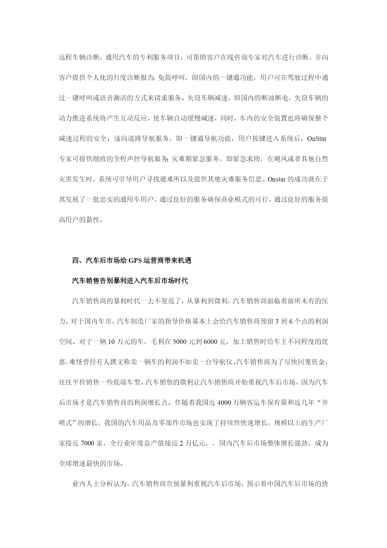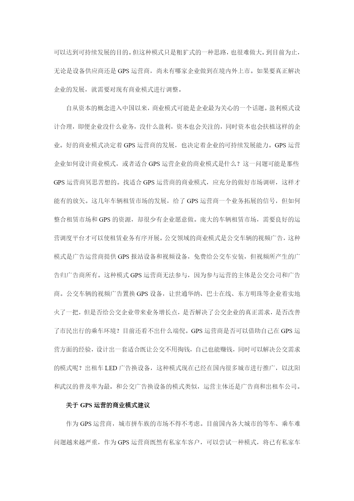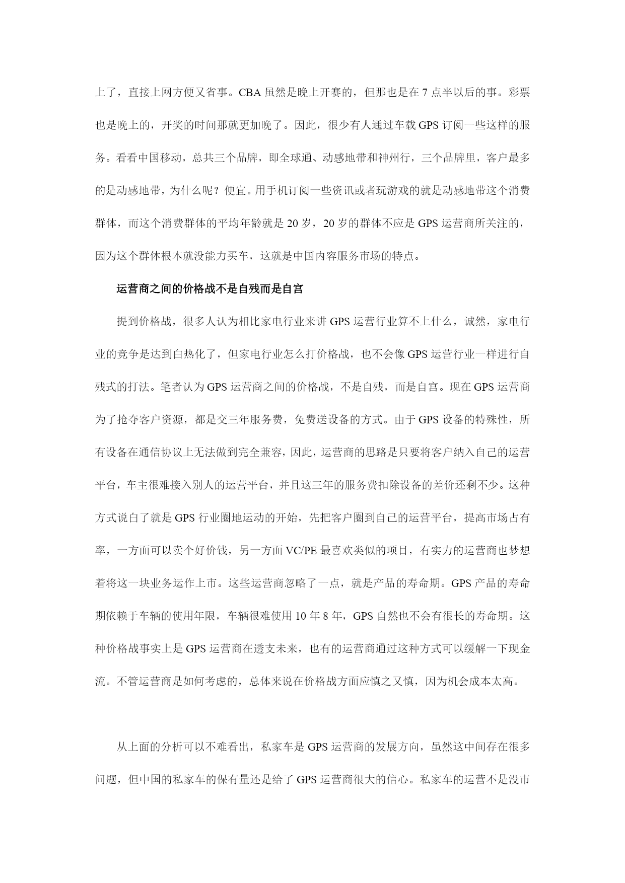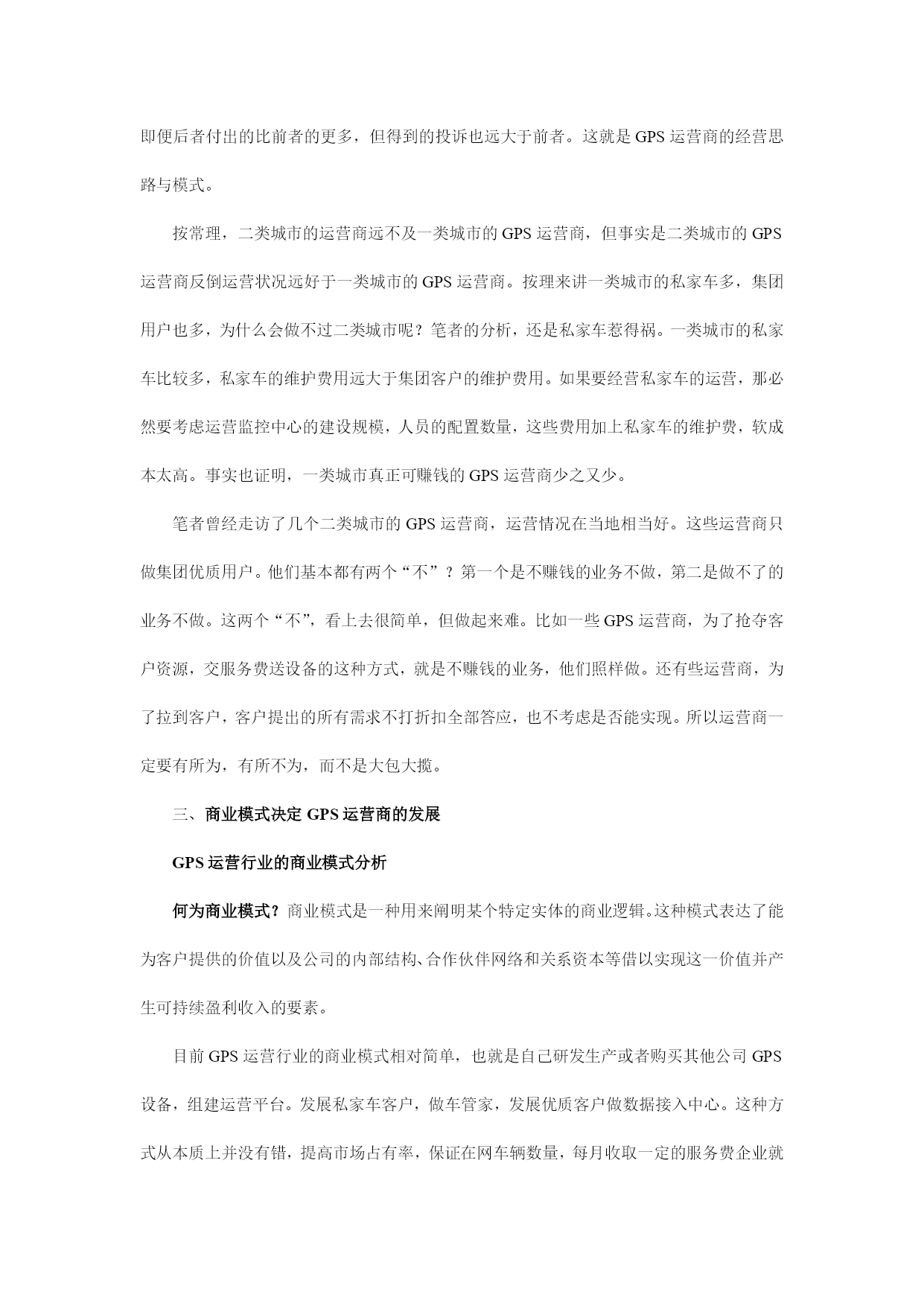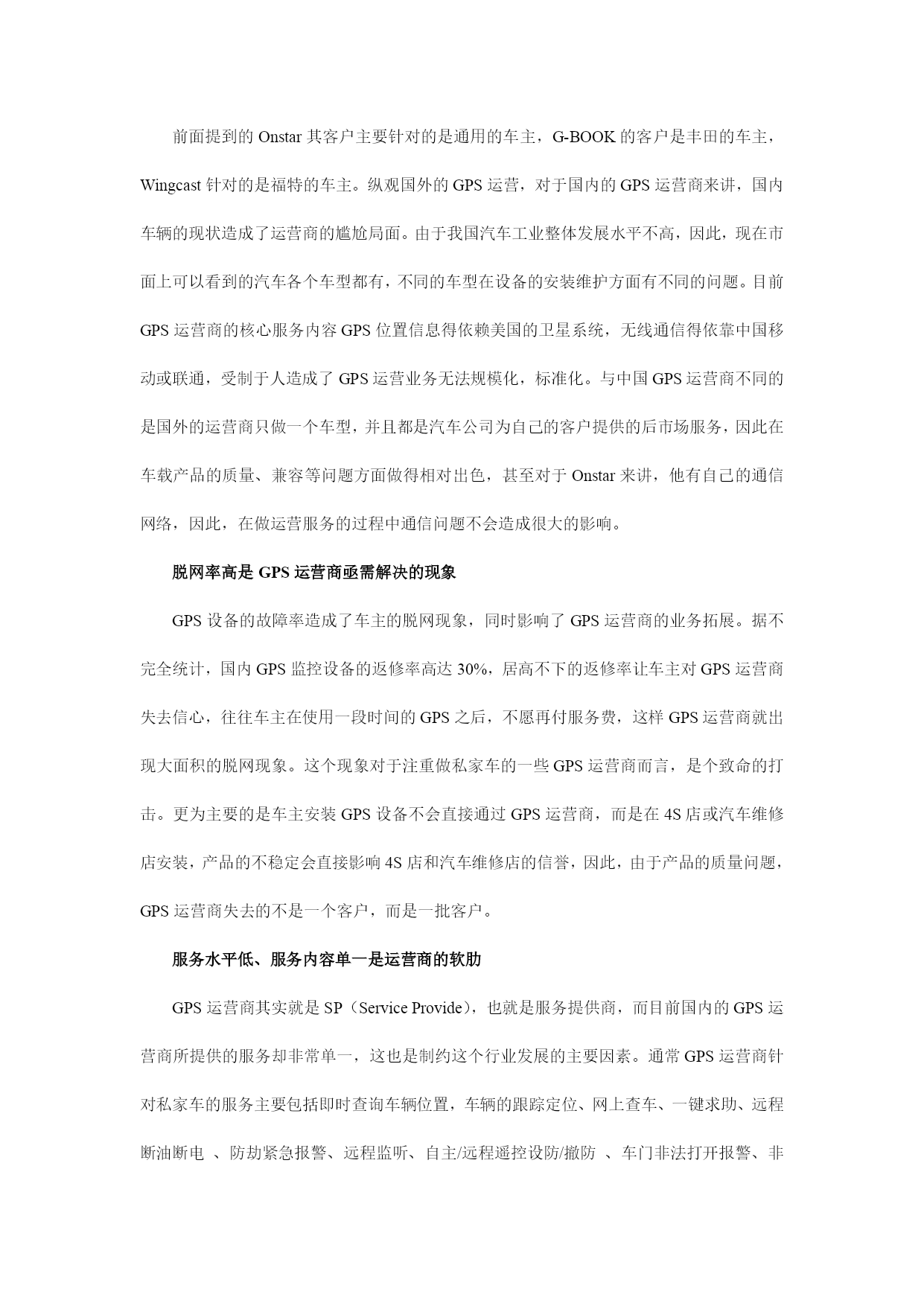 探讨国内GPS运营情况及发展对策文/李兆荣摘要:本文从不同角度分析了国内GPS运营商的发展情况,通过对行业的深刻分析,指出GPS运营企业要想改变现状、突出重围,必须认真做好市场分析与调研,在企业的经营理念,商业模式的打造,战略级合作伙伴的选择方面入手进行有序的调整,方可告别以往的作坊式运营状况。关键词:生存发展模式整合伴随着汽车工业的飞速发展和国民生活质量的提高,我国机动车保有量也越来越高。据公安部统计,截止2008年底,我国机动车保有量近1.7亿辆,其中客运车辆保有量为3850万辆,货运车保有量为1125万辆。车辆的增加同时也使得人们对车辆的调度、监控、跟踪、防盗以及智能化管理的要求提高,从而引发了GPS监控运营市场的快速增长。由于GPS监控系统融合了汽车、通信、IT等领域的前沿技术,整个产业链包括汽车制造商、电子设备供应商、移动运营商、软件供应商、内容提供商、服务提供商等各个相关部门,产业链的纵深化让很多有志于汽车电子行业的精英从90年代末就投身到GPS运营监控领域。十年过去了。国内GPS运营商发展的怎么样?GPS运营商应如何发展?本文从不同角度进行分析,为正在从事、将要投身于GPS运营的同仁给予一些参考,以期让整个行业从无序变得有序,让运营商的未来更加明朗化。一、私家车概念是GPS运营商的发展方向什么是私家车概念?私家车概念就是GPS运营商为提高客户数量通过不同的渠道争取私家车客户安装GPS监控设备的一种概念。私家车概念来自于美国的OnStar。OnStar公司是美国通用汽车的全资子公司,也是美国处于领先地位的汽车安全信息系统服务商。OnStar的主要业务就是通过GPS和无线通信技术为车主提供行车服务。由于OnStar是通用旗下公司,因此OnStar的业务主要以通用汽车的车型为主,截至2008年底,OnStar在北美地区服务的用户已经超过500万。国内的GPS监控企业进入GPS行业,就是看中了OnStar在美国的成功经验,相对于美国而言,中国的消费市场更加庞大,中国的汽车发展潜力远大于美国,毕竟中国是一个有着13亿人口的超级大国,因此,几乎所有的GPS运营商都想把自己的运营中心打造成中国的OnStar。同时,国内移动、联通的成功,给了GPS运营商很大的梦想,梦想着有一天成为第二个移动或者第二个联通。为什么很多GPS运营商很看重私家车市场?一方面是中国私家车有很大的保有量,并且每年以几何级的速度再递增,加上近几年治安状况的不乐观,国内私家车在GPS行业的需求量比较大。最主要的一点是前期投入比较少,准入门槛低。对于一般的运营商而言,有台服务器,招几个接线员和设备安装工,就可以开业了。运营商自己不用研发设备,所以无需很多的技术人员。对于一般的小公司,如果企业所选的产品稳定,运营正常,发展5000辆车,每辆车每月收50元服务费,那么每月的收入就是25万,这个费用相对于做产品的企业来讲,投资回报率很高。正因为这样,进入GPS运营的企业特别多,并且都选中了私家车为突破方向。另一方面,从业务拓展来讲,私家车客户虽然比较零散,开发私家车市场最大的好处就是不需要太多的资源,这里的资源主要指的是人脉资源。GPS运营商开拓私家车市场的主要途径有两条,第一,走汽车4S店,这个最直接;第二,走汽车维修店、汽配店。相对于行业客户而言,做私家车所需要的本地资源要少很多。对于市场拓展能力不强的企业来讲,做私家车或许是最好的选择。受制于人是GPS运营商面临的主要问题前面提到的Onstar其客户主要针对的是通用的车主,G-BOOK的客户是丰田的车主,Wingcast针对的是福特的车主。纵观国外的GPS运营,对于国内的GPS运营商来讲,国内车辆的现状造成了运营商的尴尬局面。由于我国汽车工业整体发展水平不高,因此,现在市面上可以看到的汽车各个车型都有,不同的车型在设备的安装维护方面有不同的问题。目前GPS运营商的核心服务内容GPS位置信息得依赖美国的卫星系统,无线通信得依靠中国移动或联通,受制于人造成了GPS运营业务无法规模化,标准化。与中国GPS运营商不同的是国外的运营商只做一个车型,并且都是汽车公司为自己的客户提供的后市场服务,因此在车载产品的质量、兼容等问题方面做得相对出色,甚至对于Onstar来讲,他有自己的通信网络,因此,在做运营服务的过程中通信问题不会造成很大的影响。脱网率高是GPS运营商亟需解决的现象GPS设备的故障率造成了车主的脱网现象,同时影响了GPS运营商的业务拓展。据不完全统计,国内GPS监控设备的返修率高达30%,居高不下的返修率让车主对GPS运营商失去信心,往往车主在使用一段时间的GPS之后,不愿再付服务费,这样GPS运营商就出现大面积的脱网现象。这个现象对于注重做私家车的一些GPS运营商而言,是个致命