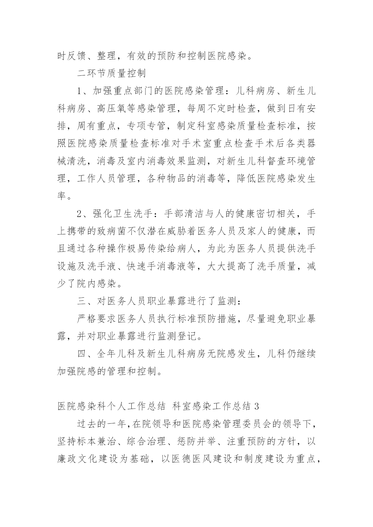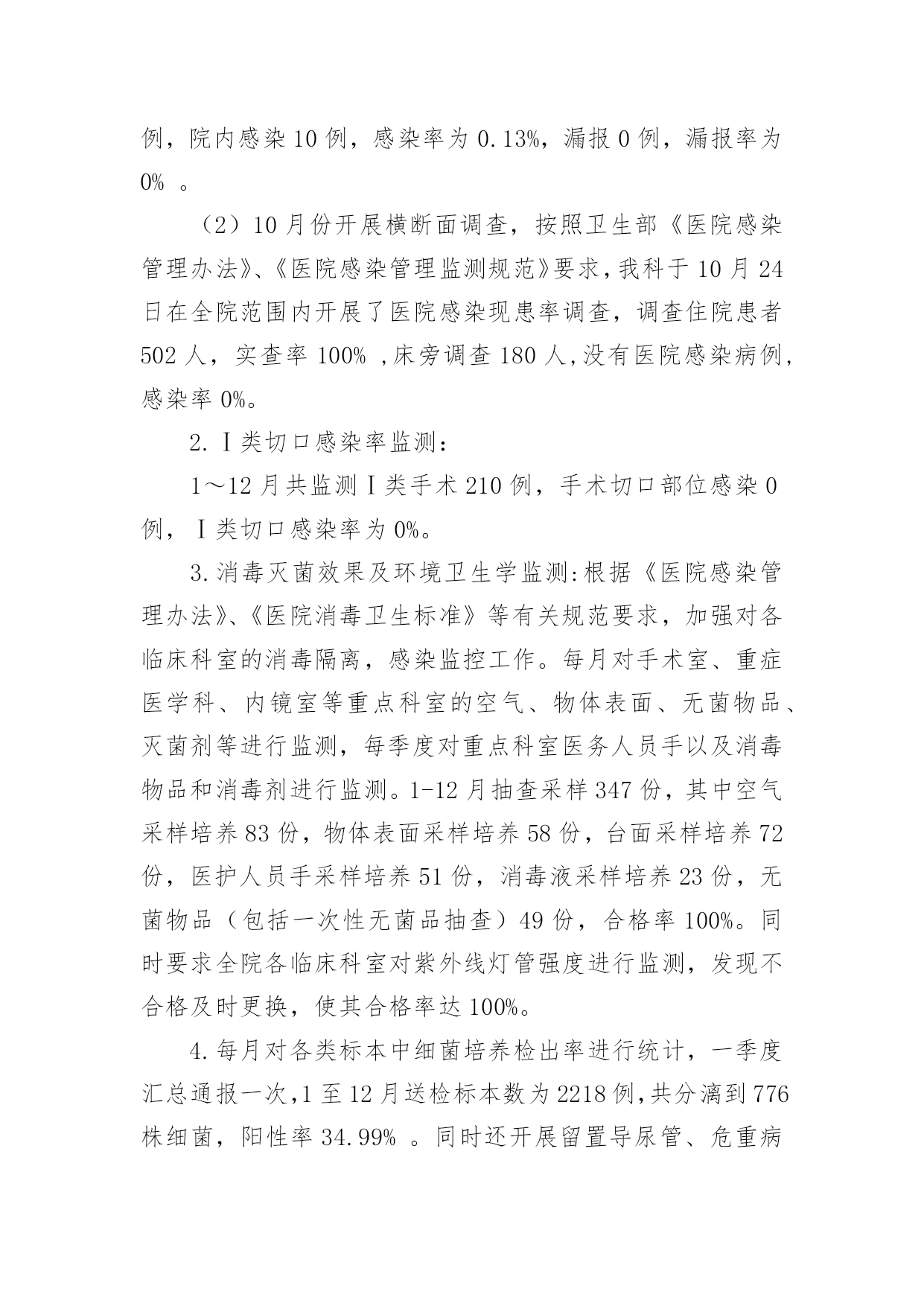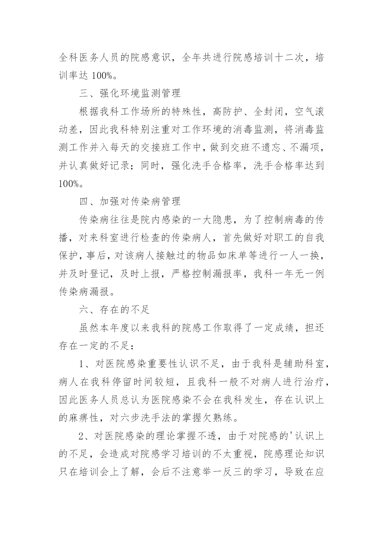 医院感染科个人工作总结科室感染工作总结总结是对某一特定时间段内的学习和工作生活等表现情况加以回顾和分析的一种书面材料,通过它可以正确认识以往学习和工作中的优缺点,让我们一起来学习写总结吧。那么总结有什么格式呢?以下是小编为大家收集的医院感染科个人工作总结科室感染工作总结,供大家参考借鉴,希望可以帮助到有需要的朋友。医院感染科个人工作总结科室感染工作总结1在院领导和医院感染管理委员会及院感科的领导下,在兄弟科室的大力支持下,经过我科全体人员的共同努力,我科20__院感工作取得了一定的成绩,现将一年来的主要工作总结如下:一、完善院感管理体系根据医院及相关文件的要求及规定,成立了放射科医院感染管理小组,由科室副主任担任组长,并由一名医务人员担任监控医生,明确了院感管理小组职责和监控工程师职责,将院感工作视为科室首要任务,进一步完善院感管理体系。二、加强院感知识培训制定了《20__年放射科感染管理年度工作计划》和《放射科感染管理年度培训计划》,并组织实施,及时修订措施。根据院感工作计划,每月组织一次院感知识培训学习,提高全科医务人员的院感意识,全年共进行院感培训十二次,培训率达100%。三、强化环境监测管理根据我科工作场所的特殊性,高防护、全封闭,空气滚动差,因此我科特别注重对工作环境的消毒监测,将消毒监测工作并入每天的交接班工作中,做到交班不遗忘、不漏项,并认真做好记录;同时,强化洗手合格率,洗手合格率达到100%。四、加强对传染病管理传染病往往是院内感染的一大隐患,为了控制病毒的传播,对来科室进行检查的传染病人,首先做好对职工的自我保护,事后,对该病人接触过的物品如床单等进行一人一换,并及时登记,及时上报,严格控制漏报率,我科一年无一例传染病漏报。六、存在的不足虽然本年度以来我科的院感工作取得了一定成绩,担还存在一定的不足:1、对医院感染重要性认识不足,由于我科是辅助科室,病人在我科停留时间较短,且我科一般不对病人进行治疗,因此医务人员总认为医院感染不会在我科发生,存在认识上的麻痹性,对六步洗手法的掌握欠熟练。2、对医院感染的理论掌握不透,由于对院感的'认识上的不足,会造成对院感学习培训的不太重视,院感理论知识只在培训会上了解,会后不注意举一反三的学习,导致在应对院感检查需要回答理论问题时,出现回答不全甚至答不上来的现象。七、下一年度院感工作的改进方向强化科室院感小组的管理力度,加强对院感知识的培训,将院感知识考核工作与职工年度考核相结合,进一步加强职工对院感工作重要性认识,为医院院感工作做出应有的贡献。医院感染科个人工作总结科室感染工作总结2本年度,在医院领导的正确领导和大力支持下,认真贯彻落实卫生部颁布的《医院感染管理办法》、《消毒技术规范》、《医疗卫生机构医疗废物管理办法》等有关医院管理的法律法规,强化环节质量管理及全院医院感染知识培训,严格质量监测及考核,降低了医院感染发病率,保证了医疗安全,全年医院感染率为0%。器械消毒合格率100%,有效的控制了院内感染,确保了医疗安全。现全年工作总结如下:一、健全组织,完善管理为了进一步加强医院感染管理工作,明确职责,落实任务,感染管理小组成员,成立了感染质量检查小组,负责每月的.感染质量大检查,完善了三级管理体系,将任务细化,落实到人,感控组长负责整改,逐步落实各项工作,使院感工作得到持续改进。二、加强质量管理,确保医疗安全一质量控制:每月进行一次大检查,每周随即检查,系统调查收集、整理、分析有关医院感染情况,对存在问题及时反馈、整理,有效的预防和控制医院感染。二环节质量控制1、加强重点部门的医院感染管理:儿科病房、新生儿科病房、高压氧等感染管理,每周不定时检查,做到日有安排,周有重点,专项专管,制定科室感染质量检查标准,按照医院感染质量检查标准对手术室重点检查手术后各类器械清洗,消毒及室内消毒效果监测,对新生儿科督查环境管理,工作人员管理,各种物品的消毒等,降低医院感染发生率。2、强化卫生洗手:手部清洁与人的健康密切相关,手上携带的致病菌不仅潜在威胁着医务人员及家人的健康,而且通过各种操作极易传染给病人,为此为医务人员提供洗手设施及洗手液、快速手消毒液等,大大提高了洗手质量,减少了院内感染。三、对医务人员职业暴露进行了监测:严格要求医务人员执行标准预防措施,尽量避免职业暴露,并对职业暴露进行监测登记。四、全年儿科及新生儿科病房无院感发生,儿科仍继续加强院感的管理和控制。医院感染科个人工作总结科室感染工作总结3过去的一年,在院领导和医院感染管理委员会的领导下,坚持标本兼治、综合治理、惩防并举、注重预防的方针,以廉政文化建设为基础,以医德医风建设和制度建设为重点,紧紧围绕医疗中心工作,抓好党风廉政建设责任制落实,进一步完善长效机制,坚持以病人为中心,积极开展院感监控工作。严格按照