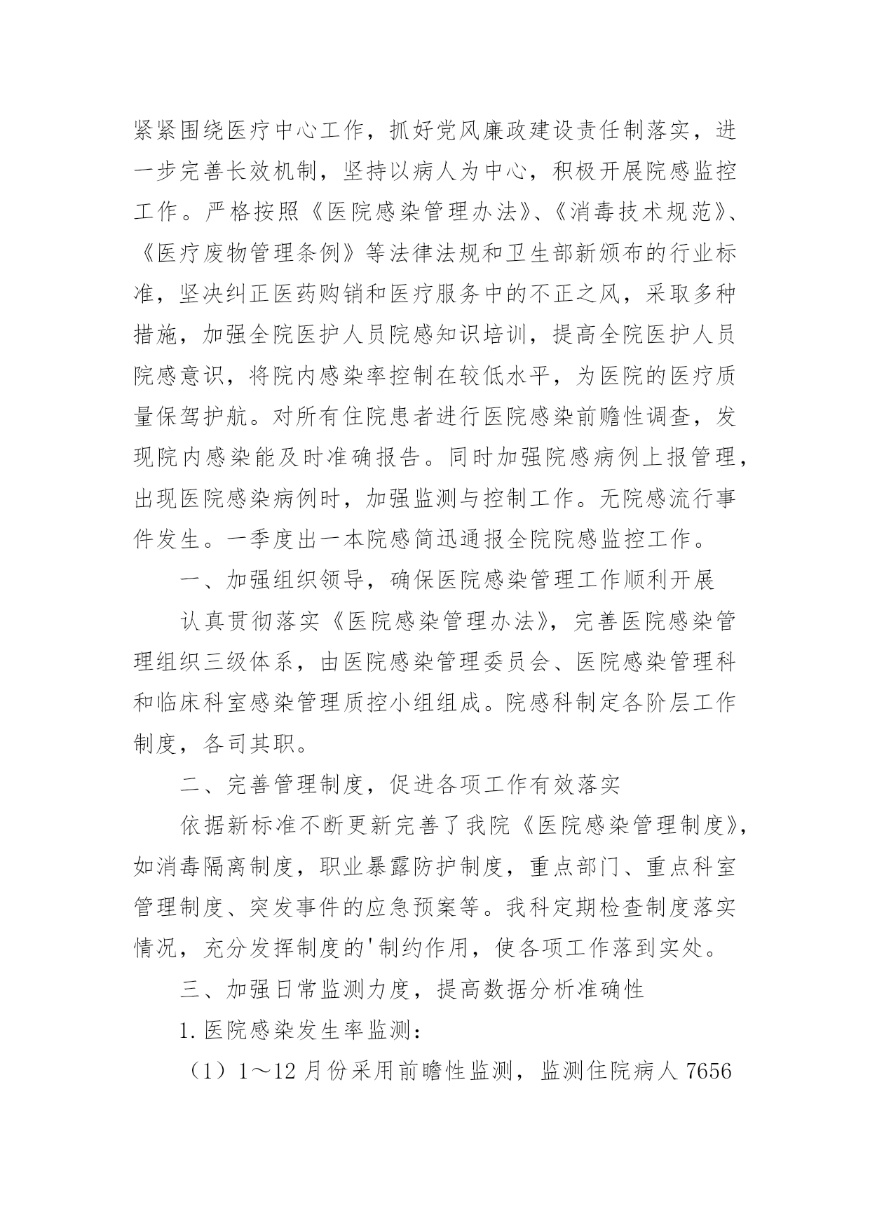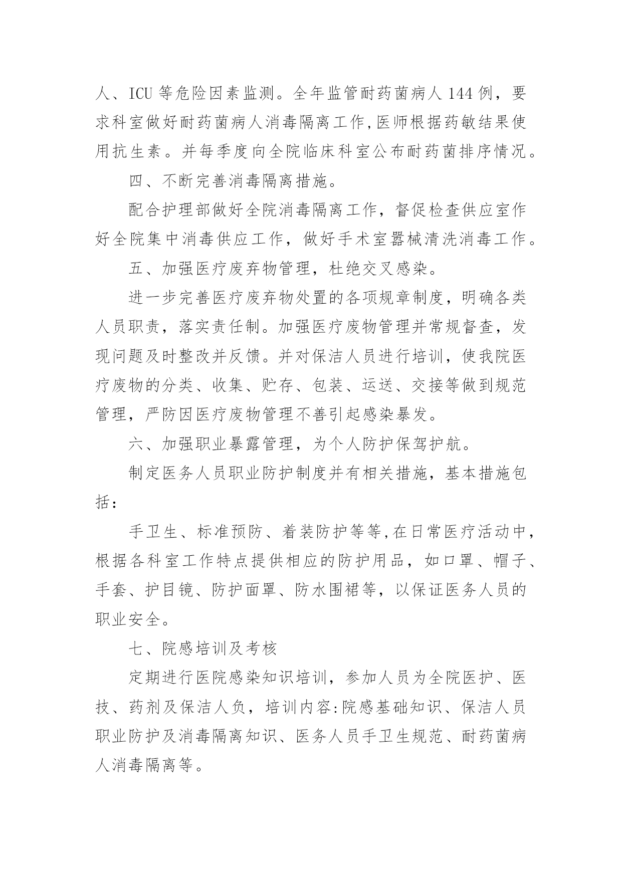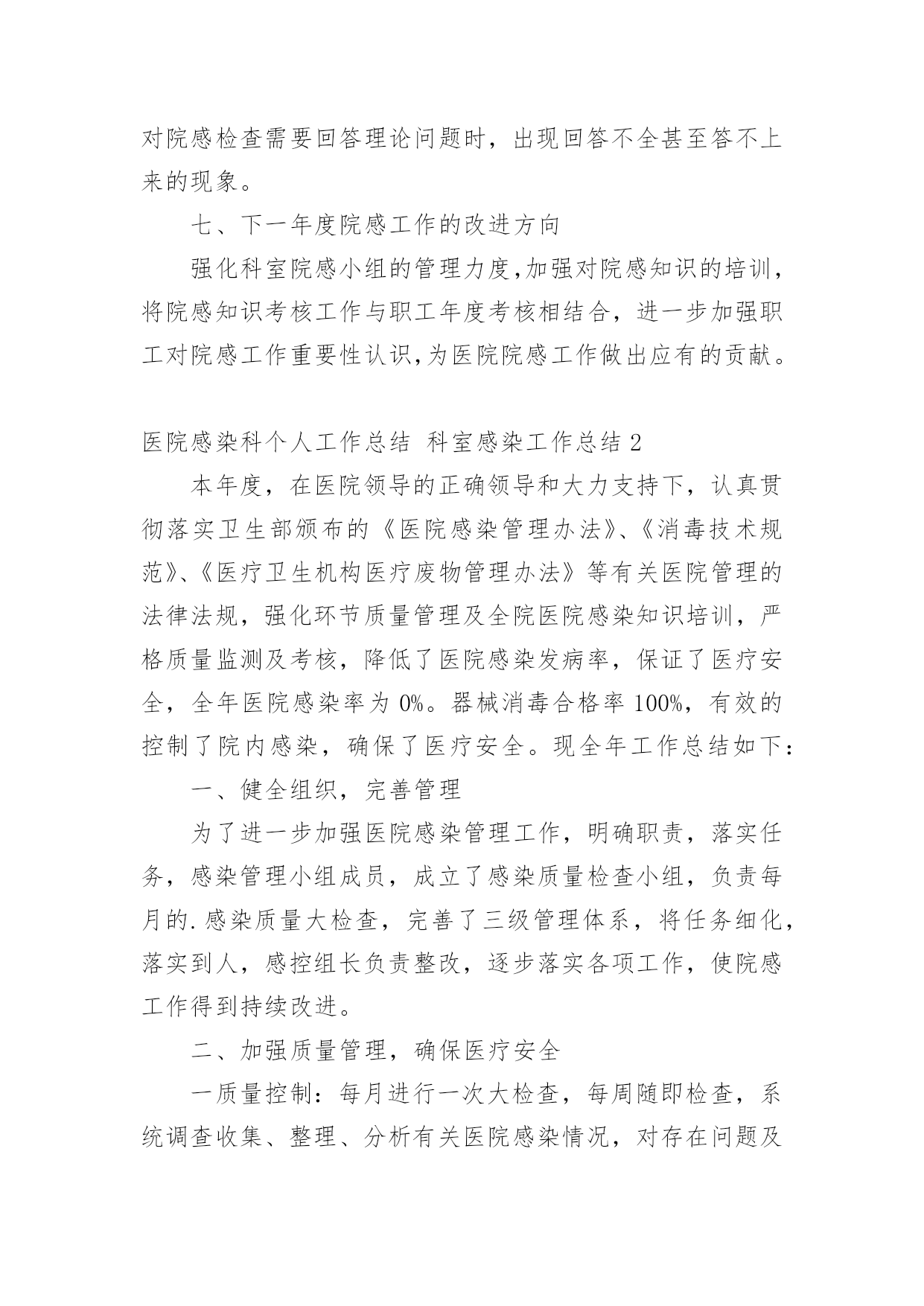 医院感染科个人工作总结科室感染工作总结总结是对某一特定时间段内的学习和工作生活等表现情况加以回顾和分析的一种书面材料,通过它可以正确认识以往学习和工作中的优缺点,让我们一起来学习写总结吧。那么总结有什么格式呢?以下是小编为大家收集的医院感染科个人工作总结科室感染工作总结,供大家参考借鉴,希望可以帮助到有需要的朋友。医院感染科个人工作总结科室感染工作总结1在院领导和医院感染管理委员会及院感科的领导下,在兄弟科室的大力支持下,经过我科全体人员的共同努力,我科20__院感工作取得了一定的成绩,现将一年来的主要工作总结如下:一、完善院感管理体系根据医院及相关文件的要求及规定,成立了放射科医院感染管理小组,由科室副主任担任组长,并由一名医务人员担任监控医生,明确了院感管理小组职责和监控工程师职责,将院感工作视为科室首要任务,进一步完善院感管理体系。二、加强院感知识培训制定了《20__年放射科感染管理年度工作计划》和《放射科感染管理年度培训计划》,并组织实施,及时修订措施。根据院感工作计划,每月组织一次院感知识培训学习,提高全科医务人员的院感意识,全年共进行院感培训十二次,培训率达100%。三、强化环境监测管理根据我科工作场所的特殊性,高防护、全封闭,空气滚动差,因此我科特别注重对工作环境的消毒监测,将消毒监测工作并入每天的交接班工作中,做到交班不遗忘、不漏项,并认真做好记录;同时,强化洗手合格率,洗手合格率达到100%。四、加强对传染病管理传染病往往是院内感染的一大隐患,为了控制病毒的传播,对来科室进行检查的传染病人,首先做好对职工的自我保护,事后,对该病人接触过的物品如床单等进行一人一换,并及时登记,及时上报,严格控制漏报率,我科一年无一例传染病漏报。六、存在的不足虽然本年度以来我科的院感工作取得了一定成绩,担还存在一定的不足:1、对医院感染重要性认识不足,由于我科是辅助科室,病人在我科停留时间较短,且我科一般不对病人进行治疗,因此医务人员总认为医院感染不会在我科发生,存在认识上的麻痹性,对六步洗手法的掌握欠熟练。2、对医院感染的理论掌握不透,由于对院感的'认识上的不足,会造成对院感学习培训的不太重视,院感理论知识只在培训会上了解,会后不注意举一反三的学习,导致在应对院感检查需要回答理论问题时,出现回答不全甚至答不上来的现象。七、下一年度院感工作的改进方向强化科室院感小组的管理力度,加强对院感知识的培训,将院感知识考核工作与职工年度考核相结合,进一步加强职工对院感工作重要性认识,为医院院感工作做出应有的贡献。医院感染科个人工作总结科室感染工作总结2本年度,在医院领导的正确领导和大力支持下,认真贯彻落实卫生部颁布的《医院感染管理办法》、《消毒技术规范》、《医疗卫生机构医疗废物管理办法》等有关医院管理的法律法规,强化环节质量管理及全院医院感染知识培训,严格质量监测及考核,降低了医院感染发病率,保证了医疗安全,全年医院感染率为0%。器械消毒合格率100%,有效的控制了院内感染,确保了医疗安全。现全年工作总结如下:一、健全组织,完善管理为了进一步加强医院感染管理工作,明确职责,落实任务,感染管理小组成员,成立了感染质量检查小组,负责每月的.感染质量大检查,完善了三级管理体系,将任务细化,落实到人,感控组长负责整改,逐步落实各项工作,使院感工作得到持续改进。二、加强质量管理,确保医疗安全一质量控制:每月进行一次大检查,每周随即检查,系统调查收集、整理、分析有关医院感染情况,对存在问题及时反馈、整理,有效的预防和控制医院感染。二环节质量控制1、加强重点部门的医院感染管理:儿科病房、新生儿科病房、高压氧等感染管理,每周不定时检查,做到日有安排,周有重点,专项专管,制定科室感染质量检查标准,按照医院感染质量检查标准对手术室重点检查手术后各类器械清洗,消毒及室内消毒效果监测,对新生儿科督查环境管理,工作人员管理,各种物品的消毒等,降低医院感染发生率。2、强化卫生洗手:手部清洁与人的健康密切相关,手上携带的致病菌不仅潜在威胁着医务人员及家人的健康,而且通过各种操作极易传染给病人,为此为医务人员提供洗手设施及洗手液、快速手消毒液等,大大提高了洗手质量,减少了院内感染。三、对医务人员职业暴露进行了监测:严格要求医务人员执行标准预防措施,尽量避免职业暴露,并对职业暴露进行监测登记。四、全年儿科及新生儿科病房无院感发生,儿科仍继续加强院感的管理和控制。医院感染科个人工作总结科室感染工作总结3过去的一年,在院领导和医院感染管理委员会的领导下,坚持标本兼治、综合治理、惩防并举、注重预防的方针,以廉政文化建设为基础,以医德医风建设和制度建设为重点,紧紧围绕医疗中心工作,抓好党风廉政建设责任制落实,进一步完善长效机制,坚持以病人为中心,积极开展院感监控工作。严格按照
