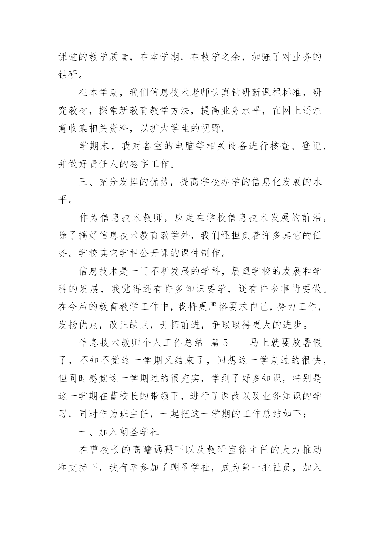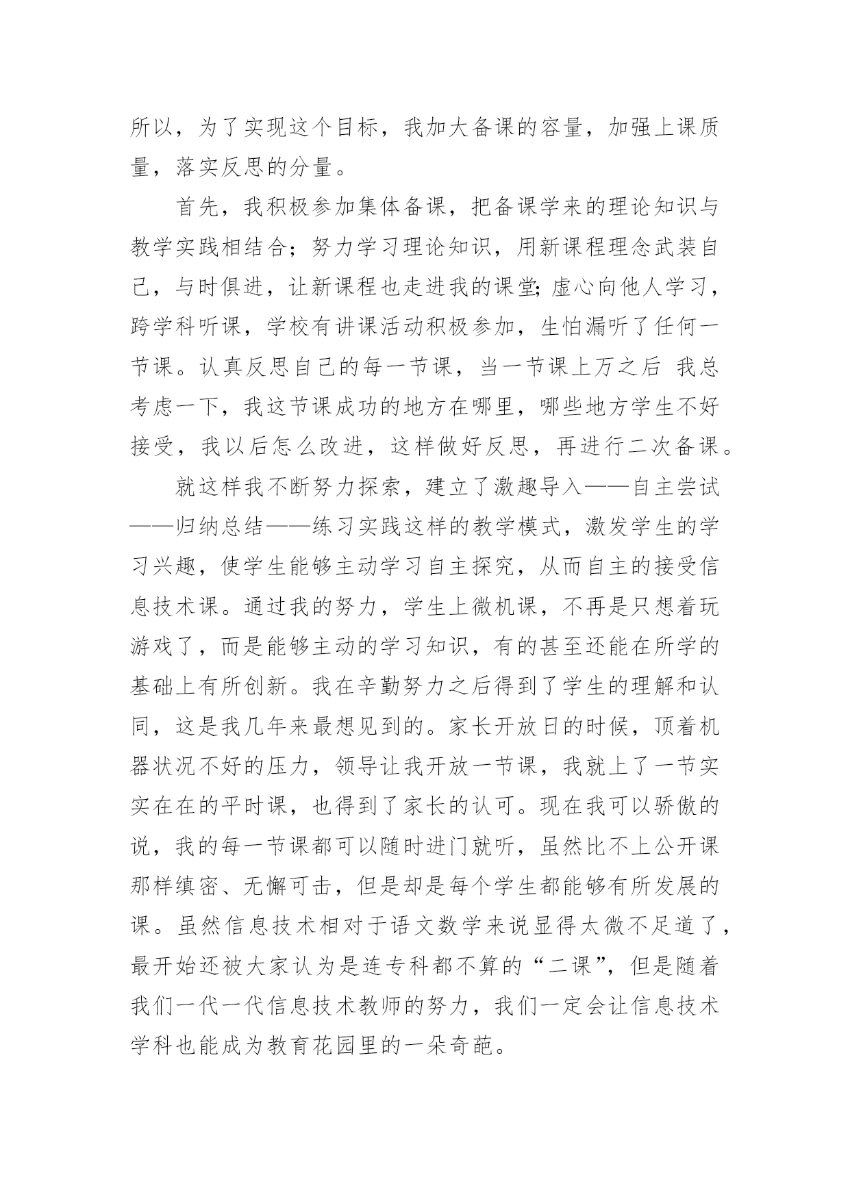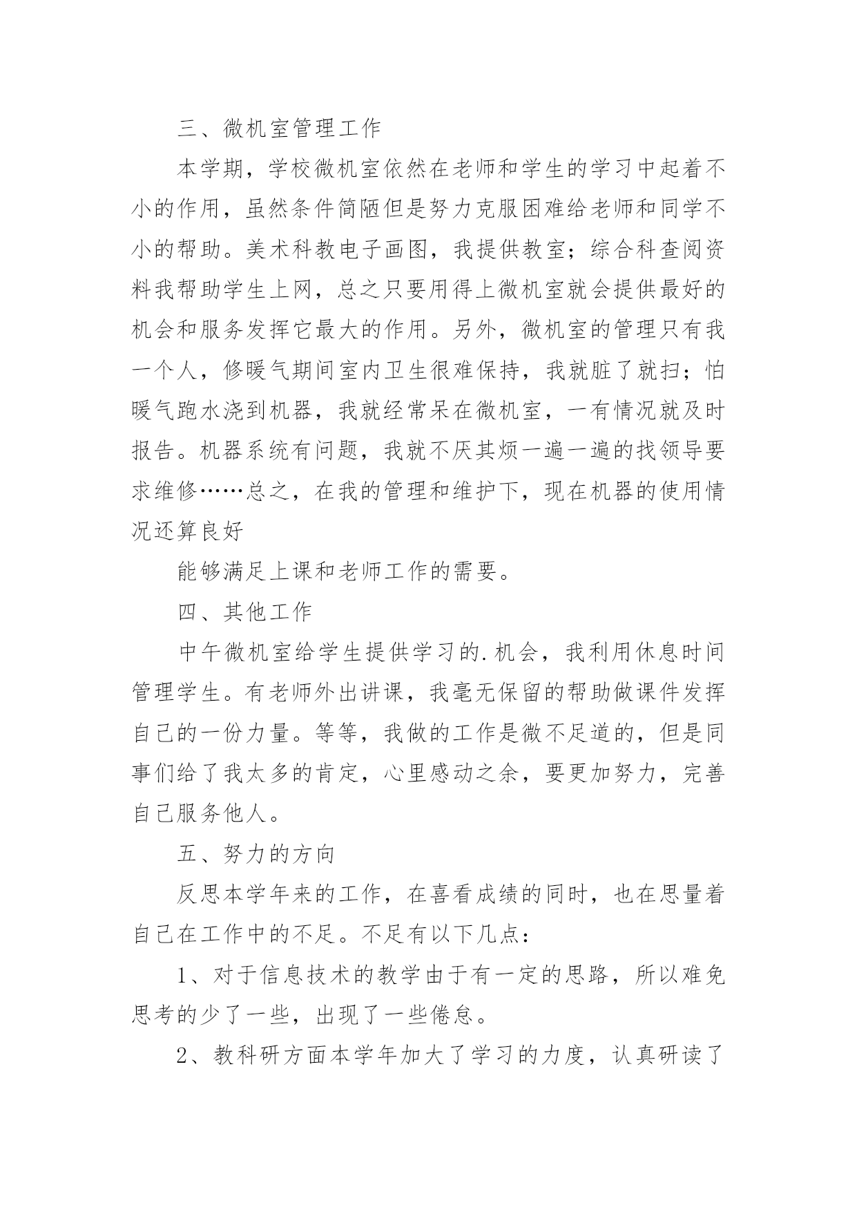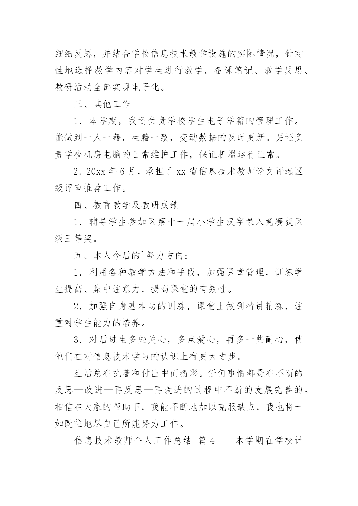 信息技术教师个人工作总结信息技术教师个人工作总结13篇总结是事后对某一时期、某一项目或某些工作进行回顾和分析,从而做出带有规律性的结论,它能帮我们理顺知识结构,突出重点,突破难点,是时候写一份总结了。如何把总结做到重点突出呢?以下是小编为大家整理的信息技术教师个人工作总结,仅供参考,欢迎大家阅读。信息技术教师个人工作总结篇1弹指一挥间,我在教师的岗位上又平凡地走过了一年。追忆往昔,这一年来的工作自己没有取得太大的成绩。但是,在同事们的帮助下,我顺利地完成了本学年的工作。展望未来,为了总结过去,扬长避短,使自己站得更高、走得更好,寄望明天的工作更为进步,现将20xx年度的工作情况总结如下:一、思想方面我在思想上严以律己,热爱党的教育事业。与老师团结合作,能够正确处理好教师之间、师生之间的关系,把他们作为自己学习的榜样。一学期来,我还积极参加各类业务学习,努力提高自己的业务水平。遵守学校各项规章制度,服从学校的各项工作安排。二、教学工作作为一个青年教师,工作几年来,我一直严格要求自己,努力钻研业务。争取上好每一节课是我一直以来奋斗的目标。所以,为了实现这个目标,我加大备课的容量,加强上课质量,落实反思的分量。首先,我积极参加集体备课,把备课学来的理论知识与教学实践相结合;努力学习理论知识,用新课程理念武装自己,与时俱进,让新课程也走进我的课堂;虚心向他人学习,跨学科听课,学校有讲课活动积极参加,生怕漏听了任何一节课。认真反思自己的每一节课,当一节课上万之后我总考虑一下,我这节课成功的地方在哪里,哪些地方学生不好接受,我以后怎么改进,这样做好反思,再进行二次备课。就这样我不断努力探索,建立了激趣导入——自主尝试——归纳总结——练习实践这样的教学模式,激发学生的学习兴趣,使学生能够主动学习自主探究,从而自主的接受信息技术课。通过我的努力,学生上微机课,不再是只想着玩游戏了,而是能够主动的学习知识,有的甚至还能在所学的基础上有所创新。我在辛勤努力之后得到了学生的理解和认同,这是我几年来最想见到的。家长开放日的时候,顶着机器状况不好的压力,领导让我开放一节课,我就上了一节实实在在的平时课,也得到了家长的认可。现在我可以骄傲的说,我的每一节课都可以随时进门就听,虽然比不上公开课那样缜密、无懈可击,但是却是每个学生都能够有所发展的课。虽然信息技术相对于语文数学来说显得太微不足道了,最开始还被大家认为是连专科都不算的“二课”,但是随着我们一代一代信息技术教师的努力,我们一定会让信息技术学科也能成为教育花园里的一朵奇葩。三、微机室管理工作本学期,学校微机室依然在老师和学生的学习中起着不小的作用,虽然条件简陋但是努力克服困难给老师和同学不小的帮助。美术科教电子画图,我提供教室;综合科查阅资料我帮助学生上网,总之只要用得上微机室就会提供最好的机会和服务发挥它最大的作用。另外,微机室的管理只有我一个人,修暖气期间室内卫生很难保持,我就脏了就扫;怕暖气跑水浇到机器,我就经常呆在微机室,一有情况就及时报告。机器系统有问题,我就不厌其烦一遍一遍的找领导要求维修……总之,在我的管理和维护下,现在机器的使用情况还算良好能够满足上课和老师工作的需要。四、其他工作中午微机室给学生提供学习的.机会,我利用休息时间管理学生。有老师外出讲课,我毫无保留的帮助做课件发挥自己的一份力量。等等,我做的工作是微不足道的,但是同事们给了我太多的肯定,心里感动之余,要更加努力,完善自己服务他人。五、努力的方向反思本学年来的工作,在喜看成绩的同时,也在思量着自己在工作中的不足。不足有以下几点:1、对于信息技术的教学由于有一定的思路,所以难免思考的少了一些,出现了一些倦怠。2、教科研方面本学年加大了学习的力度,认真研读了一些有关教科研方面的理论书籍,但在教学实践中的应用还不到位,研究做得不够细和实,没达到自己心中的目标;3、对差生多些关心,多点爱心,再多一些耐心,使他们在各方面有更大进步。以上是我本学期的工作总结,希望在以后的工作中发扬优点,弥补不足,有更大的进步。信息技术教师个人工作总结篇2弹指一挥间,我在教师的岗位上又平凡地走过了一年。追忆往昔,这一年来的工作自己没有取得太大的成绩。但是,在校领导和同事们的帮助下,我顺利地完成了本学年的工作。展望未来,为了总结过去,扬长避短,使自己站得更高、走得更好,寄望明天的工作更为进步,现将20xx年度的工作情况总结如下:一、思想方面我在思想上严以律己,热爱党的教育事业。与老师团结合作,能够正确处理好教师之间、师生之间的关系,特别尊敬老教师,把他们作为自己学习的榜样。一学期来,我还积极参加各类政治业务学习,努力提高自己的政治水平和业务水平。遵守学校各项规章制度,服从学校的各项工作安排。二、教学方面我是学校的信息技术专职教师,这学年担任了学校一