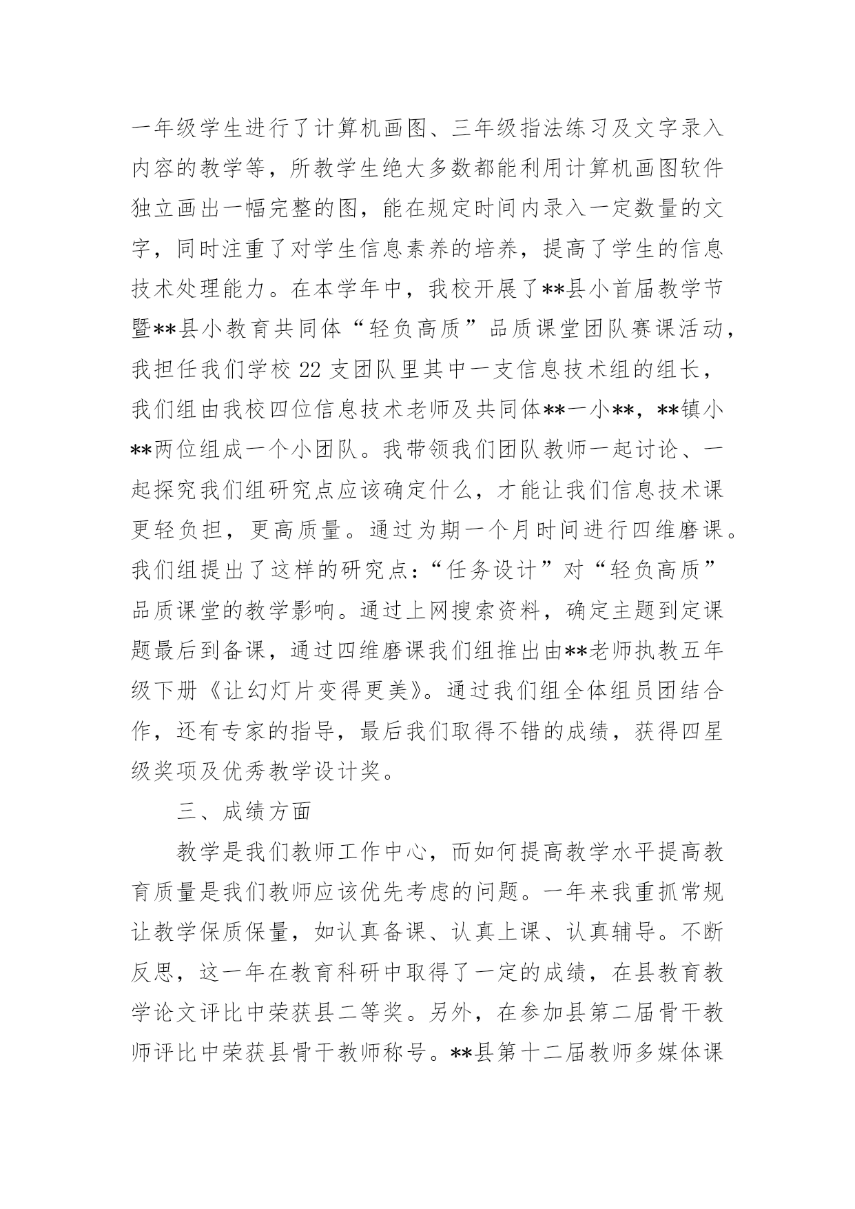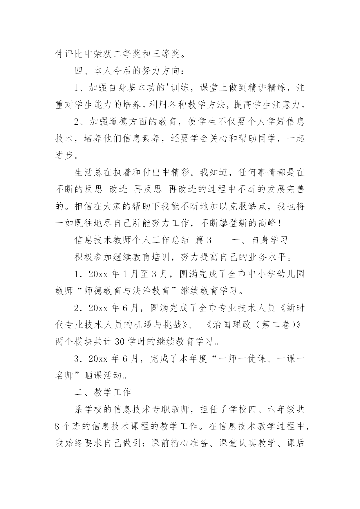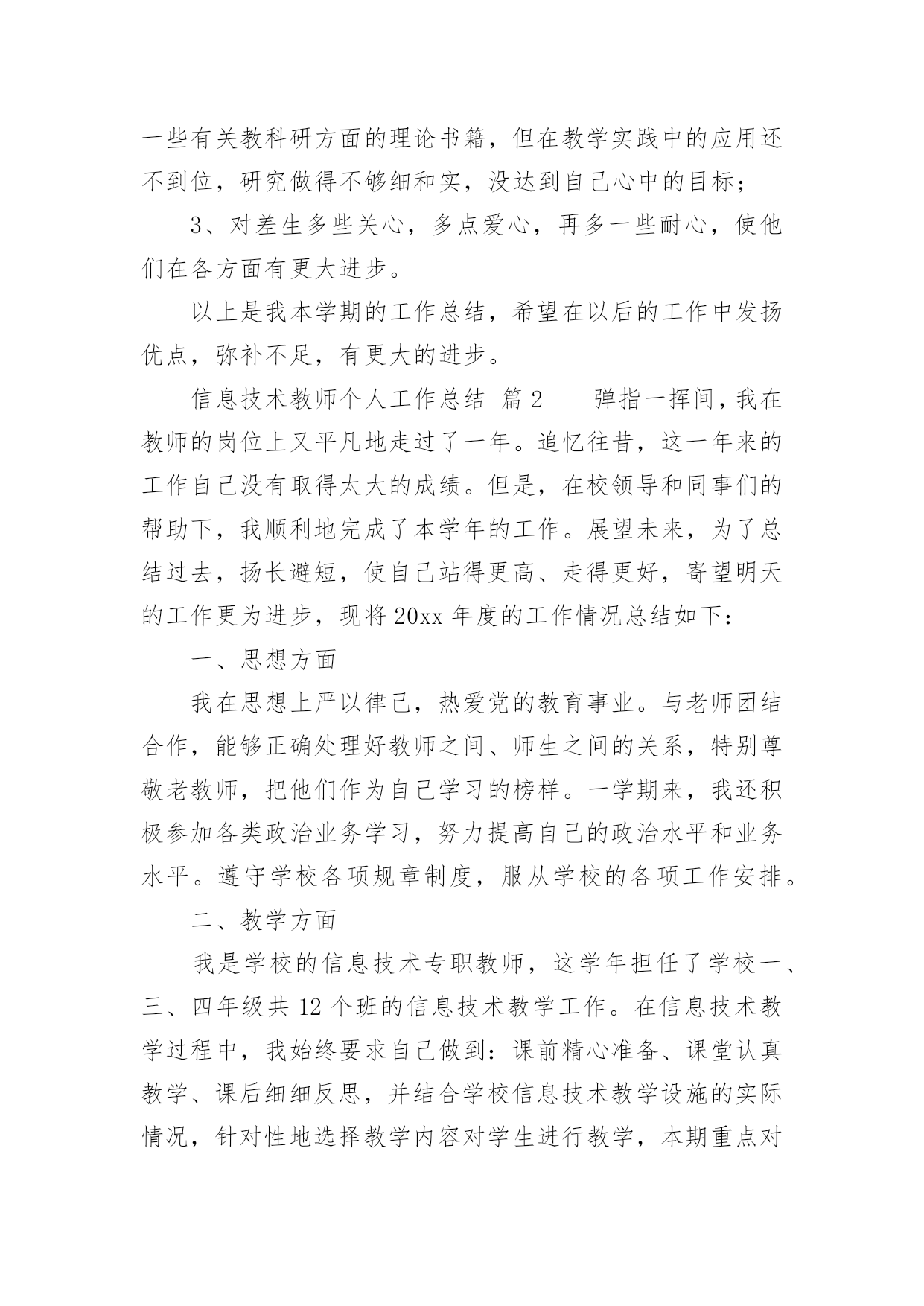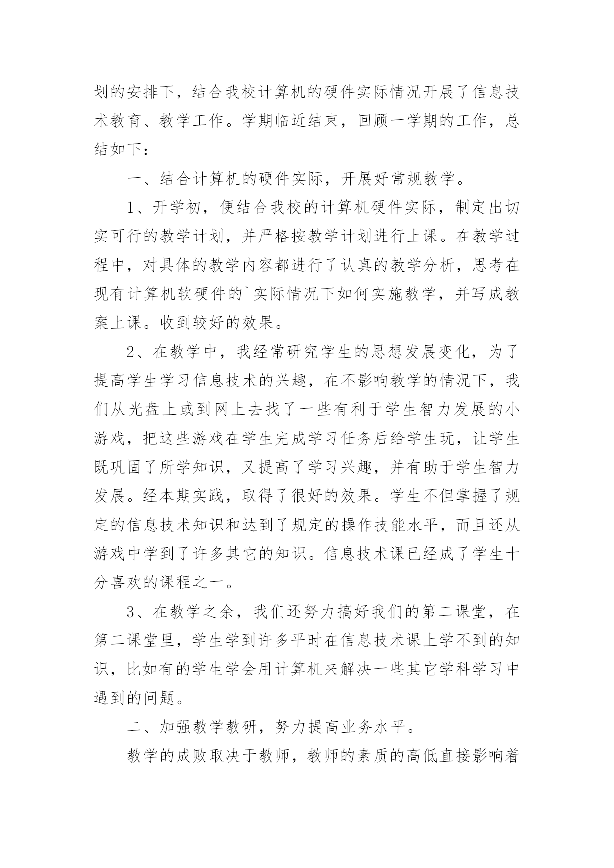 信息技术教师个人工作总结信息技术教师个人工作总结13篇总结是事后对某一时期、某一项目或某些工作进行回顾和分析,从而做出带有规律性的结论,它能帮我们理顺知识结构,突出重点,突破难点,是时候写一份总结了。如何把总结做到重点突出呢?以下是小编为大家整理的信息技术教师个人工作总结,仅供参考,欢迎大家阅读。信息技术教师个人工作总结篇1弹指一挥间,我在教师的岗位上又平凡地走过了一年。追忆往昔,这一年来的工作自己没有取得太大的成绩。但是,在同事们的帮助下,我顺利地完成了本学年的工作。展望未来,为了总结过去,扬长避短,使自己站得更高、走得更好,寄望明天的工作更为进步,现将20xx年度的工作情况总结如下:一、思想方面我在思想上严以律己,热爱党的教育事业。与老师团结合作,能够正确处理好教师之间、师生之间的关系,把他们作为自己学习的榜样。一学期来,我还积极参加各类业务学习,努力提高自己的业务水平。遵守学校各项规章制度,服从学校的各项工作安排。二、教学工作作为一个青年教师,工作几年来,我一直严格要求自己,努力钻研业务。争取上好每一节课是我一直以来奋斗的目标。所以,为了实现这个目标,我加大备课的容量,加强上课质量,落实反思的分量。首先,我积极参加集体备课,把备课学来的理论知识与教学实践相结合;努力学习理论知识,用新课程理念武装自己,与时俱进,让新课程也走进我的课堂;虚心向他人学习,跨学科听课,学校有讲课活动积极参加,生怕漏听了任何一节课。认真反思自己的每一节课,当一节课上万之后我总考虑一下,我这节课成功的地方在哪里,哪些地方学生不好接受,我以后怎么改进,这样做好反思,再进行二次备课。就这样我不断努力探索,建立了激趣导入——自主尝试——归纳总结——练习实践这样的教学模式,激发学生的学习兴趣,使学生能够主动学习自主探究,从而自主的接受信息技术课。通过我的努力,学生上微机课,不再是只想着玩游戏了,而是能够主动的学习知识,有的甚至还能在所学的基础上有所创新。我在辛勤努力之后得到了学生的理解和认同,这是我几年来最想见到的。家长开放日的时候,顶着机器状况不好的压力,领导让我开放一节课,我就上了一节实实在在的平时课,也得到了家长的认可。现在我可以骄傲的说,我的每一节课都可以随时进门就听,虽然比不上公开课那样缜密、无懈可击,但是却是每个学生都能够有所发展的课。虽然信息技术相对于语文数学来说显得太微不足道了,最开始还被大家认为是连专科都不算的“二课”,但是随着我们一代一代信息技术教师的努力,我们一定会让信息技术学科也能成为教育花园里的一朵奇葩。三、微机室管理工作本学期,学校微机室依然在老师和学生的学习中起着不小的作用,虽然条件简陋但是努力克服困难给老师和同学不小的帮助。美术科教电子画图,我提供教室;综合科查阅资料我帮助学生上网,总之只要用得上微机室就会提供最好的机会和服务发挥它最大的作用。另外,微机室的管理只有我一个人,修暖气期间室内卫生很难保持,我就脏了就扫;怕暖气跑水浇到机器,我就经常呆在微机室,一有情况就及时报告。机器系统有问题,我就不厌其烦一遍一遍的找领导要求维修……总之,在我的管理和维护下,现在机器的使用情况还算良好能够满足上课和老师工作的需要。四、其他工作中午微机室给学生提供学习的.机会,我利用休息时间管理学生。有老师外出讲课,我毫无保留的帮助做课件发挥自己的一份力量。等等,我做的工作是微不足道的,但是同事们给了我太多的肯定,心里感动之余,要更加努力,完善自己服务他人。五、努力的方向反思本学年来的工作,在喜看成绩的同时,也在思量着自己在工作中的不足。不足有以下几点:1、对于信息技术的教学由于有一定的思路,所以难免思考的少了一些,出现了一些倦怠。2、教科研方面本学年加大了学习的力度,认真研读了一些有关教科研方面的理论书籍,但在教学实践中的应用还不到位,研究做得不够细和实,没达到自己心中的目标;3、对差生多些关心,多点爱心,再多一些耐心,使他们在各方面有更大进步。以上是我本学期的工作总结,希望在以后的工作中发扬优点,弥补不足,有更大的进步。信息技术教师个人工作总结篇2弹指一挥间,我在教师的岗位上又平凡地走过了一年。追忆往昔,这一年来的工作自己没有取得太大的成绩。但是,在校领导和同事们的帮助下,我顺利地完成了本学年的工作。展望未来,为了总结过去,扬长避短,使自己站得更高、走得更好,寄望明天的工作更为进步,现将20xx年度的工作情况总结如下:一、思想方面我在思想上严以律己,热爱党的教育事业。与老师团结合作,能够正确处理好教师之间、师生之间的关系,特别尊敬老教师,把他们作为自己学习的榜样。一学期来,我还积极参加各类政治业务学习,努力提高自己的政治水平和业务水平。遵守学校各项规章制度,服从学校的各项工作安排。二、教学方面我是学校的信息技术专职教师,这学年担任了学校一