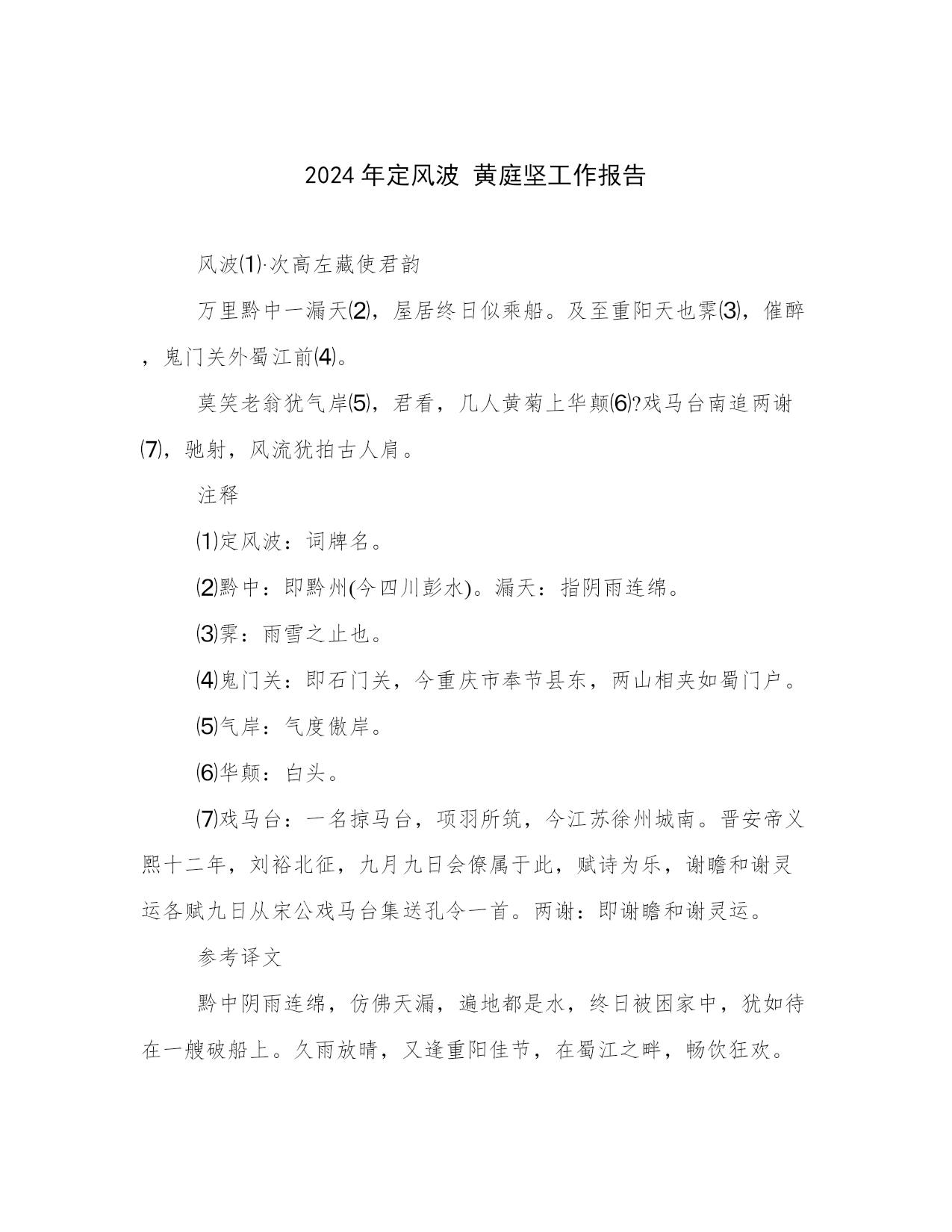 2024年定风波黄庭坚工作报告风波⑴·次高左藏使君韵万里黔中一漏天⑵,屋居终日似乘船。及至重阳天也霁⑶,催醉,鬼门关外蜀江前⑷。莫笑老翁犹气岸⑸,君看,几人黄菊上华颠⑹?戏马台南追两谢⑺,驰射,风流犹拍古人肩。注释⑴定风波:词牌名。⑵黔中:即黔州(今四川彭水)。漏天:指阴雨连绵。⑶霁:雨雪之止也。⑷鬼门关:即石门关,今重庆市奉节县东,两山相夹如蜀门户。⑸气岸:气度傲岸。⑹华颠:白头。⑺戏马台:一名掠马台,项羽所筑,今江苏徐州城南。晋安帝义熙十二年,刘裕北征,九月九日会僚属于此,赋诗为乐,谢瞻和谢灵运各赋九