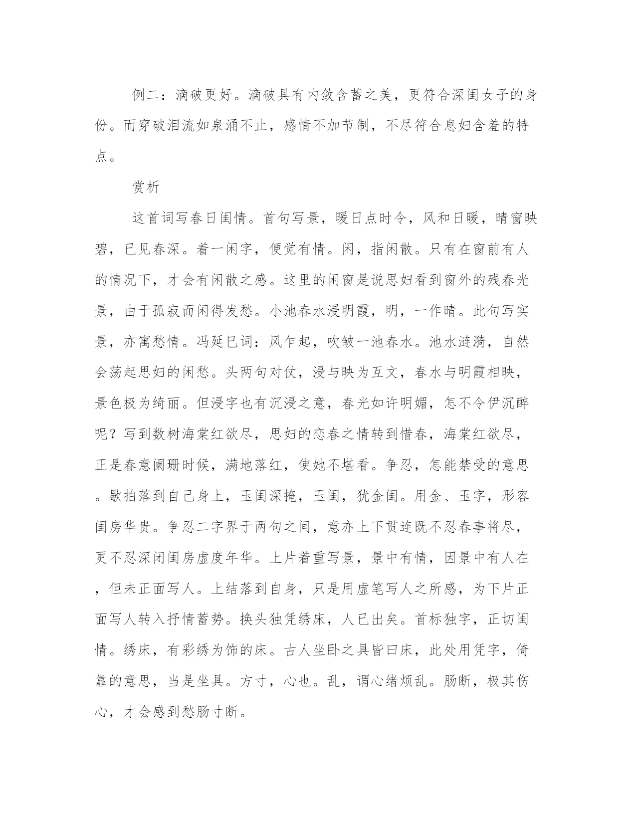 2024年定风波阅读赏析工作报告[五代]欧阳炯暖日闲窗映碧纱,小池春水浸晴霞。数树海棠红欲尽,争忍,玉闺深掩过年华。独凭绣床方寸乱,肠断,泪珠穿破脸边花。邻舍女郎相借问,音信,教人羞道未还家。1.词中女主人公方寸乱的原因有哪些?请结合全词概括分析。(4分)2.本词泪珠穿破脸边花和冯延巳香闺寂寂门半掩。愁眉敛,泪珠滴破胭脂脸,同是描写女子流泪,一用穿破,一用滴破,哪个更好?请简要赏析。(4分)参考答案1.(4分)(1)孤独寂寞:暖日闲窗映碧纱,独凭绣床。(2)惜春:数树海棠红欲尽,争忍。(3)年华虚度:玉闺