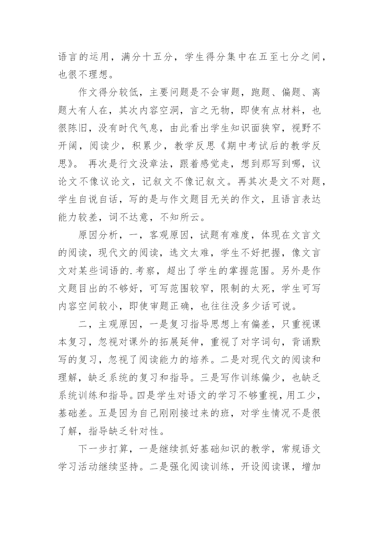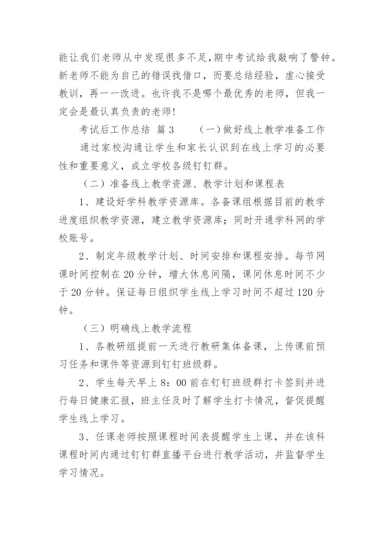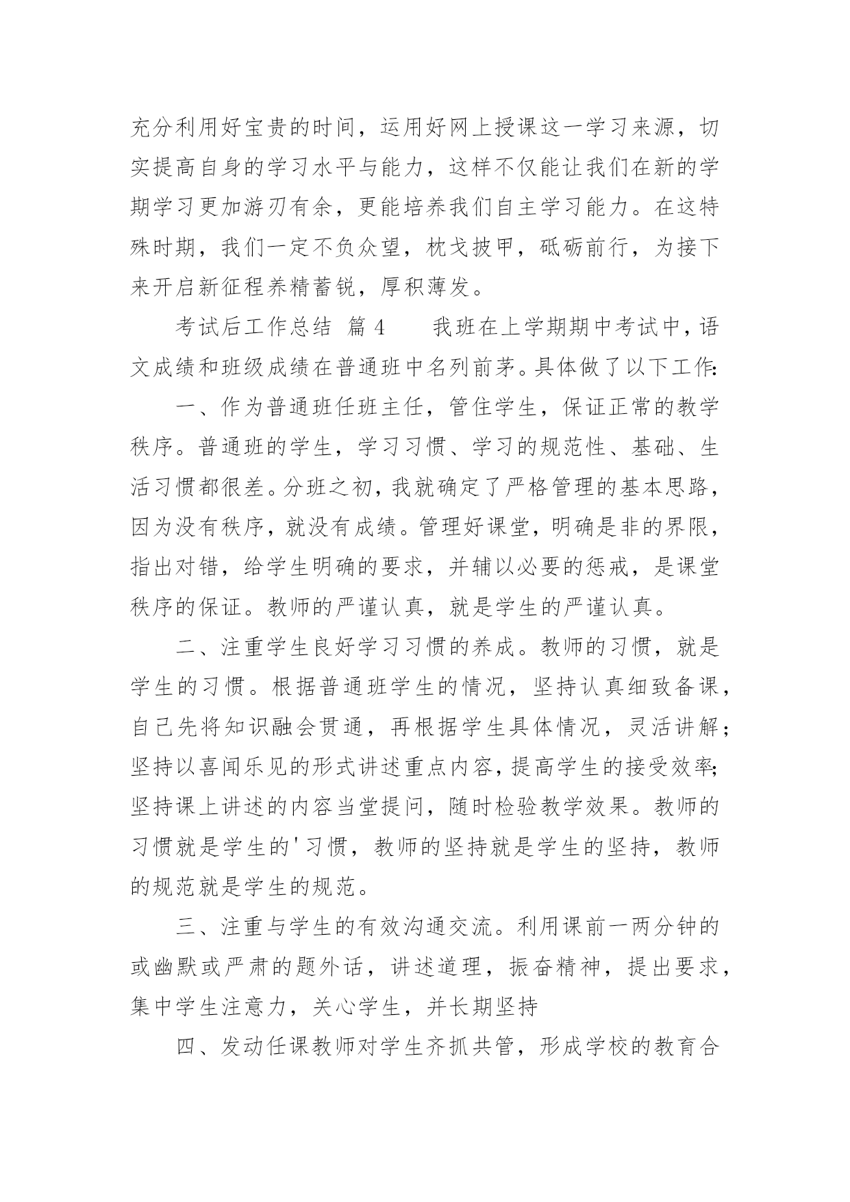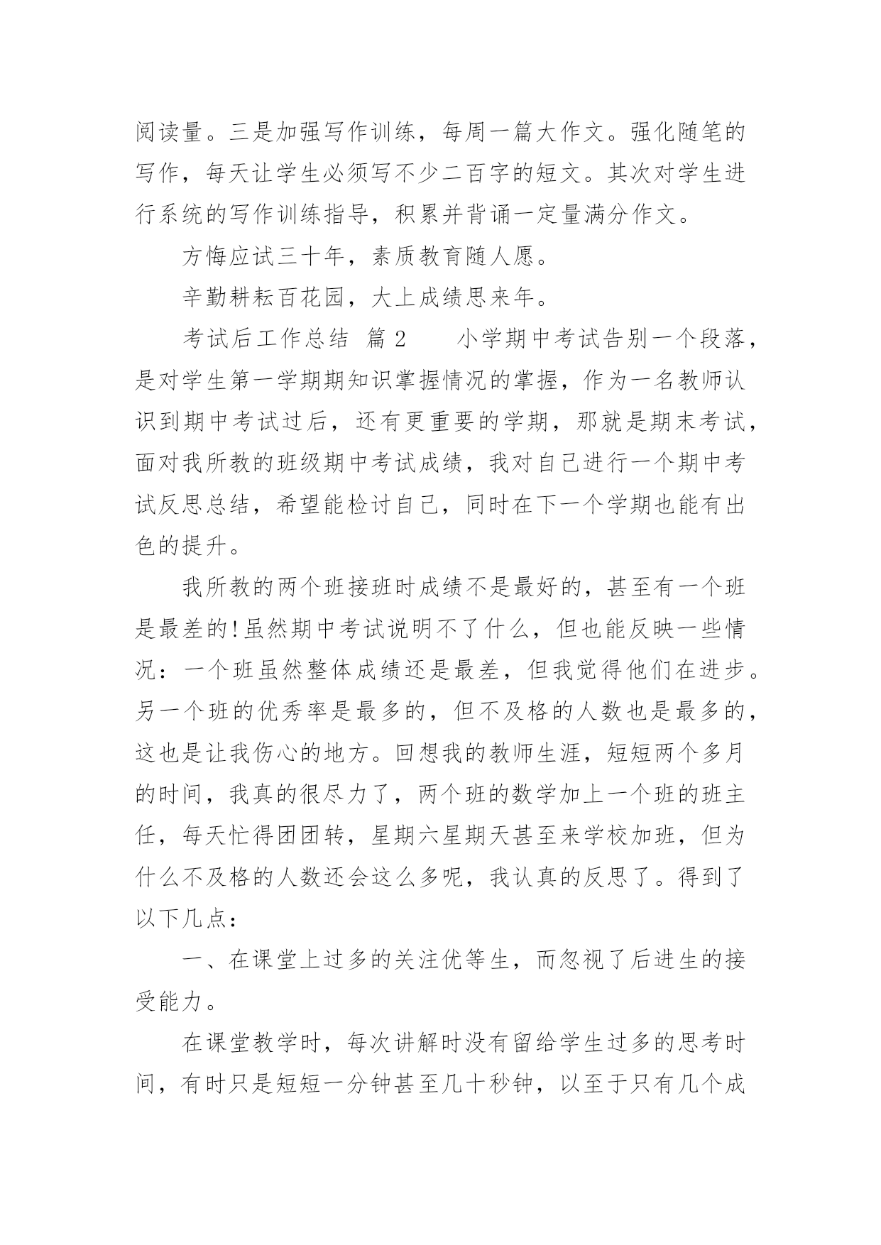 考试后工作总结考试后工作总结总结是事后对某一阶段的学习或工作情况作加以回顾检查并分析评价的书面材料,它可使零星的、肤浅的、表面的感性认知上升到全面的、系统的、本质的理性认识上来,是时候写一份总结了。你想知道总结怎么写吗?以下是小编精心整理的考试后工作总结,欢迎大家分享。考试后工作总结篇1考试结束了,成绩下发了,期中考试后的教学反思。成绩状况,与我期望的还是有不少的差距。考前和学生有个约定,本次考试结果出来以后,我不想看到有一百分以下的学生。这个目标没有实现,差距还不小,这还是以后应继续努力地的奋斗目标。这次考试,通过试卷答题情况来看,暴露了不少的问题,这让我对这两个班的学习状况有了更进一步的了解。试卷反映的情况是,现代文阅读理解,写作,语言的运用,学生得分较低。反而平时感觉较难的文言文翻译,诗歌鉴赏,名句默写,学生相对得分较高。就第二卷得分情况来看,十二班要好于十一班。但和第一卷结合之后,十一班总分却好与十二班,这说明第一卷的得分情况,十一班要好于十二班,这得力于十一班的学风好于十二班,学得扎实。现代文的阅读和理解满分十八分,学生的得分集中在五至八分之间,得分情况很差,看来学生阅读的理解能力较差。语言的运用,满分十五分,学生得分集中在五至七分之间,也很不理想。作文得分较低,主要问题是不会审题,跑题、偏题、离题大有人在,其次内容空洞,言之无物,即使有点材料,也很陈旧,没有时代气息,由此看出学生知识面狭窄,视野不开阔,阅读少,积累少,教学反思《期中考试后的教学反思》。再次是行文没章法,跟着感觉走,想到那写到哪,议论文不像议论文,记叙文不像记叙文。再其次是文不对题,学生自说自话,写的是与作文题目无关的作文,且语言表达能力较差,词不达意,不知所云。原因分析,一,客观原因,试题有难度,体现在文言文的阅读,现代文的阅读,选文太难,学生不好把握,像文言文对某些词语的.考察,超出了学生的掌握范围。另外是作文题目出的不够好,可写范围较窄,限制的太死,学生可写内容空间较小,即使审题正确,也往往没多少话可说。二,主观原因,一是复习指导思想上有偏差,只重视课本复习,忽视对课外的拓展延伸,重视了对字词句,背诵默写的复习,忽视了阅读能力的培养。二是对现代文的阅读和理解,缺乏系统的复习和指导。三是写作训练偏少,也缺乏系统训练和指导。四是学生对语文的学习不够重视,用工少,基础差。五是因为自己刚刚接过来的班,对学生情况不是很了解,指导缺乏针对性。下一步打算,一是继续抓好基础知识的教学,常规语文学习活动继续坚持。二是强化阅读训练,开设阅读课,增加阅读量。三是加强写作训练,每周一篇大作文。强化随笔的写作,每天让学生必须写不少二百字的短文。其次对学生进行系统的写作训练指导,积累并背诵一定量满分作文。方悔应试三十年,素质教育随人愿。辛勤耕耘百花园,大上成绩思来年。考试后工作总结篇2小学期中考试告别一个段落,是对学生第一学期期知识掌握情况的掌握,作为一名教师认识到期中考试过后,还有更重要的学期,那就是期末考试,面对我所教的班级期中考试成绩,我对自己进行一个期中考试反思总结,希望能检讨自己,同时在下一个学期也能有出色的提升。我所教的两个班接班时成绩不是最好的,甚至有一个班是最差的!虽然期中考试说明不了什么,但也能反映一些情况:一个班虽然整体成绩还是最差,但我觉得他们在进步。另一个班的优秀率是最多的,但不及格的人数也是最多的,这也是让我伤心的地方。回想我的教师生涯,短短两个多月的时间,我真的很尽力了,两个班的数学加上一个班的班主任,每天忙得团团转,星期六星期天甚至来学校加班,但为什么不及格的人数还会这么多呢,我认真的反思了。得到了以下几点:一、在课堂上过多的关注优等生,而忽视了后进生的接受能力。在课堂教学时,每次讲解时没有留给学生过多的思考时间,有时只是短短一分钟甚至几十秒钟,以至于只有几个成绩好反应快的同学有思路,而大多数同学还在迷茫阶段,还没有反应过来而我已经将答案告知大家。长此以往,哪些反应不快,成绩不好的同学就忘记了思考,每次问题一出来,他们就坐着发呆,或者等老师同学来告诉他们答案。脑子是越用越灵活,但我却让他们丧失了思考的时间和空间!二、课后辅导没有到位。在课堂上之后短短四十分钟的时间,班内的学生不可能全部都接受,尤其是后进生,他们最多接受40%,有的甚至不到40%,因为上课肯定会有开小差的学生。课堂上如果不注意听讲,课后就需要花2倍甚至更多的时间才能真正学会新知识。但小学生一般都贪玩,他们课后不可能全部用来学习数学,一次两次不学,慢慢地越积越多,越来成绩越差,慢慢地自己也就丧失了学好数学的信心。对于这样的学生我应该抓住课后的时间对他们进行一对一辅导,但我却忽视了这一点,这也是后进生太多的'原因之一!三、作业检查小学生自觉性差,必须要老师及时提醒。每个班都有不