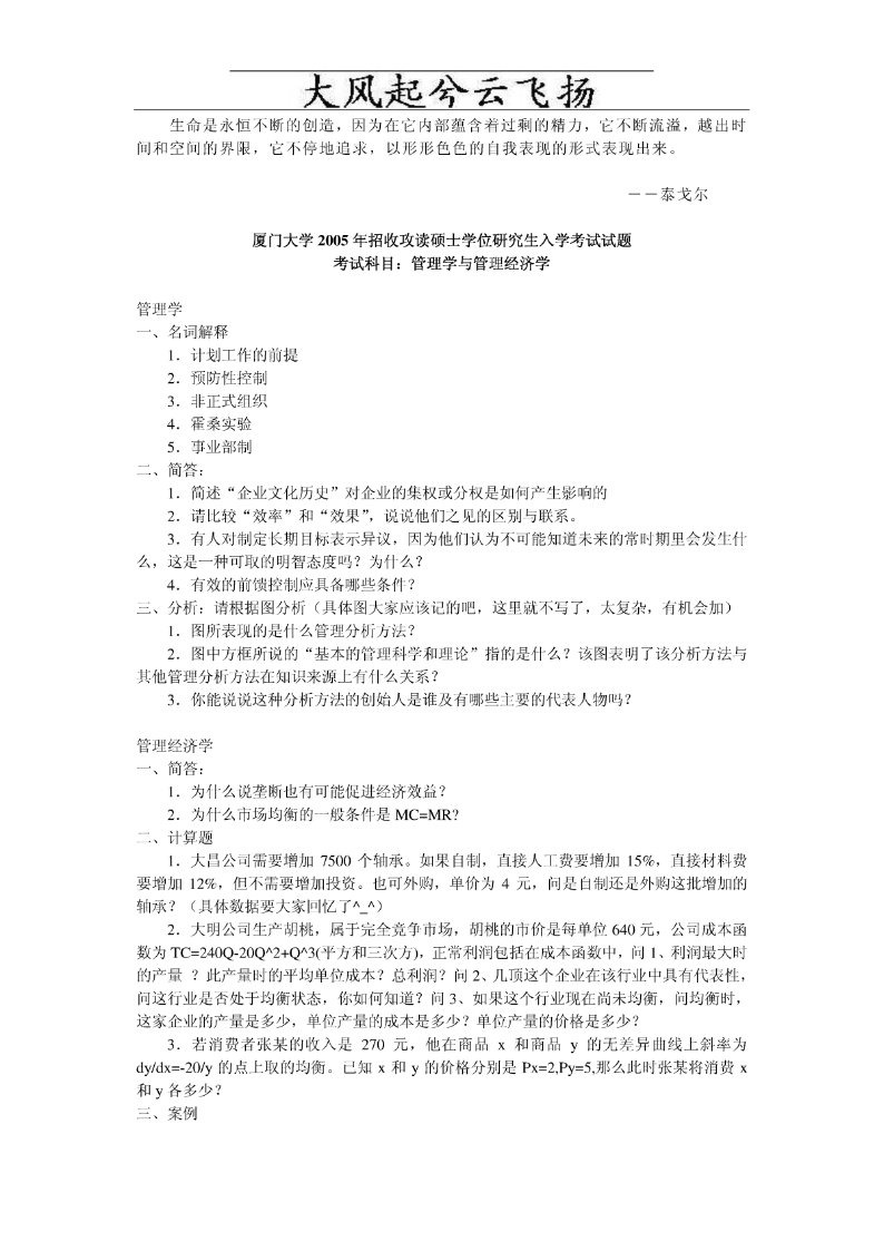 Yatfov厦门大学管理学与管理经济学2005及答案年考研试题.pdf