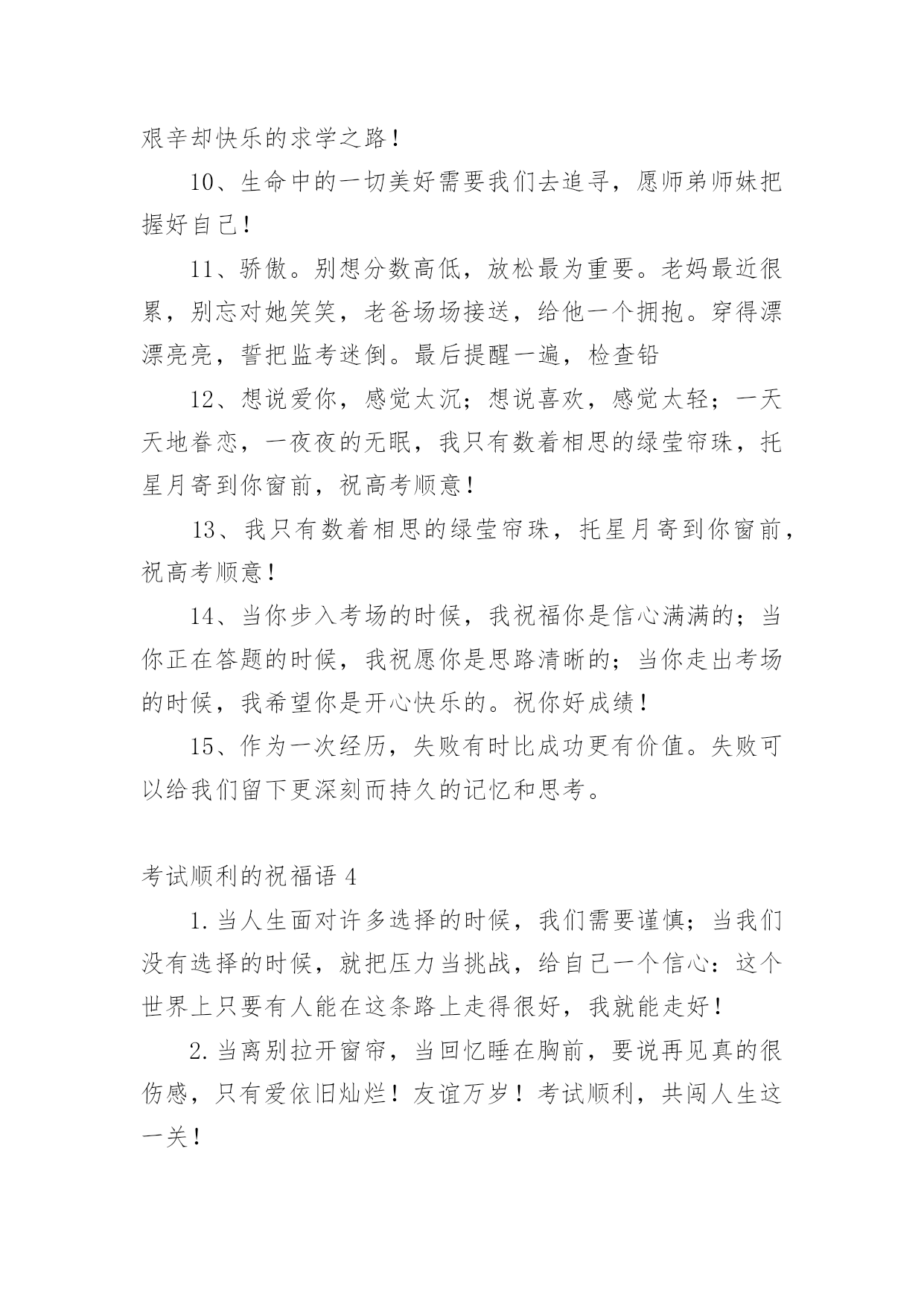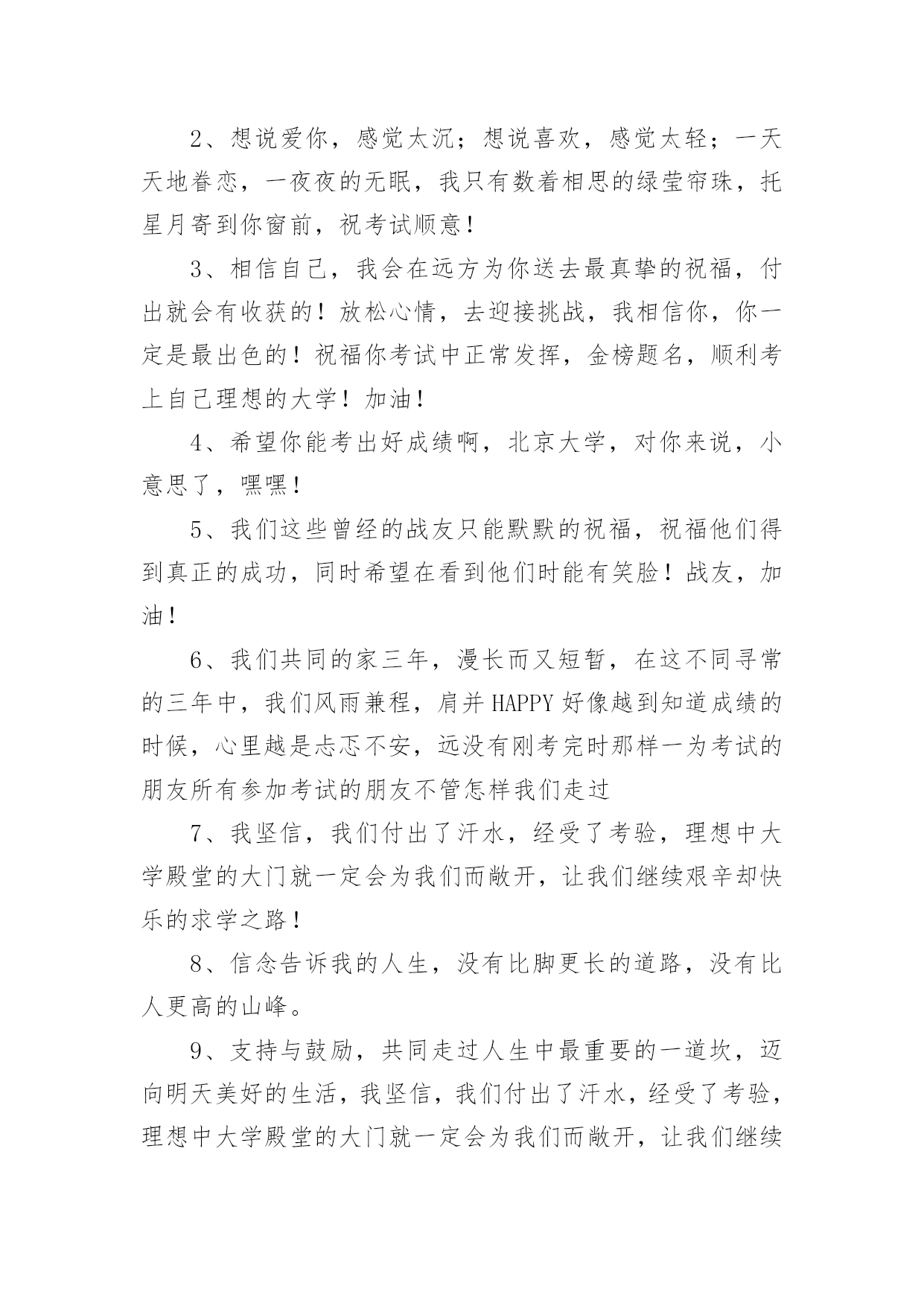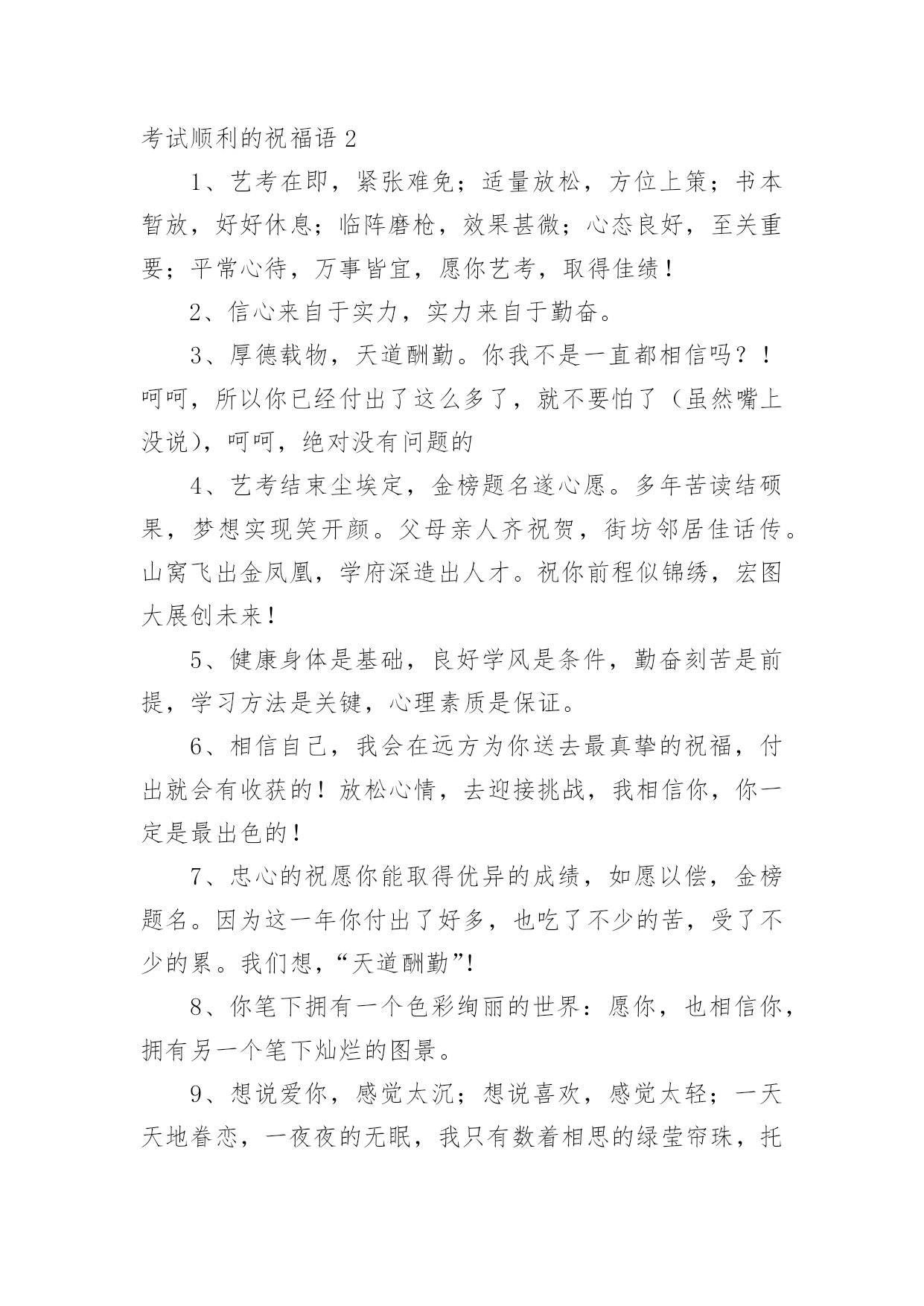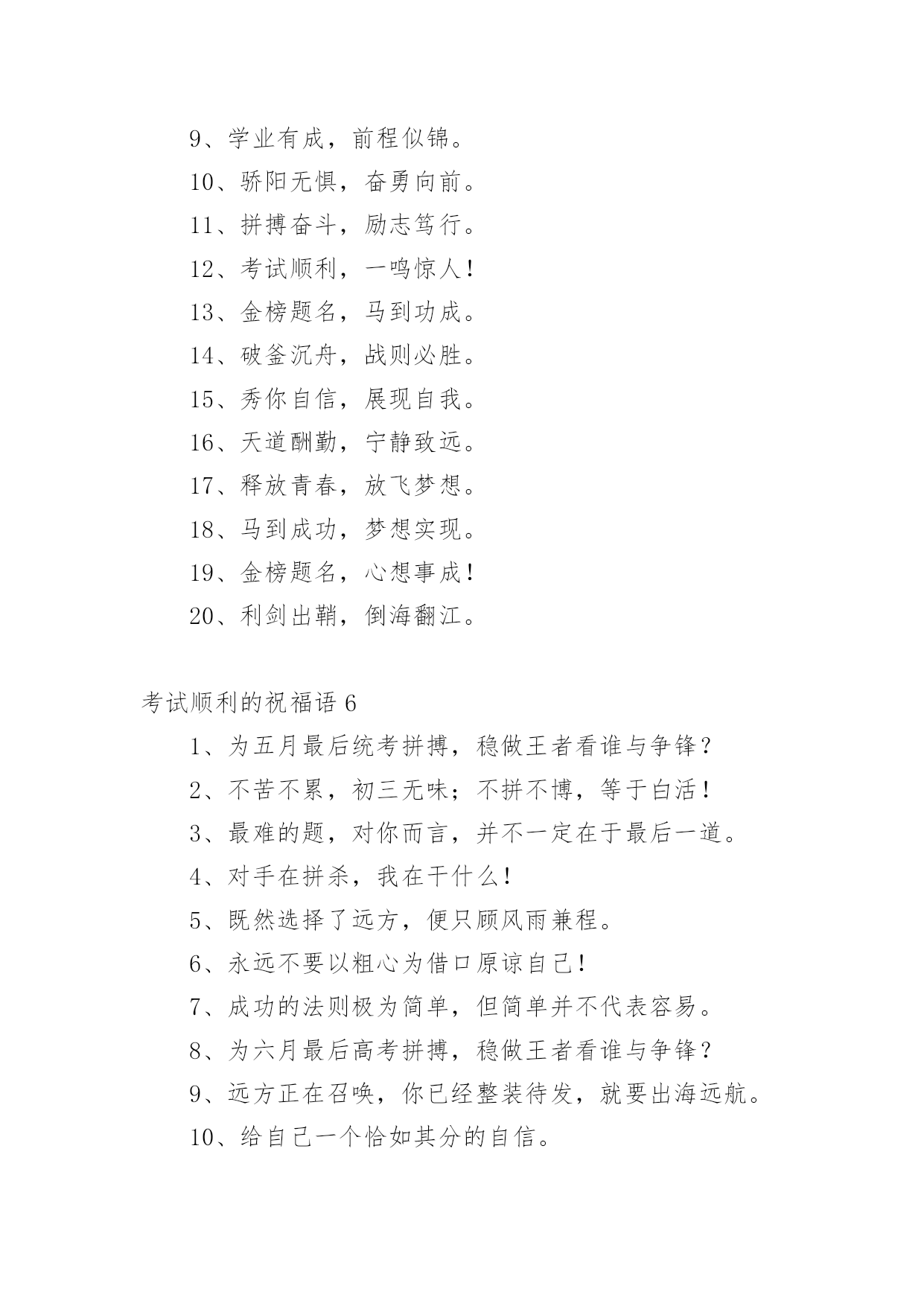 考试顺利的祝福语无论是身处学校还是步入社会,大家都写过祝福语,肯定对各类祝福语都很熟悉吧,祝福语往往灵活机动,可以随机应变。什么样的祝福语才是走心的呢?以下是小编为大家整理的考试顺利的祝福语,仅供参考,欢迎大家阅读。考试顺利的祝福语11、利剑出鞘,心想事成。2、天生我才,必有大用。3、积极进取,努力拼搏。4、仁者见仁,智者见智。5、青春飞扬,超越自我。6、沉着考试,一切顺利!7、横扫赛场,唯我称雄。8、考试顺利,战果辉煌!9、力挫群雄,舍我其谁。10、没有常胜,只有常省。11、厚德载物,天道酬勤。12、马到成功,金笔提名!13、出题全会,做题全对。14、磨练意志,强健体魄。15、扬长避短,必定成才。考试顺利的祝福语21、艺考在即,紧张难免;适量放松,方位上策;书本暂放,好好休息;临阵磨枪,效果甚微;心态良好,至关重要;平常心待,万事皆宜,愿你艺考,取得佳绩!2、信心来自于实力,实力来自于勤奋。3、厚德载物,天道酬勤。你我不是一直都相信吗?!呵呵,所以你已经付出了这么多了,就不要怕了(虽然嘴上没说),呵呵,绝对没有问题的4、艺考结束尘埃定,金榜题名遂心愿。多年苦读结硕果,梦想实现笑开颜。父母亲人齐祝贺,街坊邻居佳话传。山窝飞出金凤凰,学府深造出人才。祝你前程似锦绣,宏图大展创未来!5、健康身体是基础,良好学风是条件,勤奋刻苦是前提,学习方法是关键,心理素质是保证。6、相信自己,我会在远方为你送去最真挚的祝福,付出就会有收获的!放松心情,去迎接挑战,我相信你,你一定是最出色的!7、忠心的祝愿你能取得优异的成绩,如愿以偿,金榜题名。因为这一年你付出了好多,也吃了不少的苦,受了不少的累。我们想,“天道酬勤”!8、你笔下拥有一个色彩绚丽的世界:愿你,也相信你,拥有另一个笔下灿烂的图景。9、想说爱你,感觉太沉;想说喜欢,感觉太轻;一天天地眷恋,一夜夜的无眠,我只有数着相思的绿莹帘珠,托星月寄到你窗前,祝高考顺意!10、嗨,你还有空看短信呢?证明你没用功学习:P不过既然你看到的这条短信,我还是想把我一直想说的话告诉你:考试顺利,一起努力!11、没有了旋律,就没有了诗歌,没有了色彩,那是怎么样的生活?愿春天赋于你绚丽是色彩无限的希望美好的未来。12、风儿静静的吹动,凤凰花吐露着嫣红,亲爱的朋友请握一握手,明天就要各奔西东!但不要忘记彼此的约定:高考成功!13、试纸浸墨香,金笔下千言。思虑心平定,谨慎落笔闲。且喜平常度,切忌神慌乱。畅游题海后,金榜题君名。考试在即,祝你成功。14、快到考试的日子了,希望你干自愿事,吃顺口饭,听轻松话,睡安心觉。使自己保持良好平静的心态,不要太紧张,相信你的梦想会实现的!15、就要考试了,希望我的问候短信会为你送去一份轻松清爽的心情,不要太紧张哦!不然可会把答案忘掉的!我在这里支持着你,鼓励着你,为你祝福!考试顺利的祝福语31、眼看考试就要来了,向前看,相信自己,我会在远方为你送去最真挚的祝福,付出就会有收获的!放松心情,去迎接挑战,我相信你,你一定是最出色的!2、想说爱你,感觉太沉;想说喜欢,感觉太轻;一天天地眷恋,一夜夜的无眠,我只有数着相思的绿莹帘珠,托星月寄到你窗前,祝考试顺意!3、相信自己,我会在远方为你送去最真挚的祝福,付出就会有收获的!放松心情,去迎接挑战,我相信你,你一定是最出色的!祝福你考试中正常发挥,金榜题名,顺利考上自己理想的大学!加油!4、希望你能考出好成绩啊,北京大学,对你来说,小意思了,嘿嘿!5、我们这些曾经的战友只能默默的祝福,祝福他们得到真正的成功,同时希望在看到他们时能有笑脸!战友,加油!6、我们共同的家三年,漫长而又短暂,在这不同寻常的三年中,我们风雨兼程,肩并HAPPY好像越到知道成绩的时候,心里越是忐忑不安,远没有刚考完时那样一为考试的朋友所有参加考试的朋友不管怎样我们走过7、我坚信,我们付出了汗水,经受了考验,理想中大学殿堂的大门就一定会为我们而敞开,让我们继续艰辛却快乐的求学之路!8、信念告诉我的人生,没有比脚更长的道路,没有比人更高的山峰。9、支持与鼓励,共同走过人生中最重要的一道坎,迈向明天美好的生活,我坚信,我们付出了汗水,经受了考验,理想中大学殿堂的大门就一定会为我们而敞开,让我们继续艰辛却快乐的求学之路!10、生命中的一切美好需要我们去追寻,愿师弟师妹把握好自己!11、骄傲。别想分数高低,放松最为重要。老妈最近很累,别忘对她笑笑,老爸场场接送,给他一个拥抱。穿得漂漂亮亮,誓把监考迷倒。最后提醒一遍,检查铅12、想说爱你,感觉太沉;想说喜欢,感觉太轻;一天天地眷恋,一夜夜的无眠,我只有数着相思的绿莹帘珠,托星月寄到你窗前,祝高考顺意!13、我只有数着相思的绿莹帘珠,托星月寄到你窗前,祝高考顺意!14、当你步入考场的时候,我祝福你是信心满满的;当你正在答题的时