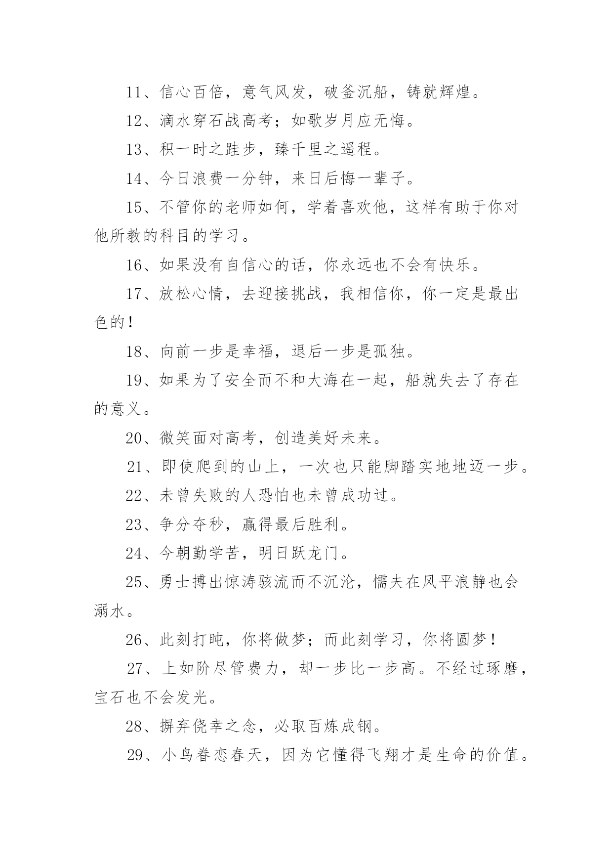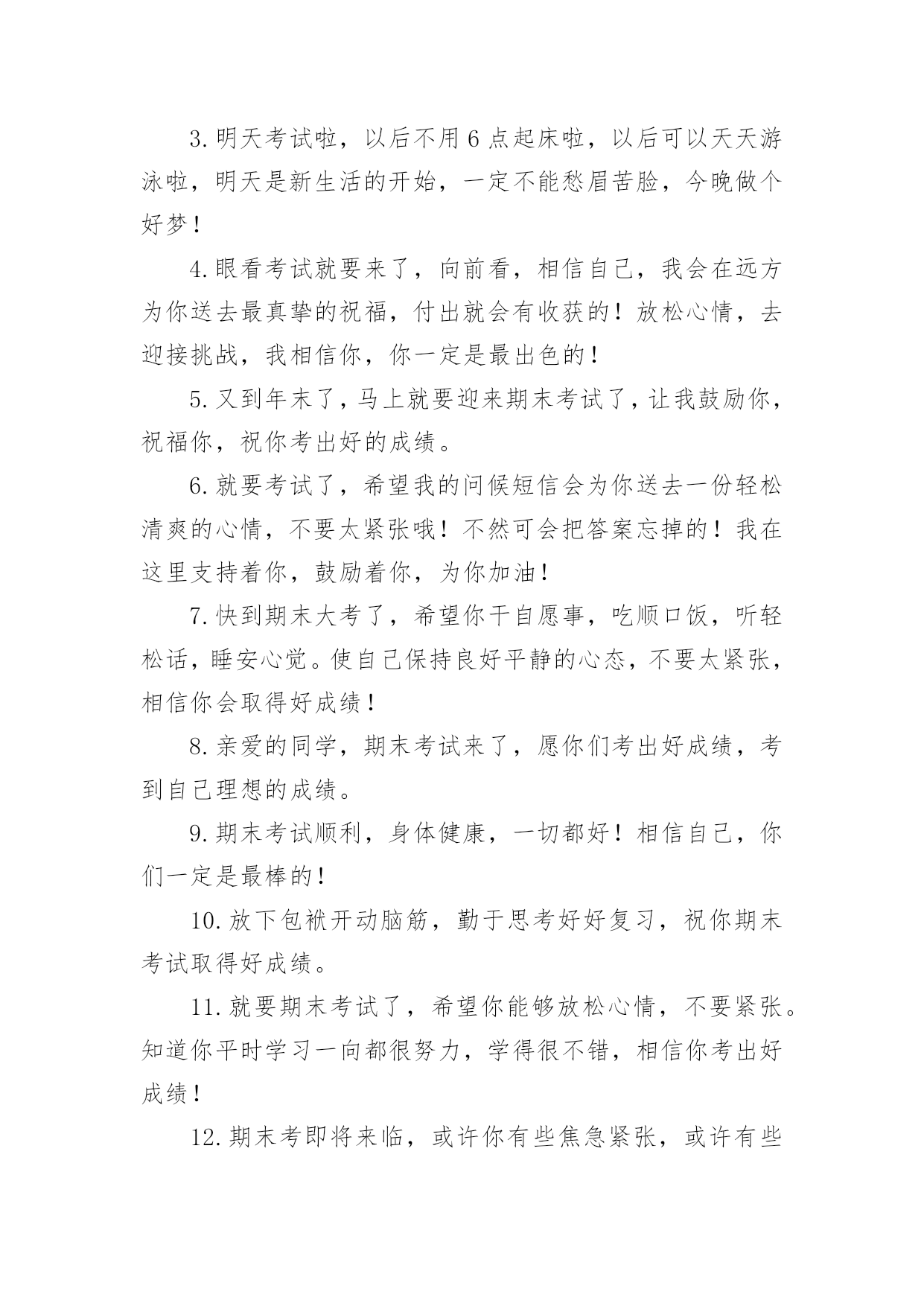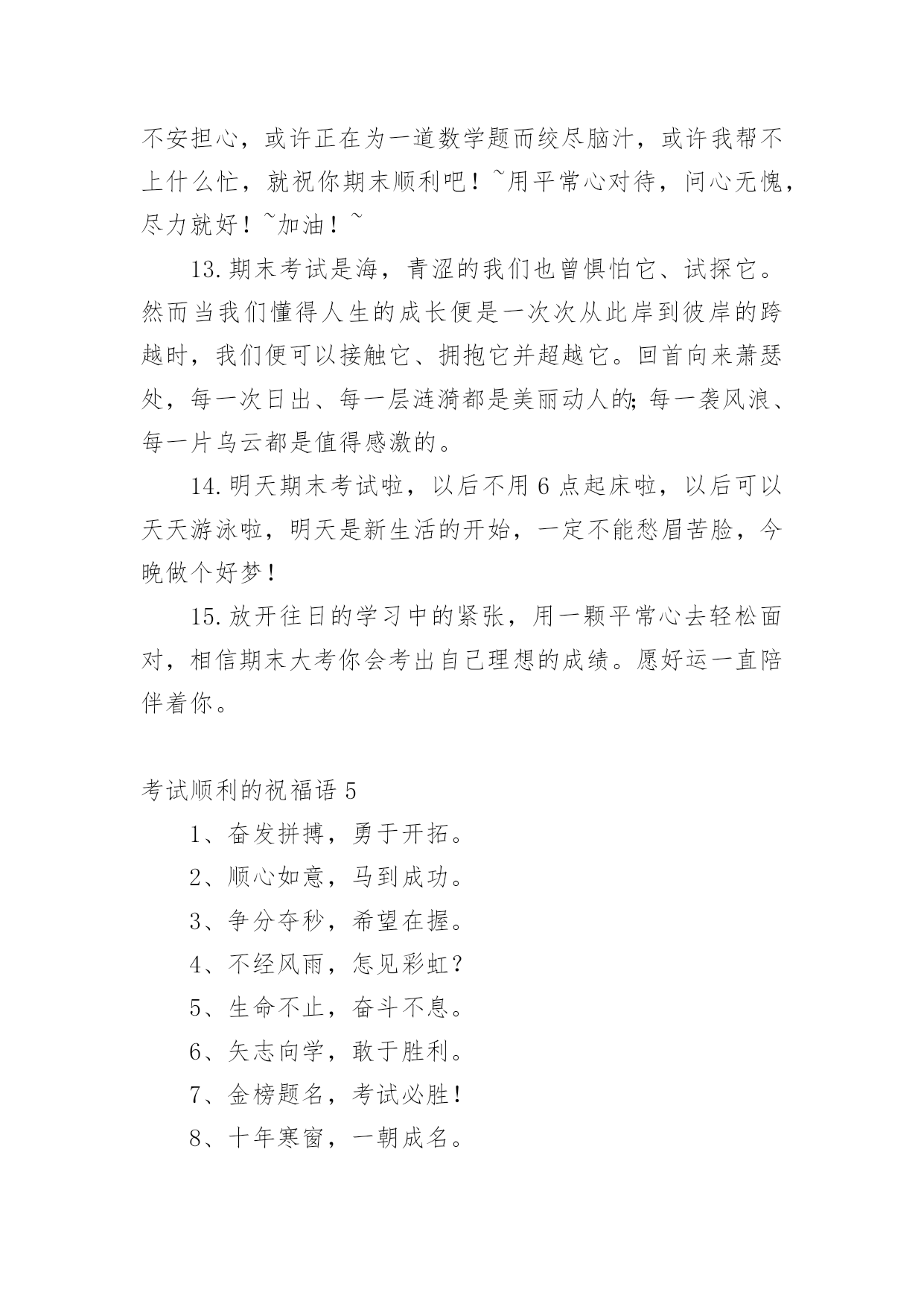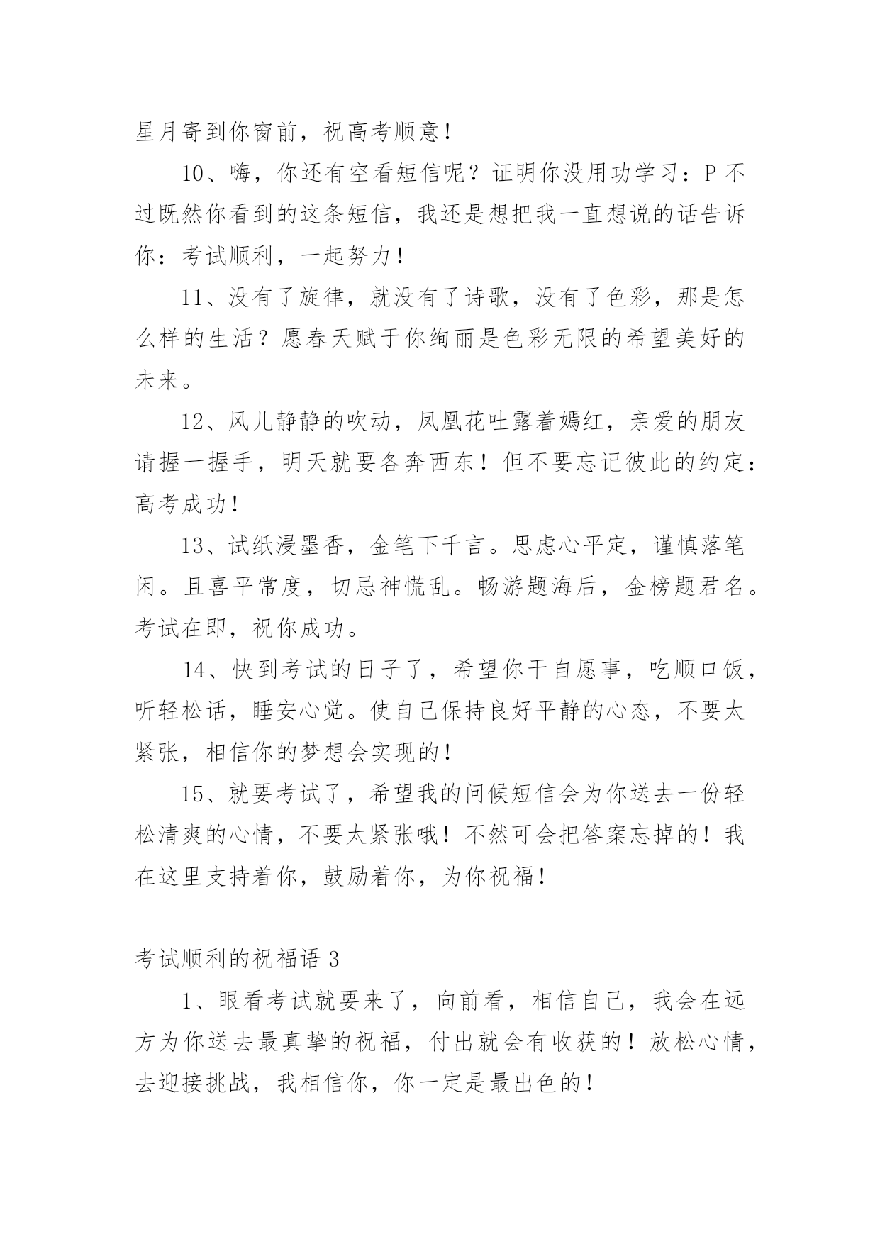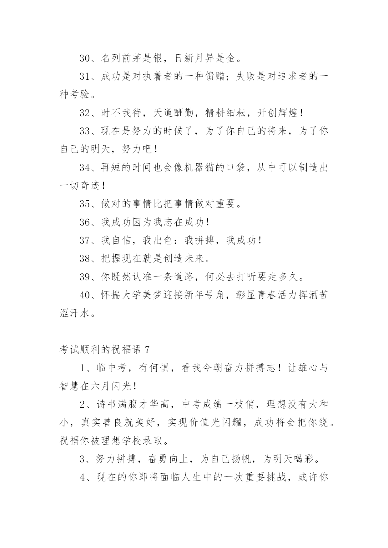 考试顺利的祝福语无论是身处学校还是步入社会,大家都写过祝福语,肯定对各类祝福语都很熟悉吧,祝福语往往灵活机动,可以随机应变。什么样的祝福语才是走心的呢?以下是小编为大家整理的考试顺利的祝福语,仅供参考,欢迎大家阅读。考试顺利的祝福语11、利剑出鞘,心想事成。2、天生我才,必有大用。3、积极进取,努力拼搏。4、仁者见仁,智者见智。5、青春飞扬,超越自我。6、沉着考试,一切顺利!7、横扫赛场,唯我称雄。8、考试顺利,战果辉煌!9、力挫群雄,舍我其谁。10、没有常胜,只有常省。11、厚德载物,天道酬勤。12、马到成功,金笔提名!13、出题全会,做题全对。14、磨练意志,强健体魄。15、扬长避短,必定成才。考试顺利的祝福语21、艺考在即,紧张难免;适量放松,方位上策;书本暂放,好好休息;临阵磨枪,效果甚微;心态良好,至关重要;平常心待,万事皆宜,愿你艺考,取得佳绩!2、信心来自于实力,实力来自于勤奋。3、厚德载物,天道酬勤。你我不是一直都相信吗?!呵呵,所以你已经付出了这么多了,就不要怕了(虽然嘴上没说),呵呵,绝对没有问题的4、艺考结束尘埃定,金榜题名遂心愿。多年苦读结硕果,梦想实现笑开颜。父母亲人齐祝贺,街坊邻居佳话传。山窝飞出金凤凰,学府深造出人才。祝你前程似锦绣,宏图大展创未来!5、健康身体是基础,良好学风是条件,勤奋刻苦是前提,学习方法是关键,心理素质是保证。6、相信自己,我会在远方为你送去最真挚的祝福,付出就会有收获的!放松心情,去迎接挑战,我相信你,你一定是最出色的!7、忠心的祝愿你能取得优异的成绩,如愿以偿,金榜题名。因为这一年你付出了好多,也吃了不少的苦,受了不少的累。我们想,“天道酬勤”!8、你笔下拥有一个色彩绚丽的世界:愿你,也相信你,拥有另一个笔下灿烂的图景。9、想说爱你,感觉太沉;想说喜欢,感觉太轻;一天天地眷恋,一夜夜的无眠,我只有数着相思的绿莹帘珠,托星月寄到你窗前,祝高考顺意!10、嗨,你还有空看短信呢?证明你没用功学习:P不过既然你看到的这条短信,我还是想把我一直想说的话告诉你:考试顺利,一起努力!11、没有了旋律,就没有了诗歌,没有了色彩,那是怎么样的生活?愿春天赋于你绚丽是色彩无限的希望美好的未来。12、风儿静静的吹动,凤凰花吐露着嫣红,亲爱的朋友请握一握手,明天就要各奔西东!但不要忘记彼此的约定:高考成功!13、试纸浸墨香,金笔下千言。思虑心平定,谨慎落笔闲。且喜平常度,切忌神慌乱。畅游题海后,金榜题君名。考试在即,祝你成功。14、快到考试的日子了,希望你干自愿事,吃顺口饭,听轻松话,睡安心觉。使自己保持良好平静的心态,不要太紧张,相信你的梦想会实现的!15、就要考试了,希望我的问候短信会为你送去一份轻松清爽的心情,不要太紧张哦!不然可会把答案忘掉的!我在这里支持着你,鼓励着你,为你祝福!考试顺利的祝福语31、眼看考试就要来了,向前看,相信自己,我会在远方为你送去最真挚的祝福,付出就会有收获的!放松心情,去迎接挑战,我相信你,你一定是最出色的!2、想说爱你,感觉太沉;想说喜欢,感觉太轻;一天天地眷恋,一夜夜的无眠,我只有数着相思的绿莹帘珠,托星月寄到你窗前,祝考试顺意!3、相信自己,我会在远方为你送去最真挚的祝福,付出就会有收获的!放松心情,去迎接挑战,我相信你,你一定是最出色的!祝福你考试中正常发挥,金榜题名,顺利考上自己理想的大学!加油!4、希望你能考出好成绩啊,北京大学,对你来说,小意思了,嘿嘿!5、我们这些曾经的战友只能默默的祝福,祝福他们得到真正的成功,同时希望在看到他们时能有笑脸!战友,加油!6、我们共同的家三年,漫长而又短暂,在这不同寻常的三年中,我们风雨兼程,肩并HAPPY好像越到知道成绩的时候,心里越是忐忑不安,远没有刚考完时那样一为考试的朋友所有参加考试的朋友不管怎样我们走过7、我坚信,我们付出了汗水,经受了考验,理想中大学殿堂的大门就一定会为我们而敞开,让我们继续艰辛却快乐的求学之路!8、信念告诉我的人生,没有比脚更长的道路,没有比人更高的山峰。9、支持与鼓励,共同走过人生中最重要的一道坎,迈向明天美好的生活,我坚信,我们付出了汗水,经受了考验,理想中大学殿堂的大门就一定会为我们而敞开,让我们继续艰辛却快乐的求学之路!10、生命中的一切美好需要我们去追寻,愿师弟师妹把握好自己!11、骄傲。别想分数高低,放松最为重要。老妈最近很累,别忘对她笑笑,老爸场场接送,给他一个拥抱。穿得漂漂亮亮,誓把监考迷倒。最后提醒一遍,检查铅12、想说爱你,感觉太沉;想说喜欢,感觉太轻;一天天地眷恋,一夜夜的无眠,我只有数着相思的绿莹帘珠,托星月寄到你窗前,祝高考顺意!13、我只有数着相思的绿莹帘珠,托星月寄到你窗前,祝高考顺意!14、当你步入考场的时候,我祝福你是信心满满的;当你正在答题的时