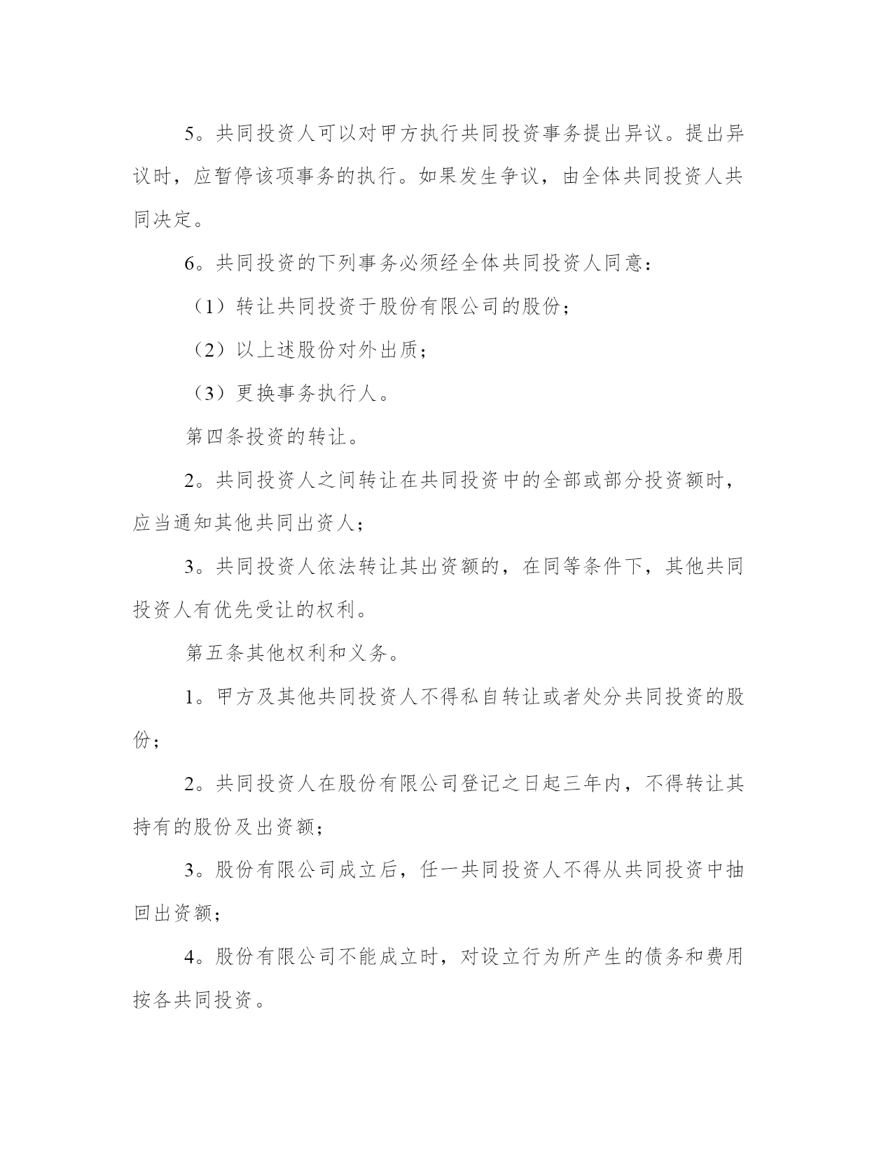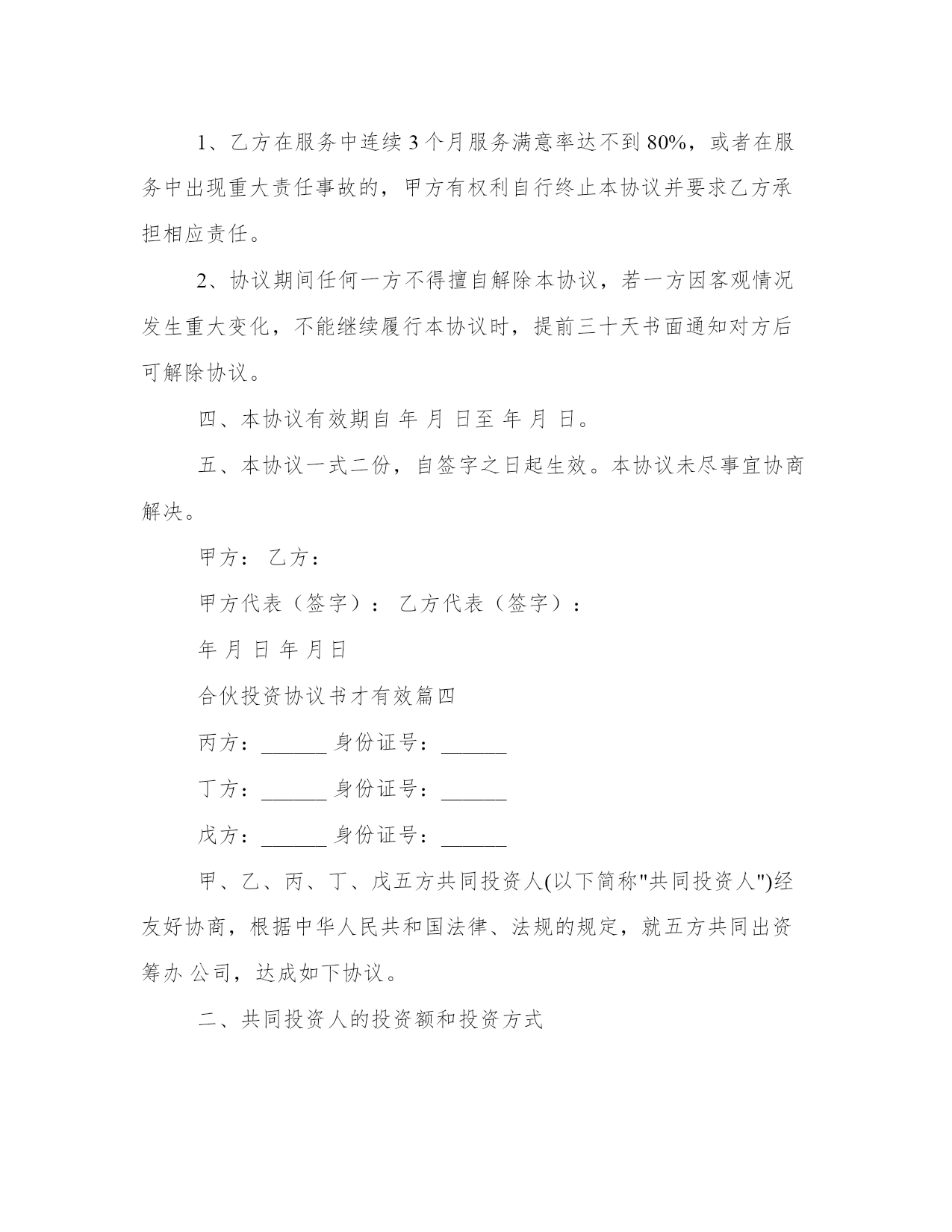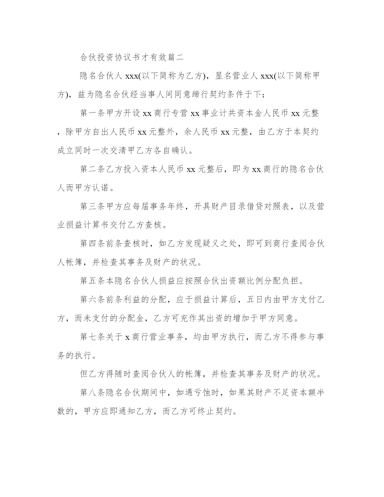 合伙投资协议书才有效(精选13篇)每个人都曾试图在平淡的学习、工作和生活中写一篇文章。写作是培养人的观察、联想、想象、思维和记忆的重要手段。范文书写有哪些要求呢?我们怎样才能写好一篇范文呢?接下来小编就给大家介绍一下优秀的范文该怎么写,我们一起来看一看吧。合伙投资协议书才有效篇一甲方:身份证号:籍贯:乙方:身份证号:籍贯:丙方:身份证号:籍贯:丁方:身份证号:籍贯:以上各方共同投资人(以下简称“共同投资人”)经友好协商,根据中华人民共和国法律、法规的规定,双方本着互惠互利的原则,就甲乙双方合作投资混凝土有限公司项目事宜达成如下协议,以共同遵守。第一条共同投资人的投资额和投资方式。甲、乙、丙、丁、四方同意,以四方已注册成立的罗城县翔翼混凝土有限责任公司(以下简称公司)为项目投资主体。各方出资分别:甲方出资万元(元)占出资总额的43%;乙方出资万元(元)占出资总额的43%,丙方出资万元(元)占出资总额的7%,丁方出资万元(元)占出资总额的7%;。第二条利润分享和亏损分担。共同投资人按其出资额占出资总额的比例分享共同投资的利润,分担共同投资的亏损。共同投资人各自以其出资额为限对共同投资承担责任,共同投资人以其出资总额为限对股份有限公司承担责任。共同投资人的出资形成的股份及其孳生物为共同投资人的共有财产,由共同投资人按其出资比例共有。共同投资于股份有限公司的股份转让后,各共同投资人有权按其出资比例取得财产。第三条事务执行。1。共同投资人委托甲方代表全体共同投资人执行共同投资的日常事务:(1)在股份公司发起设立阶段,行使及履行作为股份有限公司发起人的权利和。义务;(2)在股份公司成立后,行使其作为股份公司股东的权利、履行相应义务;(3)收集共同投资所产生的孳息,并按照本协议有关规定处置;5。共同投资人可以对甲方执行共同投资事务提出异议。提出异议时,应暂停该项事务的执行。如果发生争议,由全体共同投资人共同决定。6。共同投资的下列事务必须经全体共同投资人同意:(1)转让共同投资于股份有限公司的股份;(2)以上述股份对外出质;(3)更换事务执行人。第四条投资的转让。2。共同投资人之间转让在共同投资中的全部或部分投资额时,应当通知其他共同出资人;3。共同投资人依法转让其出资额的,在同等条件下,其他共同投资人有优先受让的权利。第五条其他权利和义务。1。甲方及其他共同投资人不得私自转让或者处分共同投资的股份;2。共同投资人在股份有限公司登记之日起三年内,不得转让其持有的股份及出资额;3。股份有限公司成立后,任一共同投资人不得从共同投资中抽回出资额;4。股份有限公司不能成立时,对设立行为所产生的债务和费用按各共同投资。人的出资比例分担。第六条违约责任。为保证本协议的实际履行,甲方自愿提供其所有的向其他共同投资人提供担保。甲方承诺在其违约并造成其他共同投资人损失的情况下,以上述财产向其他共同投资人承担违约责任。第七条其他。1。本协议未尽事宜由共同投资人协商一致后,另行签订补充协议。2。本协议经全体共同投资人签字盖章后即生效。本协议一式_______份,共同投资人各执一份。甲方(签字):_________。乙方(签字):_________。_______年____月____日日。签订地点:_________。签订地点:_________。丙方(签字):_________。丁方(签字):_________。_______年____月____日。_______年____月____日。签订地点:_________。签订地点:_________。合伙投资协议书才有效篇二隐名合伙人xxx(以下简称为乙方),显名营业人xxx(以下简称甲方),兹为隐名合伙经当事人间同意缔行契约条件于下:第一条甲方开设xx商行专营xx事业计共资本金人民币xx元整,除甲方自出人民币xx元整外,余人民币xx元整,由乙方于本契约成立同时一次交清甲乙方各自确认。第二条乙方投入资本人民币xx元整后,即为xx商行的隐名合伙人而甲方认诺。第三条甲方应每届事务年终,开具财产目录借贷对照表,以及营业损益计算书交付乙方查核。第四条前条查核时,如乙方发现疑义之处,即可到商行查阅合伙人帐簿,并检查其事务及财产的状况。第五条本隐名合伙人损益应按照合伙出资额比例分配负担。第六条前条利益的分配,应于损益计算后,五日内由甲方支付乙方,而未支付的分配金,乙方可充作其出资的增加于甲方同意。第七条关于x商行营业事务,均由甲方执行,而乙方不得参与事务的执行。但乙方得随时查阅合伙人的帐簿,并检查其事务及财产的状况。第八条隐名合伙期间中,如遇亏蚀时,如果其财产不足资本额半数的,甲方应即通知乙方,而乙方可终