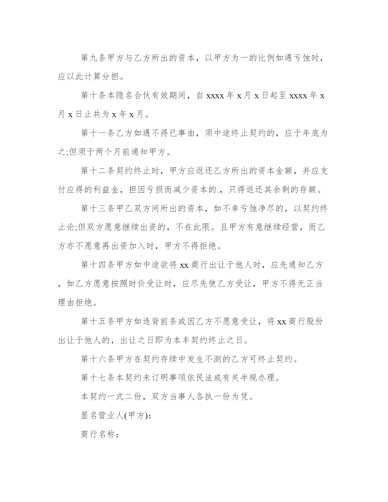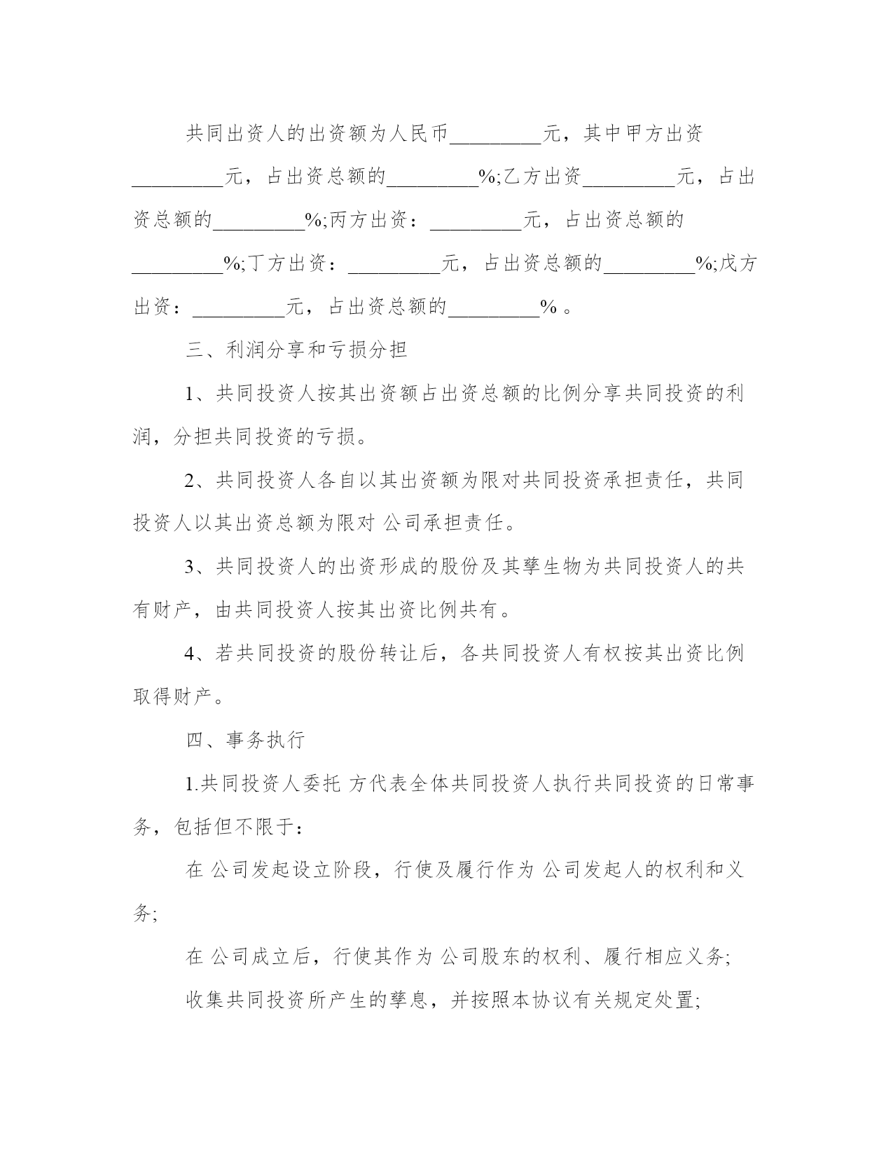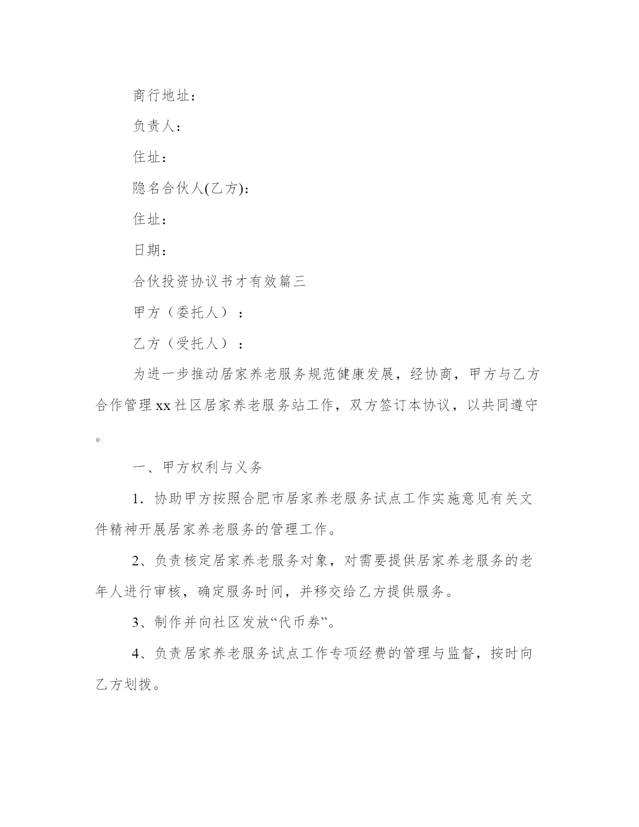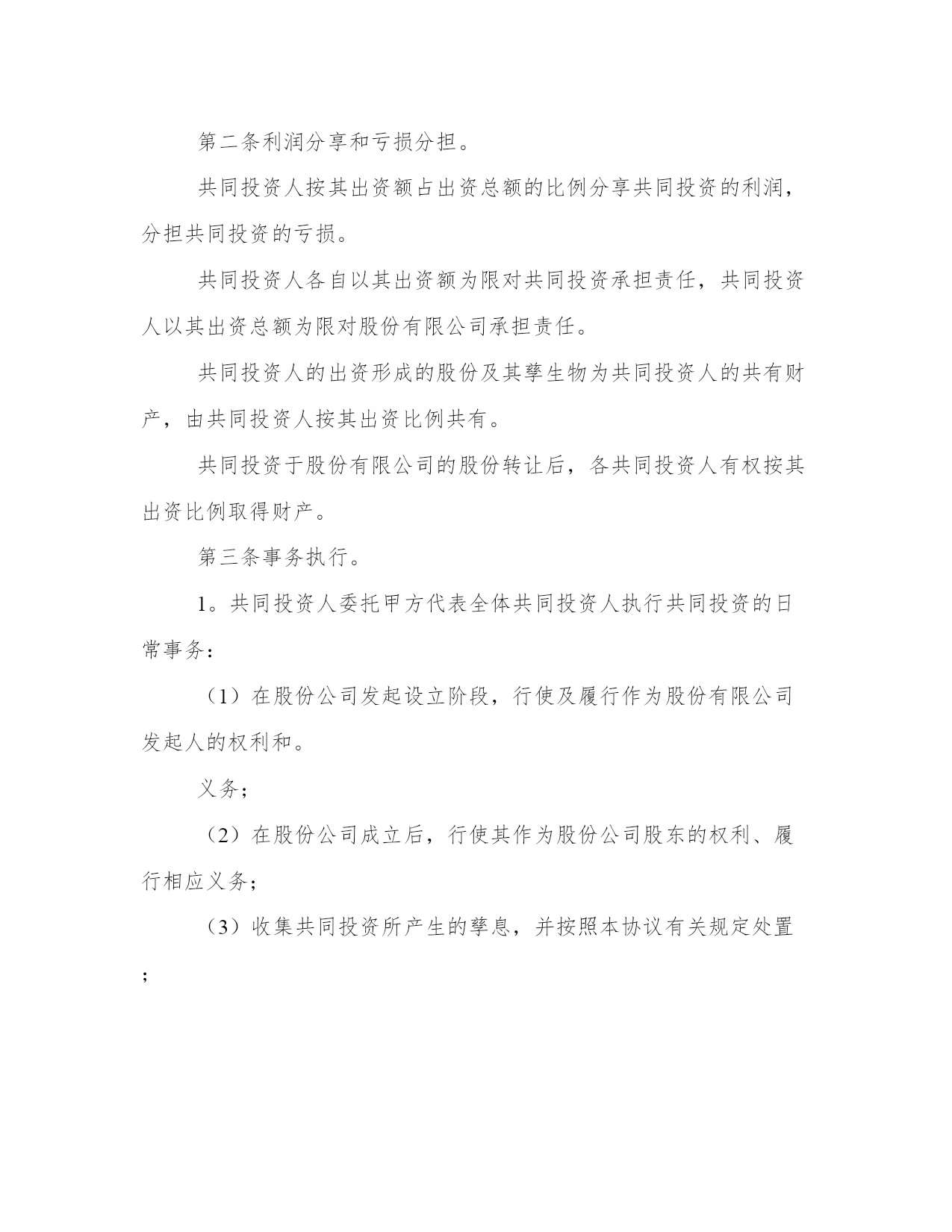 合伙投资协议书才有效(精选13篇)每个人都曾试图在平淡的学习、工作和生活中写一篇文章。写作是培养人的观察、联想、想象、思维和记忆的重要手段。范文书写有哪些要求呢?我们怎样才能写好一篇范文呢?接下来小编就给大家介绍一下优秀的范文该怎么写,我们一起来看一看吧。合伙投资协议书才有效篇一甲方:身份证号:籍贯:乙方:身份证号:籍贯:丙方:身份证号:籍贯:丁方:身份证号:籍贯:以上各方共同投资人(以下简称“共同投资人”)经友好协商,根据中华人民共和国法律、法规的规定,双方本着互惠互利的原则,就甲乙双方合作投资混凝土有限公司项目事宜达成如下协议,以共同遵守。第一条共同投资人的投资额和投资方式。甲、乙、丙、丁、四方同意,以四方已注册成立的罗城县翔翼混凝土有限责任公司(以下简称公司)为项目投资主体。各方出资分别:甲方出资万元(元)占出资总额的43%;乙方出资万元(元)占出资总额的43%,丙方出资万元(元)占出资总额的7%,丁方出资万元(元)占出资总额的7%;。第二条利润分享和亏损分担。共同投资人按其出资额占出资总额的比例分享共同投资的利润,分担共同投资的亏损。共同投资人各自以其出资额为限对共同投资承担责任,共同投资人以其出资总额为限对股份有限公司承担责任。共同投资人的出资形成的股份及其孳生物为共同投资人的共有财产,由共同投资人按其出资比例共有。共同投资于股份有限公司的股份转让后,各共同投资人有权按其出资比例取得财产。第三条事务执行。1。共同投资人委托甲方代表全体共同投资人执行共同投资的日常事务:(1)在股份公司发起设立阶段,行使及履行作为股份有限公司发起人的权利和。义务;(2)在股份公司成立后,行使其作为股份公司股东的权利、履行相应义务;(3)收集共同投资所产生的孳息,并按照本协议有关规定处置;5。共同投资人可以对甲方执行共同投资事务提出异议。提出异议时,应暂停该项事务的执行。如果发生争议,由全体共同投资人共同决定。6。共同投资的下列事务必须经全体共同投资人同意:(1)转让共同投资于股份有限公司的股份;(2)以上述股份对外出质;(3)更换事务执行人。第四条投资的转让。2。共同投资人之间转让在共同投资中的全部或部分投资额时,应当通知其他共同出资人;3。共同投资人依法转让其出资额的,在同等条件下,其他共同投资人有优先受让的权利。第五条其他权利和义务。1。甲方及其他共同投资人不得私自转让或者处分共同投资的股份;2。共同投资人在股份有限公司登记之日起三年内,不得转让其持有的股份及出资额;3。股份有限公司成立后,任一共同投资人不得从共同投资中抽回出资额;4。股份有限公司不能成立时,对设立行为所产生的债务和费用按各共同投资。人的出资比例分担。第六条违约责任。为保证本协议的实际履行,甲方自愿提供其所有的向其他共同投资人提供担保。甲方承诺在其违约并造成其他共同投资人损失的情况下,以上述财产向其他共同投资人承担违约责任。第七条其他。1。本协议未尽事宜由共同投资人协商一致后,另行签订补充协议。2。本协议经全体共同投资人签字盖章后即生效。本协议一式_______份,共同投资人各执一份。甲方(签字):_________。乙方(签字):_________。_______年____月____日日。签订地点:_________。签订地点:_________。丙方(签字):_________。丁方(签字):_________。_______年____月____日。_______年____月____日。签订地点:_________。签订地点:_________。合伙投资协议书才有效篇二隐名合伙人xxx(以下简称为乙方),显名营业人xxx(以下简称甲方),兹为隐名合伙经当事人间同意缔行契约条件于下:第一条甲方开设xx商行专营xx事业计共资本金人民币xx元整,除甲方自出人民币xx元整外,余人民币xx元整,由乙方于本契约成立同时一次交清甲乙方各自确认。第二条乙方投入资本人民币xx元整后,即为xx商行的隐名合伙人而甲方认诺。第三条甲方应每届事务年终,开具财产目录借贷对照表,以及营业损益计算书交付乙方查核。第四条前条查核时,如乙方发现疑义之处,即可到商行查阅合伙人帐簿,并检查其事务及财产的状况。第五条本隐名合伙人损益应按照合伙出资额比例分配负担。第六条前条利益的分配,应于损益计算后,五日内由甲方支付乙方,而未支付的分配金,乙方可充作其出资的增加于甲方同意。第七条关于x商行营业事务,均由甲方执行,而乙方不得参与事务的执行。但乙方得随时查阅合伙人的帐簿,并检查其事务及财产的状况。第八条隐名合伙期间中,如遇亏蚀时,如果其财产不足资本额半数的,甲方应即通知乙方,而乙方可终