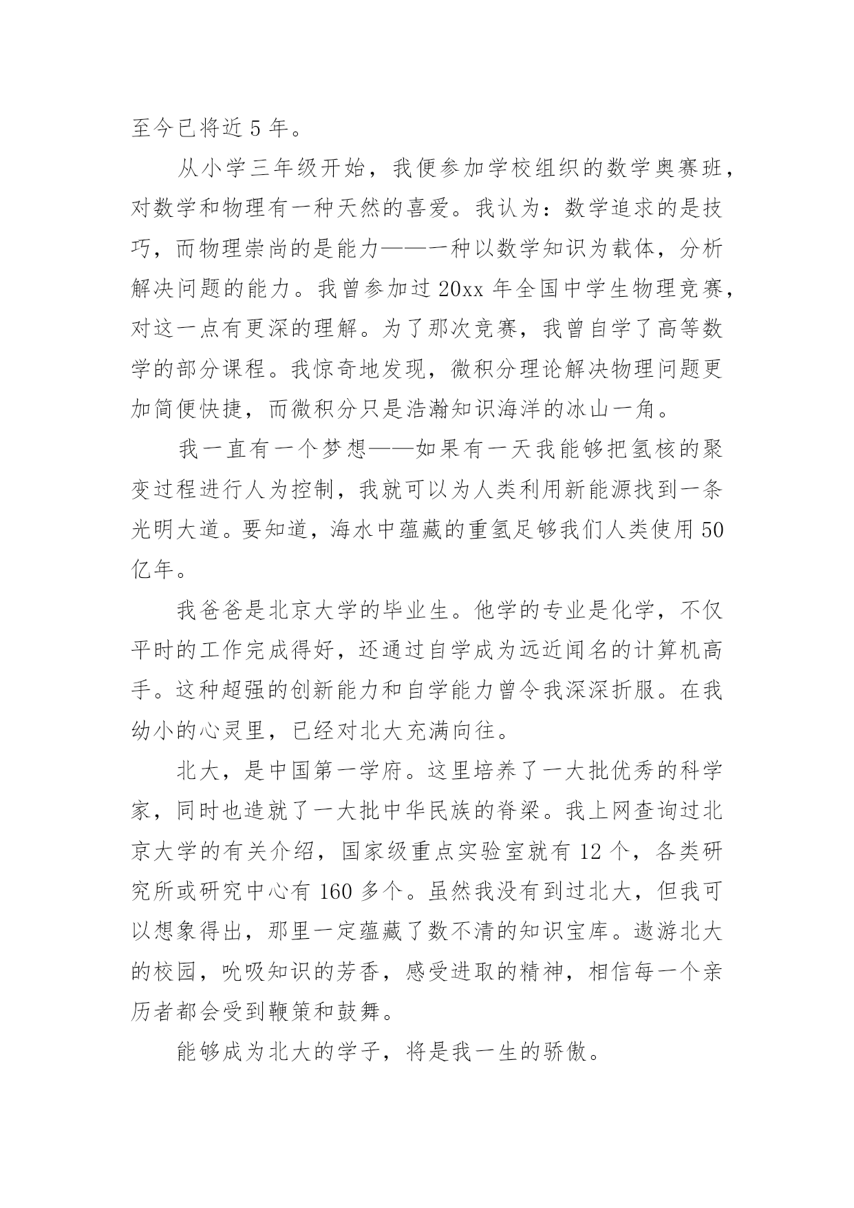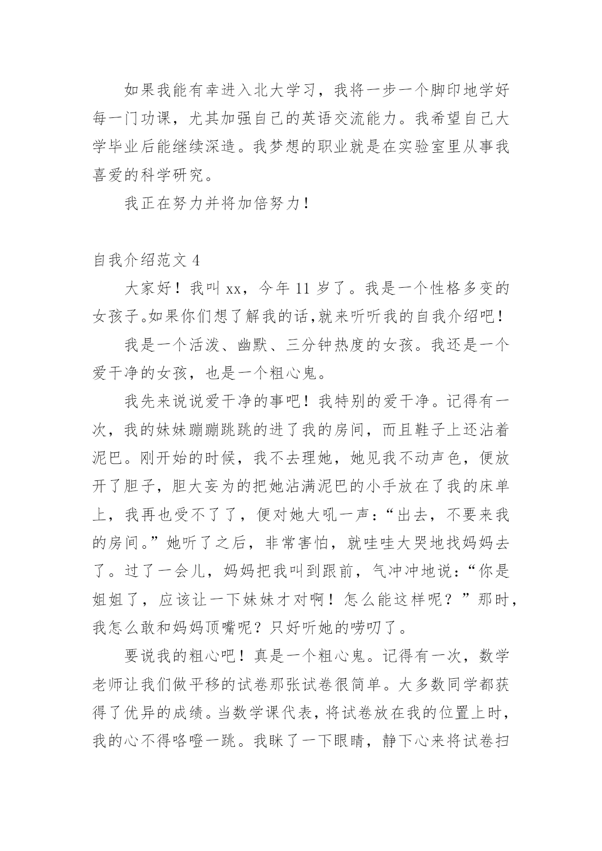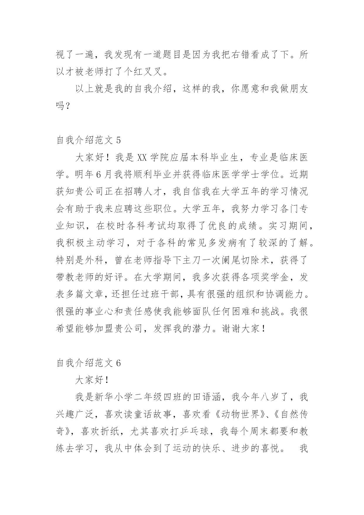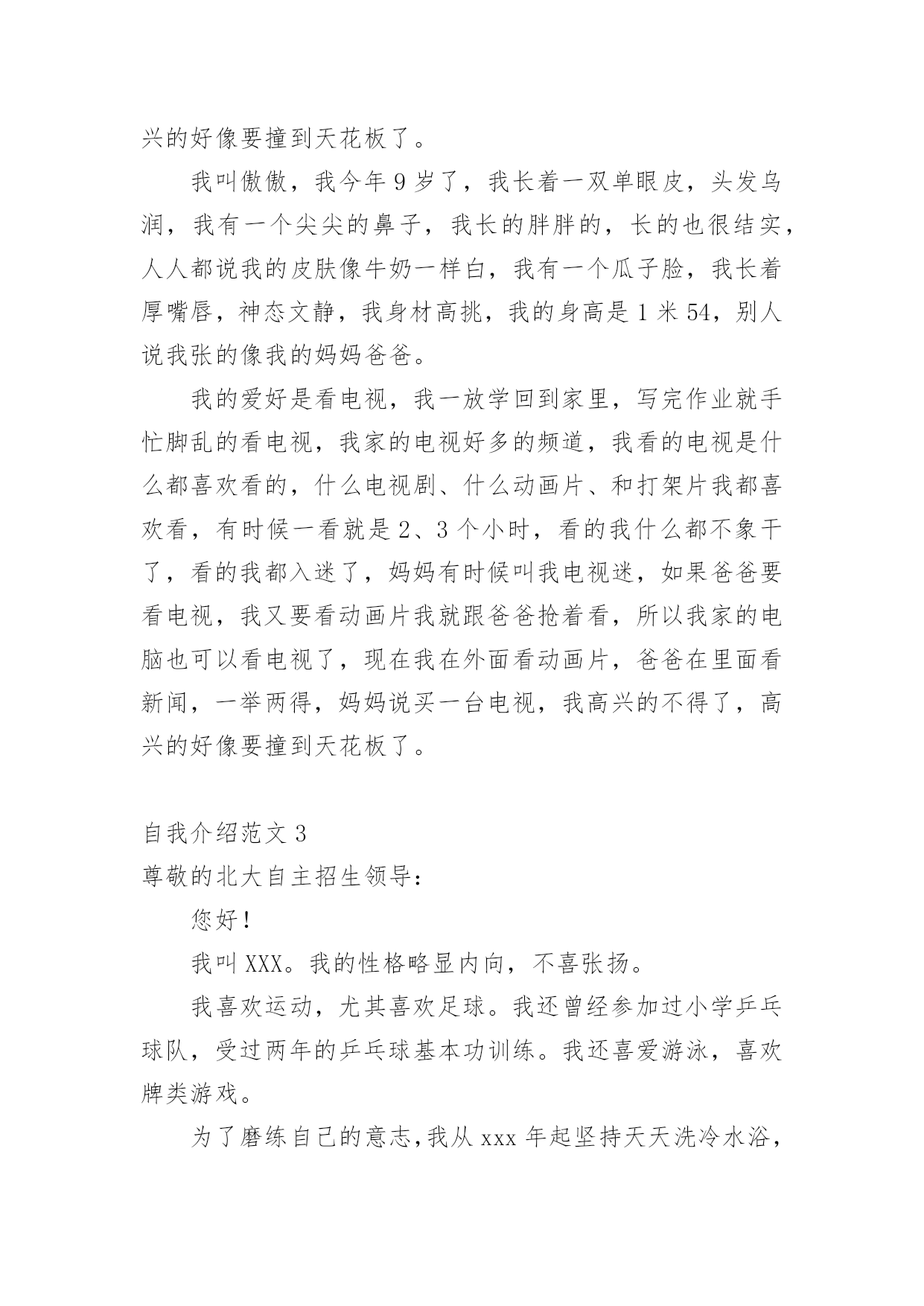 自我介绍自我介绍范文当到达一个新的环境后,我们总归要向他人介绍自己,自我介绍是让陌生人彼此认识的好方法。如何编写一段个性的自我介绍?下面是小编精心整理的自我介绍范文,欢迎阅读,希望大家能够喜欢。自我介绍范文1我一双半大不小的眼睛,单眼皮。长睫毛,胖乎乎的鼻子是被我你也出来的一张中等的,嘴巴红红的儿子些都是我已经长胖了的脸庞所承受的。我的个子在家人眼里算是孩子中最高的一个儿了,而在我看来也不算什么,只有一米六几。因为在人群中我总是觉得我是那个最小的,也正是最不太吸引人注目的。通常在这时,我会把自己最安静,最冷的一面表现出来,反而让自己显得更独特一点……我这个人外表是比较安静的了解我的人都知道我是一个心口不一样,而且十分外向,在好朋友面前我就是毫无保留,也不会有任何的淑女形象。在家人面前我是一个话唠,不会撒娇卖萌,只会随着变化而变化。如果哪一天听不见我的说话和大声嚷嚷。他们会觉得不适应。在同学眼里我很坚强,从来不会因为某些事哭,可是即使是这样,见过我哭的人也不再多数,几乎没有我人生三大规则中一条,就是“不哭”!用现在的话来说,可以称我为女汉子,女汉子的基本表现,就是要事事坚强。另外就是急暴脾气我这个人有一种与生俱来的脾气,在家人和邻里眼里就是我遗传了妈妈的脾气,因为妈妈的脾气有时不好,爱唠叨,但是我知道家里的事都是妈妈做的。也甘愿像妈妈!我就是这样的,这就是我。自我介绍范文2我叫傲傲,我今年9岁了,我长着一双单眼皮,头发乌润,我有一个尖尖的鼻子,我长的胖胖的,长的也很结实,人人都说我的皮肤像牛奶一样白,我有一个瓜子脸,我长着厚嘴唇,神态文静,我身材高挑,我的身高是1米54,别人说我张的像我的妈妈爸爸。我的爱好是看电视,我一放学回到家里,写完作业就手忙脚乱的看电视,我家的电视好多的频道,我看的电视是什么都喜欢看的,什么电视剧、什么动画片、和打架片我都喜欢看,有时候一看就是2、3个小时,看的我什么都不象干了,看的我都入迷了,妈妈有时候叫我电视迷,如果爸爸要看电视,我又要看动画片我就跟爸爸抢着看,所以我家的电脑也可以看电视了,现在我在外面看动画片,爸爸在里面看新闻,一举两得,妈妈说买一台电视,我高兴的不得了,高兴的好像要撞到天花板了。我叫傲傲,我今年9岁了,我长着一双单眼皮,头发乌润,我有一个尖尖的鼻子,我长的胖胖的,长的也很结实,人人都说我的皮肤像牛奶一样白,我有一个瓜子脸,我长着厚嘴唇,神态文静,我身材高挑,我的身高是1米54,别人说我张的像我的妈妈爸爸。我的爱好是看电视,我一放学回到家里,写完作业就手忙脚乱的看电视,我家的电视好多的频道,我看的电视是什么都喜欢看的,什么电视剧、什么动画片、和打架片我都喜欢看,有时候一看就是2、3个小时,看的我什么都不象干了,看的我都入迷了,妈妈有时候叫我电视迷,如果爸爸要看电视,我又要看动画片我就跟爸爸抢着看,所以我家的电脑也可以看电视了,现在我在外面看动画片,爸爸在里面看新闻,一举两得,妈妈说买一台电视,我高兴的不得了,高兴的好像要撞到天花板了。自我介绍范文3尊敬的北大自主招生领导:您好!我叫XXX。我的性格略显内向,不喜张扬。我喜欢运动,尤其喜欢足球。我还曾经参加过小学乒乓球队,受过两年的乒乓球基本功训练。我还喜爱游泳,喜欢牌类游戏。为了磨练自己的意志,我从xxx年起坚持天天洗冷水浴,至今已将近5年。从小学三年级开始,我便参加学校组织的数学奥赛班,对数学和物理有一种天然的喜爱。我认为:数学追求的是技巧,而物理崇尚的是能力——一种以数学知识为载体,分析解决问题的能力。我曾参加过20xx年全国中学生物理竞赛,对这一点有更深的理解。为了那次竞赛,我曾自学了高等数学的部分课程。我惊奇地发现,微积分理论解决物理问题更加简便快捷,而微积分只是浩瀚知识海洋的冰山一角。我一直有一个梦想——如果有一天我能够把氢核的聚变过程进行人为控制,我就可以为人类利用新能源找到一条光明大道。要知道,海水中蕴藏的重氢足够我们人类使用50亿年。我爸爸是北京大学的毕业生。他学的专业是化学,不仅平时的工作完成得好,还通过自学成为远近闻名的计算机高手。这种超强的创新能力和自学能力曾令我深深折服。在我幼小的心灵里,已经对北大充满向往。北大,是中国第一学府。这里培养了一大批优秀的科学家,同时也造就了一大批中华民族的脊梁。我上网查询过北京大学的有关介绍,国家级重点实验室就有12个,各类研究所或研究中心有160多个。虽然我没有到过北大,但我可以想象得出,那里一定蕴藏了数不清的知识宝库。遨游北大的校园,吮吸知识的芳香,感受进取的精神,相信每一个亲历者都会受到鞭策和鼓舞。能够成为北大的学子,将是我一生的骄傲。如果我能有幸进入北大学习,我将一步一个脚印地学好每一门功课,尤其加强自己的英语交流能力。我希望自己大学毕业后能继续深造。我梦想的职业就是