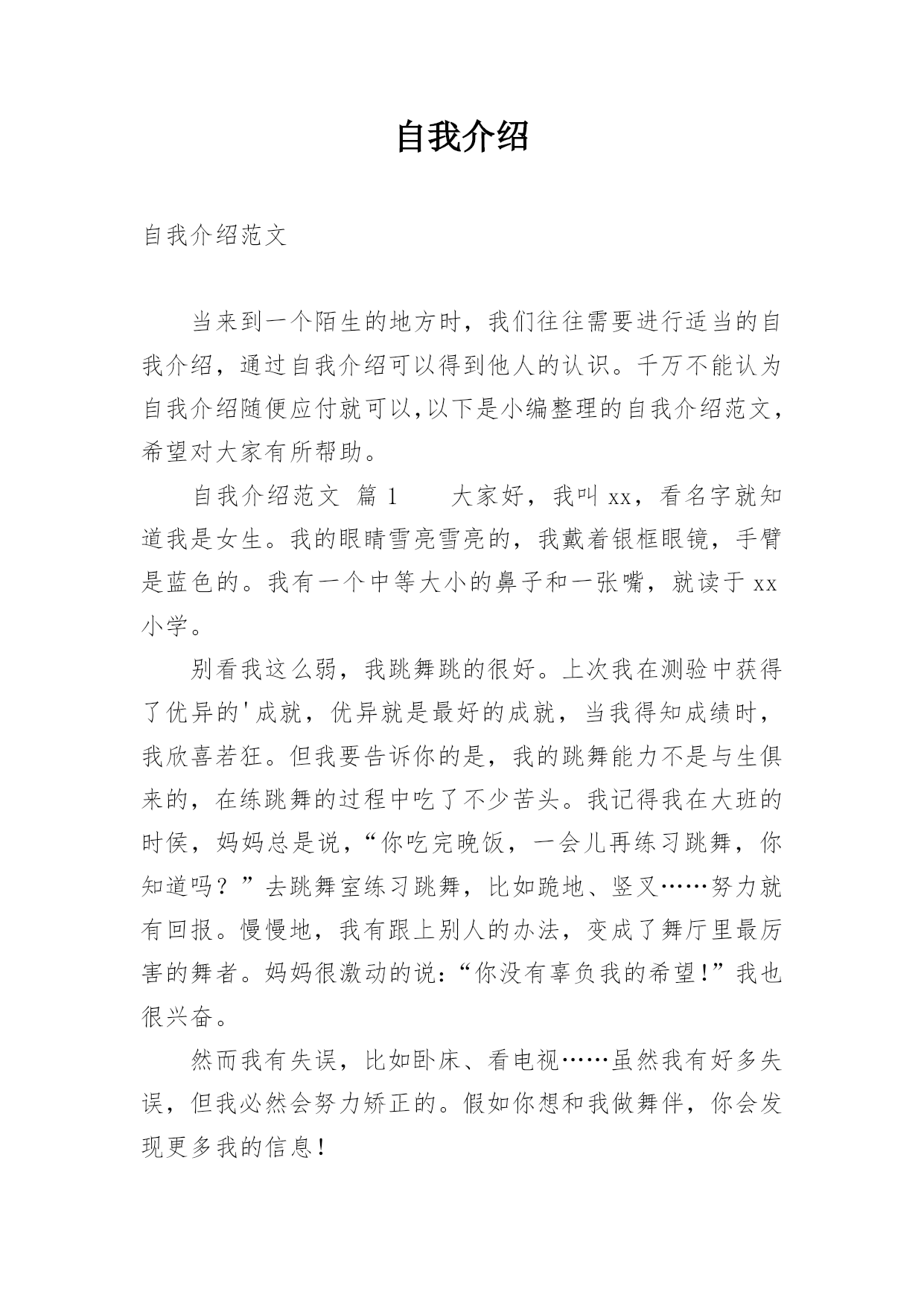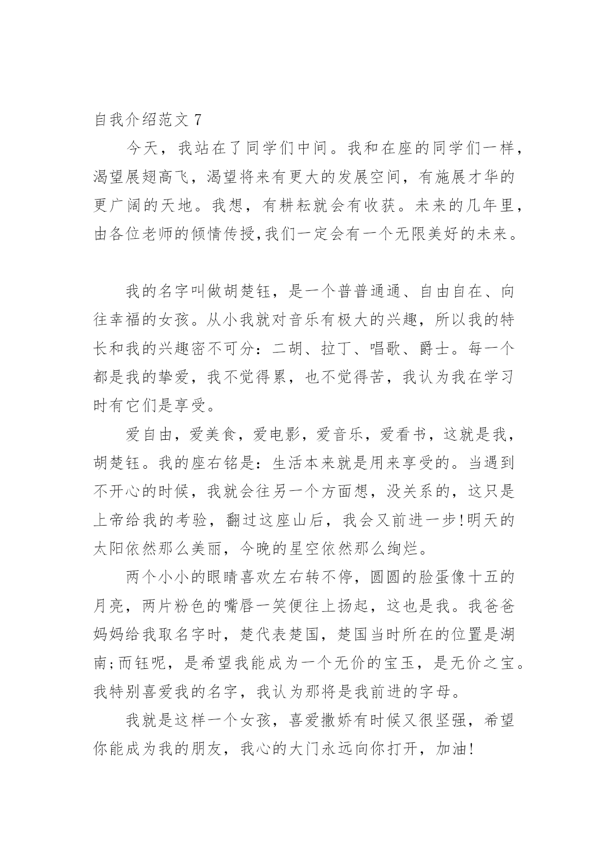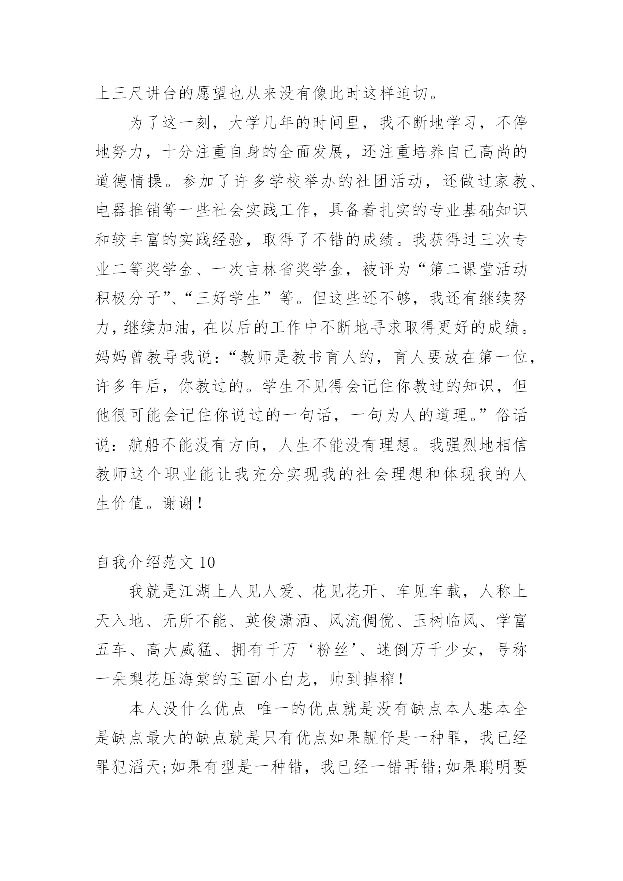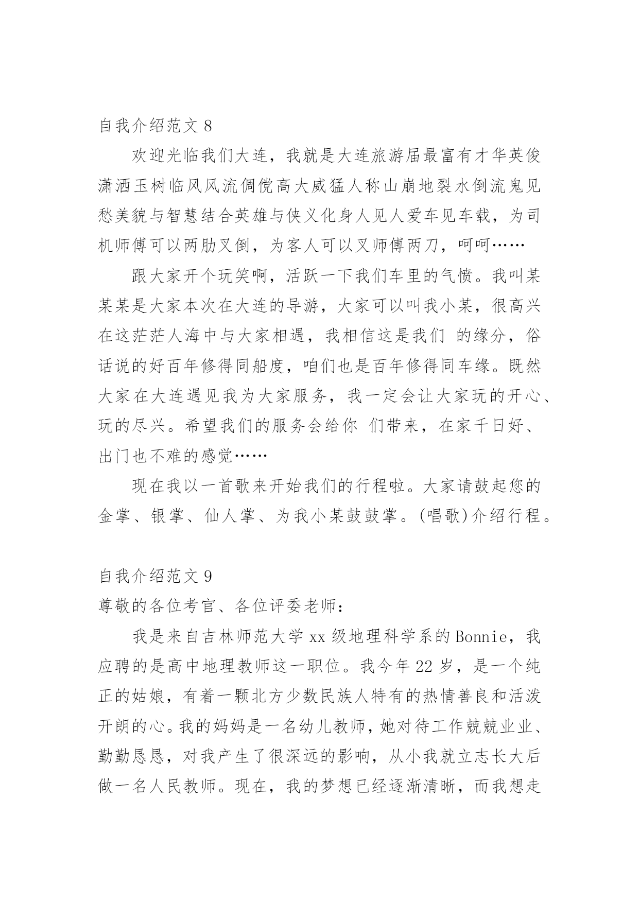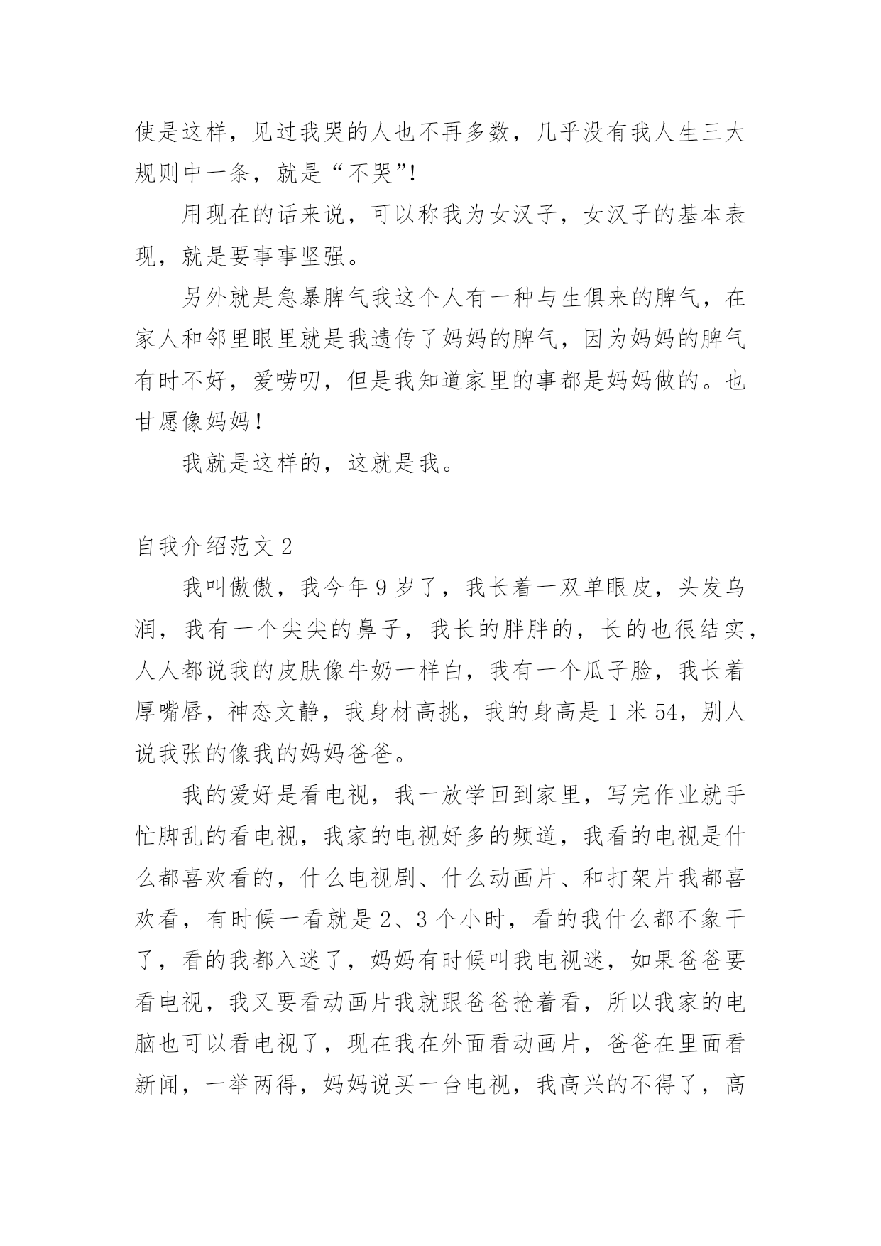自我介绍自我介绍范文当到达一个新的环境后,我们总归要向他人介绍自己,自我介绍是让陌生人彼此认识的好方法。如何编写一段个性的自我介绍?下面是小编精心整理的自我介绍范文,欢迎阅读,希望大家能够喜欢。自我介绍范文1我一双半大不小的眼睛,单眼皮。长睫毛,胖乎乎的鼻子是被我你也出来的一张中等的,嘴巴红红的儿子些都是我已经长胖了的脸庞所承受的。我的个子在家人眼里算是孩子中最高的一个儿了,而在我看来也不算什么,只有一米六几。因为在人群中我总是觉得我是那个最小的,也正是最不太吸引人注目的。通常在这时,我会把自己最安静,最冷的一面表现出来,反而让自己显得更独特一点……我这个人外表是比较安静的了解我的人都知道我是一个心口不一样,而且十分外向,在好朋友面前我就是毫无保留,也不会有任何的淑女形象。在家人面前我是一个话唠,不会撒娇卖萌,只会随着变化而变化。如果哪一天听不见我的说话和大声嚷嚷。他们会觉得不适应。在同学眼里我很坚强,从来不会因为某些事哭,可是即使是这样,见过我哭的人也不再多数,几乎没有我人生三大规则中一条,就是“不哭”!用现在的话来说,可以称我为女汉子,女汉子的基本表现,就是要事事坚强。另外就是急暴脾气我这个人有一种与生俱来的脾气,在家人和邻里眼里就是我遗传了妈妈的脾气,因为妈妈的脾气有时不好,爱唠叨,但是我知道家里的事都是妈妈做的。也甘愿像妈妈!我就是这样的,这就是我。自我介绍范文2我叫傲傲,我今年9岁了,我长着一双单眼皮,头发乌润,我有一个尖尖的鼻子,我长的胖胖的,长的也很结实,人人都说我的皮肤像牛奶一样白,我有一个瓜子脸,我长着厚嘴唇,神态文静,我身材高挑,我的身高是1米54,别人说我张的像我的妈妈爸爸。我的爱好是看电视,我一放学回到家里,写完作业就手忙脚乱的看电视,我家的电视好多的频道,我看的电视是什么都喜欢看的,什么电视剧、什么动画片、和打架片我都喜欢看,有时候一看就是2、3个小时,看的我什么都不象干了,看的我都入迷了,妈妈有时候叫我电视迷,如果爸爸要看电视,我又要看动画片我就跟爸爸抢着看,所以我家的电脑也可以看电视了,现在我在外面看动画片,爸爸在里面看新闻,一举两得,妈妈说买一台电视,我高兴的不得了,高兴的好像要撞到天花板了。我叫傲傲,我今年9岁了,我长着一双单眼皮,头发乌润,我有一个尖尖的鼻子,我长的胖胖的,长的也很结实,人人都说我的皮肤像牛奶一样白,我有一个瓜子脸,我长着厚嘴唇,神态文静,我身材高挑,我的身高是1米54,别人说我张的像我的妈妈爸爸。我的爱好是看电视,我一放学回到家里,写完作业就手忙脚乱的看电视,我家的电视好多的频道,我看的电视是什么都喜欢看的,什么电视剧、什么动画片、和打架片我都喜欢看,有时候一看就是2、3个小时,看的我什么都不象干了,看的我都入迷了,妈妈有时候叫我电视迷,如果爸爸要看电视,我又要看动画片我就跟爸爸抢着看,所以我家的电脑也可以看电视了,现在我在外面看动画片,爸爸在里面看新闻,一举两得,妈妈说买一台电视,我高兴的不得了,高兴的好像要撞到天花板了。自我介绍范文3尊敬的北大自主招生领导:您好!我叫XXX。我的性格略显内向,不喜张扬。我喜欢运动,尤其喜欢足球。我还曾经参加过小学乒乓球队,受过两年的乒乓球基本功训练。我还喜爱游泳,喜欢牌类游戏。为了磨练自己的意志,我从xxx年起坚持天天洗冷水浴,至今已将近5年。从小学三年级开始,我便参加学校组织的数学奥赛班,对数学和物理有一种天然的喜爱。我认为:数学追求的是技巧,而物理崇尚的是能力——一种以数学知识为载体,分析解决问题的能力。我曾参加过20xx年全国中学生物理竞赛,对这一点有更深的理解。为了那次竞赛,我曾自学了高等数学的部分课程。我惊奇地发现,微积分理论解决物理问题更加简便快捷,而微积分只是浩瀚知识海洋的冰山一角。我一直有一个梦想——如果有一天我能够把氢核的聚变过程进行人为控制,我就可以为人类利用新能源找到一条光明大道。要知道,海水中蕴藏的重氢足够我们人类使用50亿年。我爸爸是北京大学的毕业生。他学的专业是化学,不仅平时的工作完成得好,还通过自学成为远近闻名的计算机高手。这种超强的创新能力和自学能力曾令我深深折服。在我幼小的心灵里,已经对北大充满向往。北大,是中国第一学府。这里培养了一大批优秀的科学家,同时也造就了一大批中华民族的脊梁。我上网查询过北京大学的有关介绍,国家级重点实验室就有12个,各类研究所或研究中心有160多个。虽然我没有到过北大,但我可以想象得出,那里一定蕴藏了数不清的知识宝库。遨游北大的校园,吮吸知识的芳香,感受进取的精神,相信每一个亲历者都会受到鞭策和鼓舞。能够成为北大的学子,将是我一生的骄傲。如果我能有幸进入北大学习,我将一步一个脚印地学好每一门功课,尤其加强自己的英语交流能力。我希望自己大学毕业后能继续深造。我梦想的职业就是