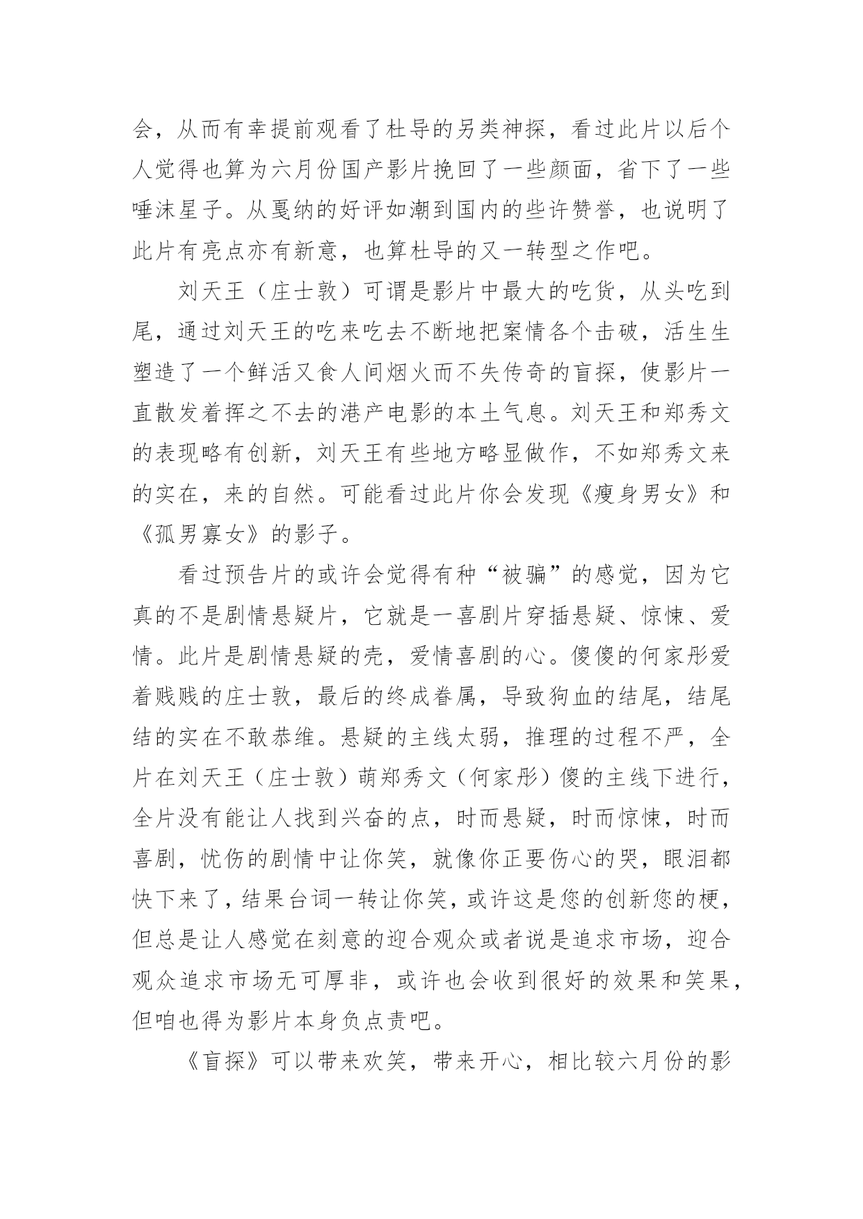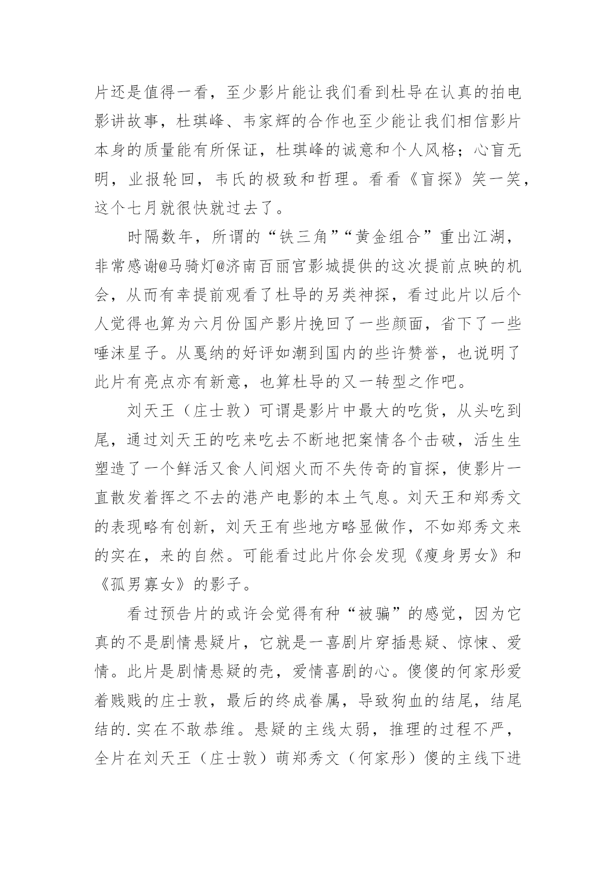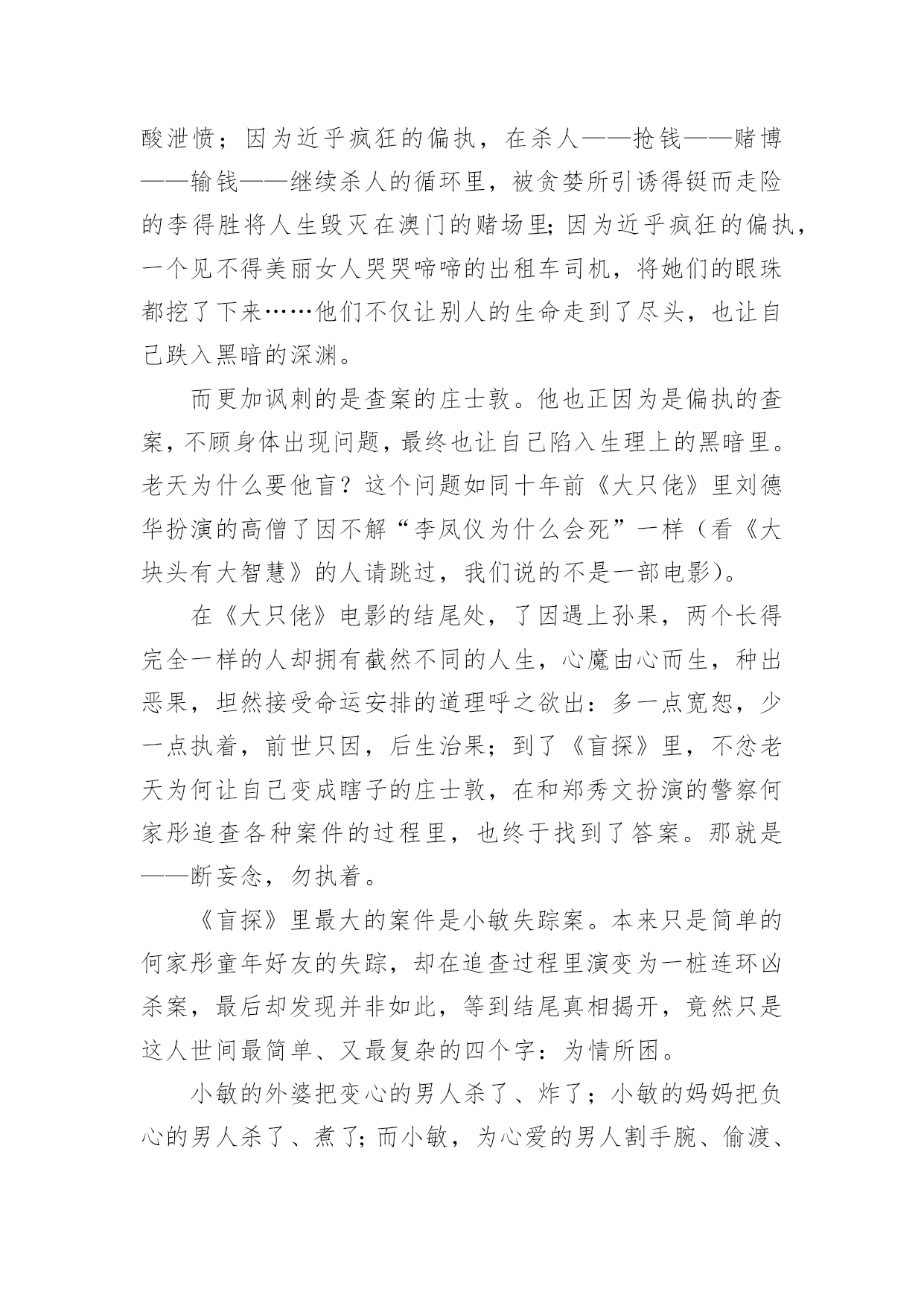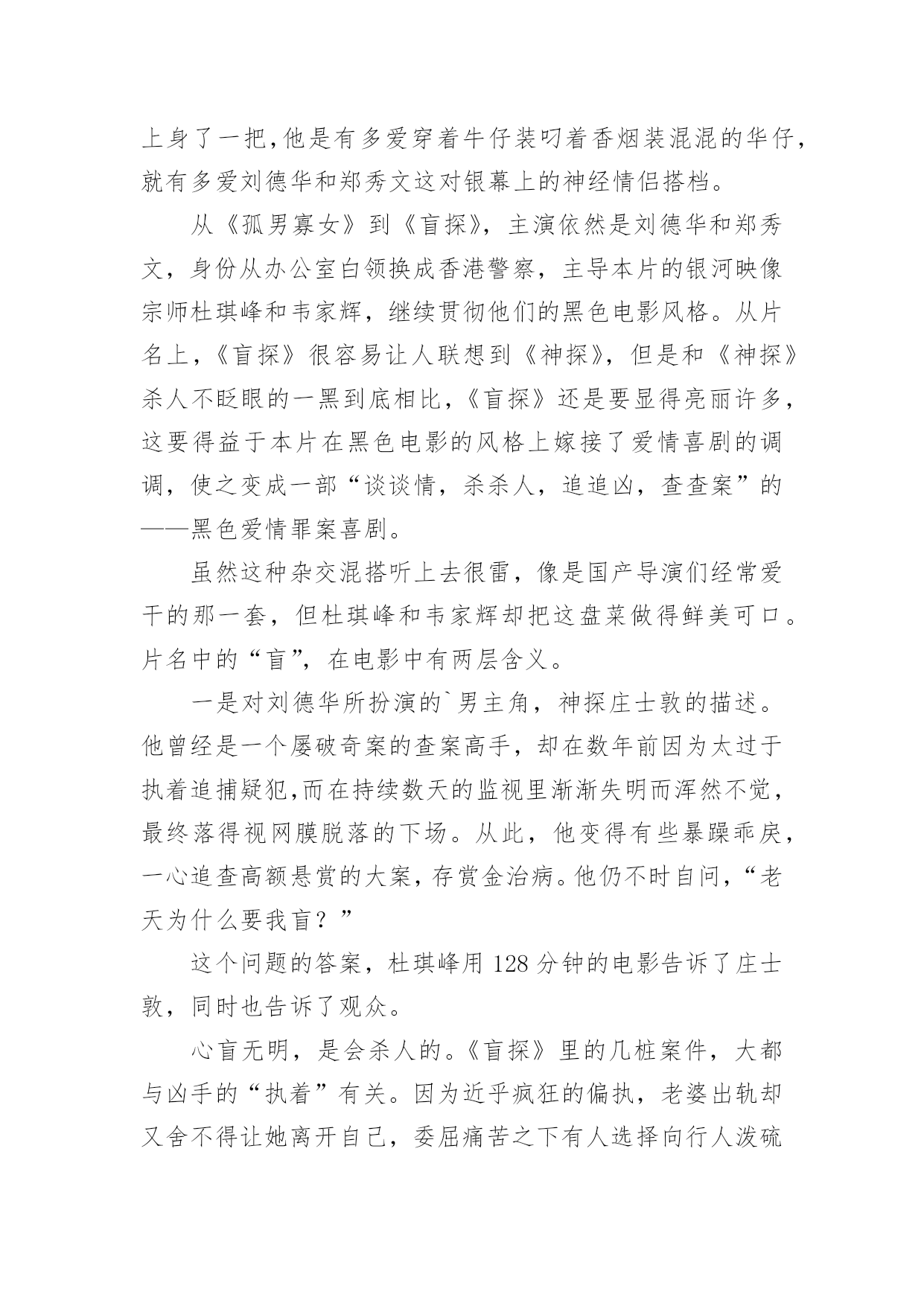 《盲探》观后感《盲探》观后感认真品味一部作品后,一定有很多值得分享的心得吧,为此需要好好认真地写观后感。千万不能认为观后感随便应付就可以,以下是小编精心整理的《盲探》观后感,欢迎阅读,希望大家能够喜欢。《盲探》观后感1杜琪峰曾经在访谈里坦言过,自己不懂女人。他承认自己熟悉兄弟情,却不了解女人。甚至和老婆结婚多年,都不知道她脑子里想的是什么。所以他的作品里,最差的一部就是以女性视角展开的《蝴蝶飞》,即便是拿过金像奖最佳编剧,写过《甜蜜蜜》的岸西来搞剧本,拍出来的效果也差强人意。但是恰恰又是这位不懂女人的导演,20xx年时拍了一部讲述办公室恋情的电影《孤男寡女》拿到了当年香港的票房冠军,而且引领了华语电影十多年的都市白领恋爱题材潮流。戏里郑秀文扮演的小白领穿梭香港大陆,陪着严苛的上级刘德华东奔西跑,在觥筹交错中一步一步走到了一起,结尾顺带还调侃了刘德华当年最为型英帅靓正的英雄浪漫主义史诗大片《天若有情》。为什么我要提《天若有情》,因为这次在《盲探》里,《天若有情》里华弟的造型再次出现,杜琪峰又让刘德华鬼上身了一把,他是有多爱穿着牛仔装叼着香烟装混混的华仔,就有多爱刘德华和郑秀文这对银幕上的神经情侣搭档。从《孤男寡女》到《盲探》,主演依然是刘德华和郑秀文,身份从办公室白领换成香港警察,主导本片的银河映像宗师杜琪峰和韦家辉,继续贯彻他们的黑色电影风格。从片名上,《盲探》很容易让人联想到《神探》,但是和《神探》杀人不眨眼的一黑到底相比,《盲探》还是要显得亮丽许多,这要得益于本片在黑色电影的风格上嫁接了爱情喜剧的调调,使之变成一部“谈谈情,杀杀人,追追凶,查查案”的——黑色爱情罪案喜剧。虽然这种杂交混搭听上去很雷,像是国产导演们经常爱干的那一套,但杜琪峰和韦家辉却把这盘菜做得鲜美可口。片名中的“盲”,在电影中有两层含义。一是对刘德华所扮演的`男主角,神探庄士敦的描述。他曾经是一个屡破奇案的查案高手,却在数年前因为太过于执着追捕疑犯,而在持续数天的监视里渐渐失明而浑然不觉,最终落得视网膜脱落的下场。从此,他变得有些暴躁乖戾,一心追查高额悬赏的大案,存赏金治病。他仍不时自问,“老天为什么要我盲?”这个问题的答案,杜琪峰用128分钟的电影告诉了庄士敦,同时也告诉了观众。心盲无明,是会杀人的。《盲探》里的几桩案件,大都与凶手的“执着”有关。因为近乎疯狂的偏执,老婆出轨却又舍不得让她离开自己,委屈痛苦之下有人选择向行人泼硫酸泄愤;因为近乎疯狂的偏执,在杀人——抢钱——赌博——输钱——继续杀人的循环里,被贪婪所引诱得铤而走险的李得胜将人生毁灭在澳门的赌场里;因为近乎疯狂的偏执,一个见不得美丽女人哭哭啼啼的出租车司机,将她们的眼珠都挖了下来……他们不仅让别人的生命走到了尽头,也让自己跌入黑暗的深渊。而更加讽刺的是查案的庄士敦。他也正因为是偏执的查案,不顾身体出现问题,最终也让自己陷入生理上的黑暗里。老天为什么要他盲?这个问题如同十年前《大只佬》里刘德华扮演的高僧了因不解“李凤仪为什么会死”一样(看《大块头有大智慧》的人请跳过,我们说的不是一部电影)。在《大只佬》电影的结尾处,了因遇上孙果,两个长得完全一样的人却拥有截然不同的人生,心魔由心而生,种出恶果,坦然接受命运安排的道理呼之欲出:多一点宽恕,少一点执着,前世只因,后生治果;到了《盲探》里,不忿老天为何让自己变成瞎子的庄士敦,在和郑秀文扮演的警察何家彤追查各种案件的过程里,也终于找到了答案。那就是——断妄念,勿执着。《盲探》里最大的案件是小敏失踪案。本来只是简单的何家彤童年好友的失踪,却在追查过程里演变为一桩连环凶杀案,最后却发现并非如此,等到结尾真相揭开,竟然只是这人世间最简单、又最复杂的四个字:为情所困。小敏的外婆把变心的男人杀了、炸了;小敏的妈妈把负心的男人杀了、煮了;而小敏,为心爱的男人割手腕、偷渡、整容,最终辛苦赢得男人,结婚还怀了他的孩子,却依旧敌不过男人的花心,最终她走上了和自己的外婆、妈妈一样无法回头的路。因为爱情,她的心彻底盲了,一叶障目不见泰山,自己也完全陷了进去,失去自我,最终也失去生命。当然,这些说教味道浓郁的大道理不是本片重点,只供如我一样被杜氏哲学所迷恋的影迷去自作多情的研究;《盲探》里,查案只是调剂辅助,谈情才是重点。《盲探》观后感2看了点映的盲探,一直想着回来怎么交作业,怎么评价怎么形容,最后脑子里一直是这一句话,青山依旧,绿水长流,宝刀未老。是的,华仔五十岁了吧,sammi也不年轻了,两个情侣档九年不出山的经典组合终于重出江湖,给这个蒙了一层雾一样的夏天狠狠下了场雷阵雨(现在当下外面刚好是大雨滂沱,吼吼~)。一晃我自己都不小了,再看看常看常新的瘦身男女,好像昨天一样。瘦身男女是最爱,不能承受的感动也是单曲循环的常客。最近在电影院看的片子总是找不到感觉,总是懵懵懂