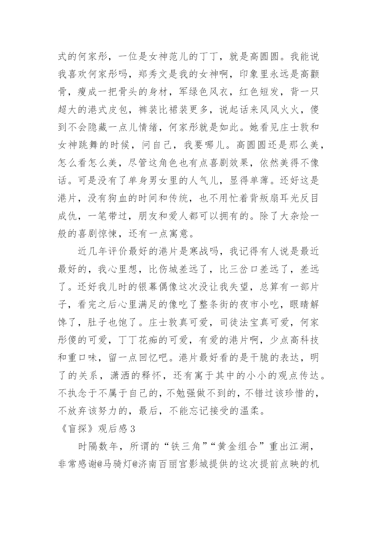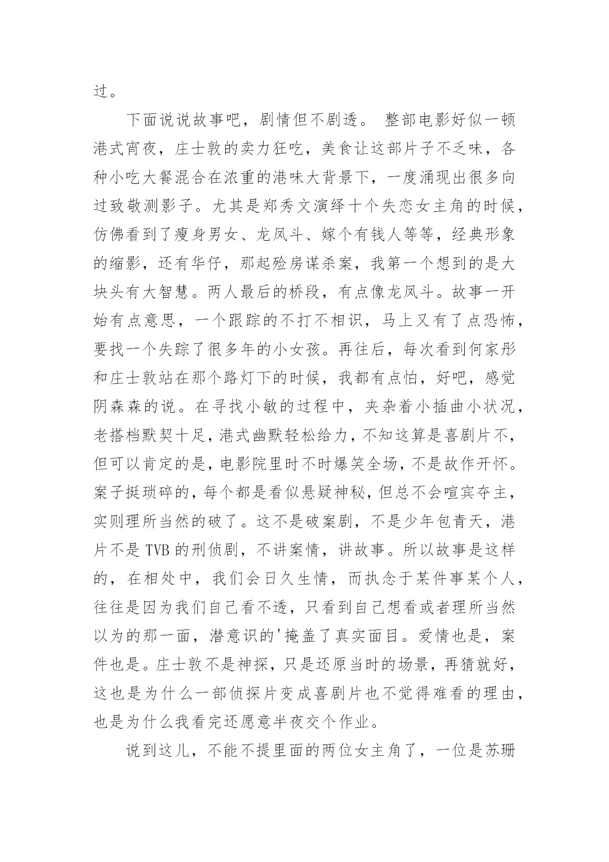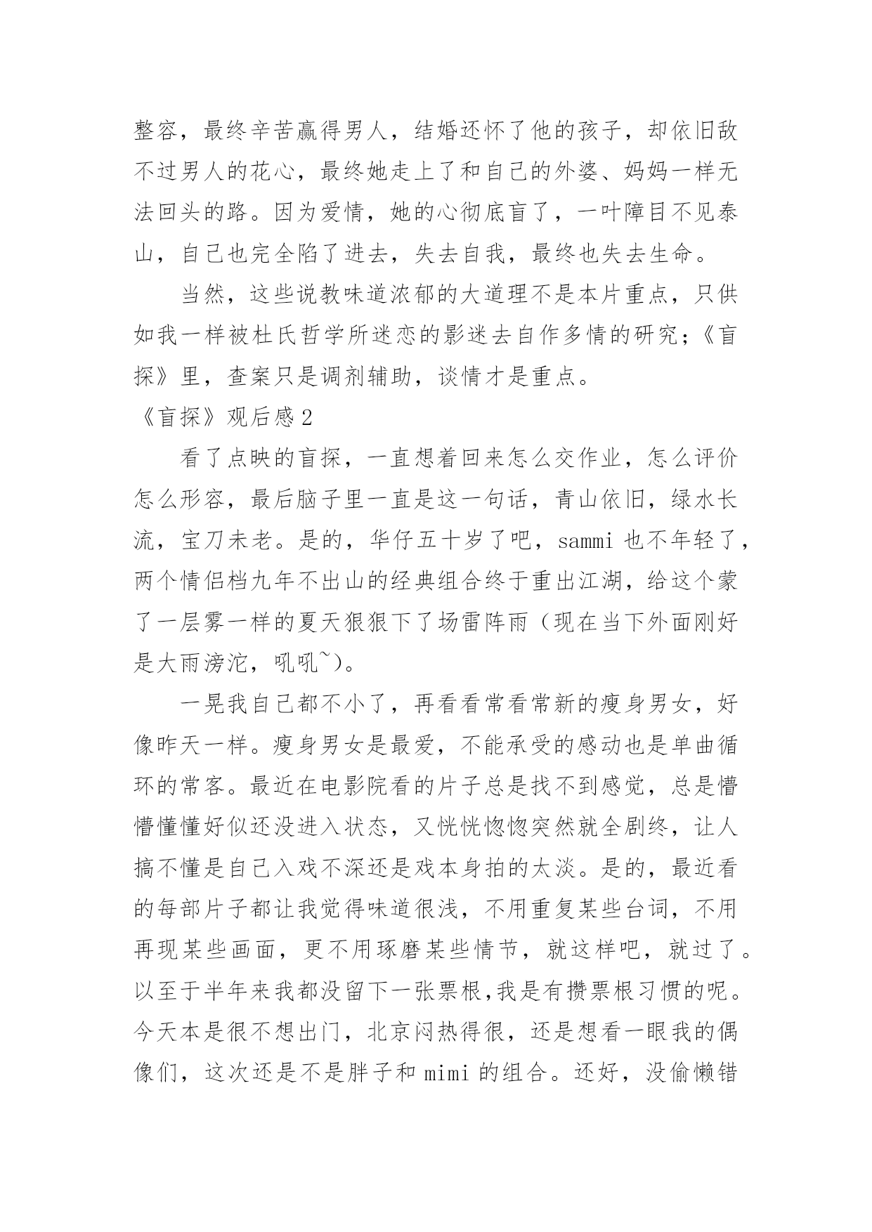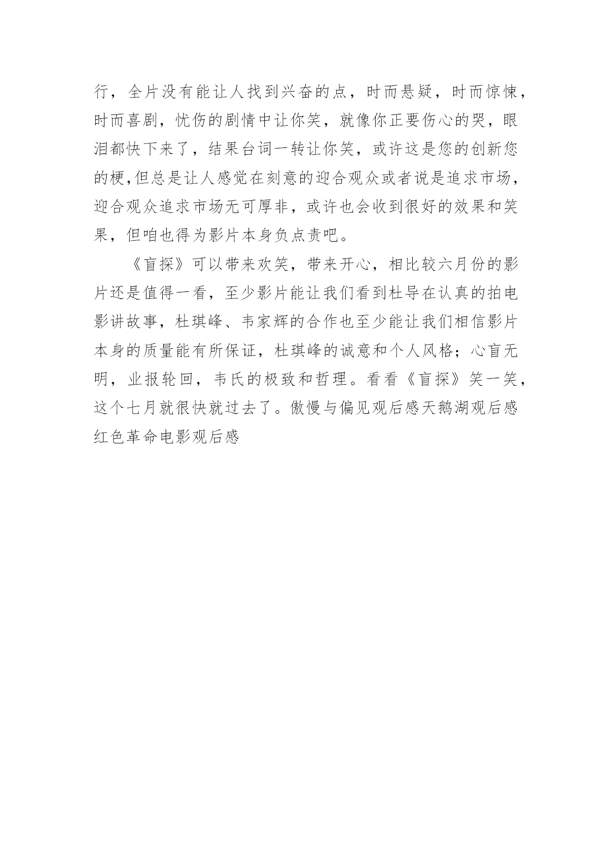 《盲探》观后感《盲探》观后感认真品味一部作品后,一定有很多值得分享的心得吧,为此需要好好认真地写观后感。千万不能认为观后感随便应付就可以,以下是小编精心整理的《盲探》观后感,欢迎阅读,希望大家能够喜欢。《盲探》观后感1杜琪峰曾经在访谈里坦言过,自己不懂女人。他承认自己熟悉兄弟情,却不了解女人。甚至和老婆结婚多年,都不知道她脑子里想的是什么。所以他的作品里,最差的一部就是以女性视角展开的《蝴蝶飞》,即便是拿过金像奖最佳编剧,写过《甜蜜蜜》的岸西来搞剧本,拍出来的效果也差强人意。但是恰恰又是这位不懂女人的导演,20xx年时拍了一部讲述办公室恋情的电影《孤男寡女》拿到了当年香港的票房冠军,而且引领了华语电影十多年的都市白领恋爱题材潮流。戏里郑秀文扮演的小白领穿梭香港大陆,陪着严苛的上级刘德华东奔西跑,在觥筹交错中一步一步走到了一起,结尾顺带还调侃了刘德华当年最为型英帅靓正的英雄浪漫主义史诗大片《天若有情》。为什么我要提《天若有情》,因为这次在《盲探》里,《天若有情》里华弟的造型再次出现,杜琪峰又让刘德华鬼上身了一把,他是有多爱穿着牛仔装叼着香烟装混混的华仔,就有多爱刘德华和郑秀文这对银幕上的神经情侣搭档。从《孤男寡女》到《盲探》,主演依然是刘德华和郑秀文,身份从办公室白领换成香港警察,主导本片的银河映像宗师杜琪峰和韦家辉,继续贯彻他们的黑色电影风格。从片名上,《盲探》很容易让人联想到《神探》,但是和《神探》杀人不眨眼的一黑到底相比,《盲探》还是要显得亮丽许多,这要得益于本片在黑色电影的风格上嫁接了爱情喜剧的调调,使之变成一部“谈谈情,杀杀人,追追凶,查查案”的——黑色爱情罪案喜剧。虽然这种杂交混搭听上去很雷,像是国产导演们经常爱干的那一套,但杜琪峰和韦家辉却把这盘菜做得鲜美可口。片名中的“盲”,在电影中有两层含义。一是对刘德华所扮演的`男主角,神探庄士敦的描述。他曾经是一个屡破奇案的查案高手,却在数年前因为太过于执着追捕疑犯,而在持续数天的监视里渐渐失明而浑然不觉,最终落得视网膜脱落的下场。从此,他变得有些暴躁乖戾,一心追查高额悬赏的大案,存赏金治病。他仍不时自问,“老天为什么要我盲?”这个问题的答案,杜琪峰用128分钟的电影告诉了庄士敦,同时也告诉了观众。心盲无明,是会杀人的。《盲探》里的几桩案件,大都与凶手的“执着”有关。因为近乎疯狂的偏执,老婆出轨却又舍不得让她离开自己,委屈痛苦之下有人选择向行人泼硫酸泄愤;因为近乎疯狂的偏执,在杀人——抢钱——赌博——输钱——继续杀人的循环里,被贪婪所引诱得铤而走险的李得胜将人生毁灭在澳门的赌场里;因为近乎疯狂的偏执,一个见不得美丽女人哭哭啼啼的出租车司机,将她们的眼珠都挖了下来……他们不仅让别人的生命走到了尽头,也让自己跌入黑暗的深渊。而更加讽刺的是查案的庄士敦。他也正因为是偏执的查案,不顾身体出现问题,最终也让自己陷入生理上的黑暗里。老天为什么要他盲?这个问题如同十年前《大只佬》里刘德华扮演的高僧了因不解“李凤仪为什么会死”一样(看《大块头有大智慧》的人请跳过,我们说的不是一部电影)。在《大只佬》电影的结尾处,了因遇上孙果,两个长得完全一样的人却拥有截然不同的人生,心魔由心而生,种出恶果,坦然接受命运安排的道理呼之欲出:多一点宽恕,少一点执着,前世只因,后生治果;到了《盲探》里,不忿老天为何让自己变成瞎子的庄士敦,在和郑秀文扮演的警察何家彤追查各种案件的过程里,也终于找到了答案。那就是——断妄念,勿执着。《盲探》里最大的案件是小敏失踪案。本来只是简单的何家彤童年好友的失踪,却在追查过程里演变为一桩连环凶杀案,最后却发现并非如此,等到结尾真相揭开,竟然只是这人世间最简单、又最复杂的四个字:为情所困。小敏的外婆把变心的男人杀了、炸了;小敏的妈妈把负心的男人杀了、煮了;而小敏,为心爱的男人割手腕、偷渡、整容,最终辛苦赢得男人,结婚还怀了他的孩子,却依旧敌不过男人的花心,最终她走上了和自己的外婆、妈妈一样无法回头的路。因为爱情,她的心彻底盲了,一叶障目不见泰山,自己也完全陷了进去,失去自我,最终也失去生命。当然,这些说教味道浓郁的大道理不是本片重点,只供如我一样被杜氏哲学所迷恋的影迷去自作多情的研究;《盲探》里,查案只是调剂辅助,谈情才是重点。《盲探》观后感2看了点映的盲探,一直想着回来怎么交作业,怎么评价怎么形容,最后脑子里一直是这一句话,青山依旧,绿水长流,宝刀未老。是的,华仔五十岁了吧,sammi也不年轻了,两个情侣档九年不出山的经典组合终于重出江湖,给这个蒙了一层雾一样的夏天狠狠下了场雷阵雨(现在当下外面刚好是大雨滂沱,吼吼~)。一晃我自己都不小了,再看看常看常新的瘦身男女,好像昨天一样。瘦身男女是最爱,不能承受的感动也是单曲循环的常客。最近在电影院看的片子总是找不到感觉,总是懵懵懂