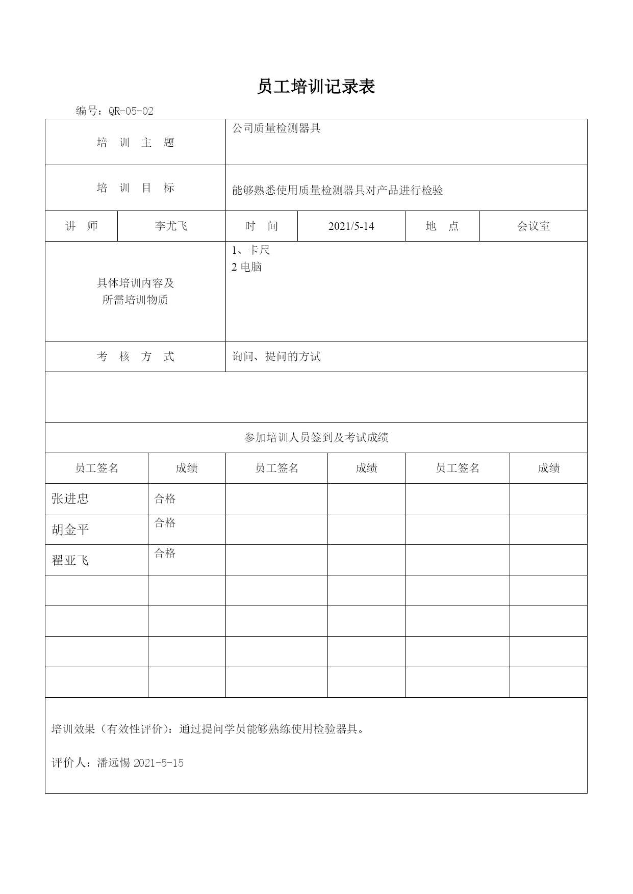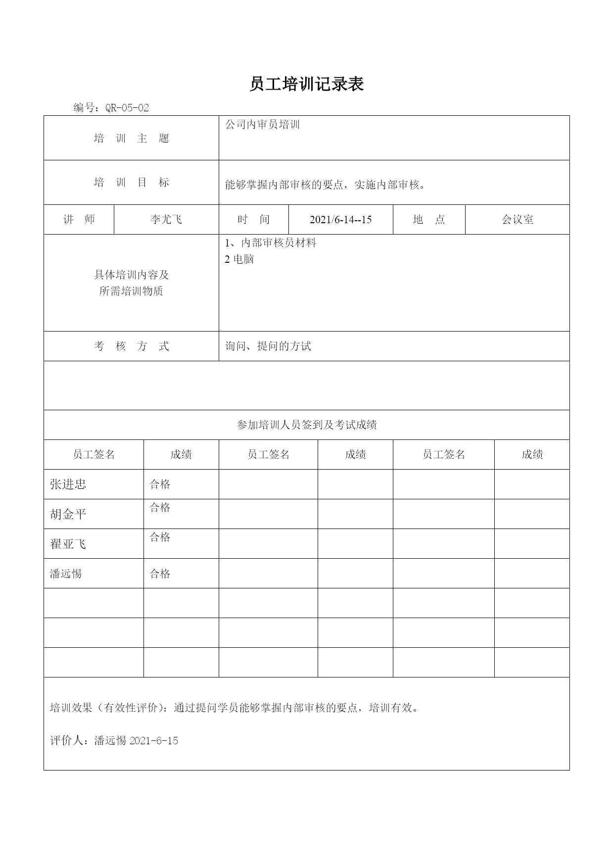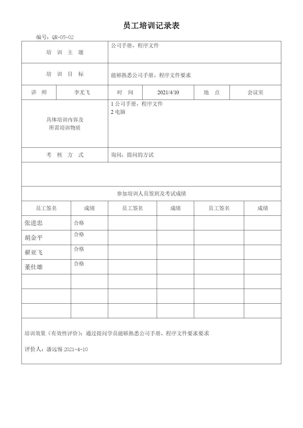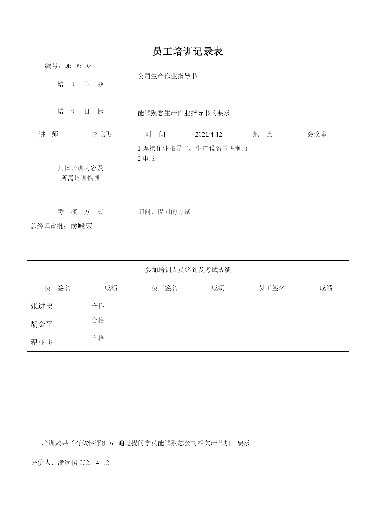 员工培训记录表优质资料(可以直接使用,可编辑优质资料,欢迎下载)员工培训记录表编号:QR-05-02培训主题GB/T19001\GB/T28001标准培训培训目标理解GB/T19001\GB/T28001标准条款要求。讲师李尤飞时间2021/3/1-2地点会议室具体培训内容及所需培训物质1、GB/T19001\GB/T28001标准2、电脑考核方式询问、提问的方试参加培训人员签到及考试成绩员工签名成绩员工签名成绩员工签名成绩张进忠合格胡金平合格翟亚飞合格培训效果(有效性评价):通过提问学员能够了解GB/T19001\GB/T28001标准要求评价人:潘远惕2021-3-3员工培训记录表编号:QR-05-02培训主题公司手册、程序文件培训目标能够熟悉公司手册、程序文件要求讲师李尤飞时间2021/4/10地点会议室具体培训内容及所需培训物质1公司手册、程序文件2电脑考核方式询问、提问的方试参加培训人员签到及考试成绩员工签名成绩员工签名成绩员工签名成绩张进忠合格胡金平合格翟亚飞合格董仕雄合格培训效果(有效性评价):通过提问学员能够熟悉公司手册、程序文件要求要求评价人:潘远惕2021-4-10员工培训记录表编号:QR-05-02培训主题公司生产作业指导书培训目标能够熟悉生产作业指导书的要求讲师李尤飞时间2021/4-12地点会议室具体培训内容及所需培训物质1焊接作业指导书、生产设备管理制度2电脑考核方式询问、提问的方试总经理审批:侯殿荣参加培训人员签到及考试成绩员工签名成绩员工签名成绩员工签名成绩张进忠合格胡金平合格翟亚飞合格培训效果(有效性评价):通过提问学员能够熟悉公司相关产品加工要求评价人:潘远惕2021-4-12员工培训记录表编号:QR-05-02培训主题公司质量检测器具培训目标能够熟悉使用质量检测器具对产品进行检验讲师李尤飞时间2021/5-14地点会议室具体培训内容及所需培训物质1、卡尺2电脑考核方式询问、提问的方试参加培训人员签到及考试成绩员工签名成绩员工签名成绩员工签名成绩张进忠合格胡金平合格翟亚飞合格培训效果(有效性评价):通过提问学员能够熟练使用检验器具。评价人:潘远惕2021-5-15员工培训记录表编号:QR-05-02培训主题公司内审员培训培训目标能够掌握内部审核的要点,实施内部审核。讲师李尤飞时间2021/6-14--15地点会议室具体培训内容及所需培训物质1、内部审核员材料2电脑考核方式询问、提问的方试参加培训人员签到及考试成绩员工签名成绩员工签名成绩员工签名成绩张进忠合格胡金平合格翟亚飞合格潘远惕合格培训效果(有效性评价):通过提问学员能够掌握内部审核的要点,培训有效。评价人:潘远惕2021-6-15员工培训记录表编号:QR-05-02培训主题公司厂纪厂规培训目标能够公司各项厂纪厂规讲师李尤飞时间2021/9/12地点会议室具体培训内容及所需培训物质1厂纪厂规2电脑考核方式询问、提问的方试参加培训人员签到及考试成绩员工签名成绩员工签名成绩员工签名成绩张进忠合格胡金平合格翟亚飞合格董仕雄合格培训效果(有效性评价):通过提问学员能够熟悉公司各项厂规要求评价人:潘远惕2021-9-12员工培训记录表编号:QR-05-02培训主题职业健康安全法律法规培训培训目标能够了解职业健康安全法律法规要求、能遵守相关法律法规讲师李尤飞时间2021/11/2地点会议室具体培训内容及所需培训物质1法律法规2电脑考核方式询问、提问的方试参加培训人员签到及考试成绩员工签名成绩员工签名成绩员工签名成绩张进忠合格胡金平合格翟亚飞合格董仕雄合格培训效果(有效性评价):通过提问学员能够了解职业健康安全法律法规要求。评价人:潘远惕2021-11-2员工培训记录表编号:QR-05-02培训主题应急预案培训培训目标能够了解应急预案要求讲师李尤飞时间2021/12/2地点会议室具体培训内容及所需培训物质1法律法规2电脑考核方式询问、提问的方试参加培训人员签到及考试成绩员工签名成绩员工签名成绩员工签名成绩张进忠合格胡金平合格翟亚飞合格培训效果(有效性评价):通过提问学员能够了解应急预案相关要求。评价人:潘远惕2021-12-2员工安全教育培训一、安全宣传教育1、加强安全生产教育宣传工作,在各部门车间或安全宣传栏贴上安全宣传标语,以不断提醒各位员工“安全生产宣传日”该日对当月安全活动进行总结评比,同时对全厂员工进行技能或书面考核,采取奖惩和自然淘汰制。二、新进员工