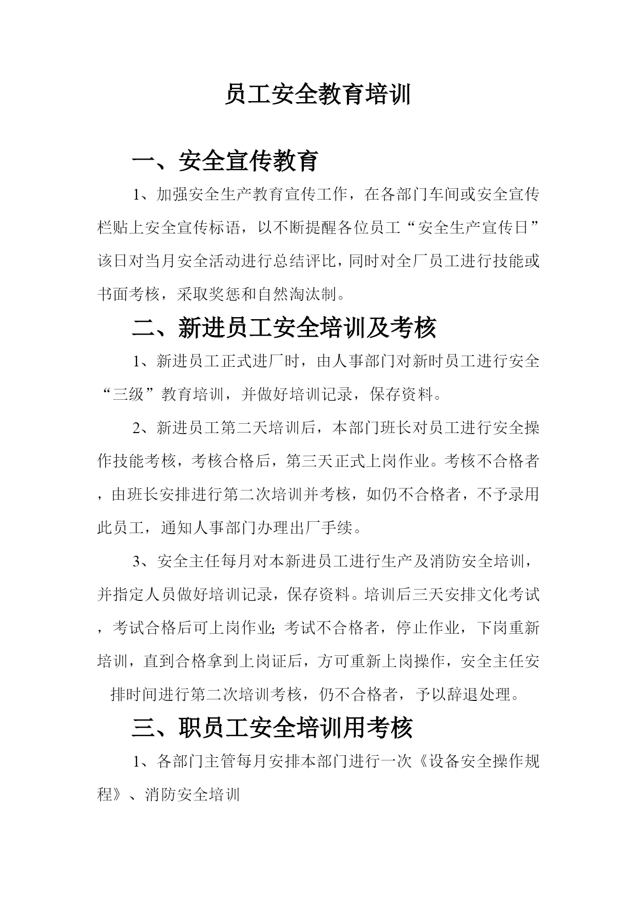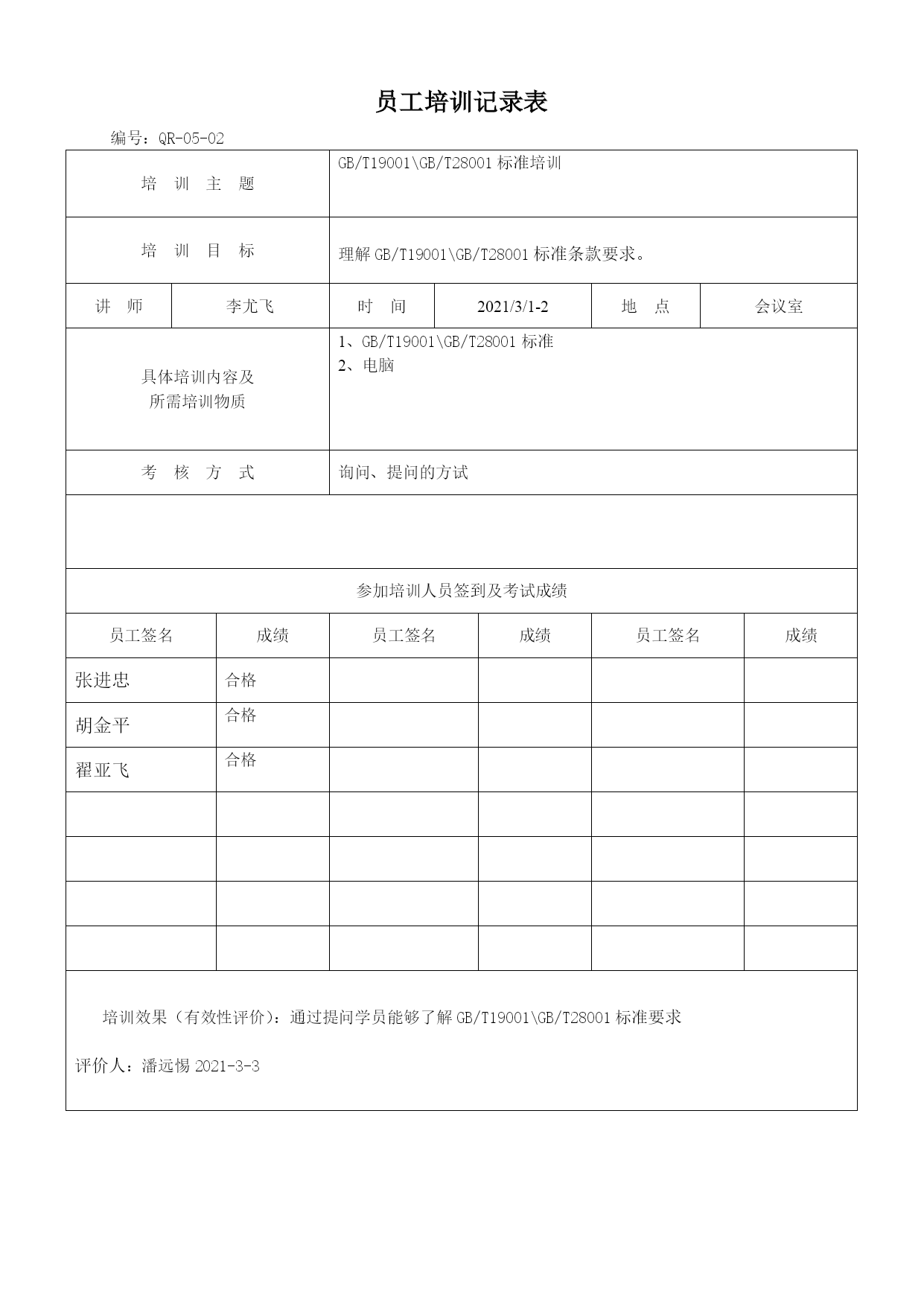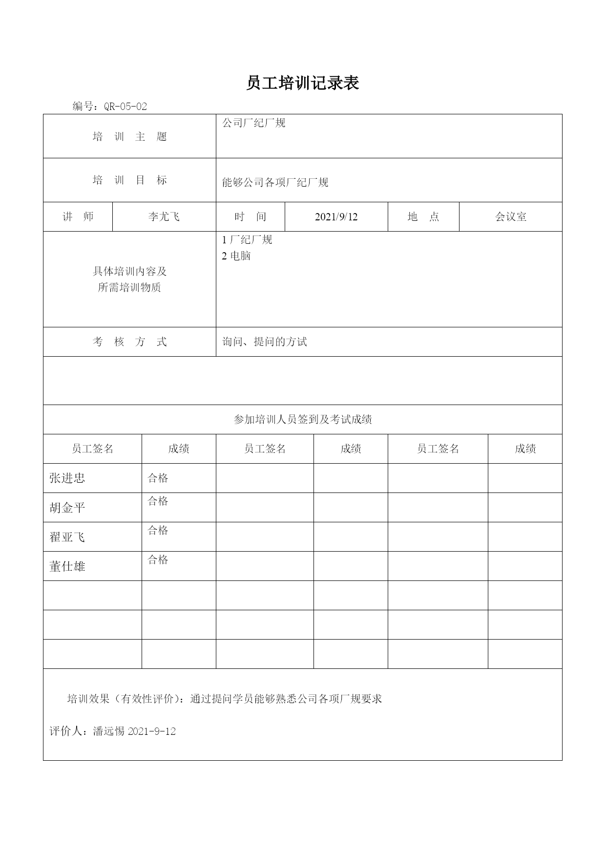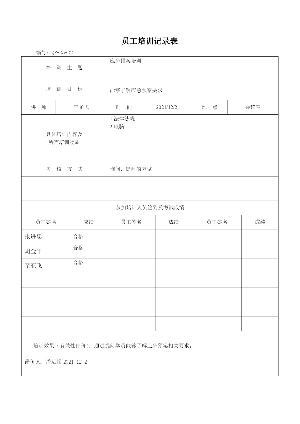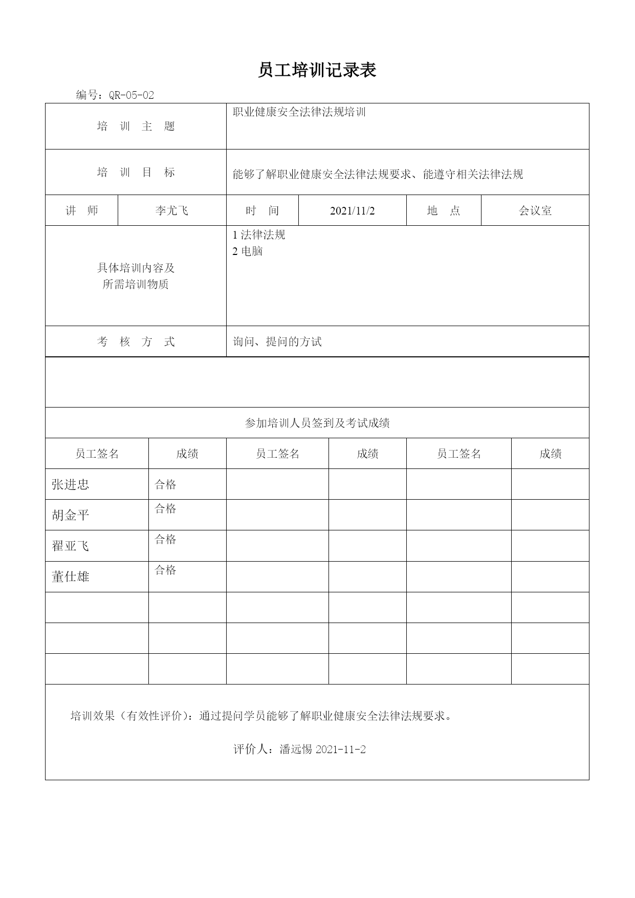 员工培训记录表优质资料(可以直接使用,可编辑优质资料,欢迎下载)员工培训记录表编号:QR-05-02培训主题GB/T19001\GB/T28001标准培训培训目标理解GB/T19001\GB/T28001标准条款要求。讲师李尤飞时间2021/3/1-2地点会议室具体培训内容及所需培训物质1、GB/T19001\GB/T28001标准2、电脑考核方式询问、提问的方试参加培训人员签到及考试成绩员工签名成绩员工签名成绩员工签名成绩张进忠合格胡金平合格翟亚飞合格培训效果(有效性评价):通过提问学员能够了解GB/T19001\GB/T28001标准要求评价人:潘远惕2021-3-3员工培训记录表编号:QR-05-02培训主题公司手册、程序文件培训目标能够熟悉公司手册、程序文件要求讲师李尤飞时间2021/4/10地点会议室具体培训内容及所需培训物质1公司手册、程序文件2电脑考核方式询问、提问的方试参加培训人员签到及考试成绩员工签名成绩员工签名成绩员工签名成绩张进忠合格胡金平合格翟亚飞合格董仕雄合格培训效果(有效性评价):通过提问学员能够熟悉公司手册、程序文件要求要求评价人:潘远惕2021-4-10员工培训记录表编号:QR-05-02培训主题公司生产作业指导书培训目标能够熟悉生产作业指导书的要求讲师李尤飞时间2021/4-12地点会议室具体培训内容及所需培训物质1焊接作业指导书、生产设备管理制度2电脑考核方式询问、提问的方试总经理审批:侯殿荣参加培训人员签到及考试成绩员工签名成绩员工签名成绩员工签名成绩张进忠合格胡金平合格翟亚飞合格培训效果(有效性评价):通过提问学员能够熟悉公司相关产品加工要求评价人:潘远惕2021-4-12员工培训记录表编号:QR-05-02培训主题公司质量检测器具培训目标能够熟悉使用质量检测器具对产品进行检验讲师李尤飞时间2021/5-14地点会议室具体培训内容及所需培训物质1、卡尺2电脑考核方式询问、提问的方试参加培训人员签到及考试成绩员工签名成绩员工签名成绩员工签名成绩张进忠合格胡金平合格翟亚飞合格培训效果(有效性评价):通过提问学员能够熟练使用检验器具。评价人:潘远惕2021-5-15员工培训记录表编号:QR-05-02培训主题公司内审员培训培训目标能够掌握内部审核的要点,实施内部审核。讲师李尤飞时间2021/6-14--15地点会议室具体培训内容及所需培训物质1、内部审核员材料2电脑考核方式询问、提问的方试参加培训人员签到及考试成绩员工签名成绩员工签名成绩员工签名成绩张进忠合格胡金平合格翟亚飞合格潘远惕合格培训效果(有效性评价):通过提问学员能够掌握内部审核的要点,培训有效。评价人:潘远惕2021-6-15员工培训记录表编号:QR-05-02培训主题公司厂纪厂规培训目标能够公司各项厂纪厂规讲师李尤飞时间2021/9/12地点会议室具体培训内容及所需培训物质1厂纪厂规2电脑考核方式询问、提问的方试参加培训人员签到及考试成绩员工签名成绩员工签名成绩员工签名成绩张进忠合格胡金平合格翟亚飞合格董仕雄合格培训效果(有效性评价):通过提问学员能够熟悉公司各项厂规要求评价人:潘远惕2021-9-12员工培训记录表编号:QR-05-02培训主题职业健康安全法律法规培训培训目标能够了解职业健康安全法律法规要求、能遵守相关法律法规讲师李尤飞时间2021/11/2地点会议室具体培训内容及所需培训物质1法律法规2电脑考核方式询问、提问的方试参加培训人员签到及考试成绩员工签名成绩员工签名成绩员工签名成绩张进忠合格胡金平合格翟亚飞合格董仕雄合格培训效果(有效性评价):通过提问学员能够了解职业健康安全法律法规要求。评价人:潘远惕2021-11-2员工培训记录表编号:QR-05-02培训主题应急预案培训培训目标能够了解应急预案要求讲师李尤飞时间2021/12/2地点会议室具体培训内容及所需培训物质1法律法规2电脑考核方式询问、提问的方试参加培训人员签到及考试成绩员工签名成绩员工签名成绩员工签名成绩张进忠合格胡金平合格翟亚飞合格培训效果(有效性评价):通过提问学员能够了解应急预案相关要求。评价人:潘远惕2021-12-2员工安全教育培训一、安全宣传教育1、加强安全生产教育宣传工作,在各部门车间或安全宣传栏贴上安全宣传标语,以不断提醒各位员工“安全生产宣传日”该日对当月安全活动进行总结评比,同时对全厂员工进行技能或书面考核,采取奖惩和自然淘汰制。二、新进员工