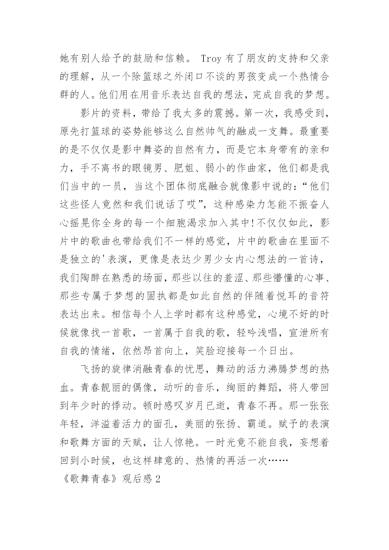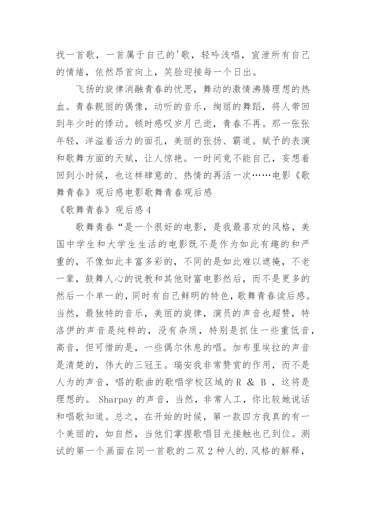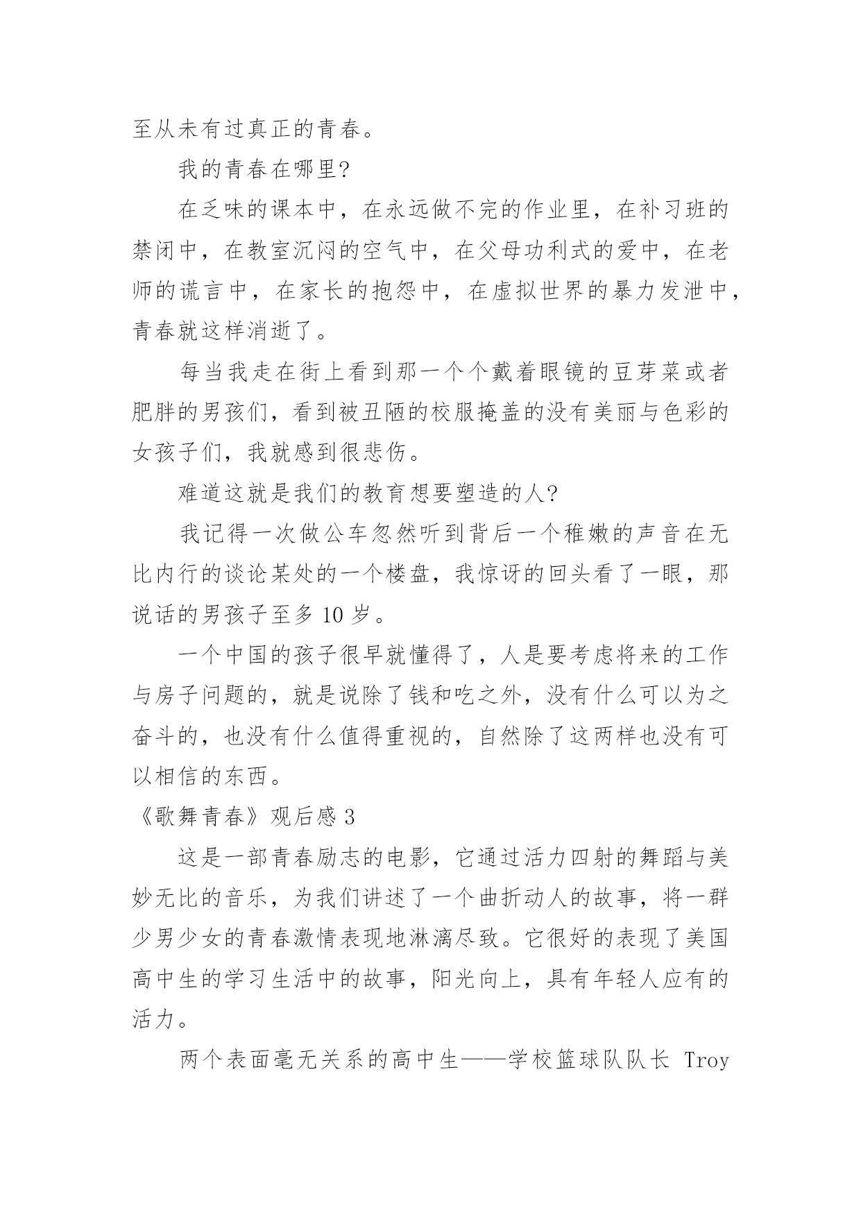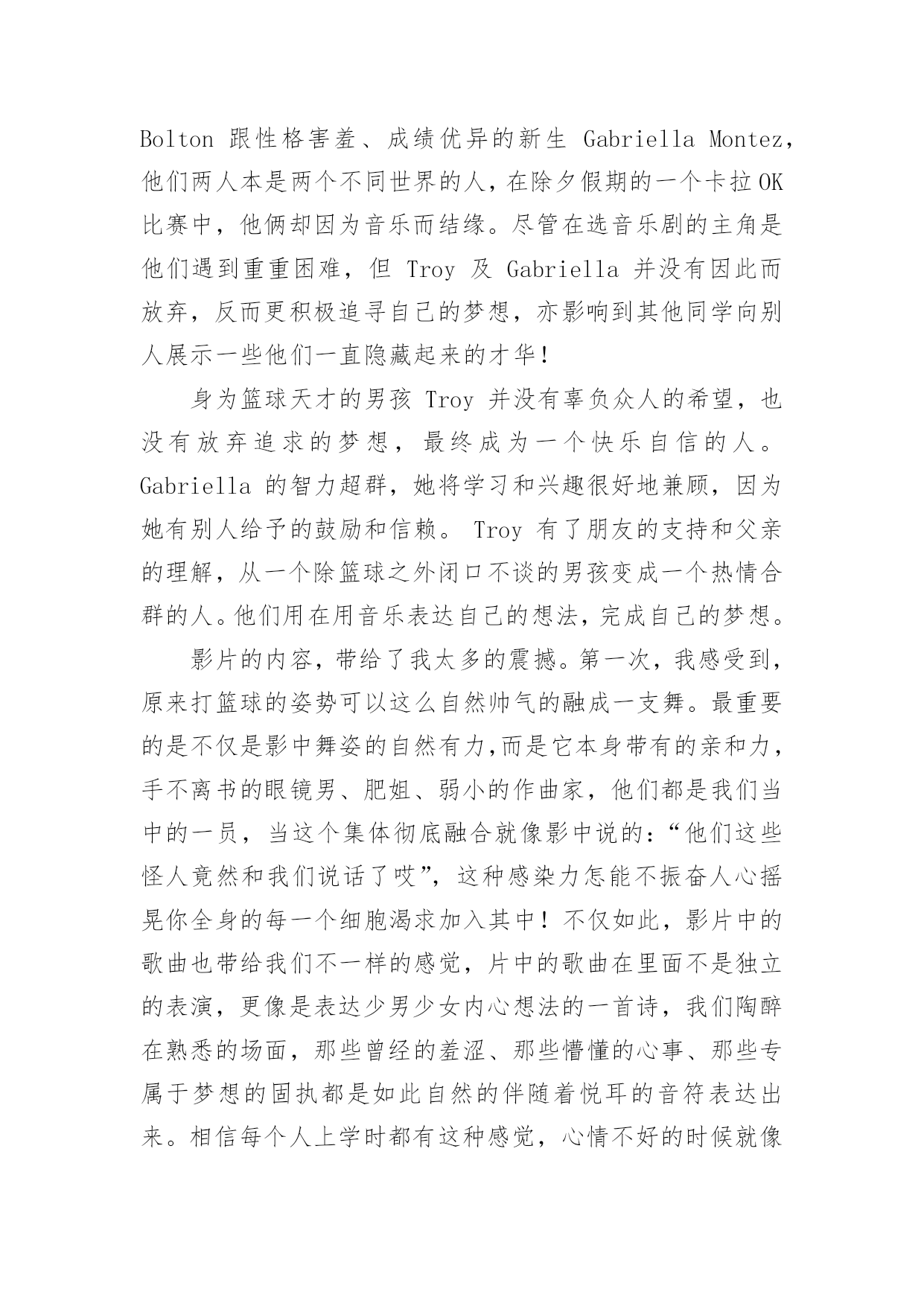 《歌舞青春》观后感《歌舞青春》观后感看完一部影视作品以后,这次观看让你有什么领悟呢?不能光会看哦,写一篇观后感吧。那么我们该怎么去写观后感呢?以下是小编精心整理的《歌舞青春》观后感,供大家参考借鉴,希望可以帮助到有需要的朋友。《歌舞青春》观后感1这是一部青春励志的电影,它经过活力四射的舞蹈与美妙无比的音乐,为我们讲述了一个曲折动人的故事,将一群少男少女的青春活力表现地淋漓尽致。它很好的表现了美国高中生的学习生活中的故事,阳光向上,具有年轻人应有的活力。两个表面毫无关系的高中生——学校篮球队队长TroyBolton跟性格害羞、成绩优异的新生GabriellaMontez,他们两人本是两个不一样世界的人,在除夕假期的一个卡拉OK比赛中,他俩却因为音乐而结缘。尽管在选音乐剧的主角是他们遇到重重困难,但Troy及Gabriella并没有所以而放下,反而更进取追寻自我的梦想,亦影响到其他同学向别人展示一些他们一向隐藏起来的才华!身为篮球天才的男孩Troy并没有辜负众人的期望,也没有放下追求的梦想,最终成为一个欢乐自信的人。Gabriella的智力超群,她将学习和兴趣很好地兼顾,因为她有别人给予的鼓励和信赖。Troy有了朋友的支持和父亲的理解,从一个除篮球之外闭口不谈的男孩变成一个热情合群的人。他们用在用音乐表达自我的想法,完成自我的梦想。影片的资料,带给了我太多的震撼。第一次,我感受到,原先打篮球的姿势能够这么自然帅气的融成一支舞。最重要的是不仅仅是影中舞姿的自然有力,而是它本身带有的亲和力,手不离书的眼镜男、肥姐、弱小的作曲家,他们都是我们当中的一员,当这个团体彻底融合就像影中说的:“他们这些怪人竟然和我们说话了哎”,这种感染力怎能不振奋人心摇晃你全身的每一个细胞渴求加入其中!不仅仅如此,影片中的歌曲也带给我们不一样的感觉,片中的歌曲在里面不是独立的'表演,更像是表达少男少女内心想法的一首诗,我们陶醉在熟悉的场面,那些以往的羞涩、那些懵懂的心事、那些专属于梦想的固执都是如此自然的伴随着悦耳的音符表达出来。相信每个人上学时都有这种感觉,心境不好的时候就像找一首歌,一首属于自我的歌,轻吟浅唱,宣泄所有自我的情绪,依然昂首向上,笑脸迎接每一个日出。飞扬的旋律消融青春的忧思,舞动的活力沸腾梦想的热血。青春靓丽的偶像,动听的音乐,绚丽的舞蹈,将人带回到年少时的悸动。顿时感叹岁月已逝,青春不再。那一张张年轻,洋溢着活力的面孔,美丽的张扬、霸道。赋予的表演和歌舞方面的天赋,让人惊艳。一时光竟不能自我,妄想着回到小时候,也这样肆意的、热情的再活一次……《歌舞青春》观后感2在我的心目中,美国是一个融合了最保守的价值观念与最激情的青春的国家。美国的创造力来自于两方面,一是清教徒文化所倡导的虔诚信仰,努力奋斗的立国理念,二是基于他独特的地理与历史造就的年轻积极的心态,假如这两方面缺少了其中的一个,美国都不会是今天我们见到的这个样子,缺乏信仰,创造力会变成邪恶的智力,少了青春,会丧失人的理想主义。美国的魅力就在于他向世界所展示的一个新的,年轻的,充满自信和活力的梦想,而这梦想的基石就是信仰与创造。一个人没有信仰会堕落,没有勤奋就流于空谈。按照被欧洲艺术电影惯坏了的文艺青年的标准来看,典型的美国校园喜剧非常--傻,俗气,幼稚,而谈到青春,总会想起四百下,死亡诗社,大象,或者牯岭街之类。上述影片是属于非主流的'知识阶层的反思作品,而歌舞青春这类电影则是典型的商业娱乐电影,体现了美国主流价值取向的,并且可以为世界上大多数观众所接受并且喜爱的电影,作为一个普通的观众,在一部电影里看到了纯洁的爱,飞扬的青春,快乐的故事,看到了真,善,美,难道这还不够吗。漂亮健康的姑娘小伙子,欢快风趣的歌舞,明亮鲜艳的色彩,原来青春是这样美好而简单。篮球,戏剧,科学竞赛,年轻人之间那种纯洁的情愫,真挚诚实的友谊,勇敢追求心中的梦想,不畏惧邪恶坚持斗争直到成功,难道这不是一个年轻人本应有的理想吗。我想我们年轻的朋友已经忘记了青春本该有的摸样,甚至从未有过真正的青春。我的青春在哪里?在乏味的课本中,在永远做不完的作业里,在补习班的禁闭中,在教室沉闷的空气中,在父母功利式的爱中,在老师的谎言中,在家长的抱怨中,在虚拟世界的暴力发泄中,青春就这样消逝了。每当我走在街上看到那一个个戴着眼镜的豆芽菜或者肥胖的男孩们,看到被丑陋的校服掩盖的没有美丽与色彩的女孩子们,我就感到很悲伤。难道这就是我们的教育想要塑造的人?我记得一次做公车忽然听到背后一个稚嫩的声音在无比内行的谈论某处的一个楼盘,我惊讶的回头看了一眼,那说话的男孩子至多10岁。一个中国的孩子很早就懂得了,人是要考虑将来的工作与房子问题的,就是说除了钱和吃之外,没有什么可以为之奋斗的,也没有什么值得重视的,自然除了这两样也没有可以相信的东西