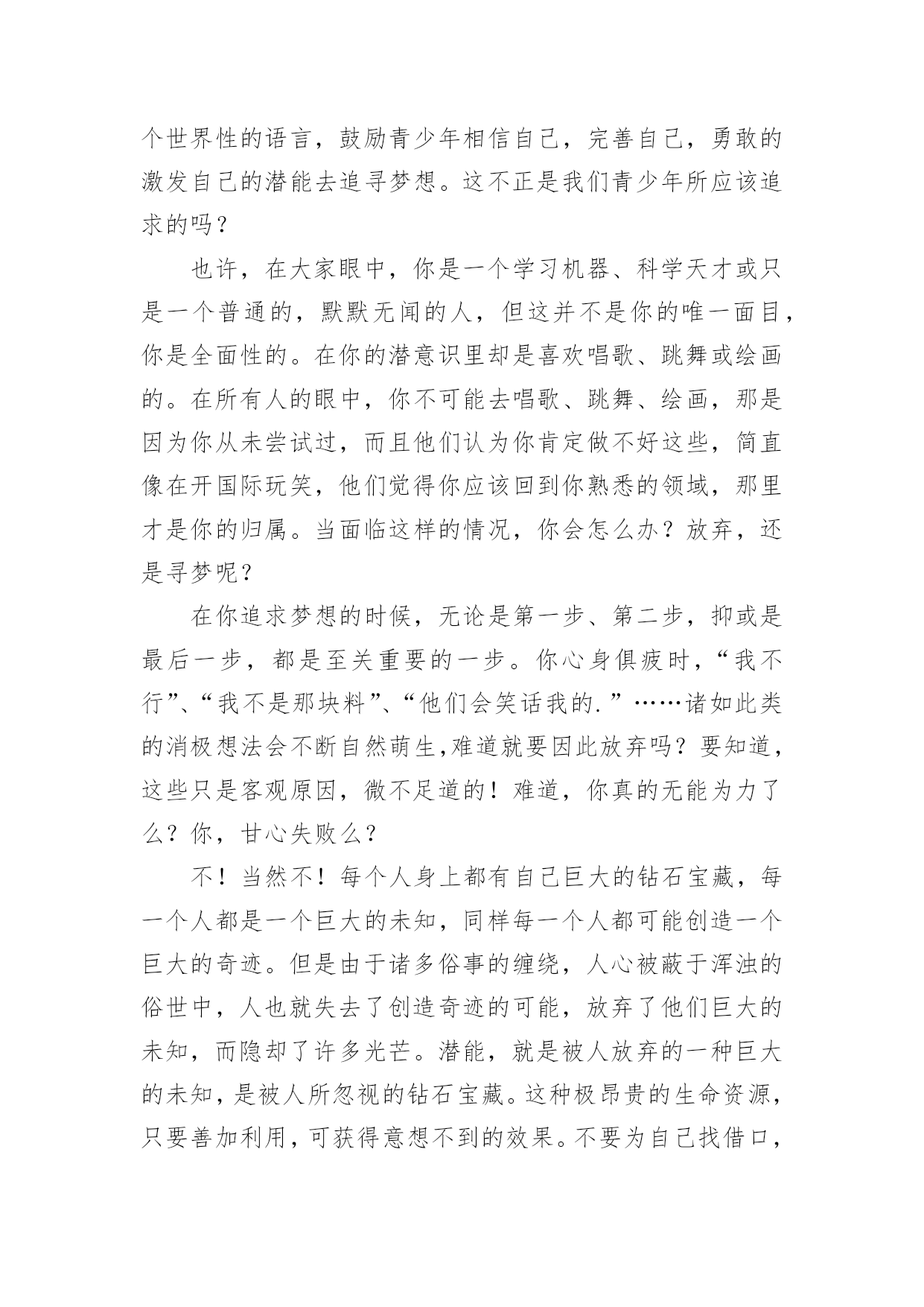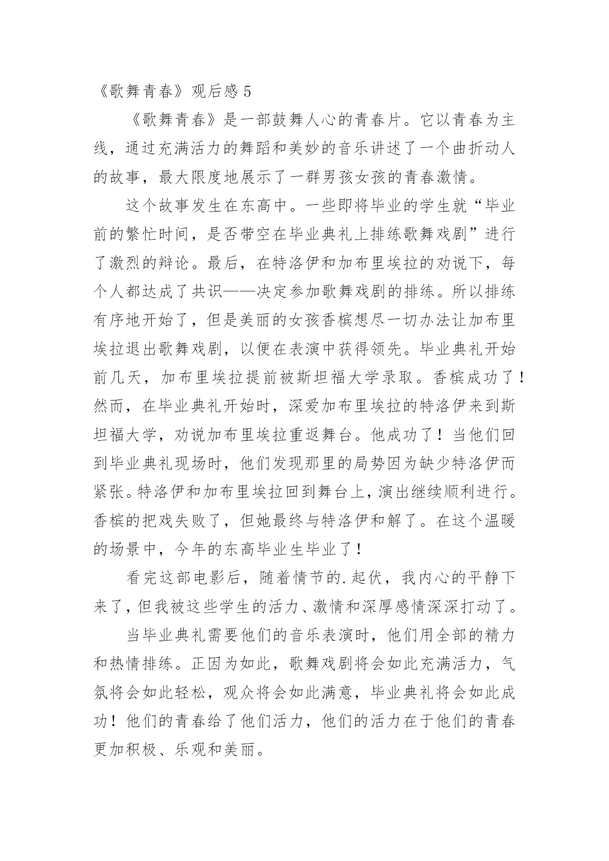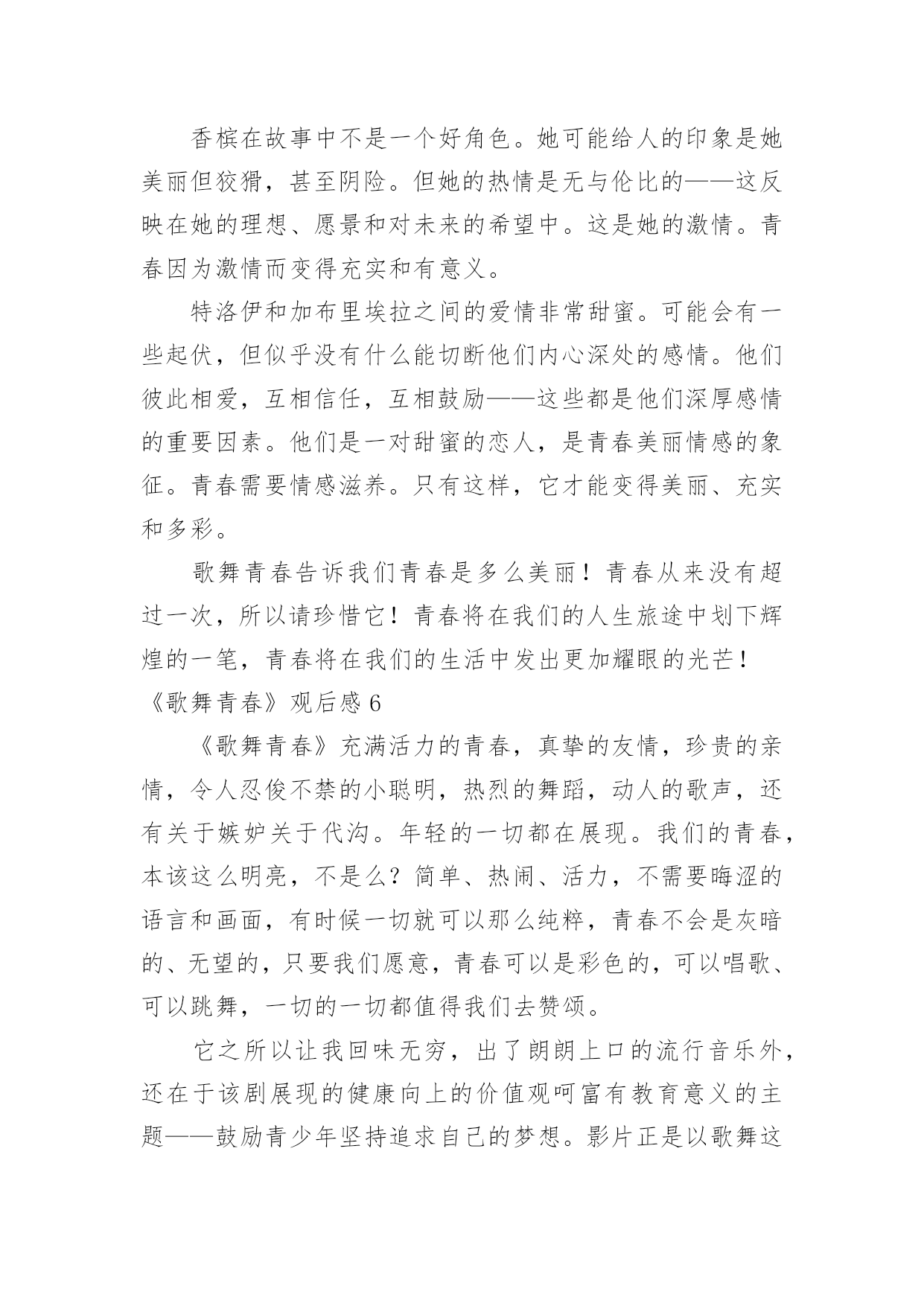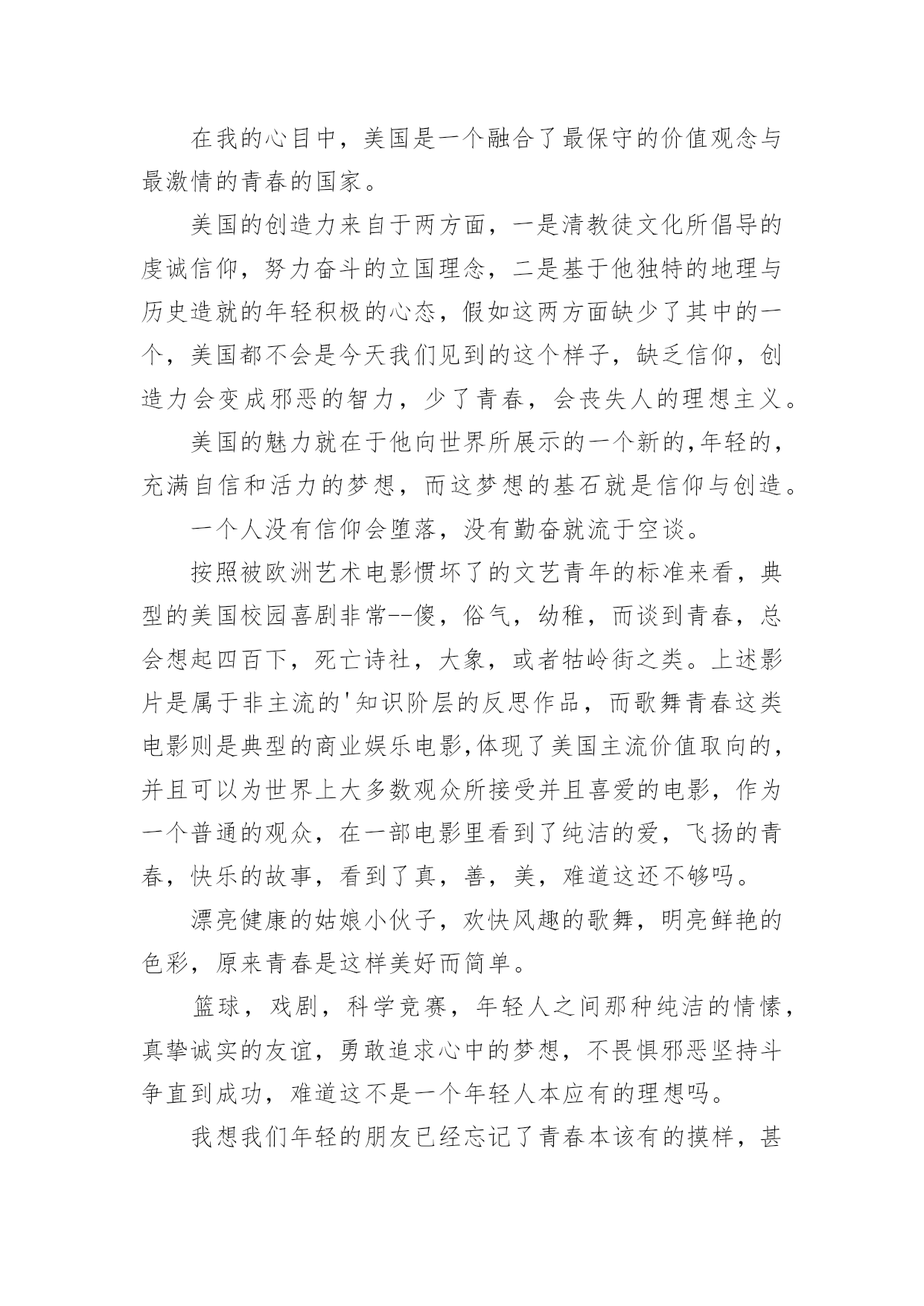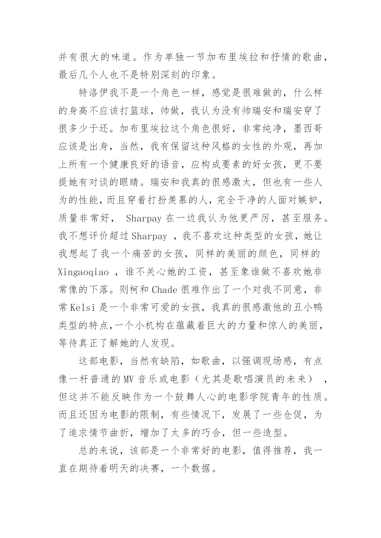 《歌舞青春》观后感《歌舞青春》观后感看完一部影视作品以后,这次观看让你有什么领悟呢?不能光会看哦,写一篇观后感吧。那么我们该怎么去写观后感呢?以下是小编精心整理的《歌舞青春》观后感,供大家参考借鉴,希望可以帮助到有需要的朋友。《歌舞青春》观后感1这是一部青春励志的电影,它经过活力四射的舞蹈与美妙无比的音乐,为我们讲述了一个曲折动人的故事,将一群少男少女的青春活力表现地淋漓尽致。它很好的表现了美国高中生的学习生活中的故事,阳光向上,具有年轻人应有的活力。两个表面毫无关系的高中生——学校篮球队队长TroyBolton跟性格害羞、成绩优异的新生GabriellaMontez,他们两人本是两个不一样世界的人,在除夕假期的一个卡拉OK比赛中,他俩却因为音乐而结缘。尽管在选音乐剧的主角是他们遇到重重困难,但Troy及Gabriella并没有所以而放下,反而更进取追寻自我的梦想,亦影响到其他同学向别人展示一些他们一向隐藏起来的才华!身为篮球天才的男孩Troy并没有辜负众人的期望,也没有放下追求的梦想,最终成为一个欢乐自信的人。Gabriella的智力超群,她将学习和兴趣很好地兼顾,因为她有别人给予的鼓励和信赖。Troy有了朋友的支持和父亲的理解,从一个除篮球之外闭口不谈的男孩变成一个热情合群的人。他们用在用音乐表达自我的想法,完成自我的梦想。影片的资料,带给了我太多的震撼。第一次,我感受到,原先打篮球的姿势能够这么自然帅气的融成一支舞。最重要的是不仅仅是影中舞姿的自然有力,而是它本身带有的亲和力,手不离书的眼镜男、肥姐、弱小的作曲家,他们都是我们当中的一员,当这个团体彻底融合就像影中说的:“他们这些怪人竟然和我们说话了哎”,这种感染力怎能不振奋人心摇晃你全身的每一个细胞渴求加入其中!不仅仅如此,影片中的歌曲也带给我们不一样的感觉,片中的歌曲在里面不是独立的'表演,更像是表达少男少女内心想法的一首诗,我们陶醉在熟悉的场面,那些以往的羞涩、那些懵懂的心事、那些专属于梦想的固执都是如此自然的伴随着悦耳的音符表达出来。相信每个人上学时都有这种感觉,心境不好的时候就像找一首歌,一首属于自我的歌,轻吟浅唱,宣泄所有自我的情绪,依然昂首向上,笑脸迎接每一个日出。飞扬的旋律消融青春的忧思,舞动的活力沸腾梦想的热血。青春靓丽的偶像,动听的音乐,绚丽的舞蹈,将人带回到年少时的悸动。顿时感叹岁月已逝,青春不再。那一张张年轻,洋溢着活力的面孔,美丽的张扬、霸道。赋予的表演和歌舞方面的天赋,让人惊艳。一时光竟不能自我,妄想着回到小时候,也这样肆意的、热情的再活一次……《歌舞青春》观后感2在我的心目中,美国是一个融合了最保守的价值观念与最激情的青春的国家。美国的创造力来自于两方面,一是清教徒文化所倡导的虔诚信仰,努力奋斗的立国理念,二是基于他独特的地理与历史造就的年轻积极的心态,假如这两方面缺少了其中的一个,美国都不会是今天我们见到的这个样子,缺乏信仰,创造力会变成邪恶的智力,少了青春,会丧失人的理想主义。美国的魅力就在于他向世界所展示的一个新的,年轻的,充满自信和活力的梦想,而这梦想的基石就是信仰与创造。一个人没有信仰会堕落,没有勤奋就流于空谈。按照被欧洲艺术电影惯坏了的文艺青年的标准来看,典型的美国校园喜剧非常--傻,俗气,幼稚,而谈到青春,总会想起四百下,死亡诗社,大象,或者牯岭街之类。上述影片是属于非主流的'知识阶层的反思作品,而歌舞青春这类电影则是典型的商业娱乐电影,体现了美国主流价值取向的,并且可以为世界上大多数观众所接受并且喜爱的电影,作为一个普通的观众,在一部电影里看到了纯洁的爱,飞扬的青春,快乐的故事,看到了真,善,美,难道这还不够吗。漂亮健康的姑娘小伙子,欢快风趣的歌舞,明亮鲜艳的色彩,原来青春是这样美好而简单。篮球,戏剧,科学竞赛,年轻人之间那种纯洁的情愫,真挚诚实的友谊,勇敢追求心中的梦想,不畏惧邪恶坚持斗争直到成功,难道这不是一个年轻人本应有的理想吗。我想我们年轻的朋友已经忘记了青春本该有的摸样,甚至从未有过真正的青春。我的青春在哪里?在乏味的课本中,在永远做不完的作业里,在补习班的禁闭中,在教室沉闷的空气中,在父母功利式的爱中,在老师的谎言中,在家长的抱怨中,在虚拟世界的暴力发泄中,青春就这样消逝了。每当我走在街上看到那一个个戴着眼镜的豆芽菜或者肥胖的男孩们,看到被丑陋的校服掩盖的没有美丽与色彩的女孩子们,我就感到很悲伤。难道这就是我们的教育想要塑造的人?我记得一次做公车忽然听到背后一个稚嫩的声音在无比内行的谈论某处的一个楼盘,我惊讶的回头看了一眼,那说话的男孩子至多10岁。一个中国的孩子很早就懂得了,人是要考虑将来的工作与房子问题的,就是说除了钱和吃之外,没有什么可以为之奋斗的,也没有什么值得重视的,自然除了这两样也没有可以相信的东西