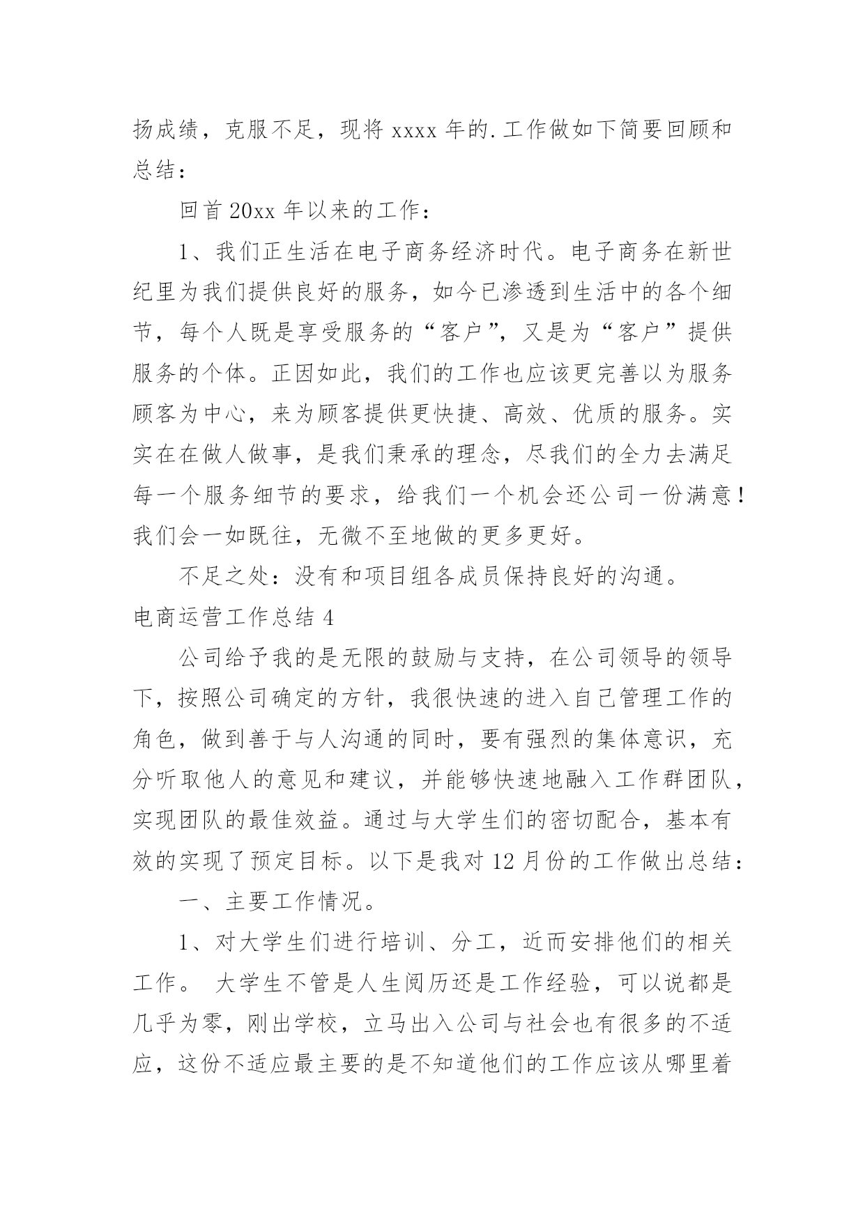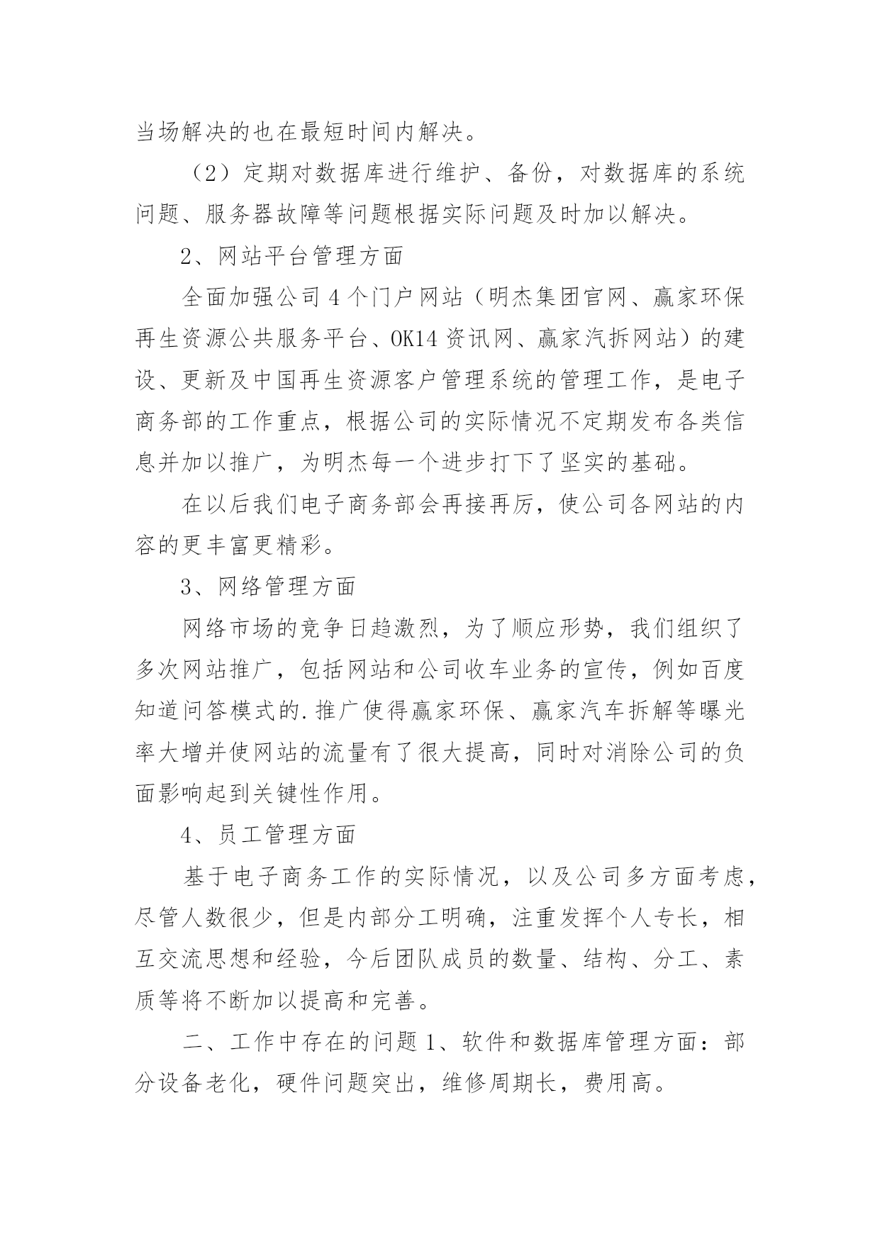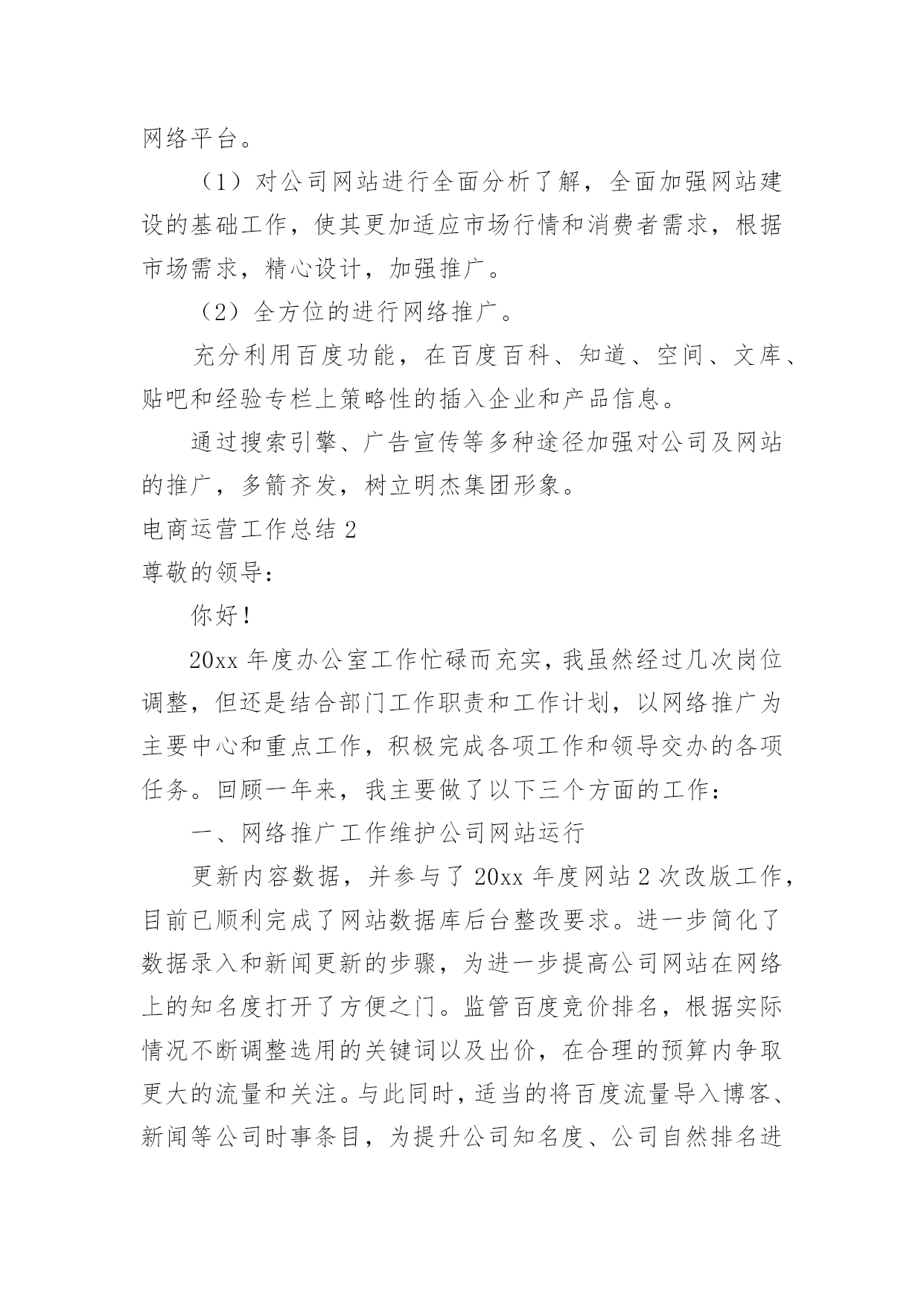 电商运营工作总结电商运营工作总结15篇总结是事后对某一时期、某一项目或某些工作进行回顾和分析,从而做出带有规律性的结论,它可以使我们更有效率,让我们一起来学习写总结吧。那么你知道总结如何写吗?以下是小编精心整理的电商运营工作总结,希望能够帮助到大家。电商运营工作总结1时光荏苒,20xx年即将过去,回顾这一年的工作历程,电子商务部在公司领导的支持和各个部门的配合下,确保了公司网络的正常运行,配合各个部门顺利完成公司的各项工作任务,推进了“搜车网”的开发、制作、测试及全面上线。新的一年意味着新的起点新的机遇新的挑战,希望同大家一道,在20xx年的工作基础上,继续群策群力,为明杰人的明天,携手共进!总结如下:(一)、20xx年工作重点回顾和存在的问题一、工作重点回顾1、软件和数据库管理方面(1)合理安排软件使用流程并制定相关规范,及时响应了各部门的电脑软件的维护,尽可能的降低使用故障,在其出现故障的时候,并做到了能即时解决就即时解决,不能当场解决的也在最短时间内解决。(2)定期对数据库进行维护、备份,对数据库的系统问题、服务器故障等问题根据实际问题及时加以解决。2、网站平台管理方面全面加强公司4个门户网站(明杰集团官网、赢家环保再生资源公共服务平台、OK14资讯网、赢家汽拆网站)的建设、更新及中国再生资源客户管理系统的管理工作,是电子商务部的工作重点,根据公司的实际情况不定期发布各类信息并加以推广,为明杰每一个进步打下了坚实的基础。在以后我们电子商务部会再接再厉,使公司各网站的内容的更丰富更精彩。3、网络管理方面网络市场的竞争日趋激烈,为了顺应形势,我们组织了多次网站推广,包括网站和公司收车业务的宣传,例如百度知道问答模式的.推广使得赢家环保、赢家汽车拆解等曝光率大增并使网站的流量有了很大提高,同时对消除公司的负面影响起到关键性作用。4、员工管理方面基于电子商务工作的实际情况,以及公司多方面考虑,尽管人数很少,但是内部分工明确,注重发挥个人专长,相互交流思想和经验,今后团队成员的数量、结构、分工、素质等将不断加以提高和完善。二、工作中存在的问题1、软件和数据库管理方面:部分设备老化,硬件问题突出,维修周期长,费用高。2、网站平台管理方面:公司动态活动中的照片拍摄不够及时到位,将每一个活动现场真实的展现在了网络人面前,这是网站不可或缺的一部分。3、网络管理方面:网络推广的基础工作还不够扎实,推广效果不尽人意。从推广到消费者认知再到完全接受是一个渐进式的过程,需要不断的推介和宣传,然而我们无论是推介和宣传上都明显不足,将在这个方面将会加大力度。4、员工管理方面:由于部门员工比较年轻,经验不足,应变能力不强,对一些工作协调和处理的不够妥当,今后需加强与相关部门的紧密沟通,更有针对性的工作,开拓思路,使公司的信息化建设走在同行业的前沿,为公司的快速发展奠定基石。(二)、20xx年工作重点和计划一、概述20xx年电子商务部工作仍分为3大块,一是软件和数据库管理方面、二网站平台管理方面、三是网络管理方面。二、工作重点和计划1、软件和数据库管理方面(1)加强设备的检修和保养,对潜在有威胁的设备进行及早处理。(2)改善现有的数据备份机制进行升级,对重要数据再此进行异地自动备份。(3)完善工作流程和操作规范,配合各部门完善和监督操作的措施,从数据管理,病毒防范管理,网络系统操作流程开始规范。(4)在继续完善以上工作的同时,加强学习,提高部门综合素质水平,学习并引入各种的技术,提高服务质量和工作效率。2、网站平台管理方面网站的维护建设开发,主要包括网站的进一步完善和优化,完成对网站诊断、优化,加强网站用户体验、方便运营推广,自己也会加强与各部门之间的联系与沟通,以保证各部门资源及可发布信息能达到最优整合,使网站形象与公司形象达到统一。针对我公司的4个网站,20xx年日常维护更新工作主要包括:(1)监控网站整体运行正常,一旦出现异常,立即解决,解决不了的第一时间联系运营商处理,确保公司网站在互联网上的健康的运行。(2)主要是每个网站的公司动态更新和新闻信息的更新,其他栏目偶尔的个别调整。(3)在线交流和留言板的管理,保证每天查看留言板,遇到客户留言,及时进行处理,确保每天在线,及时解决咨询者的问题。3、网络管理方面我们将在公司现有网络的基础上,合理设计、配置资源,不断完善网站建设,为公司的再度拓展提供一个良好的安全网络平台。(1)对公司网站进行全面分析了解,全面加强网站建设的基础工作,使其更加适应市场行情和消费者需求,根据市场需求,精心设计,加强推广。(2)全方位的进行网络推广。充分利用百度功能,在百度百科、知道、空间、文库、贴吧和经验专栏上策略性的插入企业和产品信息。通过搜索引擎、广告宣传等多种途径加强对公司及网站的推广,多箭齐发,树立明杰集团形象