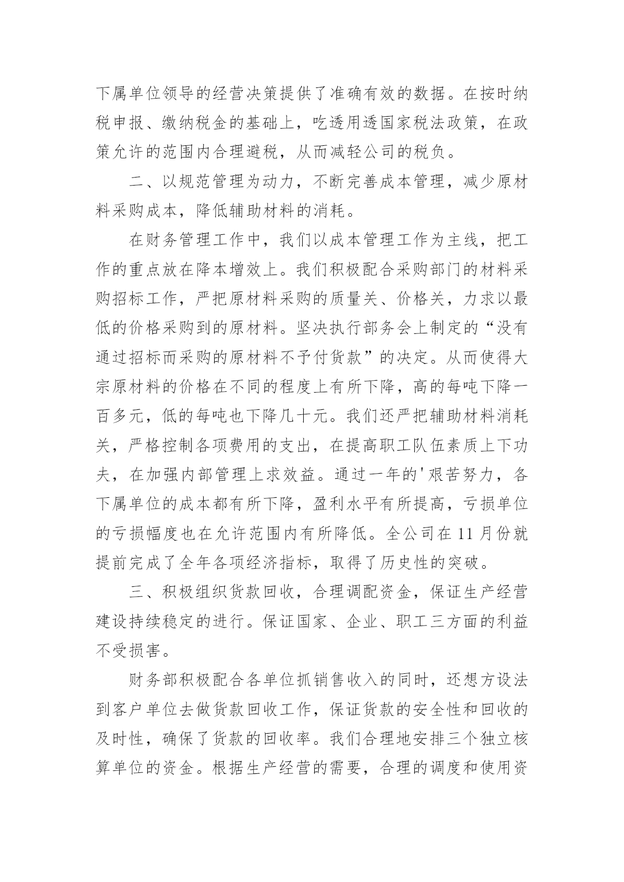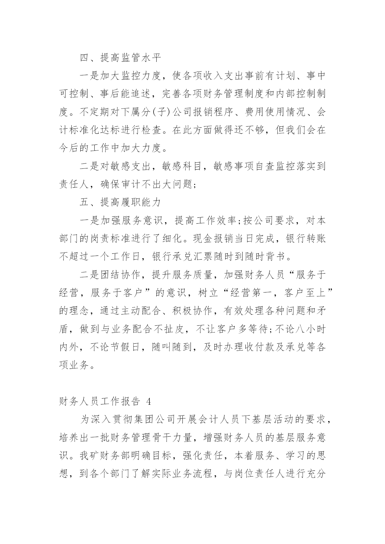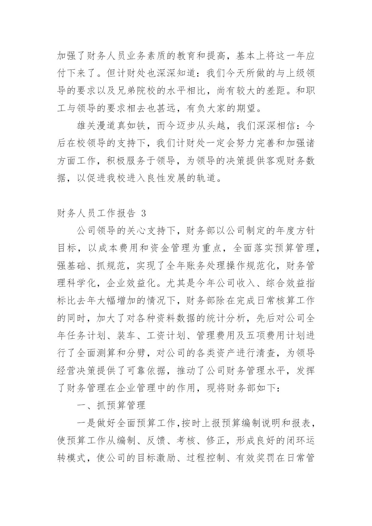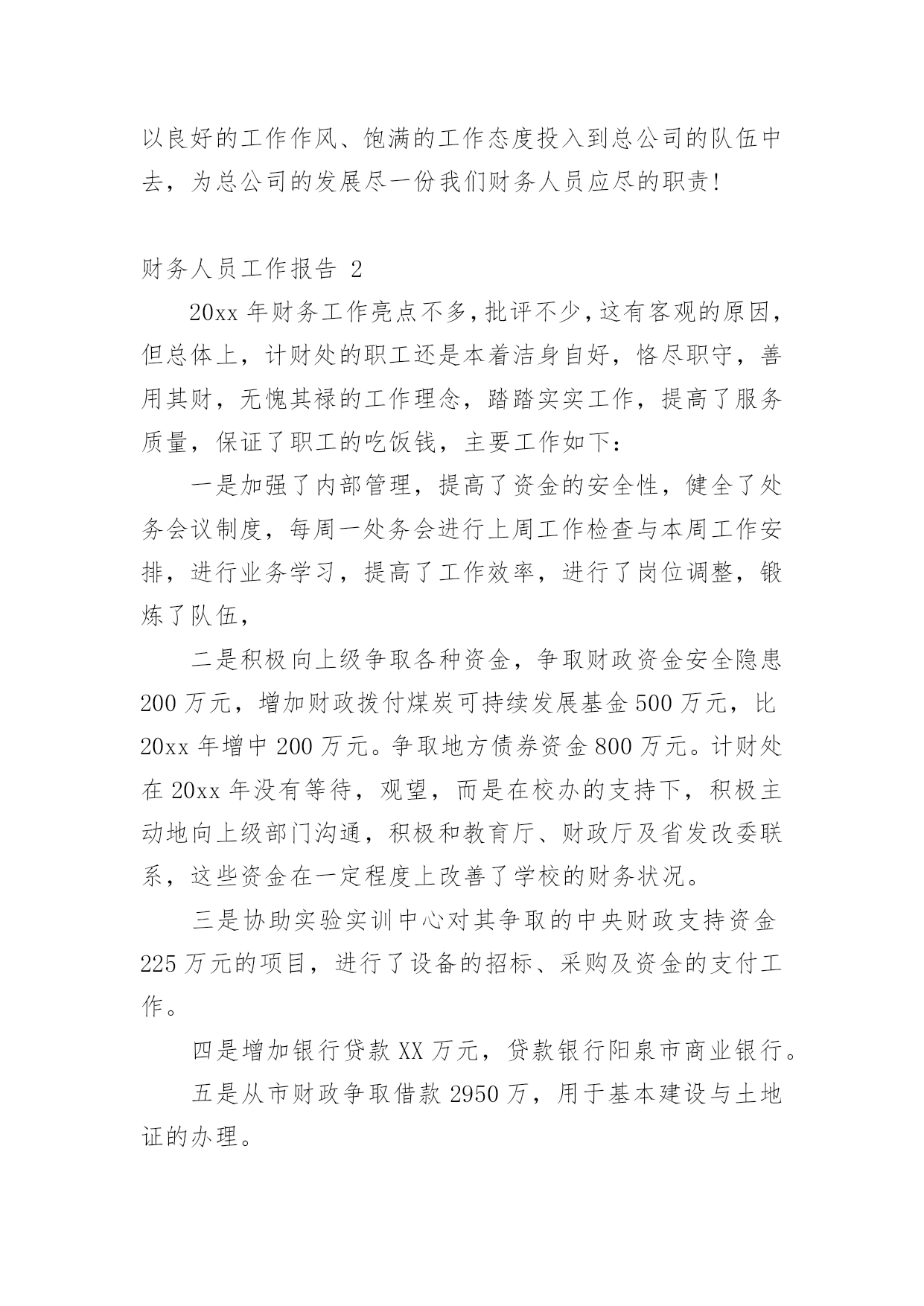 财务人员工作报告随着社会一步步向前发展,越来越多的事务都会使用到报告,多数报告都是在事情做完或发生后撰写的。那么你真正懂得怎么写好报告吗?以下是小编整理的财务人员工作报告,供大家参考借鉴,希望可以帮助到有需要的朋友。财务人员工作报告1xx年,财务部在公司领导的正确指导下,在机关各部门的大力支持下,在下属各单位的通力配合之下,紧紧围绕年初制定的经济责任制目标,认真组织会计核算,规范各项财务基础指标,站在财务管理的角度,以成本为中心,以资金为纽带,不断提高财务服务质量,经过努力取得了一定的成绩。现将一年来的主要工作情况汇报如此:一、严格遵守财务管理制度和税收法规,认真履行职责,组织会计核算。财务部的主要职责是做好财务核算及会计监督工作。我们严格遵守国家财务制度、税收法规及国家的其他财经纪律,认真履行财务部的工作职责。在工作中,我们克服会计少,人手不够的实际情况。分工合作的做好三个独立核算单位的账务处理。严格审核原始凭证,坚决拒收不合符要求的票据,坚决杜绝不合乎要求的费用报销,坚决不办理违反银行结算规定的支付业务。认真记录记账凭证,保证账目清晰明了。及时编制财务会计报表,认真分析财务数据,为公司领导及下属单位领导的经营决策提供了准确有效的数据。在按时纳税申报、缴纳税金的基础上,吃透用透国家税法政策,在政策允许的范围内合理避税,从而减轻公司的税负。二、以规范管理为动力,不断完善成本管理,减少原材料采购成本,降低辅助材料的消耗。在财务管理工作中,我们以成本管理工作为主线,把工作的重点放在降本增效上。我们积极配合采购部门的材料采购招标工作,严把原材料采购的质量关、价格关,力求以最低的价格采购到的原材料。坚决执行部务会上制定的“没有通过招标而采购的原材料不予付货款”的决定。从而使得大宗原材料的价格在不同的程度上有所下降,高的每吨下降一百多元,低的每吨也下降几十元。我们还严把辅助材料消耗关,严格控制各项费用的支出,在提高职工队伍素质上下功夫,在加强内部管理上求效益。通过一年的'艰苦努力,各下属单位的成本都有所下降,盈利水平有所提高,亏损单位的亏损幅度也在允许范围内有所降低。全公司在11月份就提前完成了全年各项经济指标,取得了历史性的突破。三、积极组织货款回收,合理调配资金,保证生产经营建设持续稳定的进行。保证国家、企业、职工三方面的利益不受损害。财务部积极配合各单位抓销售收入的同时,还想方设法到客户单位去做货款回收工作,保证货款的安全性和回收的及时性,确保了货款的回收率。我们合理地安排三个独立核算单位的资金。根据生产经营的需要,合理的调度和使用资金。既要保证生产经营及建设所需要的资金,又要保证税收的按时交纳,还要保证职工工资的及时发放。今年,在资金比较紧张的情况下,我们新增固定资产一百多万元,职工的工资在去年的基础上也有大幅度的提高,生产经营活动也在有序的进行。这与我们遵循将有限的资金用在刀刃上的理念是分不开的。四、密切配合三家整合重组工作,努力跟上总公司的前进步伐,更好更快的融入总公司的队伍中去。今年五月份,三家公司整合重组,这给我们带来了新的希望,注入前进的动力。但同时也给我们带来了大量琐碎的工作。我们在不影响正常财务工作的同时,密切配合清产评估小组。为他们提供多年的凭证、账簿、报表等相关资料。协助他们跑现场,清点固定资产等财产物资,使得资产评估工作得以圆满顺利的完成。在总公司组织的浪潮软件学习中,我们财务人员克服从来没有接触过的困难,加班加点刻苦学习,掌握了从初始化到出报表的操作流程,为明年正式运行浪潮软件打下了坚实的基础。在做明年的财务预算计划时,我们查数据、做工作、分析形势,多方周折,几经移稿,终于完成预算工作任务,为明年的生产经营工作指明了前进的方向。一年来,我们围绕以效益为中心做了大量行之有效的工作,但还是存在一些不足。在明年的工作中,我们将紧紧围绕在总公司领导班子的周围,利用资源共享的平台,学习总公司先进的管理方法和模式。我们要刻苦钻研业务,提高思想素质、管理水平、业务能力,把核算工作做得更细致。以良好的工作作风、饱满的工作态度投入到总公司的队伍中去,为总公司的发展尽一份我们财务人员应尽的职责!财务人员工作报告220xx年财务工作亮点不多,批评不少,这有客观的原因,但总体上,计财处的职工还是本着洁身自好,恪尽职守,善用其财,无愧其禄的工作理念,踏踏实实工作,提高了服务质量,保证了职工的吃饭钱,主要工作如下:一是加强了内部管理,提高了资金的安全性,健全了处务会议制度,每周一处务会进行上周工作检查与本周工作安排,进行业务学习,提高了工作效率,进行了岗位调整,锻炼了队伍,二是积极向上级争取各种资金,争取财政资金安全隐患200万元,增加财政拨付煤炭可持续发展基金500万元,比20xx年增中200万元。争取地方债券资金800万元。计