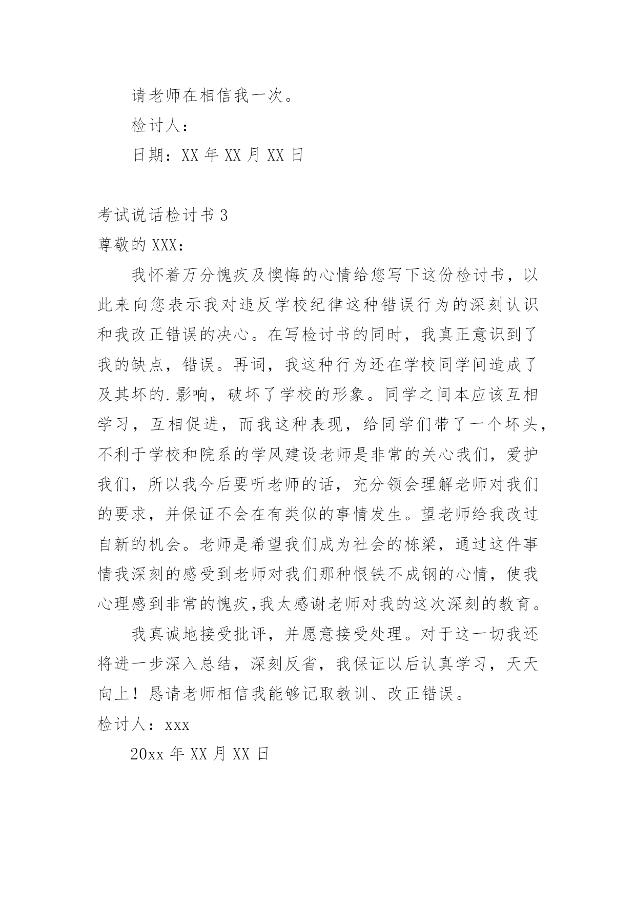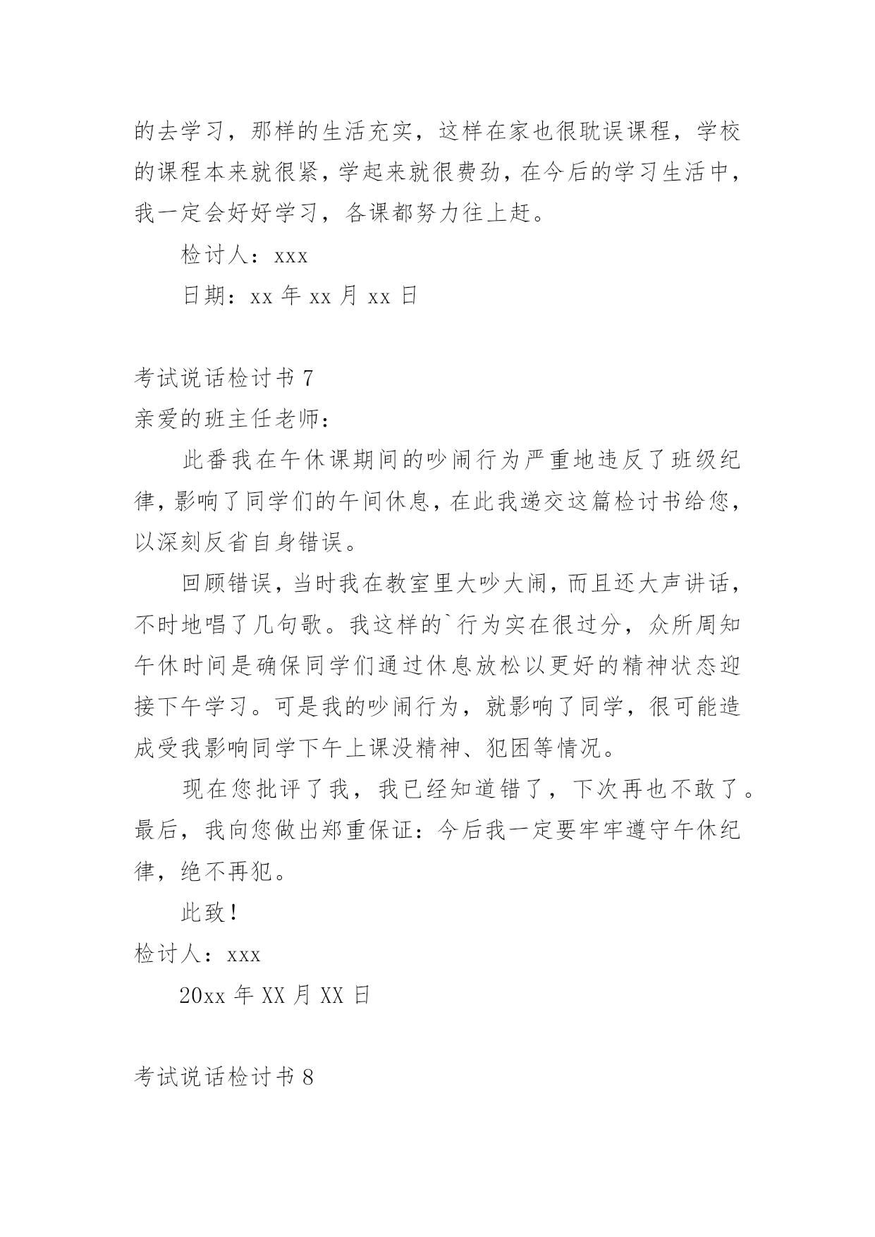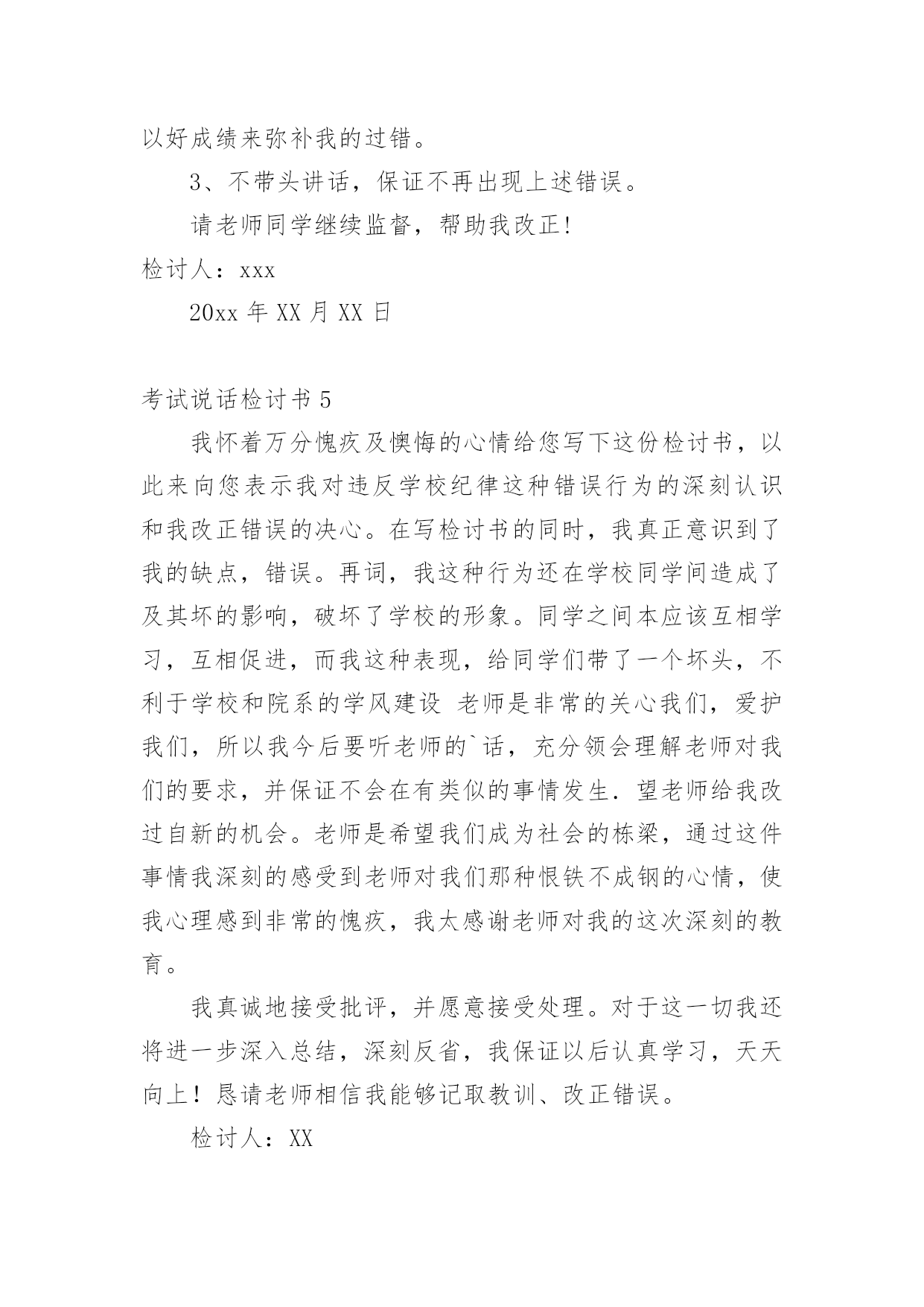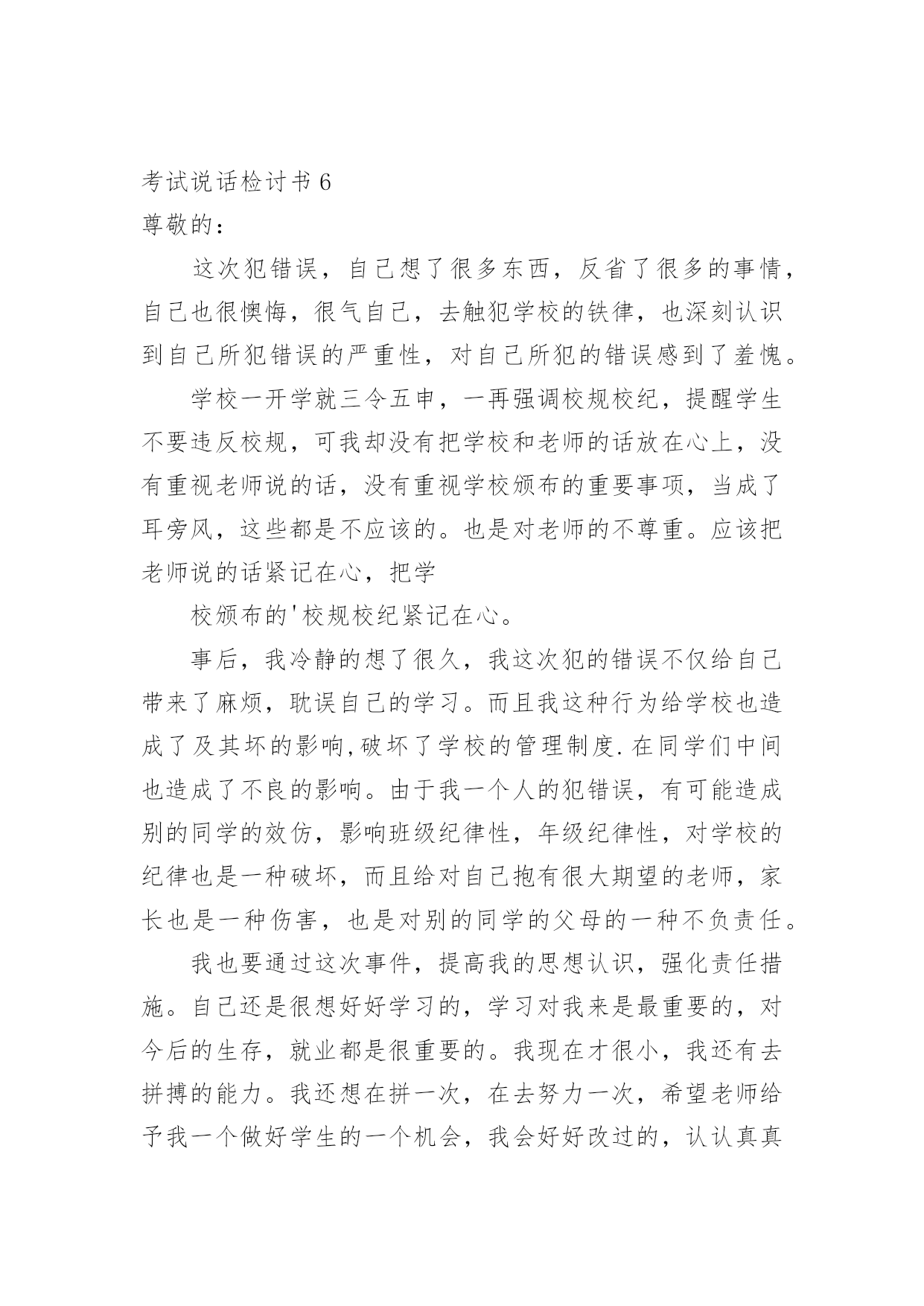 考试说话检讨书在某件事出现失误后,为了避免再次出现相同情况,就需要写一份自我检讨书好好进行自我检讨,写检讨书的时候一定要有承认错误的意识。那么问题来了,到底应如何写检讨书呢?下面是小编帮大家整理的考试说话检讨书,仅供参考,希望能够帮助到大家。考试说话检讨书1尊敬的XXX:这次犯错误,自己想了很多东西,反省了很多的事情,自己也很懊悔,很气自己,去触犯学校的铁律,也深刻认识到自己所犯错误的严重性,对自己所犯的错误感到了羞愧。学校一开学就三令五申,一再强调校规校纪,提醒学生不要违反校规,可我却没有把学校和老师的话放在心上,没有重视老师说的话,没有重视学校颁布的重要事项,当成了耳旁风,这些都是不应该的。也是对老师的不尊重。应该把老师说的话紧记在心,把学校颁布的校规校纪紧记在心。事后,我冷静的想了很久,我这次犯的错误不仅给自己带来了麻烦,耽误自己的学习。而且我这种行为给学校也造成了及其坏的影响,破坏了学校的管理制度。在同学们中间也造成了不良的'影响。由于我一个人的犯错误,有可能造成别的同学的效仿,影响班级纪律性,年级纪律性,对学校的纪律也是一种破坏,而且给对自己抱有很大期望的老师,家长也是一种伤害,也是对别的同学的父母的一种不负责任。我也要通过这次事件,提高我的思想认识,强化责任措施。自己还是很想好好学习的,学习对我来是最重要的,对今后的生存,就业都是很重要的。我现在才很小,我还有去拼搏的能力。我还想在拼一次,在去努力一次,希望老师给予我一个做好学生的一个机会,我会好好改过的,认认真真的去学习,那样的生活充实,这样在家也很耽误课程,学校的课程本来就很紧,学起来就很费劲,在今后的学习生活中,我一定会好好学习,各课都努力往上赶。检讨人:日期:考试说话检讨书2敬爱的老师:今天,我怀着愧疚写下这份检讨书.我对于我这次犯的错误感到很惭愧,我真的不应该在考试的时候说话,我不应该违背老师的规定,因此我感到很抱歉,我希望老师可以原谅我的错误,我这次的悔过真的很深刻。我要避免这样的错误在次发生,希望老师可以原谅我的错误,我可以向老师保证今后一定不会在考试及其他任何课上说话的。我这种行为还在同学间造成了及其坏的'影响,对于这件事情,所造成的严重后果我做了深刻的反思,今后我一定会好好学习,上课不讲话。请老师在相信我一次。检讨人:日期:XX年XX月XX日考试说话检讨书3尊敬的XXX:我怀着万分愧疚及懊悔的心情给您写下这份检讨书,以此来向您表示我对违反学校纪律这种错误行为的深刻认识和我改正错误的决心。在写检讨书的同时,我真正意识到了我的缺点,错误。再词,我这种行为还在学校同学间造成了及其坏的.影响,破坏了学校的形象。同学之间本应该互相学习,互相促进,而我这种表现,给同学们带了一个坏头,不利于学校和院系的学风建设老师是非常的关心我们,爱护我们,所以我今后要听老师的话,充分领会理解老师对我们的要求,并保证不会在有类似的事情发生。望老师给我改过自新的机会。老师是希望我们成为社会的栋梁,通过这件事情我深刻的感受到老师对我们那种恨铁不成钢的心情,使我心理感到非常的愧疚,我太感谢老师对我的这次深刻的教育。我真诚地接受批评,并愿意接受处理。对于这一切我还将进一步深入总结,深刻反省,我保证以后认真学习,天天向上!恳请老师相信我能够记取教训、改正错误。检讨人:xxx20xx年XX月XX日考试说话检讨书4尊敬的XXX:今天,我怀着十二万分的愧疚以及十二万分的懊悔给您写下这份检讨书,以向您表示我对这种不听从老师教诲行为的深痛恶绝及再也不在考试时讲话的决心。早在刚考完月考的时候,您就已经三令五申,一再强调,全班同学,不得在考试时讲话,交流是好事,但学生的首要任务是学习。其时,老师反复教导言犹在耳,严肃认真的表情犹在眼前,我深为震撼。现在也已经深刻认识到此事的严重性,于是我一再告诉自己要把此事当成头等大事来抓,不能辜负老师对我们的一片苦心。今天我考试时随意找同学说话。开始我并没意识到后果的严重性,但是在后来我才发现,我这样可能会影响考试。在深思熟虑后,我决定严格要求自己不再犯。也许我没有很好的文采,写不出深刻的“检讨”。但我内心的歉疚与悔过是什么也丈量不了的。我也会为我自己负责,做一个合格的学生!我也了解到,虽然不能弥补我的过失,但是我可以做得更好!既然老师给我写检查的机会就是相信我可以改过,我将用我的'言行证明我是个守信用、守纪律的人!据上,我决定有如下个人整改措施:1、按照老师要求缴纳保质保量的检讨书一份!对自己思想上的错误根源进行深挖细找的整理,并认清其可能造成的严重后果。2、制定学习计划,决不考试时讲话,努力将月考考好,以好成绩来弥补我的过错。3、不带头讲话,保证不再出现上述错误。请老师同学继续监督,帮助我改正!检讨人:xxx20xx年XX月XX日考试说话检讨书5我怀着万分愧