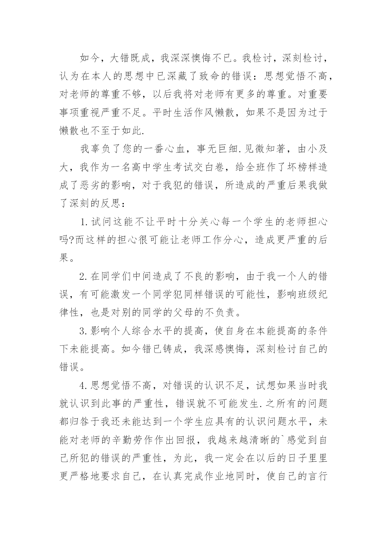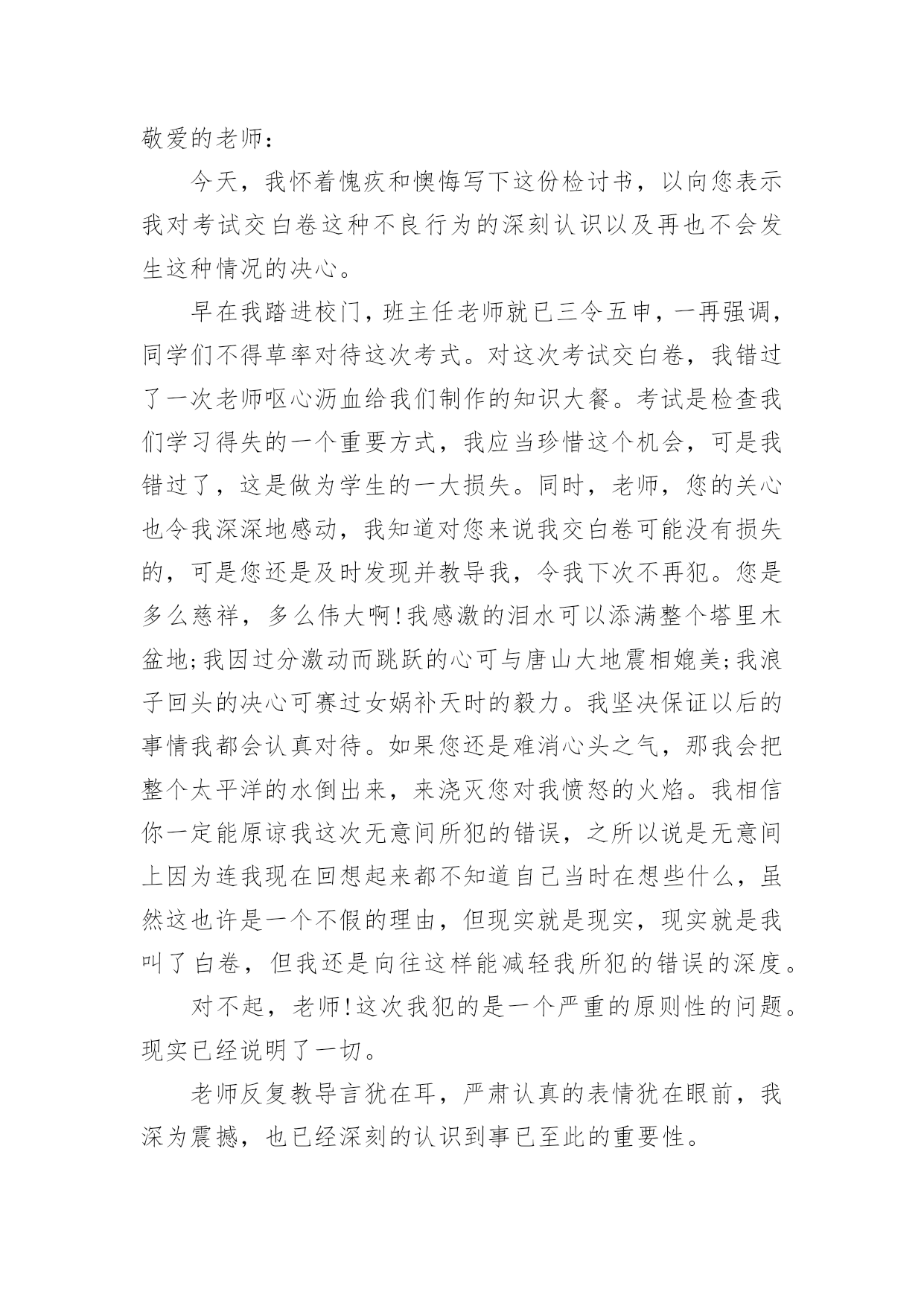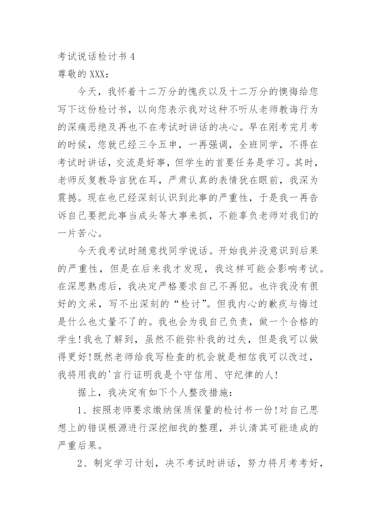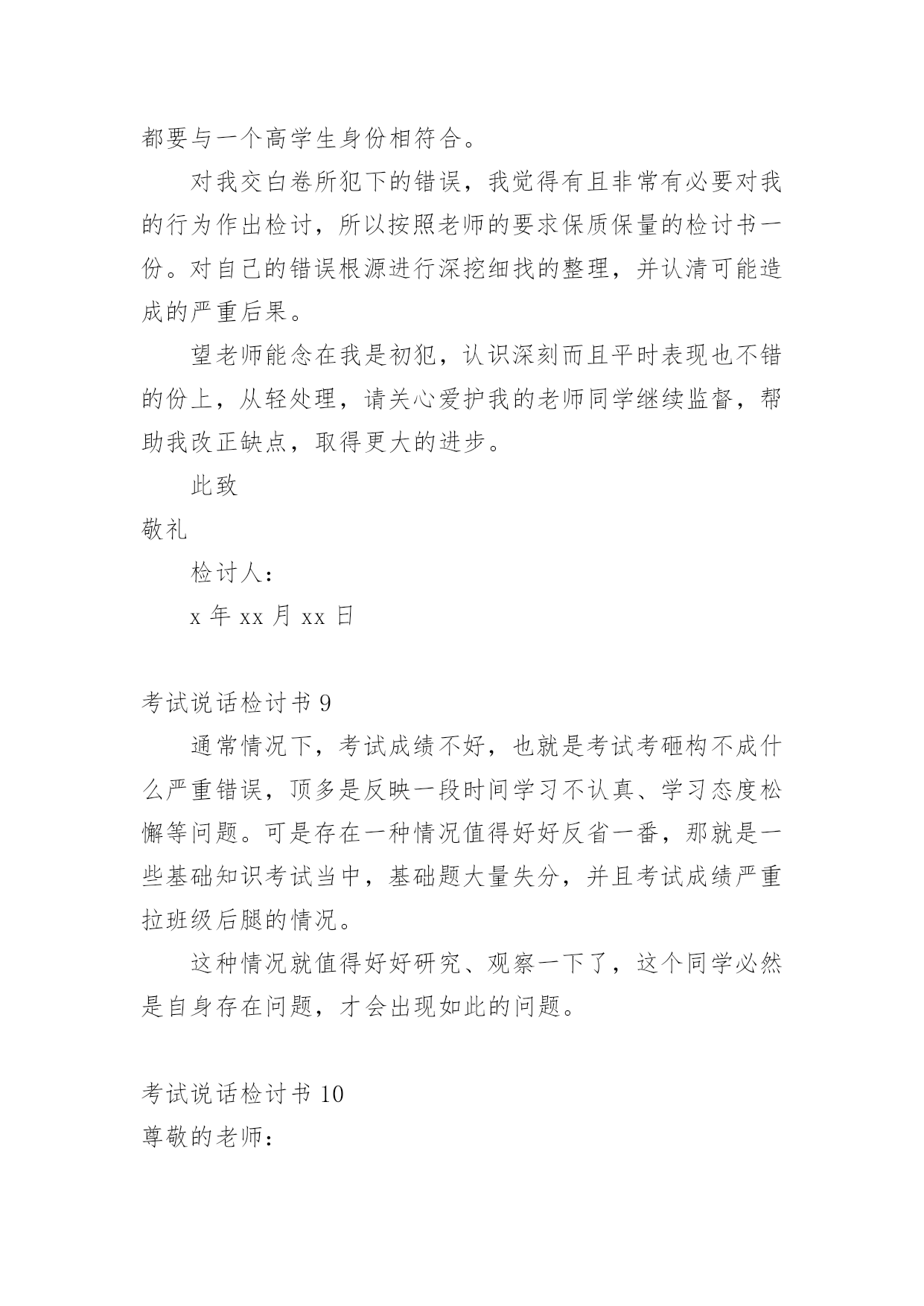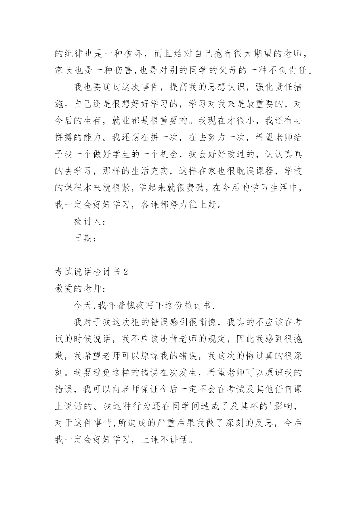 考试说话检讨书在某件事出现失误后,为了避免再次出现相同情况,就需要写一份自我检讨书好好进行自我检讨,写检讨书的时候一定要有承认错误的意识。那么问题来了,到底应如何写检讨书呢?下面是小编帮大家整理的考试说话检讨书,仅供参考,希望能够帮助到大家。考试说话检讨书1尊敬的XXX:这次犯错误,自己想了很多东西,反省了很多的事情,自己也很懊悔,很气自己,去触犯学校的铁律,也深刻认识到自己所犯错误的严重性,对自己所犯的错误感到了羞愧。学校一开学就三令五申,一再强调校规校纪,提醒学生不要违反校规,可我却没有把学校和老师的话放在心上,没有重视老师说的话,没有重视学校颁布的重要事项,当成了耳旁风,这些都是不应该的。也是对老师的不尊重。应该把老师说的话紧记在心,把学校颁布的校规校纪紧记在心。事后,我冷静的想了很久,我这次犯的错误不仅给自己带来了麻烦,耽误自己的学习。而且我这种行为给学校也造成了及其坏的影响,破坏了学校的管理制度。在同学们中间也造成了不良的'影响。由于我一个人的犯错误,有可能造成别的同学的效仿,影响班级纪律性,年级纪律性,对学校的纪律也是一种破坏,而且给对自己抱有很大期望的老师,家长也是一种伤害,也是对别的同学的父母的一种不负责任。我也要通过这次事件,提高我的思想认识,强化责任措施。自己还是很想好好学习的,学习对我来是最重要的,对今后的生存,就业都是很重要的。我现在才很小,我还有去拼搏的能力。我还想在拼一次,在去努力一次,希望老师给予我一个做好学生的一个机会,我会好好改过的,认认真真的去学习,那样的生活充实,这样在家也很耽误课程,学校的课程本来就很紧,学起来就很费劲,在今后的学习生活中,我一定会好好学习,各课都努力往上赶。检讨人:日期:考试说话检讨书2敬爱的老师:今天,我怀着愧疚写下这份检讨书.我对于我这次犯的错误感到很惭愧,我真的不应该在考试的时候说话,我不应该违背老师的规定,因此我感到很抱歉,我希望老师可以原谅我的错误,我这次的悔过真的很深刻。我要避免这样的错误在次发生,希望老师可以原谅我的错误,我可以向老师保证今后一定不会在考试及其他任何课上说话的。我这种行为还在同学间造成了及其坏的'影响,对于这件事情,所造成的严重后果我做了深刻的反思,今后我一定会好好学习,上课不讲话。请老师在相信我一次。检讨人:日期:XX年XX月XX日考试说话检讨书3尊敬的XXX:我怀着万分愧疚及懊悔的心情给您写下这份检讨书,以此来向您表示我对违反学校纪律这种错误行为的深刻认识和我改正错误的决心。在写检讨书的同时,我真正意识到了我的缺点,错误。再词,我这种行为还在学校同学间造成了及其坏的.影响,破坏了学校的形象。同学之间本应该互相学习,互相促进,而我这种表现,给同学们带了一个坏头,不利于学校和院系的学风建设老师是非常的关心我们,爱护我们,所以我今后要听老师的话,充分领会理解老师对我们的要求,并保证不会在有类似的事情发生。望老师给我改过自新的机会。老师是希望我们成为社会的栋梁,通过这件事情我深刻的感受到老师对我们那种恨铁不成钢的心情,使我心理感到非常的愧疚,我太感谢老师对我的这次深刻的教育。我真诚地接受批评,并愿意接受处理。对于这一切我还将进一步深入总结,深刻反省,我保证以后认真学习,天天向上!恳请老师相信我能够记取教训、改正错误。检讨人:xxx20xx年XX月XX日考试说话检讨书4尊敬的XXX:今天,我怀着十二万分的愧疚以及十二万分的懊悔给您写下这份检讨书,以向您表示我对这种不听从老师教诲行为的深痛恶绝及再也不在考试时讲话的决心。早在刚考完月考的时候,您就已经三令五申,一再强调,全班同学,不得在考试时讲话,交流是好事,但学生的首要任务是学习。其时,老师反复教导言犹在耳,严肃认真的表情犹在眼前,我深为震撼。现在也已经深刻认识到此事的严重性,于是我一再告诉自己要把此事当成头等大事来抓,不能辜负老师对我们的一片苦心。今天我考试时随意找同学说话。开始我并没意识到后果的严重性,但是在后来我才发现,我这样可能会影响考试。在深思熟虑后,我决定严格要求自己不再犯。也许我没有很好的文采,写不出深刻的“检讨”。但我内心的歉疚与悔过是什么也丈量不了的。我也会为我自己负责,做一个合格的学生!我也了解到,虽然不能弥补我的过失,但是我可以做得更好!既然老师给我写检查的机会就是相信我可以改过,我将用我的'言行证明我是个守信用、守纪律的人!据上,我决定有如下个人整改措施:1、按照老师要求缴纳保质保量的检讨书一份!对自己思想上的错误根源进行深挖细找的整理,并认清其可能造成的严重后果。2、制定学习计划,决不考试时讲话,努力将月考考好,以好成绩来弥补我的过错。3、不带头讲话,保证不再出现上述错误。请老师同学继续监督,帮助我改正!检讨人:xxx20xx年XX月XX日考试说话检讨书5我怀着万分愧