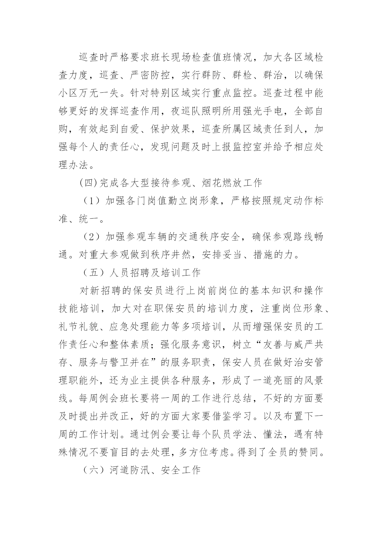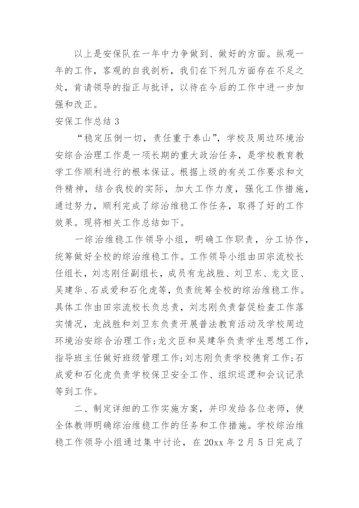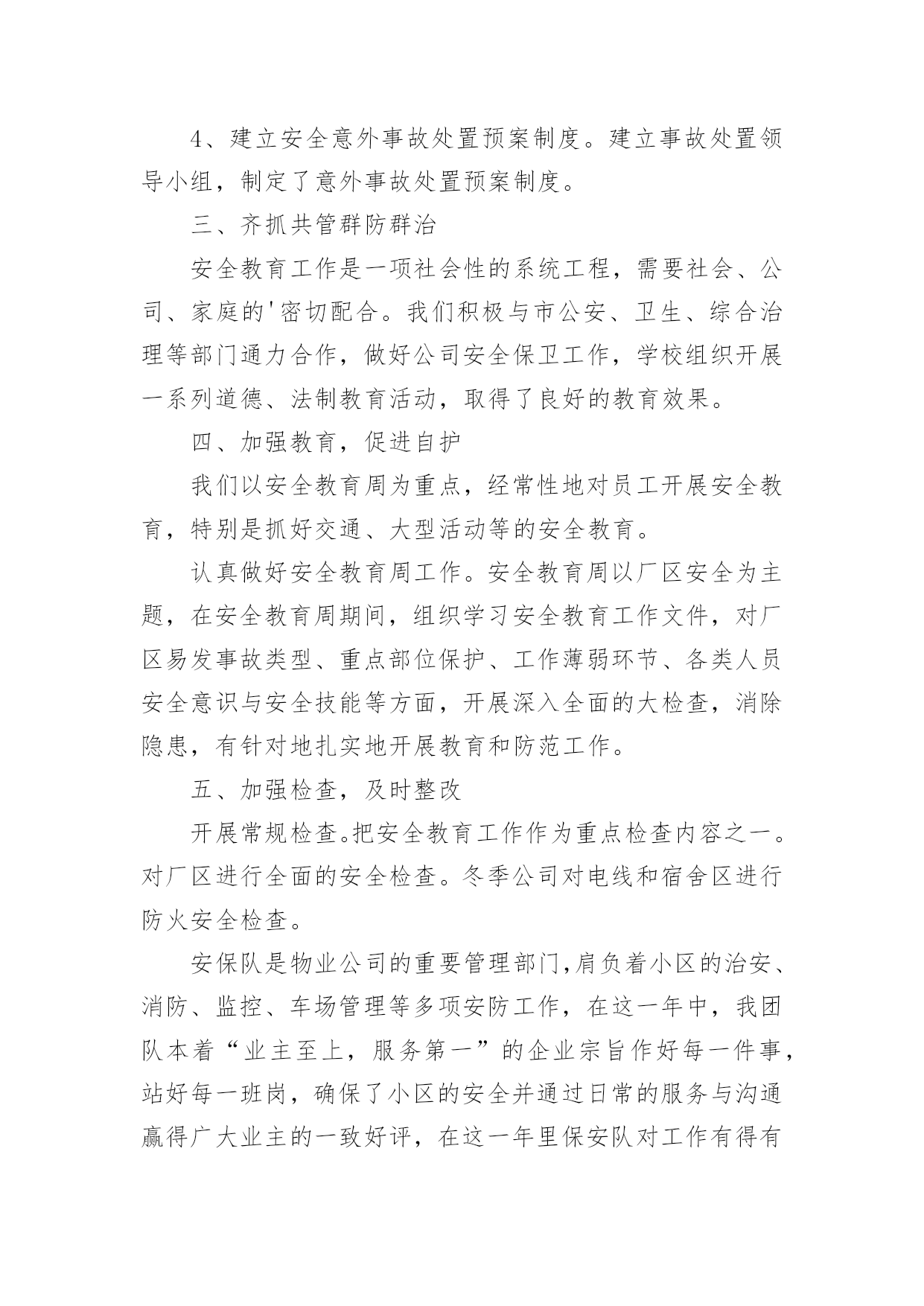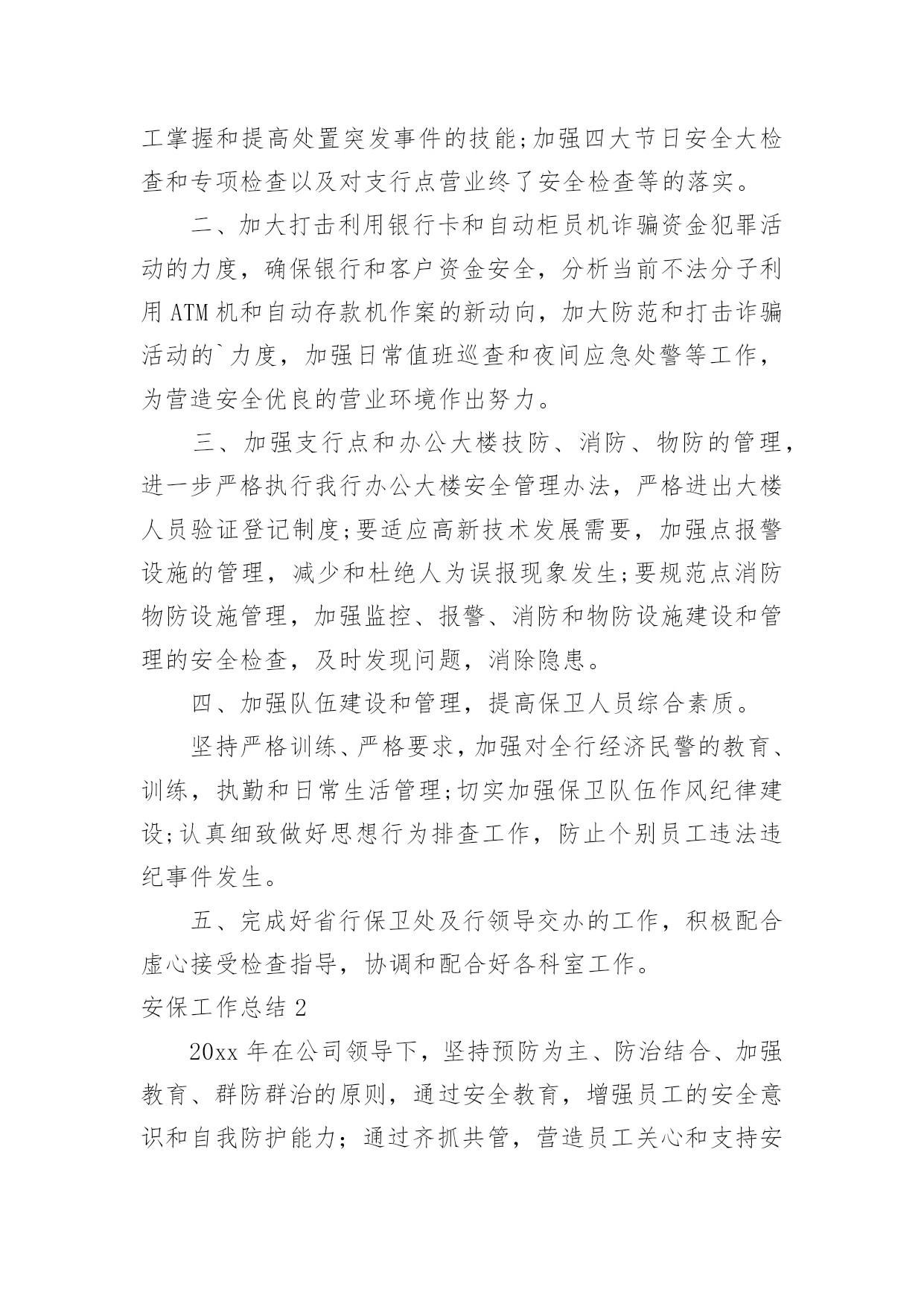安保工作总结安保工作总结总结是对取得的成绩、存在的问题及得到的经验和教训等方面情况进行评价与描述的一种书面材料,它可以给我们下一阶段的学习和工作生活做指导,不如我们来制定一份总结吧。那么如何把总结写出新花样呢?以下是小编整理的安保工作总结,希望对大家有所帮助。安保工作总结120xx年我建设银行安全保卫工作,将按照总行和支行工作会议和安全保卫工作会议的部署,围绕全行中心工作,以确保全行无重大案件和事故为目标,以维护支行点和办公大楼营业(办公)秩序、保障我行资金和员工生命安全、防范和减少内部操作及外部事件风险给我行造成的损失为主要任务,认真贯彻执行“预防为主、综合治理”方针,进一步推进“平安建行”活动的开展,不断增强全行员工的安全保卫意识,提高全行治安防范能力,为我行的改革和各项业务健康发展提供强有力的安全保障。初步工作设想是:一、要结合今年机构人员变化情况,调整落实各点、部室安全责任人和安全员;按照“谁主管,谁负责”的原则,完善和落实点、部室安全保卫工作责任制;充分利用支行站加强员工安全防范意识教育,认真抓好《中华人民共和国安全生产法》的学习贯彻;继续抓好支行点应急演练,帮助员工掌握和提高处置突发事件的技能;加强四大节日安全大检查和专项检查以及对支行点营业终了安全检查等的落实。二、加大打击利用银行卡和自动柜员机诈骗资金犯罪活动的力度,确保银行和客户资金安全,分析当前不法分子利用ATM机和自动存款机作案的新动向,加大防范和打击诈骗活动的`力度,加强日常值班巡查和夜间应急处警等工作,为营造安全优良的营业环境作出努力。三、加强支行点和办公大楼技防、消防、物防的管理,进一步严格执行我行办公大楼安全管理办法,严格进出大楼人员验证登记制度;要适应高新技术发展需要,加强点报警设施的管理,减少和杜绝人为误报现象发生;要规范点消防物防设施管理,加强监控、报警、消防和物防设施建设和管理的安全检查,及时发现问题,消除隐患。四、加强队伍建设和管理,提高保卫人员综合素质。坚持严格训练、严格要求,加强对全行经济民警的教育、训练,执勤和日常生活管理;切实加强保卫队伍作风纪律建设;认真细致做好思想行为排查工作,防止个别员工违法违纪事件发生。五、完成好省行保卫处及行领导交办的工作,积极配合虚心接受检查指导,协调和配合好各科室工作。安保工作总结220xx年在公司领导下,坚持预防为主、防治结合、加强教育、群防群治的原则,通过安全教育,增强员工的安全意识和自我防护能力;通过齐抓共管,营造员工关心和支持安全工作的局面,从而切实保障员工安全和财产不受损失,维护厂区正常的生产秩序。一、领导重视措施有力为进一步做好安全教育工作,切实加强对安全教育工作的领导,把安全工作列入重要议事日程,公司总经理直接抓,分管部门具体抓,办公室、保卫科具体分工负责组织实施。二、制度保证措施到位1、建立安全保卫工作领导责任制和责任追究制。将安全保卫工作列入各有关处室的目标考核内容,并进行严格考核,严格执行责任追究制度,对造成重大安全事故的,要严肃追究有关领导及直接责任人的责任。2、签订责任书。公司与科室和车间主任层层签订责任书,明确各自的职责。明确了应做的工作和应负的责任。将安全教育工作作为对员工考核的重要内容,实行一票否决制度。贯彻“谁主管,谁负责”的原则,做到职责明确,责任到人。3、不断完善安全保卫工作规章制度。建立安全保卫工作的各项规章制度,并根据安全保卫工作形势的发展,不断完善充实。建立健全定期检查和日常防范相结合的安全管理制度,以及员工管理、门卫值班、巡逻值班、防火防灾、食品卫生管理、防火安全管理、健康体检等规章制度、严禁组织员工从事不符合国家有关规定的危险性工作。对涉及厂区安全保卫的各项工作,都要做到有章可循,违章必究,不留盲点,不出漏洞。4、建立安全意外事故处置预案制度。建立事故处置领导小组,制定了意外事故处置预案制度。三、齐抓共管群防群治安全教育工作是一项社会性的系统工程,需要社会、公司、家庭的'密切配合。我们积极与市公安、卫生、综合治理等部门通力合作,做好公司安全保卫工作,学校组织开展一系列道德、法制教育活动,取得了良好的教育效果。四、加强教育,促进自护我们以安全教育周为重点,经常性地对员工开展安全教育,特别是抓好交通、大型活动等的安全教育。认真做好安全教育周工作。安全教育周以厂区安全为主题,在安全教育周期间,组织学习安全教育工作文件,对厂区易发事故类型、重点部位保护、工作薄弱环节、各类人员安全意识与安全技能等方面,开展深入全面的大检查,消除隐患,有针对地扎实地开展教育和防范工作。五、加强检查,及时整改开展常规检查。把安全教育工作作为重点检查内容之一。对厂区进行全面的安全检查。冬季公司对电线和宿舍区进行防火安全检查。安保队是物业公司的重要管理部门,肩负着小区的治安、消防、监控