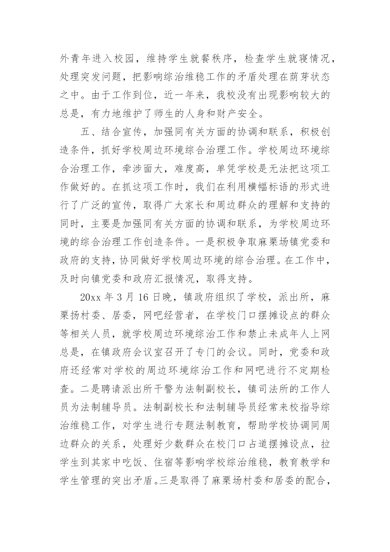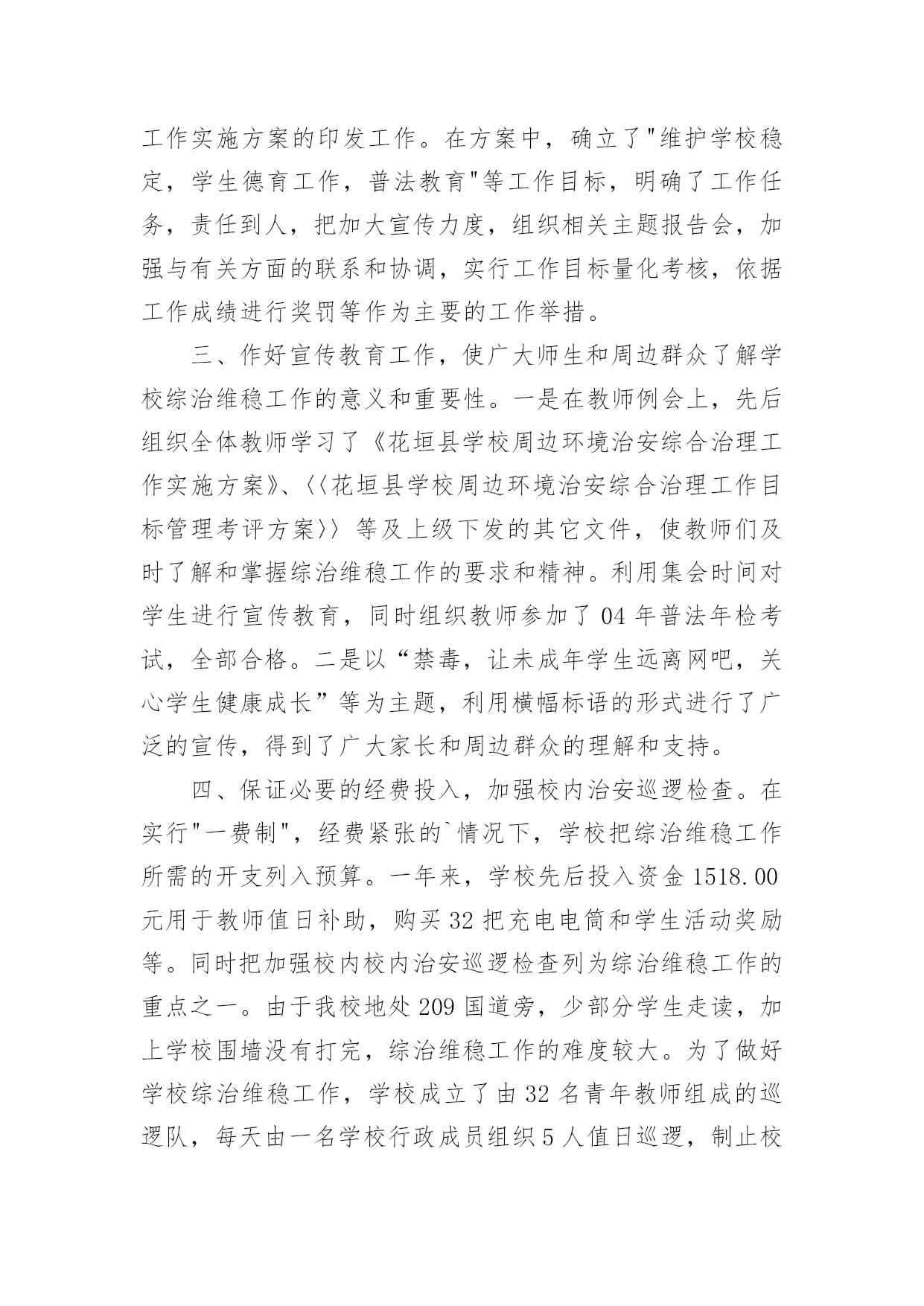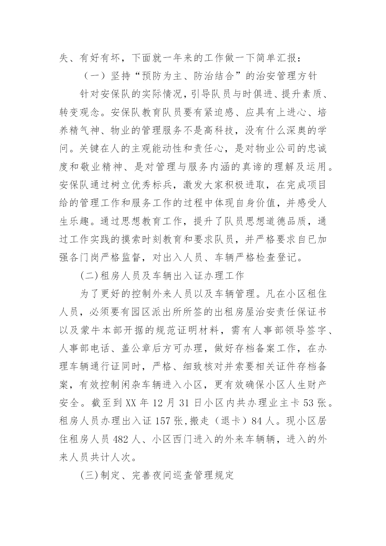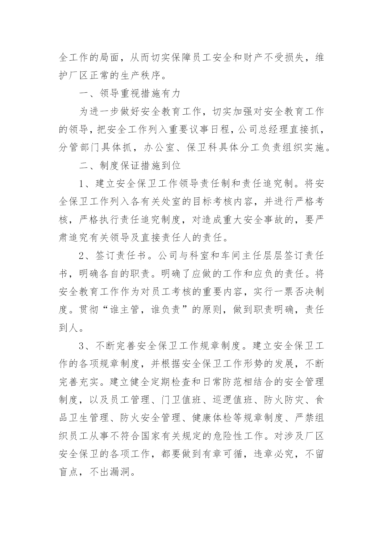 安保工作总结安保工作总结总结是对取得的成绩、存在的问题及得到的经验和教训等方面情况进行评价与描述的一种书面材料,它可以给我们下一阶段的学习和工作生活做指导,不如我们来制定一份总结吧。那么如何把总结写出新花样呢?以下是小编整理的安保工作总结,希望对大家有所帮助。安保工作总结120xx年我建设银行安全保卫工作,将按照总行和支行工作会议和安全保卫工作会议的部署,围绕全行中心工作,以确保全行无重大案件和事故为目标,以维护支行点和办公大楼营业(办公)秩序、保障我行资金和员工生命安全、防范和减少内部操作及外部事件风险给我行造成的损失为主要任务,认真贯彻执行“预防为主、综合治理”方针,进一步推进“平安建行”活动的开展,不断增强全行员工的安全保卫意识,提高全行治安防范能力,为我行的改革和各项业务健康发展提供强有力的安全保障。初步工作设想是:一、要结合今年机构人员变化情况,调整落实各点、部室安全责任人和安全员;按照“谁主管,谁负责”的原则,完善和落实点、部室安全保卫工作责任制;充分利用支行站加强员工安全防范意识教育,认真抓好《中华人民共和国安全生产法》的学习贯彻;继续抓好支行点应急演练,帮助员工掌握和提高处置突发事件的技能;加强四大节日安全大检查和专项检查以及对支行点营业终了安全检查等的落实。二、加大打击利用银行卡和自动柜员机诈骗资金犯罪活动的力度,确保银行和客户资金安全,分析当前不法分子利用ATM机和自动存款机作案的新动向,加大防范和打击诈骗活动的`力度,加强日常值班巡查和夜间应急处警等工作,为营造安全优良的营业环境作出努力。三、加强支行点和办公大楼技防、消防、物防的管理,进一步严格执行我行办公大楼安全管理办法,严格进出大楼人员验证登记制度;要适应高新技术发展需要,加强点报警设施的管理,减少和杜绝人为误报现象发生;要规范点消防物防设施管理,加强监控、报警、消防和物防设施建设和管理的安全检查,及时发现问题,消除隐患。四、加强队伍建设和管理,提高保卫人员综合素质。坚持严格训练、严格要求,加强对全行经济民警的教育、训练,执勤和日常生活管理;切实加强保卫队伍作风纪律建设;认真细致做好思想行为排查工作,防止个别员工违法违纪事件发生。五、完成好省行保卫处及行领导交办的工作,积极配合虚心接受检查指导,协调和配合好各科室工作。安保工作总结220xx年在公司领导下,坚持预防为主、防治结合、加强教育、群防群治的原则,通过安全教育,增强员工的安全意识和自我防护能力;通过齐抓共管,营造员工关心和支持安全工作的局面,从而切实保障员工安全和财产不受损失,维护厂区正常的生产秩序。一、领导重视措施有力为进一步做好安全教育工作,切实加强对安全教育工作的领导,把安全工作列入重要议事日程,公司总经理直接抓,分管部门具体抓,办公室、保卫科具体分工负责组织实施。二、制度保证措施到位1、建立安全保卫工作领导责任制和责任追究制。将安全保卫工作列入各有关处室的目标考核内容,并进行严格考核,严格执行责任追究制度,对造成重大安全事故的,要严肃追究有关领导及直接责任人的责任。2、签订责任书。公司与科室和车间主任层层签订责任书,明确各自的职责。明确了应做的工作和应负的责任。将安全教育工作作为对员工考核的重要内容,实行一票否决制度。贯彻“谁主管,谁负责”的原则,做到职责明确,责任到人。3、不断完善安全保卫工作规章制度。建立安全保卫工作的各项规章制度,并根据安全保卫工作形势的发展,不断完善充实。建立健全定期检查和日常防范相结合的安全管理制度,以及员工管理、门卫值班、巡逻值班、防火防灾、食品卫生管理、防火安全管理、健康体检等规章制度、严禁组织员工从事不符合国家有关规定的危险性工作。对涉及厂区安全保卫的各项工作,都要做到有章可循,违章必究,不留盲点,不出漏洞。4、建立安全意外事故处置预案制度。建立事故处置领导小组,制定了意外事故处置预案制度。三、齐抓共管群防群治安全教育工作是一项社会性的系统工程,需要社会、公司、家庭的'密切配合。我们积极与市公安、卫生、综合治理等部门通力合作,做好公司安全保卫工作,学校组织开展一系列道德、法制教育活动,取得了良好的教育效果。四、加强教育,促进自护我们以安全教育周为重点,经常性地对员工开展安全教育,特别是抓好交通、大型活动等的安全教育。认真做好安全教育周工作。安全教育周以厂区安全为主题,在安全教育周期间,组织学习安全教育工作文件,对厂区易发事故类型、重点部位保护、工作薄弱环节、各类人员安全意识与安全技能等方面,开展深入全面的大检查,消除隐患,有针对地扎实地开展教育和防范工作。五、加强检查,及时整改开展常规检查。把安全教育工作作为重点检查内容之一。对厂区进行全面的安全检查。冬季公司对电线和宿舍区进行防火安全检查。安保队是物业公司的重要管理部门,肩负着小区的治安、消防、监控